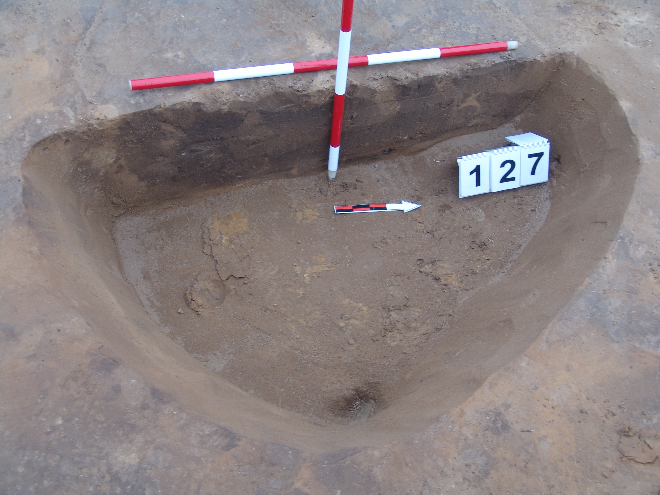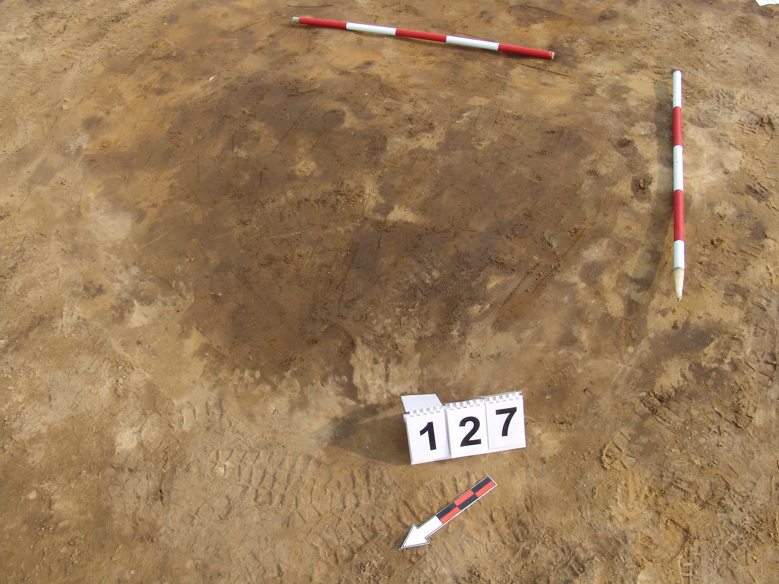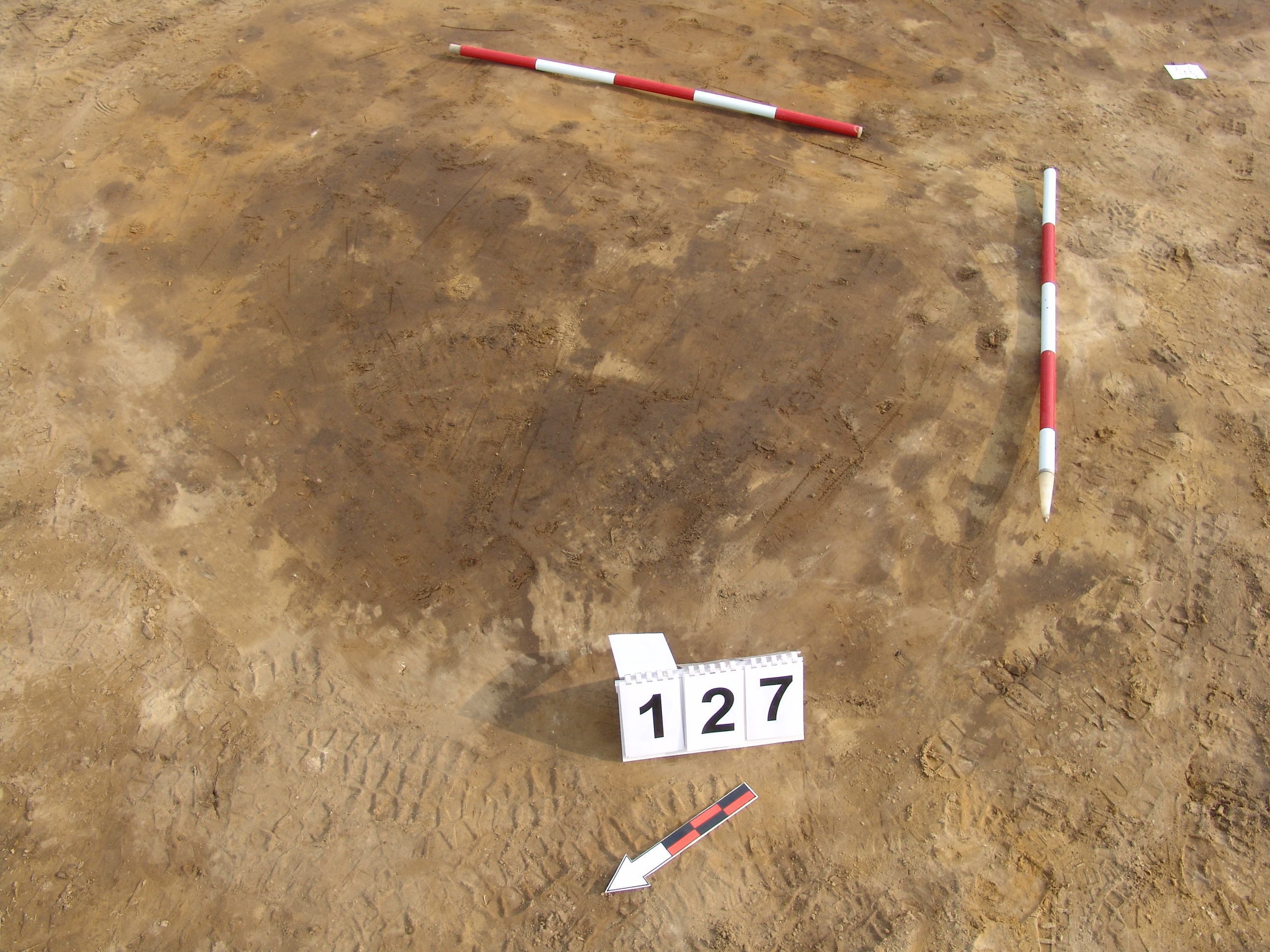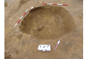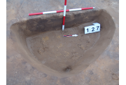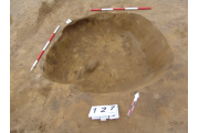 A 128 és 123 objektumok között jól elváló kerek folttal jelentkezik. Csaknem függőleges falú, egyenes aljú, kör alaprajzú gödör. Betöltése alapvetően sötét barnásszürke, némileg kevert. A Ny-i oldalon a falát meredekre bontották. Átmérője fent É-D 150, K-Ny 160 cm, lent K-Ny 140, É-D 115 cm. Mélysége 32-44 cm.