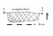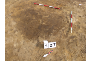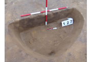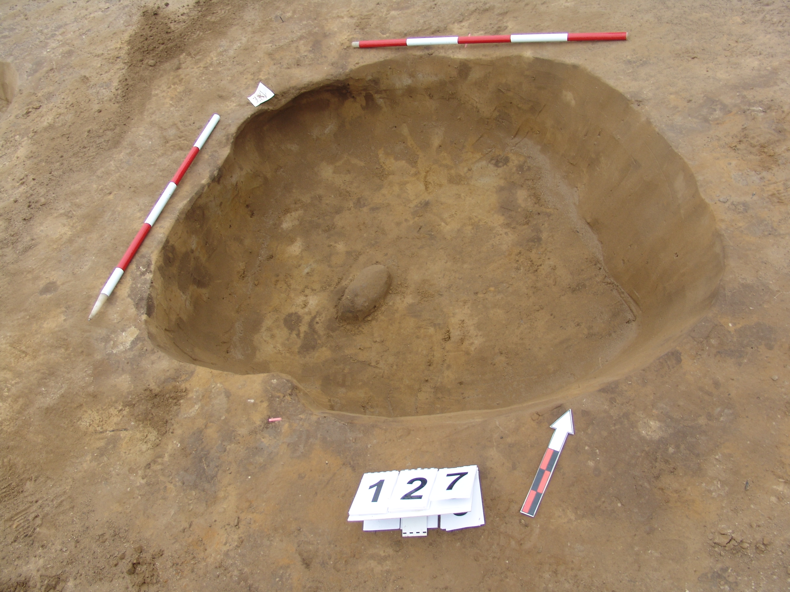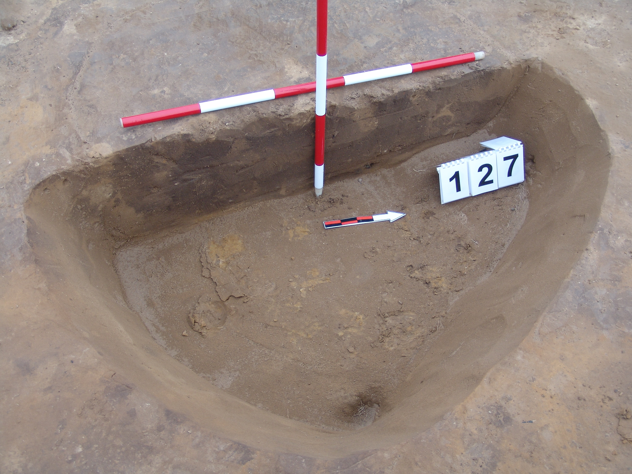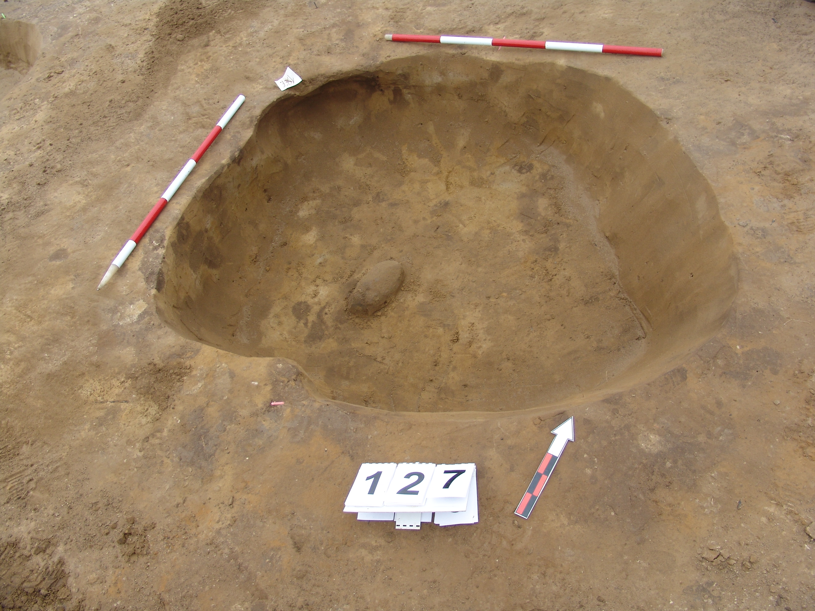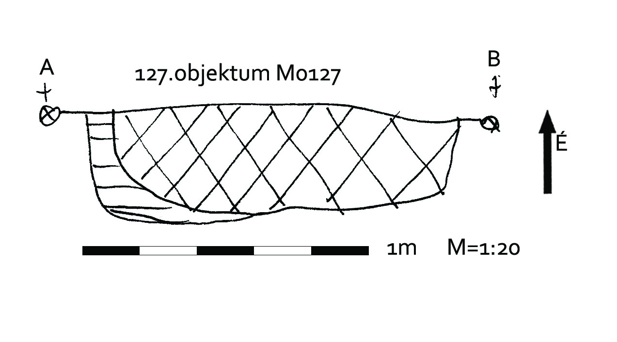 A 128 és 123 objektumok között jól elváló kerek folttal jelentkezik. Csaknem függőleges falú, egyenes aljú, kör alaprajzú gödör. Betöltése alapvetően sötét barnásszürke, némileg kevert. A Ny-i oldalon a falát meredekre bontották. Átmérője fent É-D 150, K-Ny 160 cm, lent K-Ny 140, É-D 115 cm. Mélysége 32-44 cm.