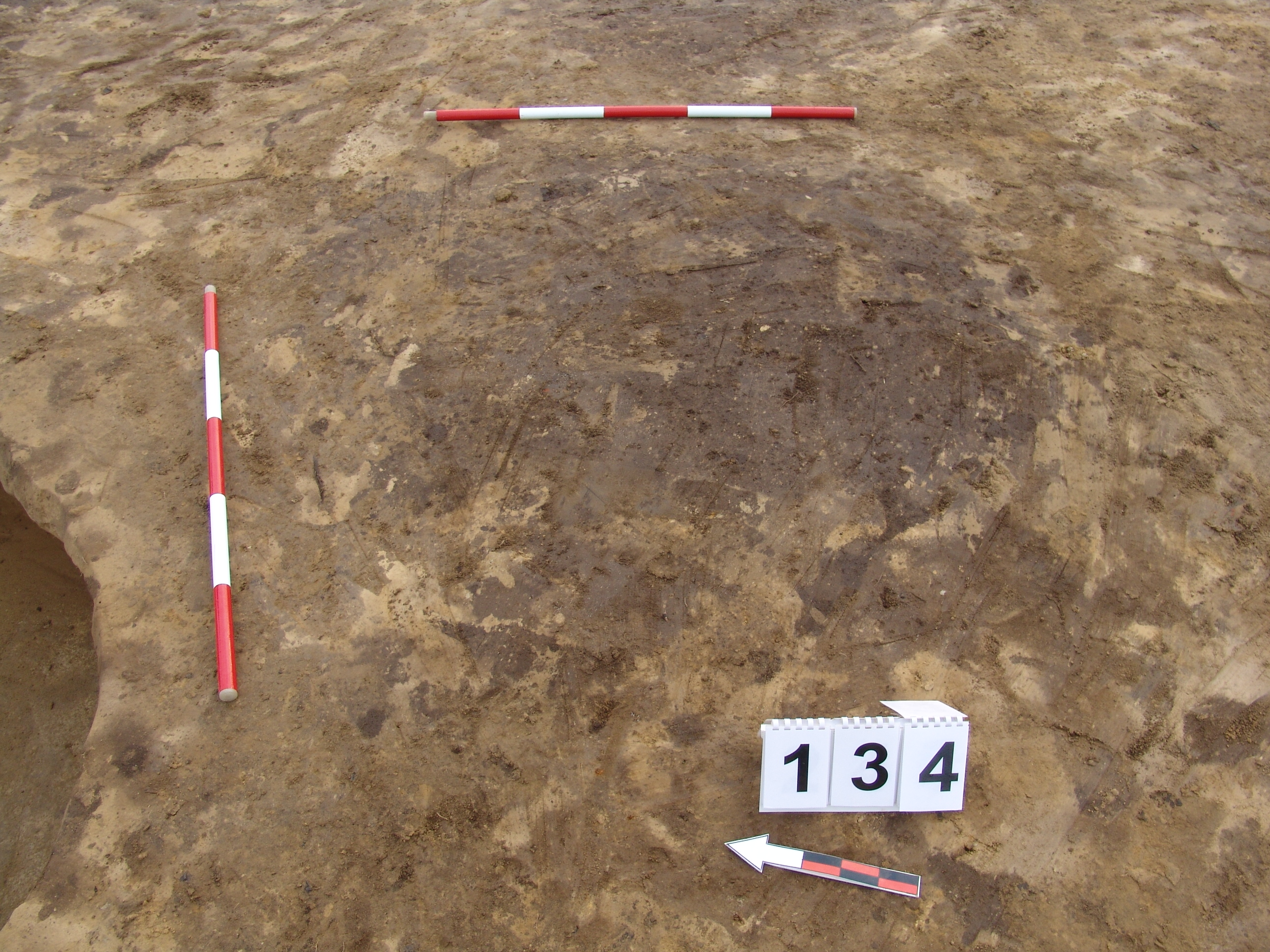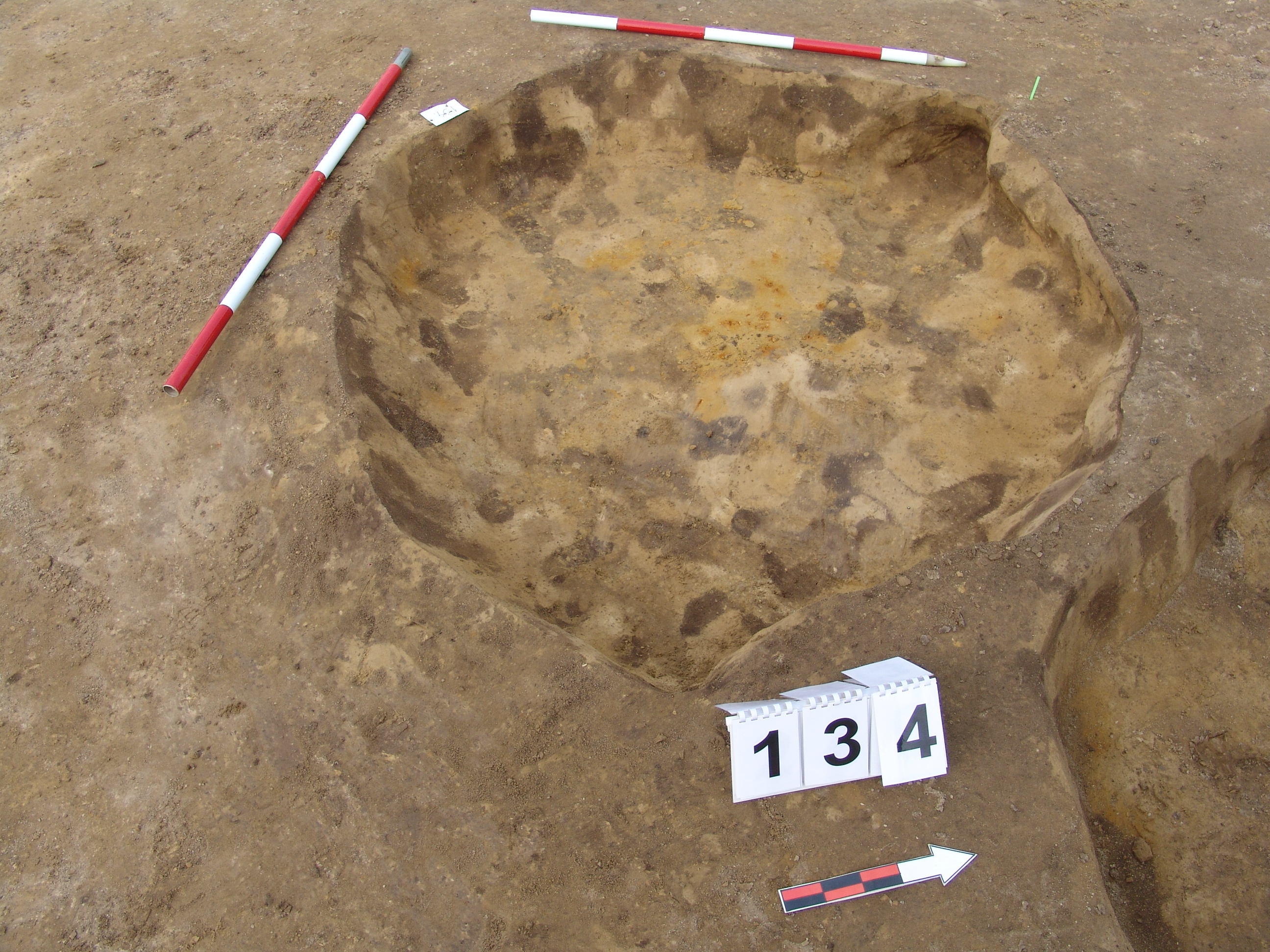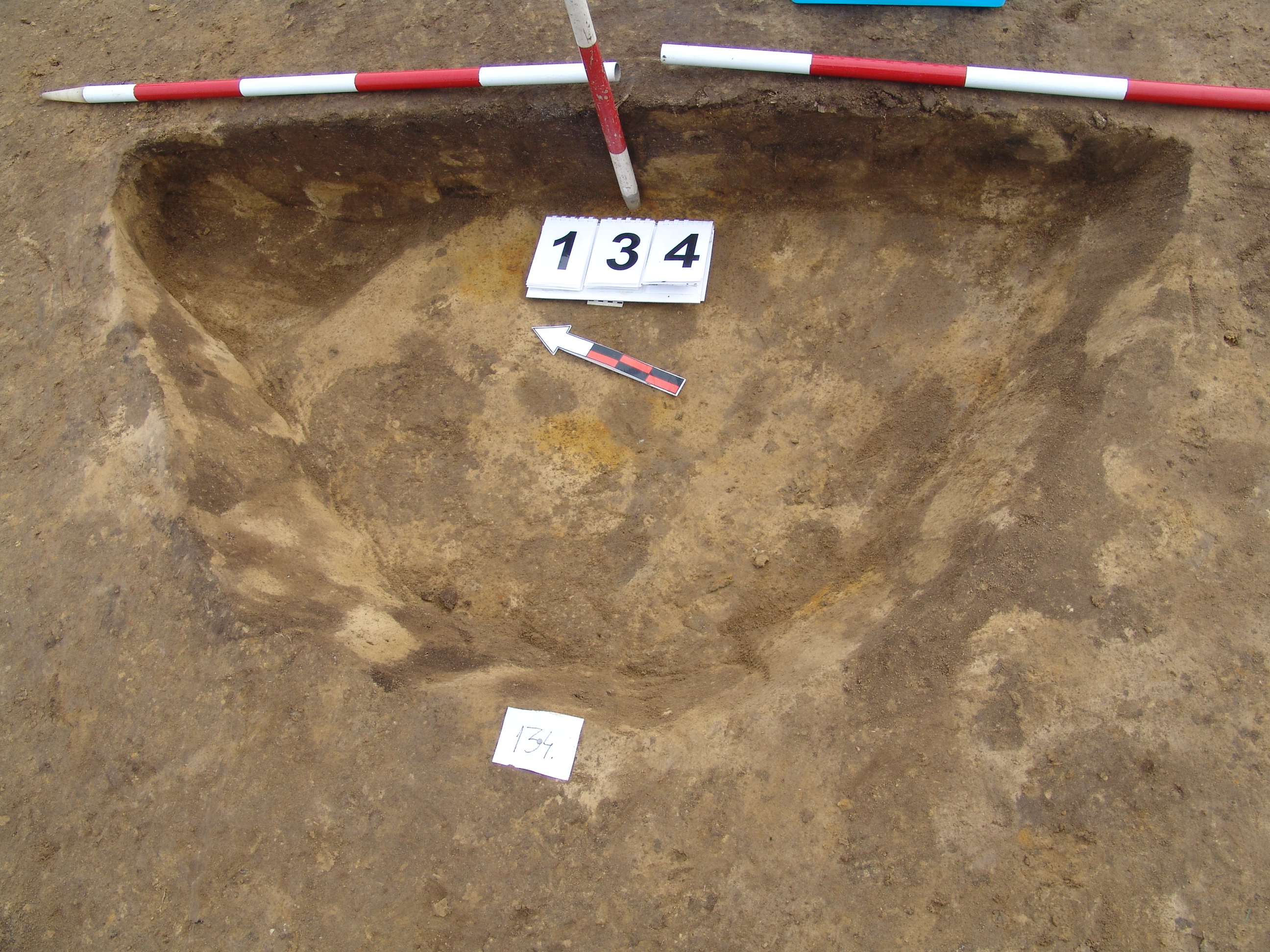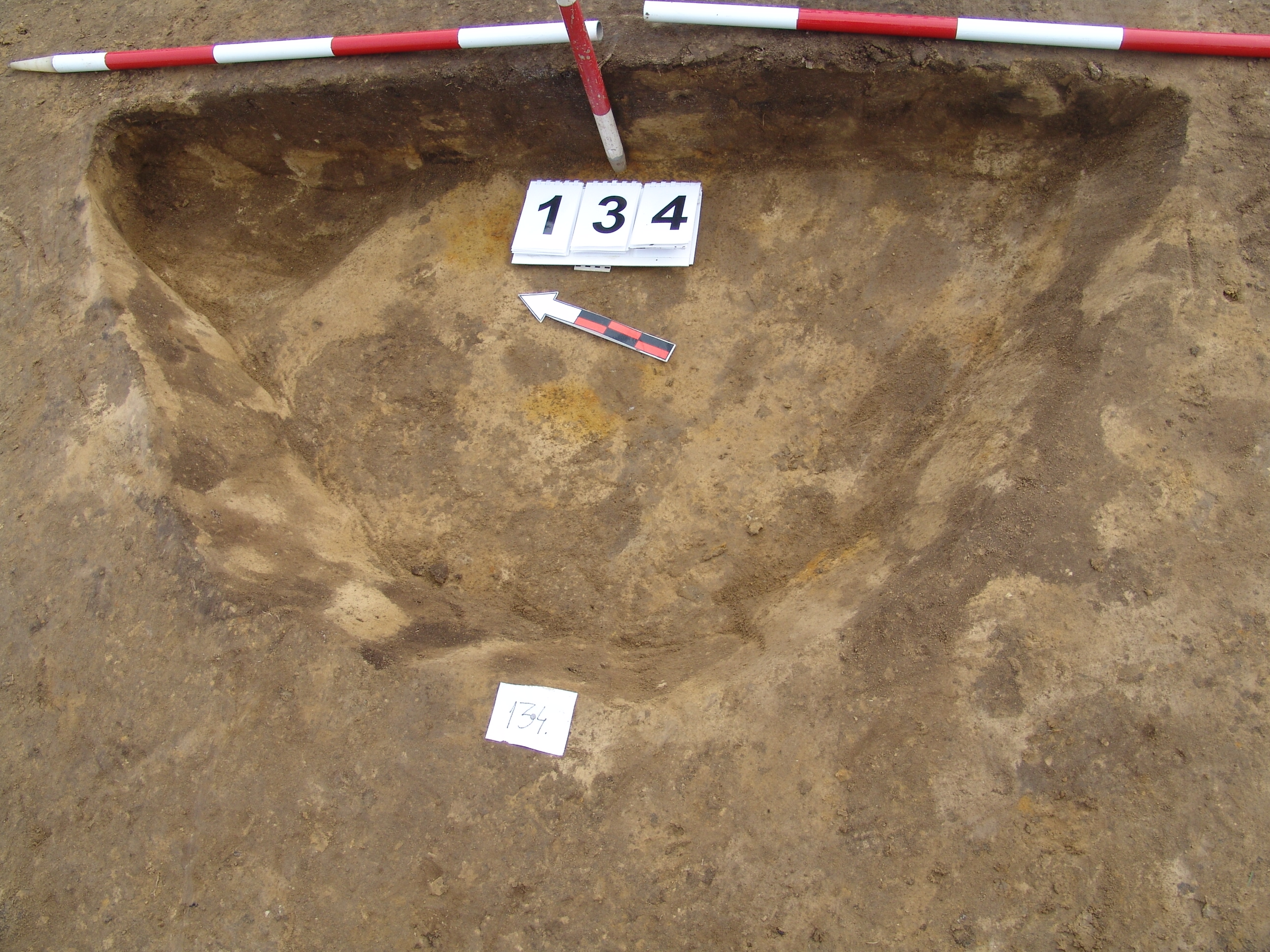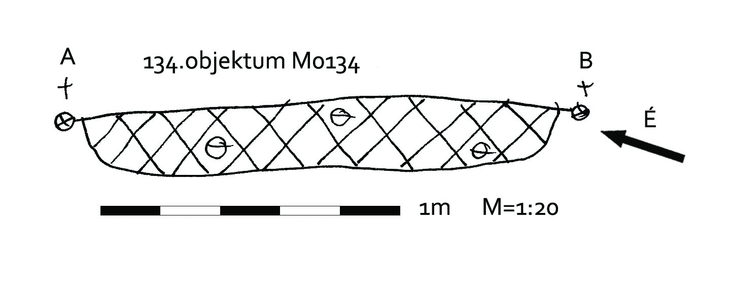 A 133 objektumtól D-re halvány, bizonytalanabb kerek folttal jelentkező gödör. Kissé meredek falú, egyenes aljú gödör. Kör alaprajzú. betöltése sárga szemcsés, sötét barnásszürke. Átmérője fent É-D 145, Ny-K 145 cm, lent É-D 130, Ny-K 130 cm. Mélysége 18-24 cm.