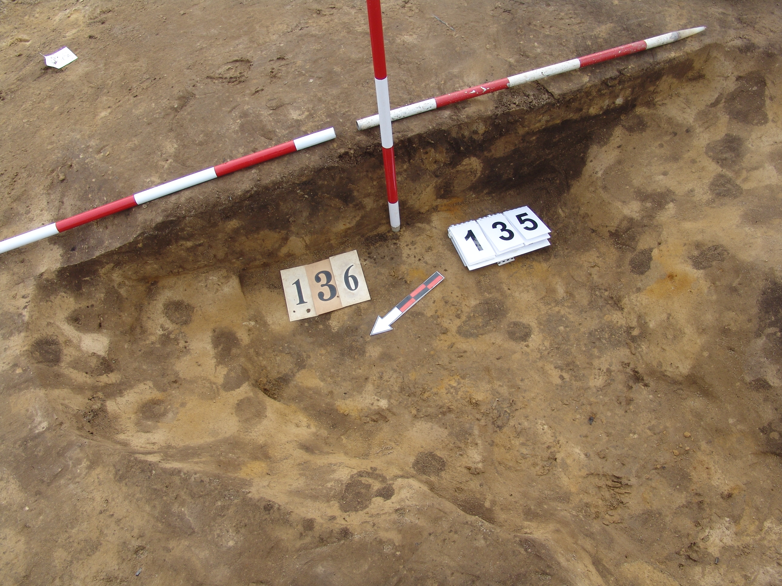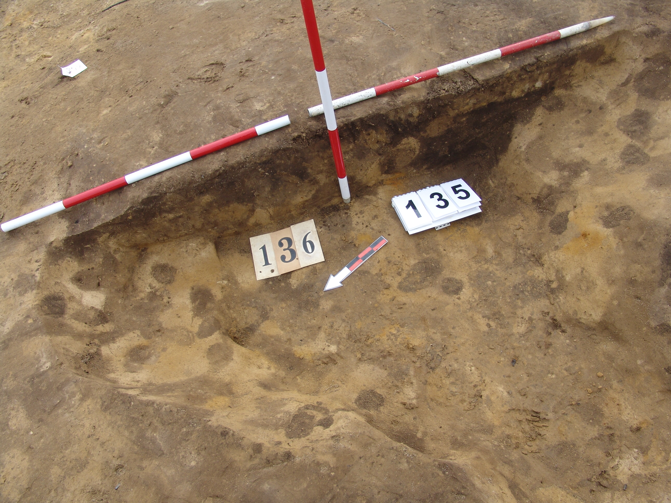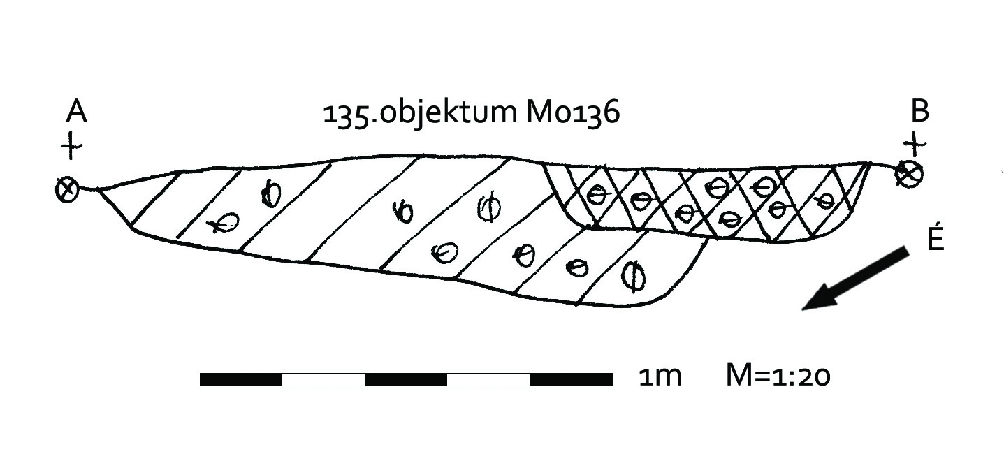 ÉK - DNy-i irányú kettős gödör. Az ÉK-i a korábbi, ez a 136 számú. A 135 kerek "maszatos" sárga - szürke folttal jelentkezett kicsi, kb kör alaprajzú, egyenes aljú gödör. Fala függőleges. Betöltése sárga "maszatos" egészen sötét, extra fekete. Átmérője kb 95 cm. Mélysége 25 cm. Minden irányban túlbontogatták az állatjárat után.