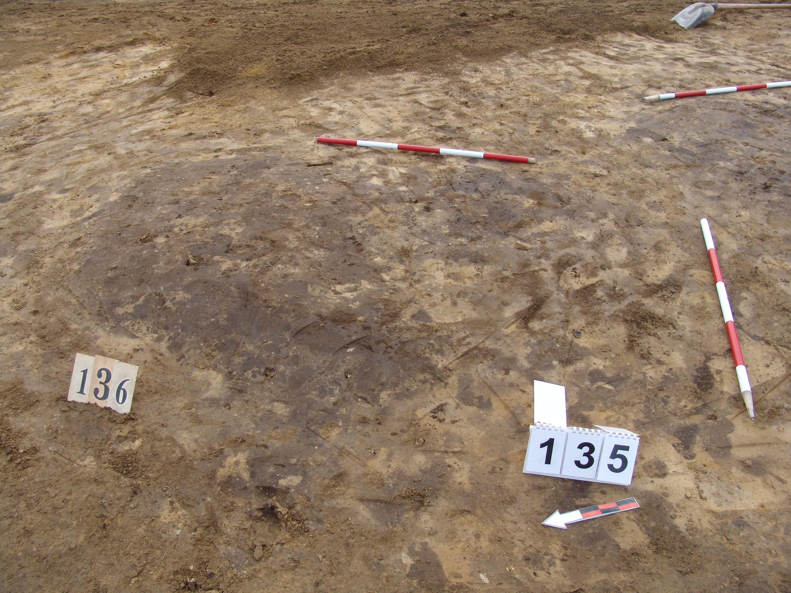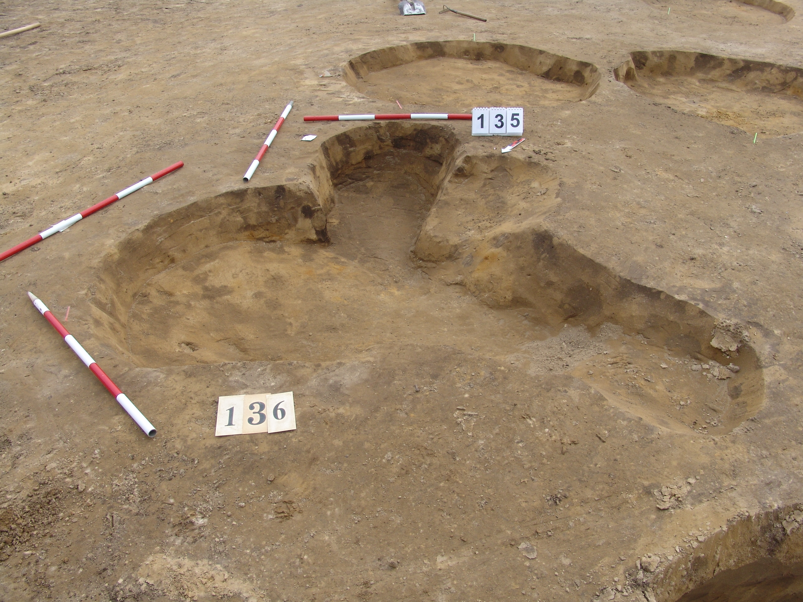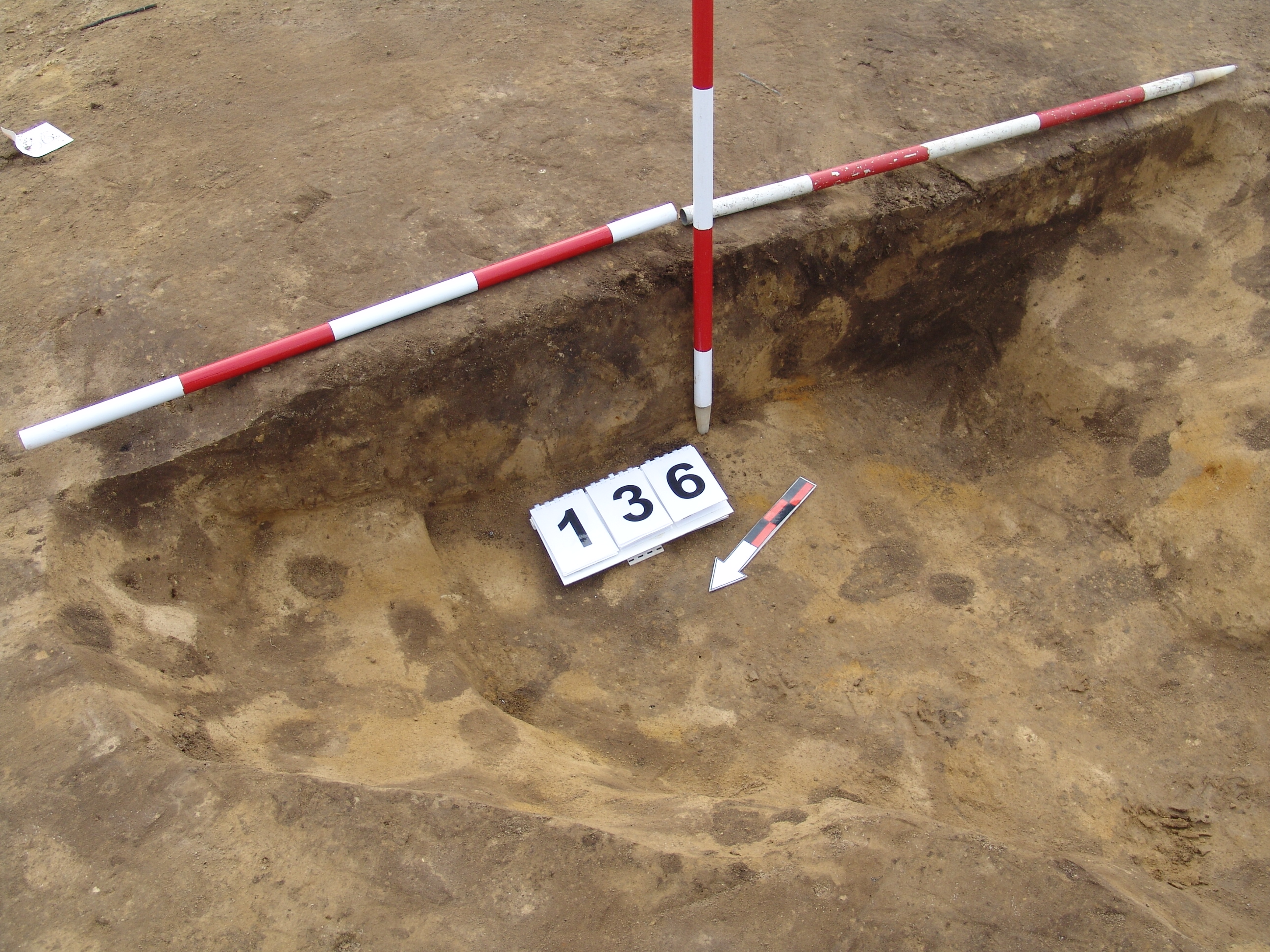 A 135 objektum alatt, attól ÉK - re jelentkező kerek, sötét, jól látszó folt. Betöltése barnásszürke, sárga szemcsés. Fala meredek, alja talán íves, de az állatjáratok miatt bizonytalan. Szélét Ny- ra erősen túlbontották egy állatjárat után. Átmérője fent É-D 125, Ny - K 130 cm, lent É- D 110, Ny-K 115 cm. Mélysége 25 cm.