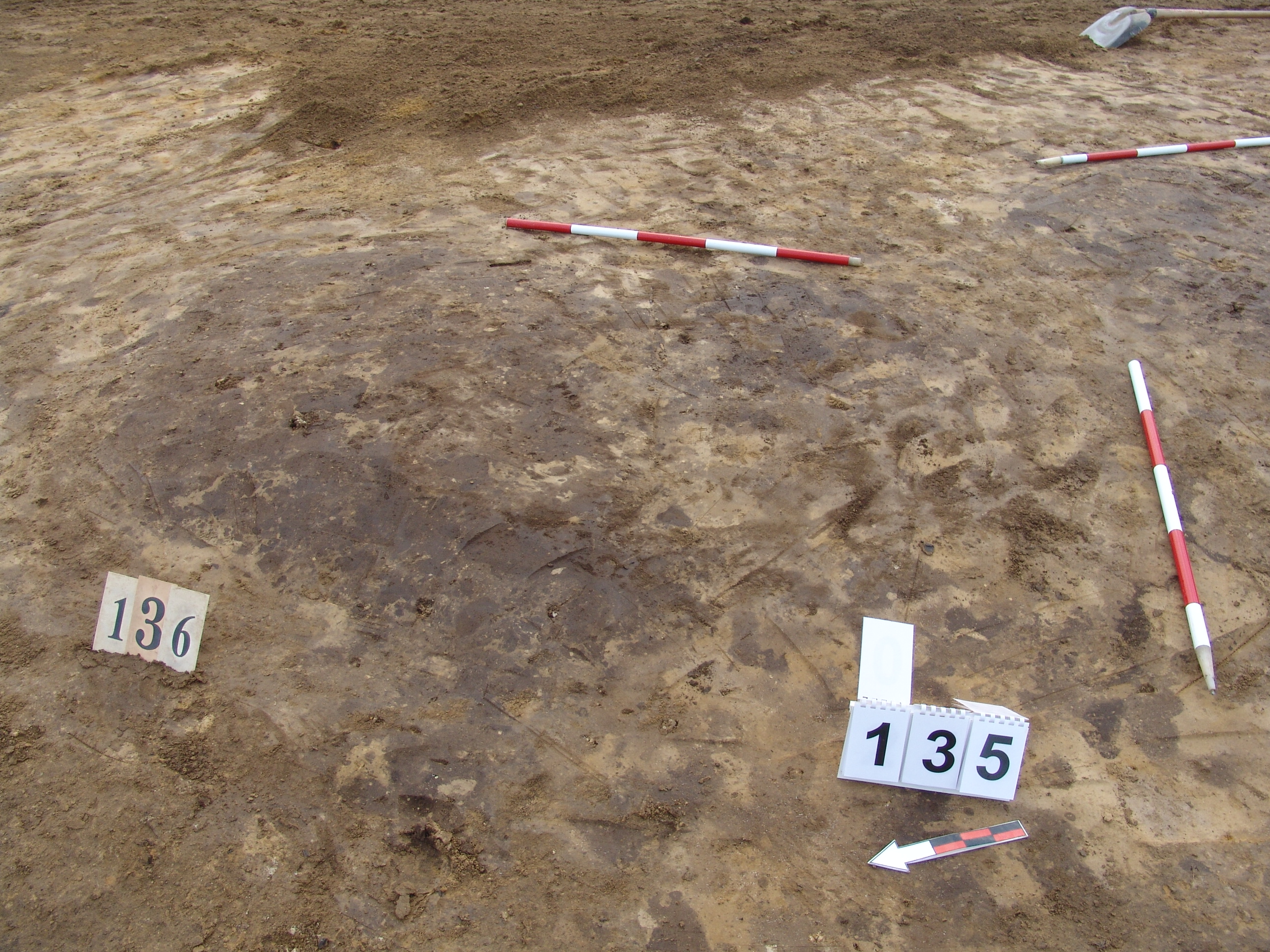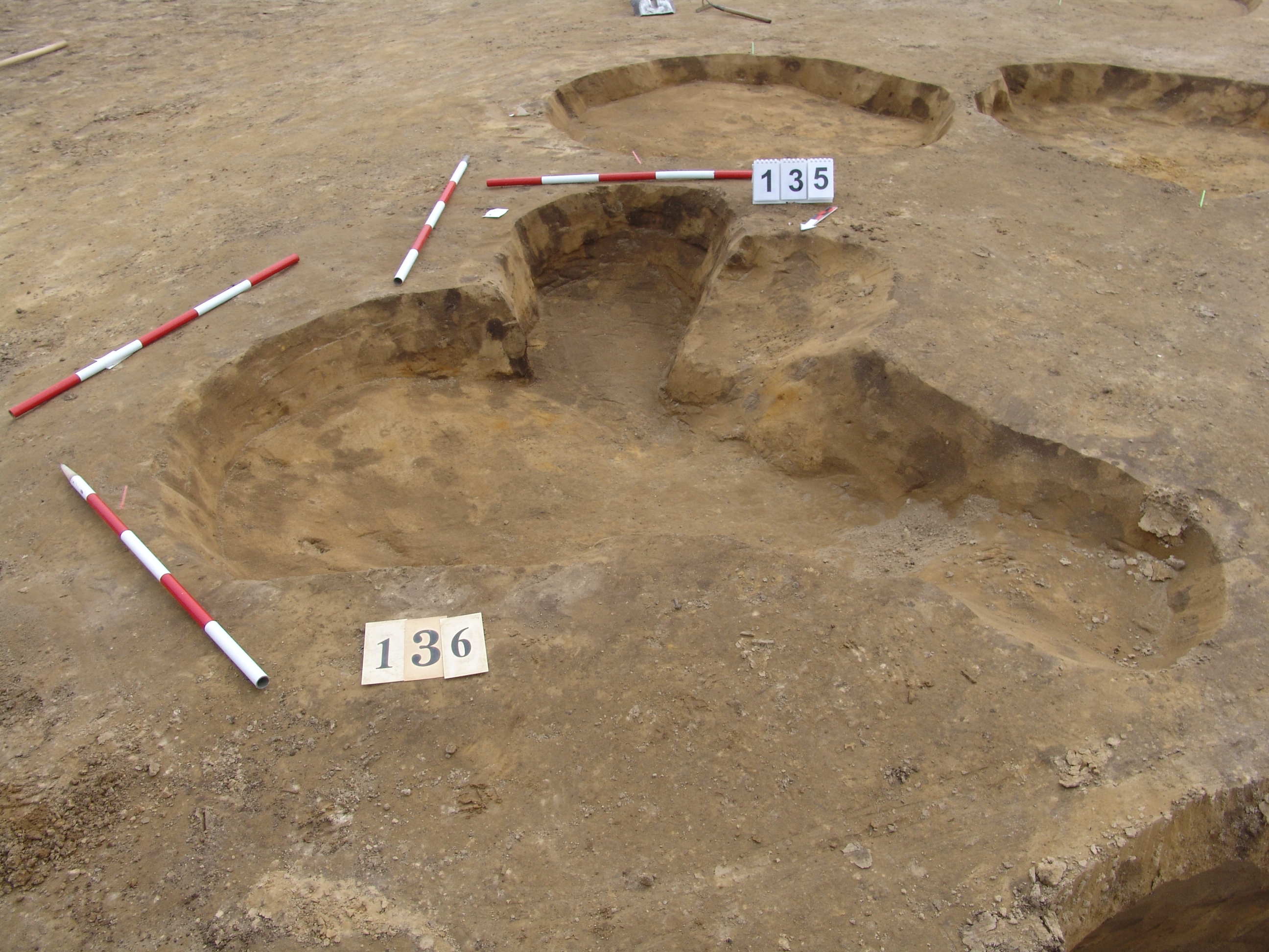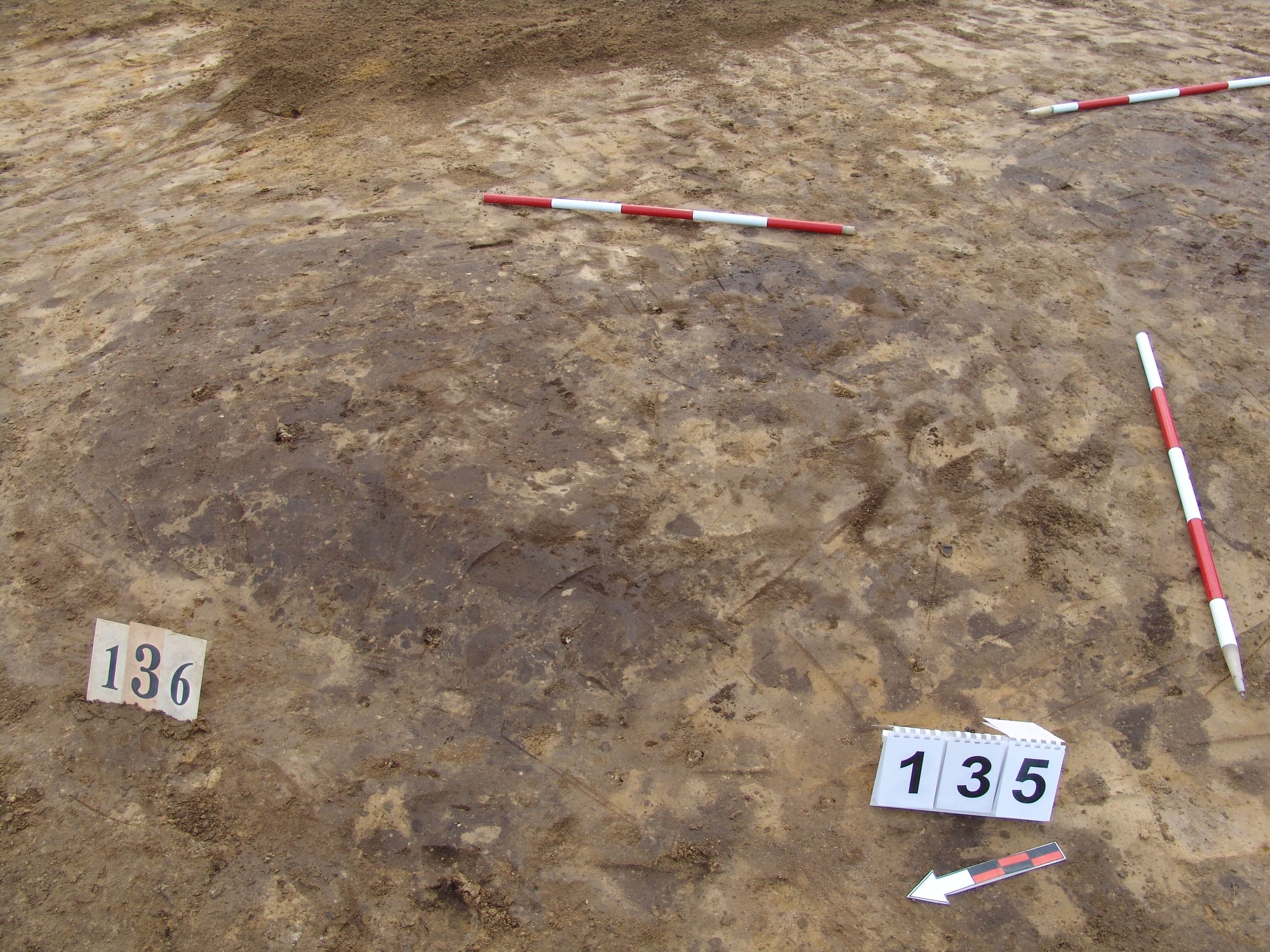 A 135 objektum alatt, attól ÉK - re jelentkező kerek, sötét, jól látszó folt. Betöltése barnásszürke, sárga szemcsés. Fala meredek, alja talán íves, de az állatjáratok miatt bizonytalan. Szélét Ny- ra erősen túlbontották egy állatjárat után. Átmérője fent É-D 125, Ny - K 130 cm, lent É- D 110, Ny-K 115 cm. Mélysége 25 cm.