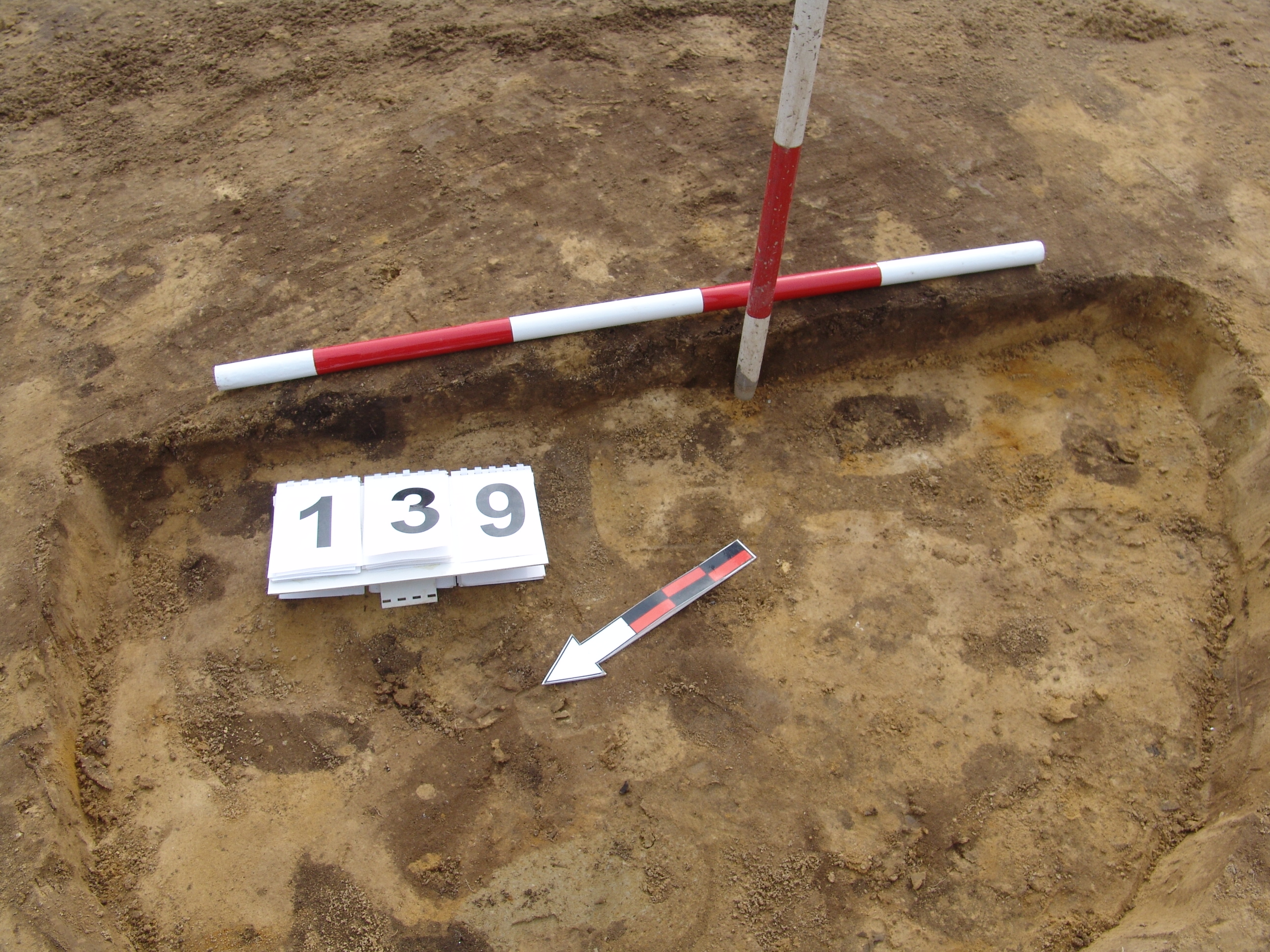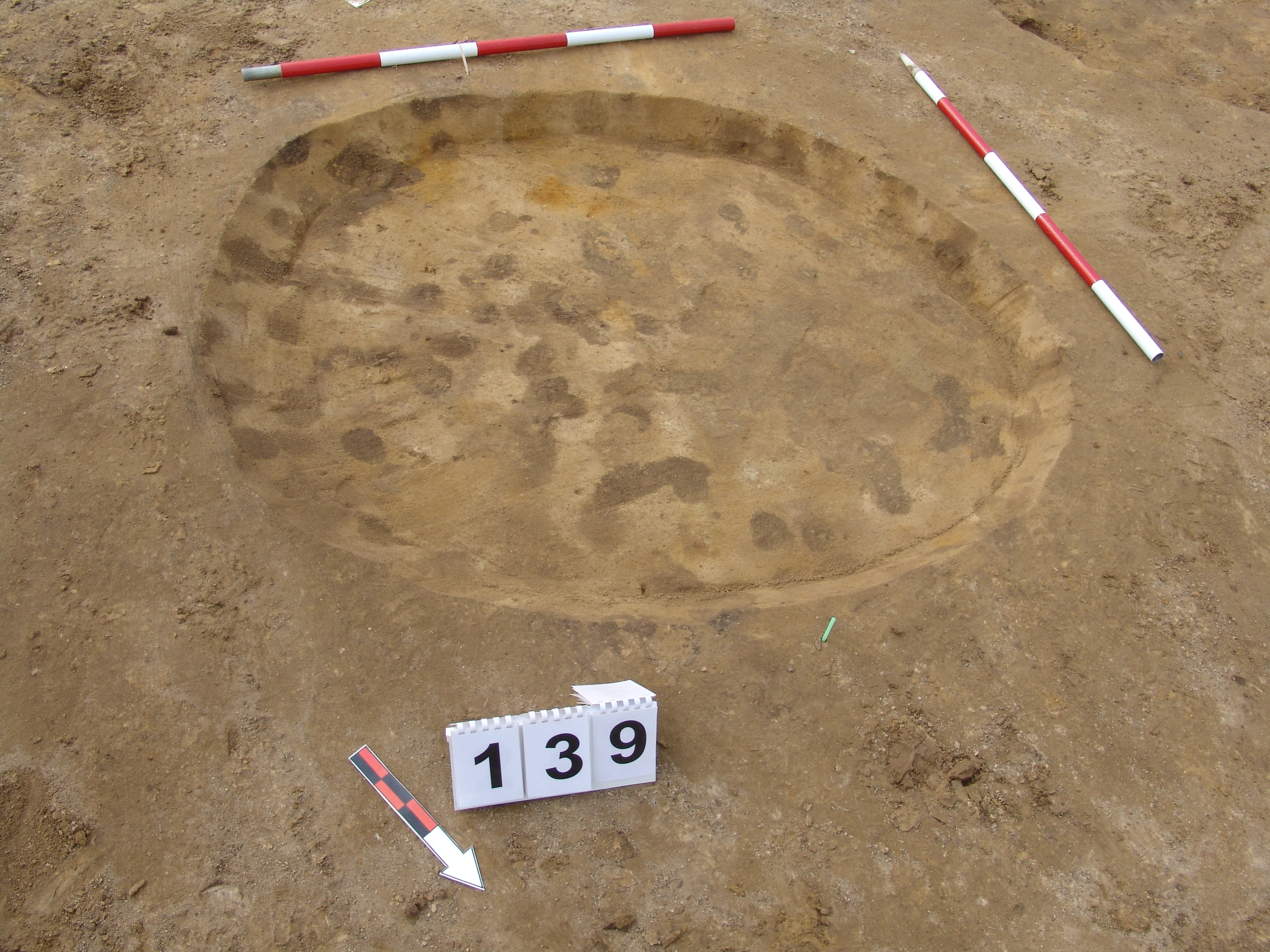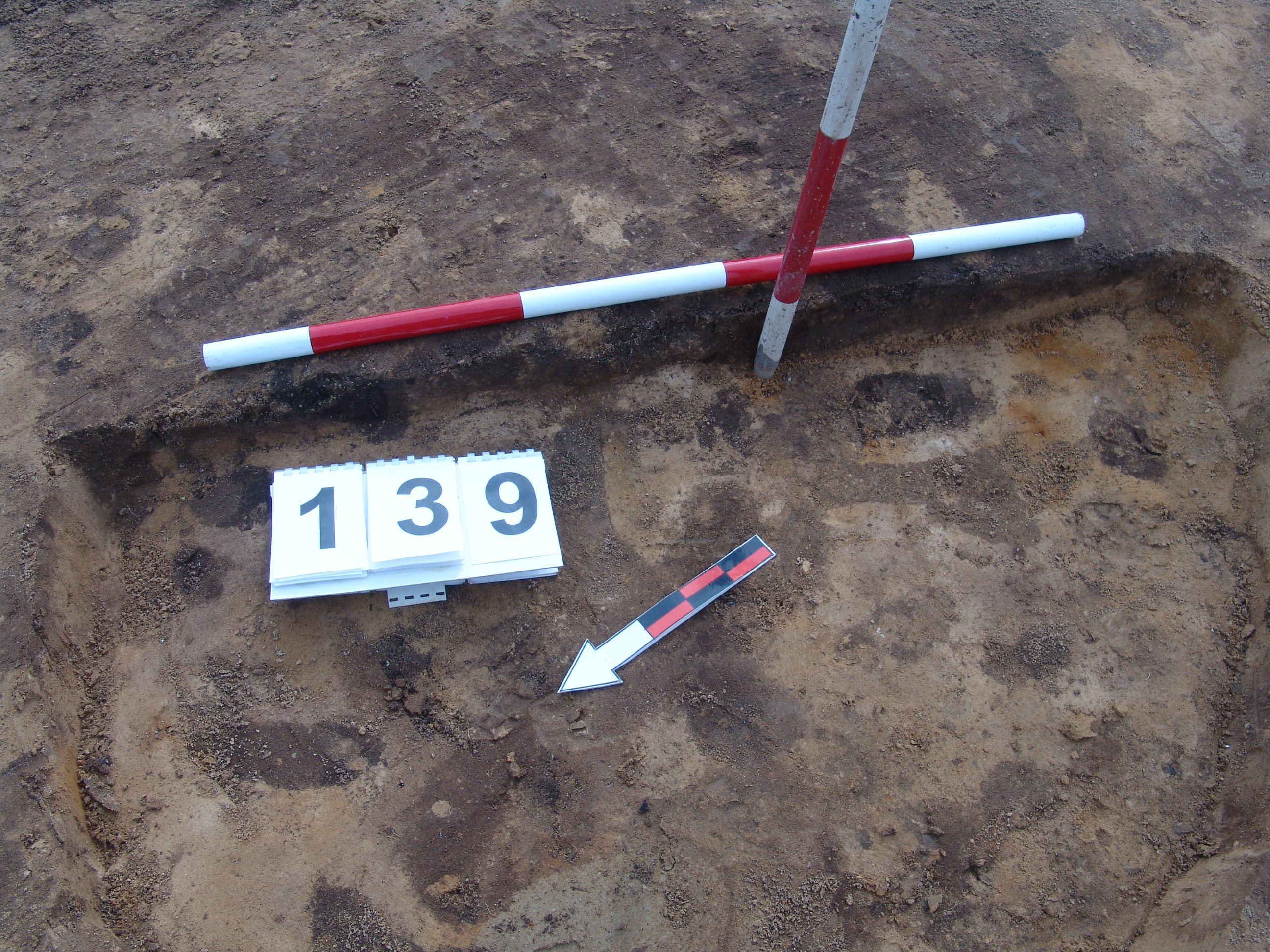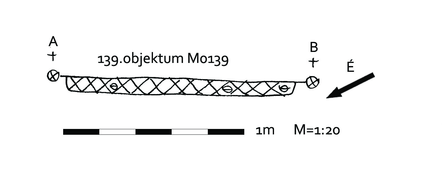 A 138 objektumtól ÉNy - ra jól látszó kerek sötét folttal jelentkezett. Betöltése barnásszürke, az É - i oldalon sárga szemcsékkel. Fala talán meredek, alja egyenes, kör alaprajzú, de csak csekély maradvány. Átmérője fent É - D 153, Ny - K 124 cm, lent É - D 135, Ny - K 113 cm. Mélysége 8 cm.