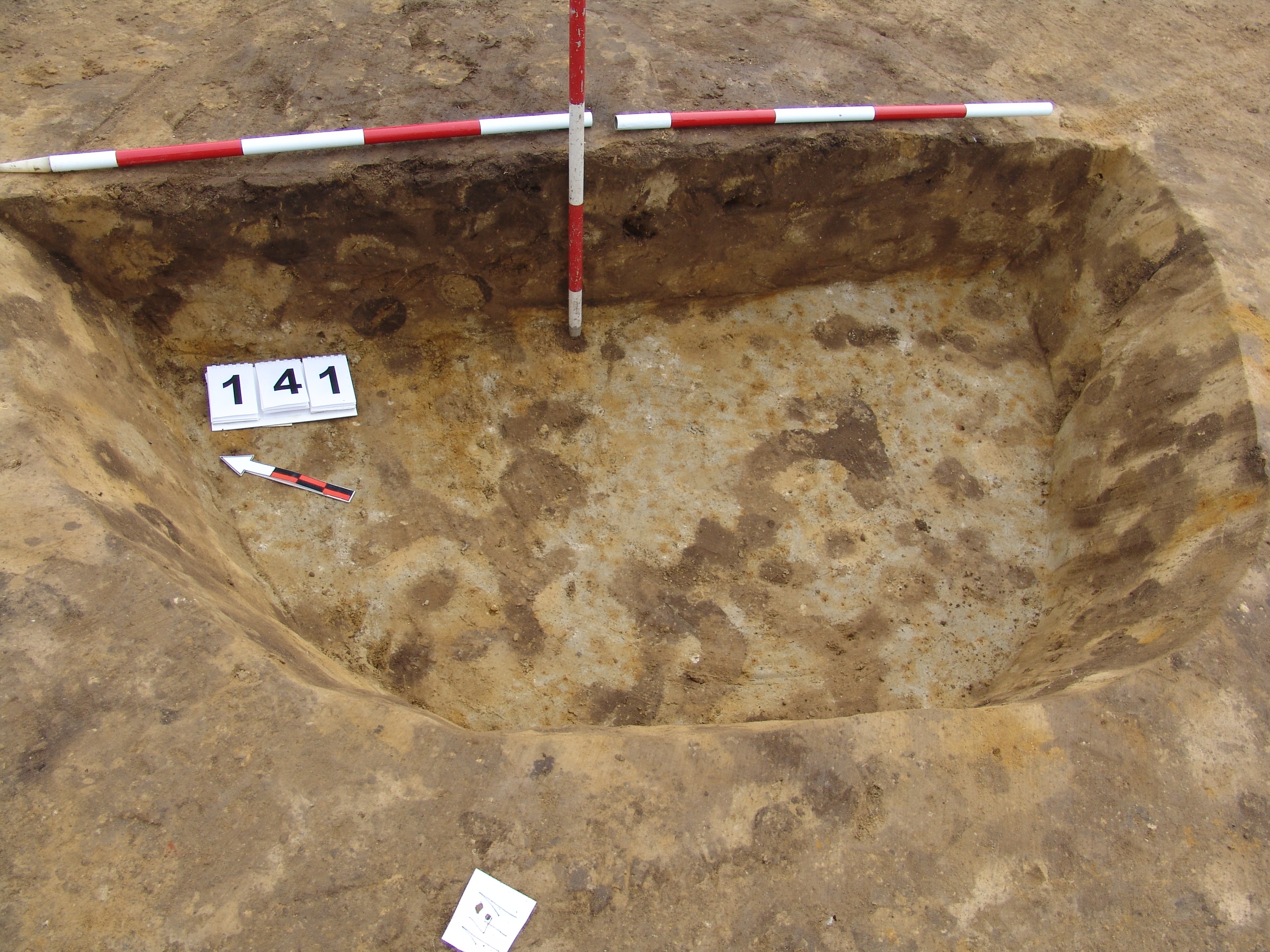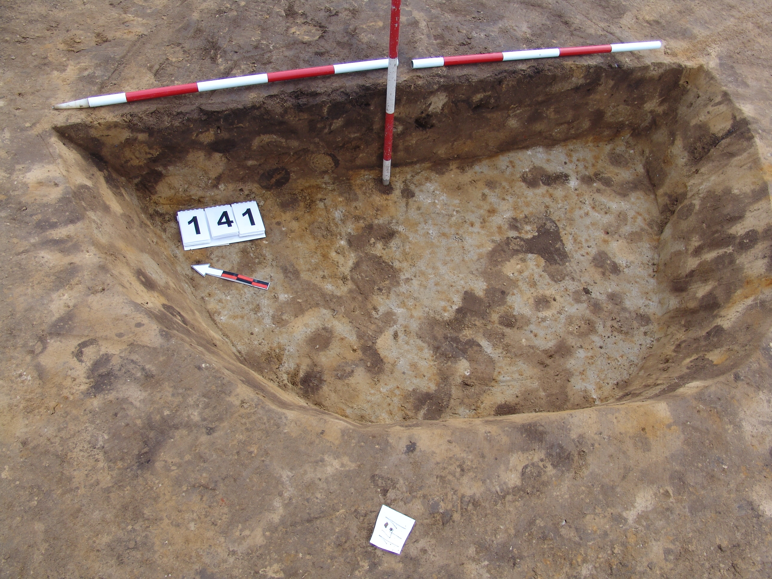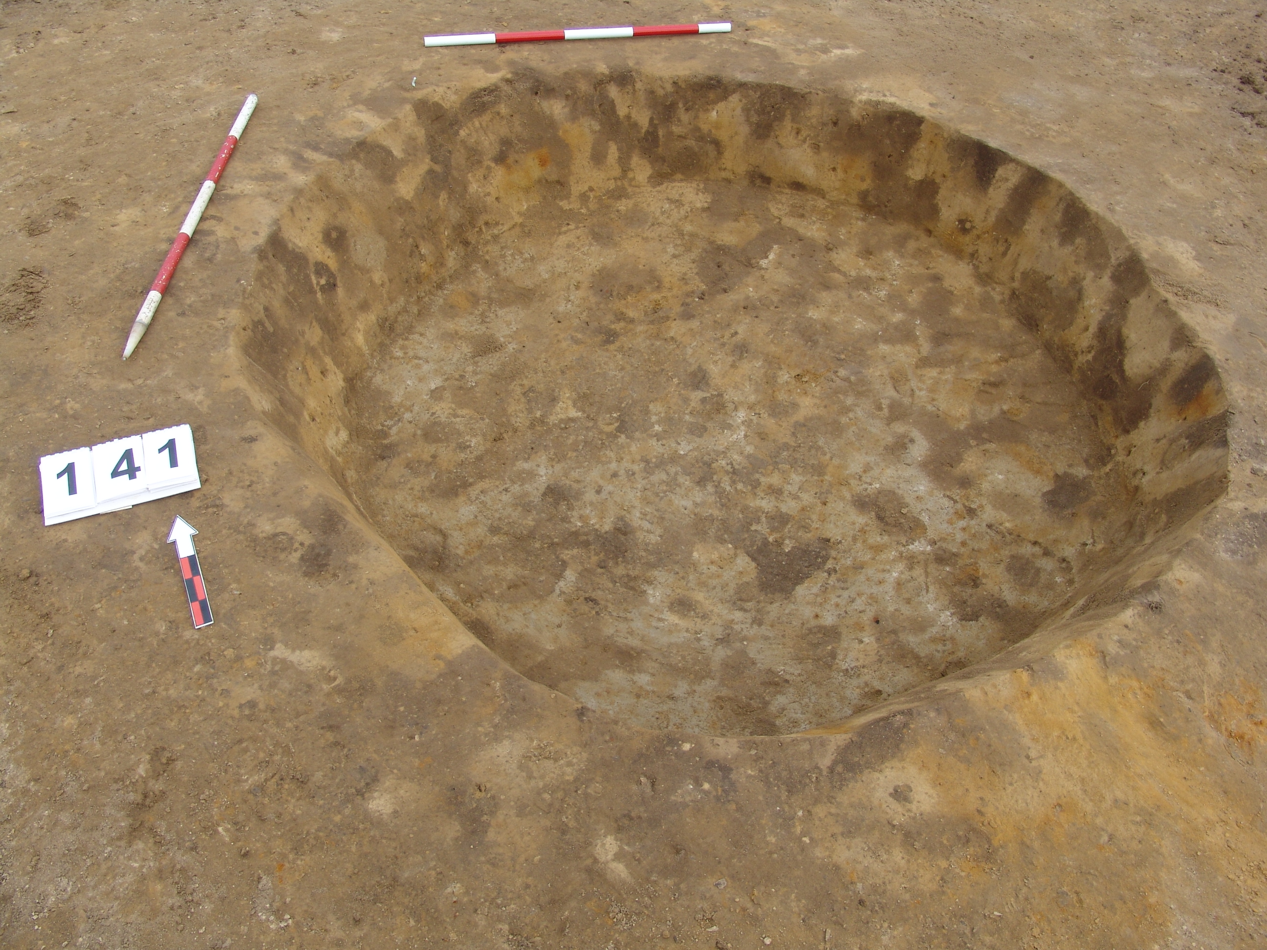 A 140 gödörtől DDNy - ra jól rajzolódó kerek, sötét folttal jelentkezett. Kör alaprajzú, sárga szemcsés, alul világosabb, felül sötétebb barnásszürke betöltésű gödör. Átmérője fent É - D 21, Ny - K 188 cm, lent É - D 170, Ny - K 175 cm. Mélysége 38-45 cm.