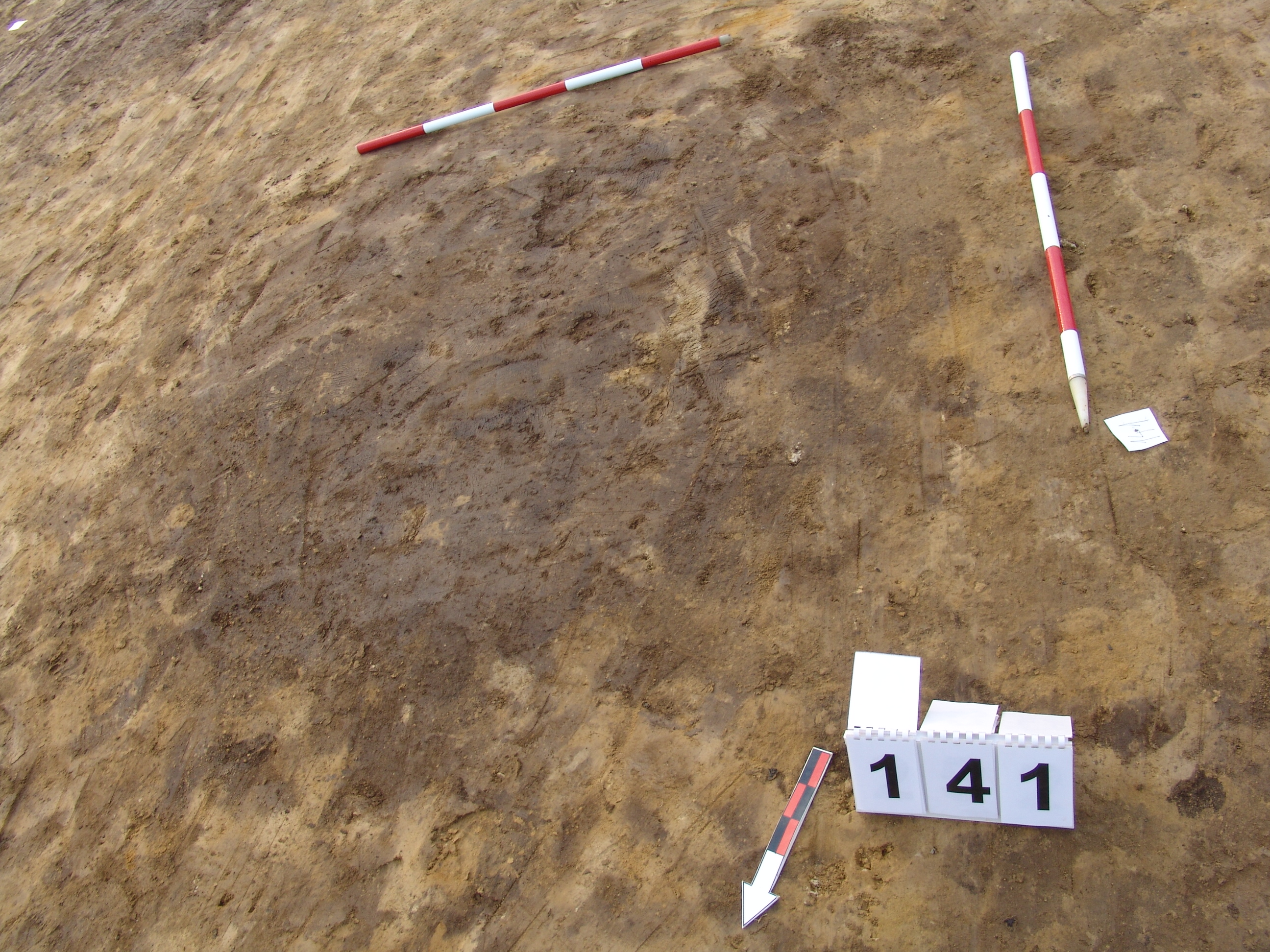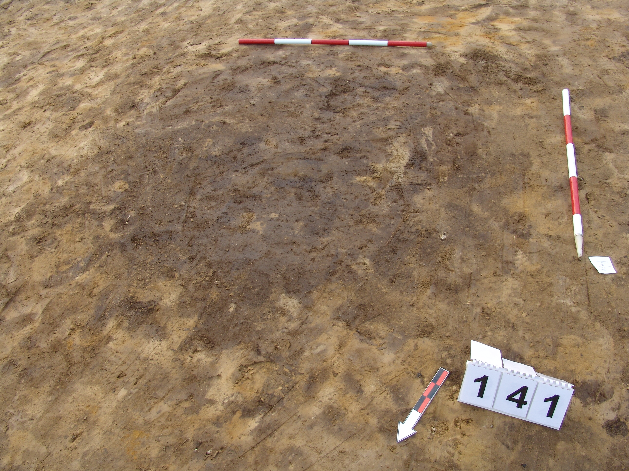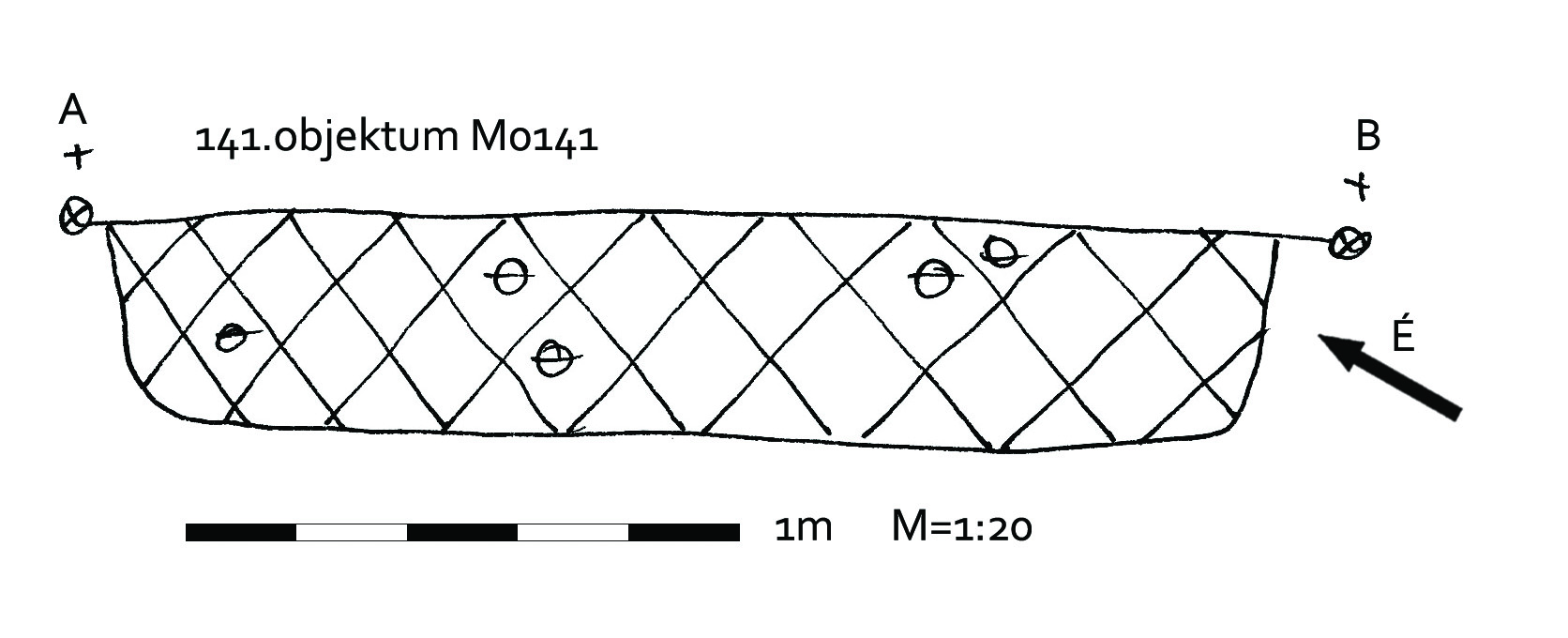 A 140 gödörtől DDNy - ra jól rajzolódó kerek, sötét folttal jelentkezett. Kör alaprajzú, sárga szemcsés, alul világosabb, felül sötétebb barnásszürke betöltésű gödör. Átmérője fent É - D 21, Ny - K 188 cm, lent É - D 170, Ny - K 175 cm. Mélysége 38-45 cm.