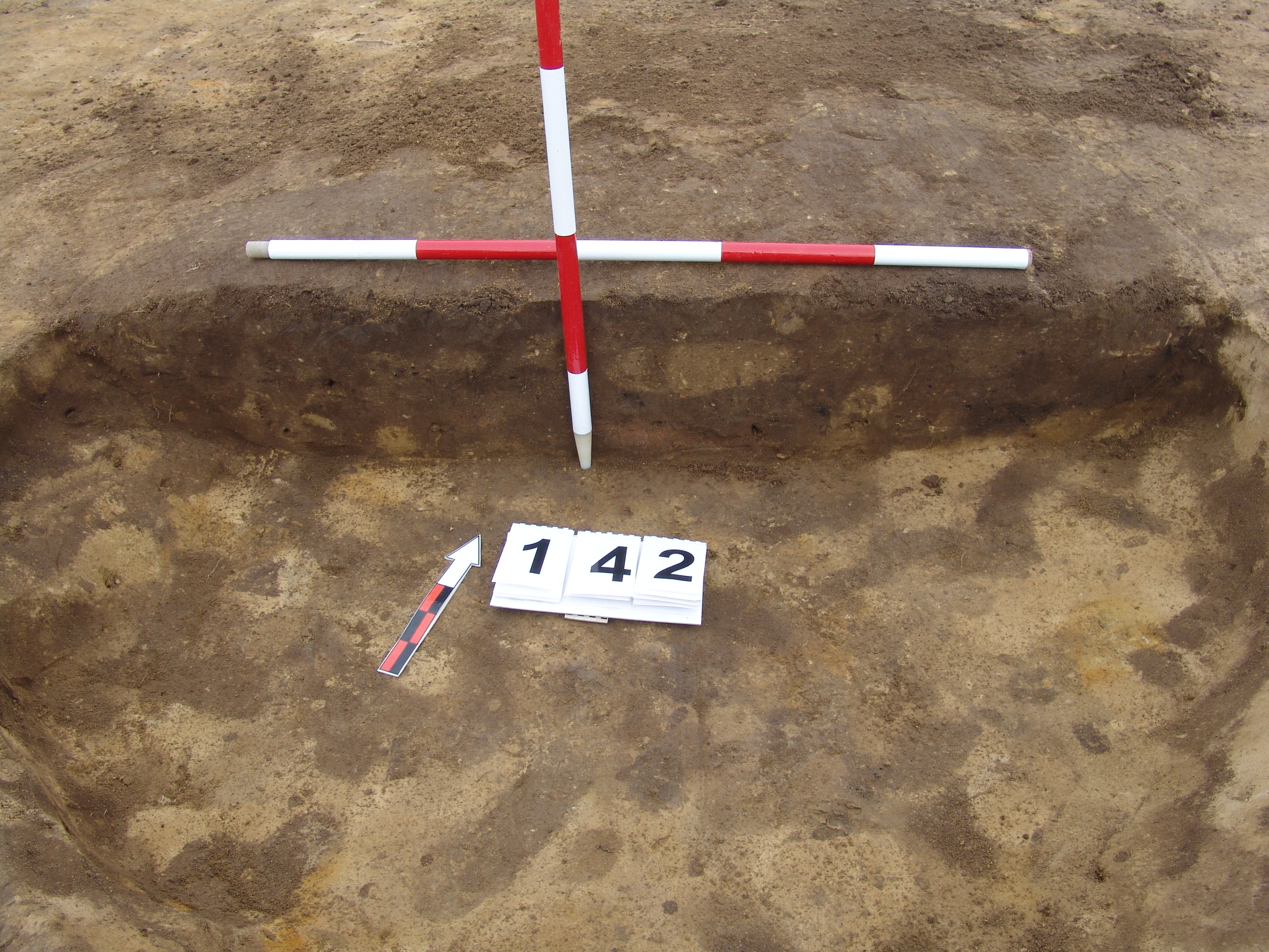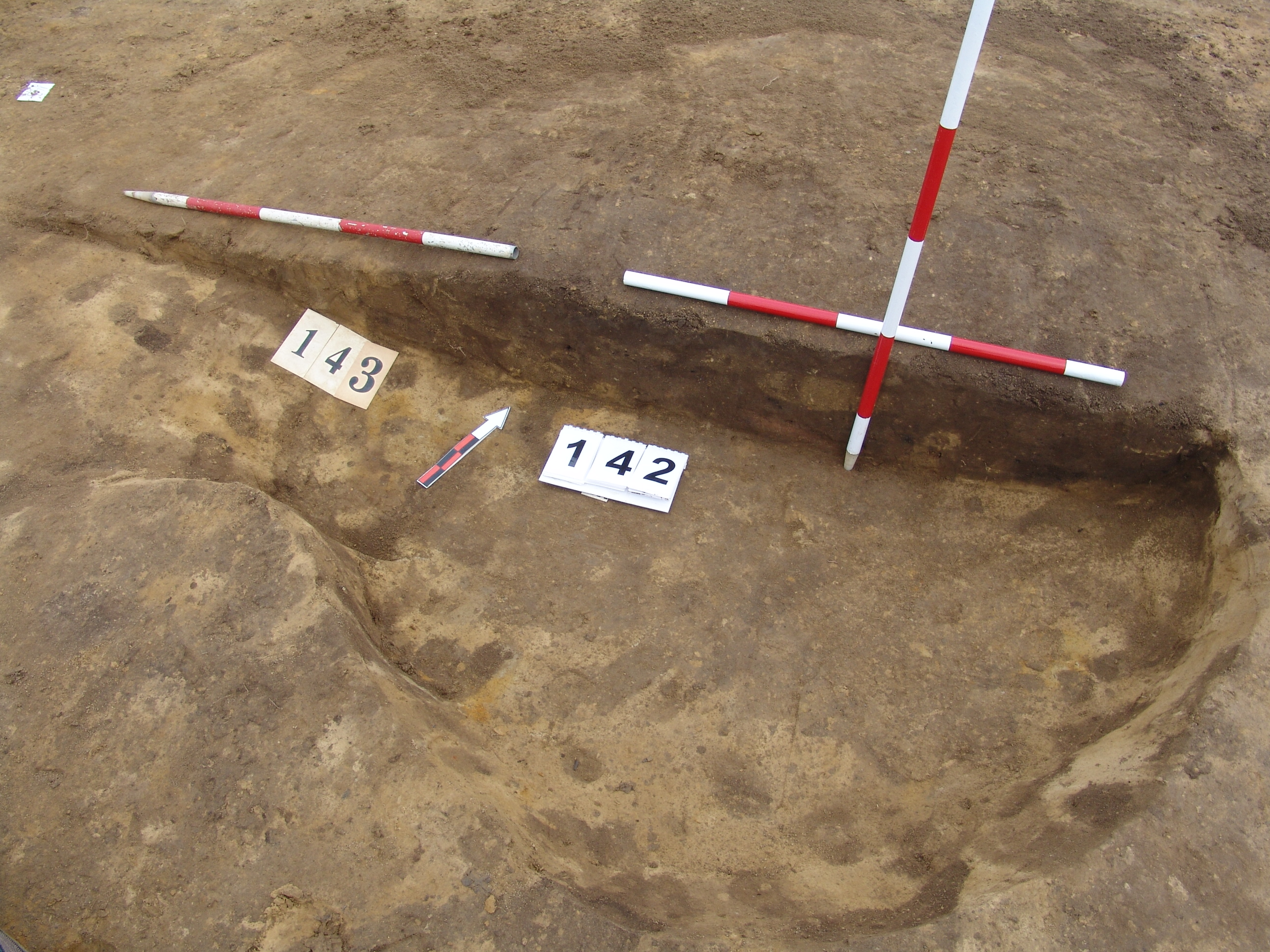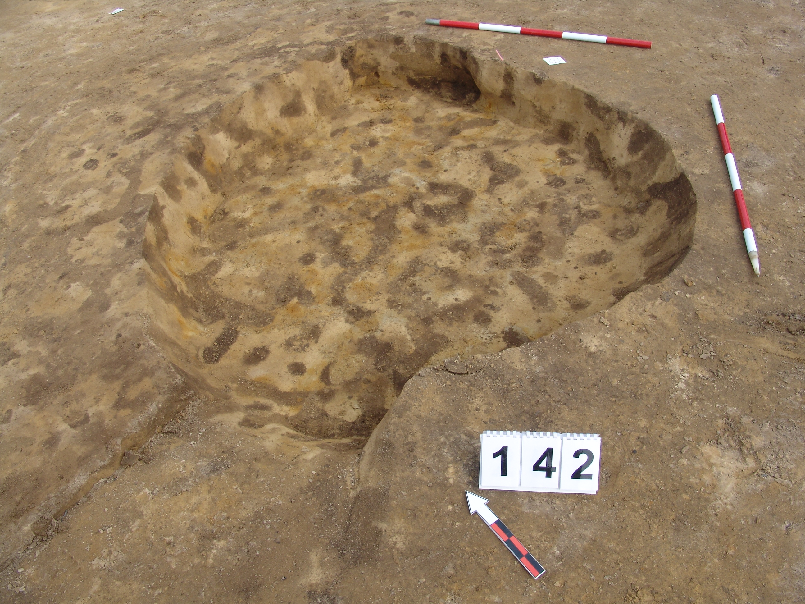 Kettős objektum K - i tagja. Jól rajzolódó kerek foltja egyértelműen rajta van a 143 objektum ny -i szélén, ha az valóban régészeti jelenség. Betöltése korom szemcsés, sárga szemcsés barnásszürke, középen kis pirosas folt a metszeten Kör alaprajzú, egyenes aljú, enyhén méhkas alakú gödör. Átmérője fent É - D 180, Ny - K 190 cm, lent É - D 170, Ny - K 170 cm. Mélysége 25 - 27 cm.