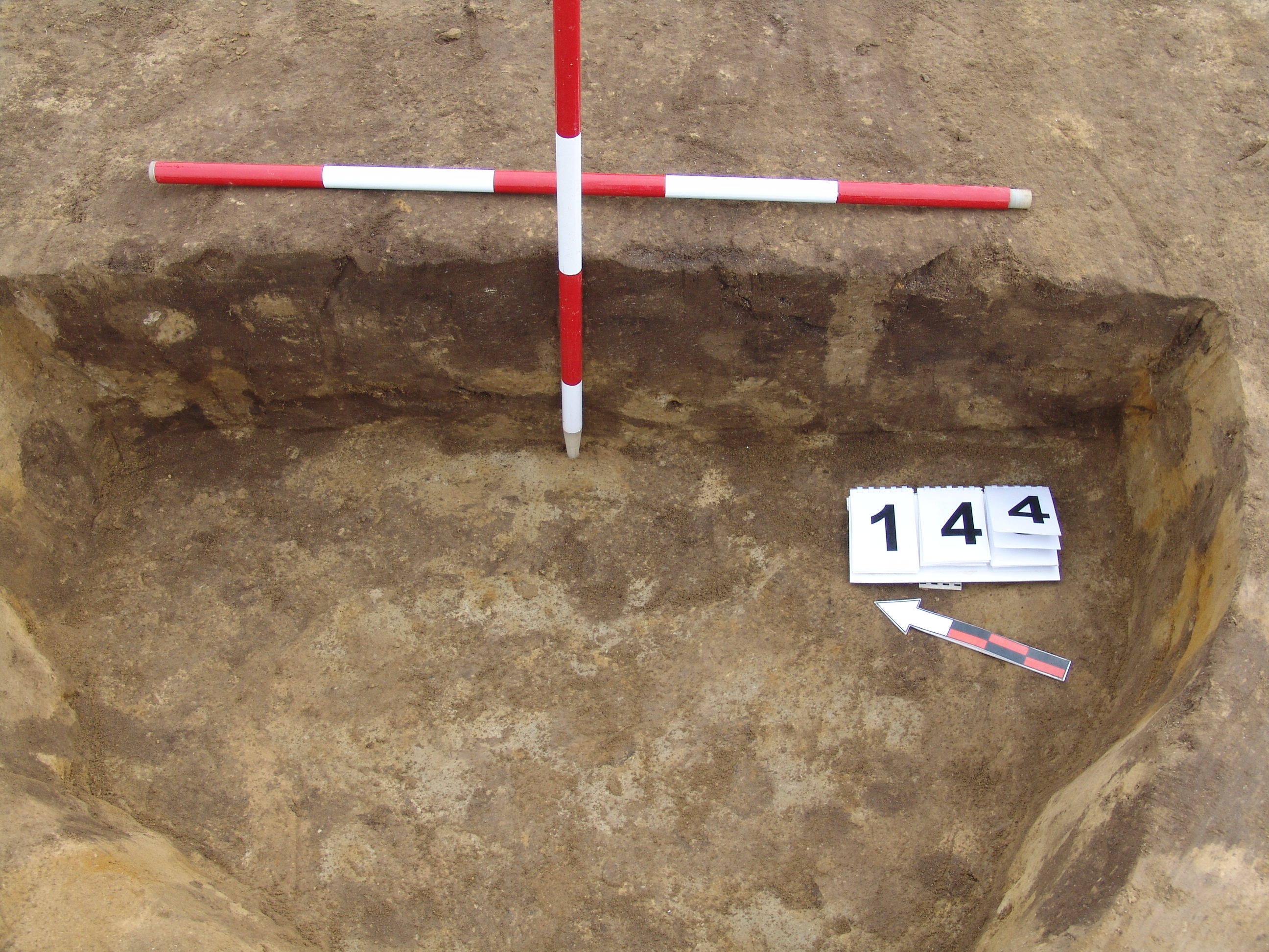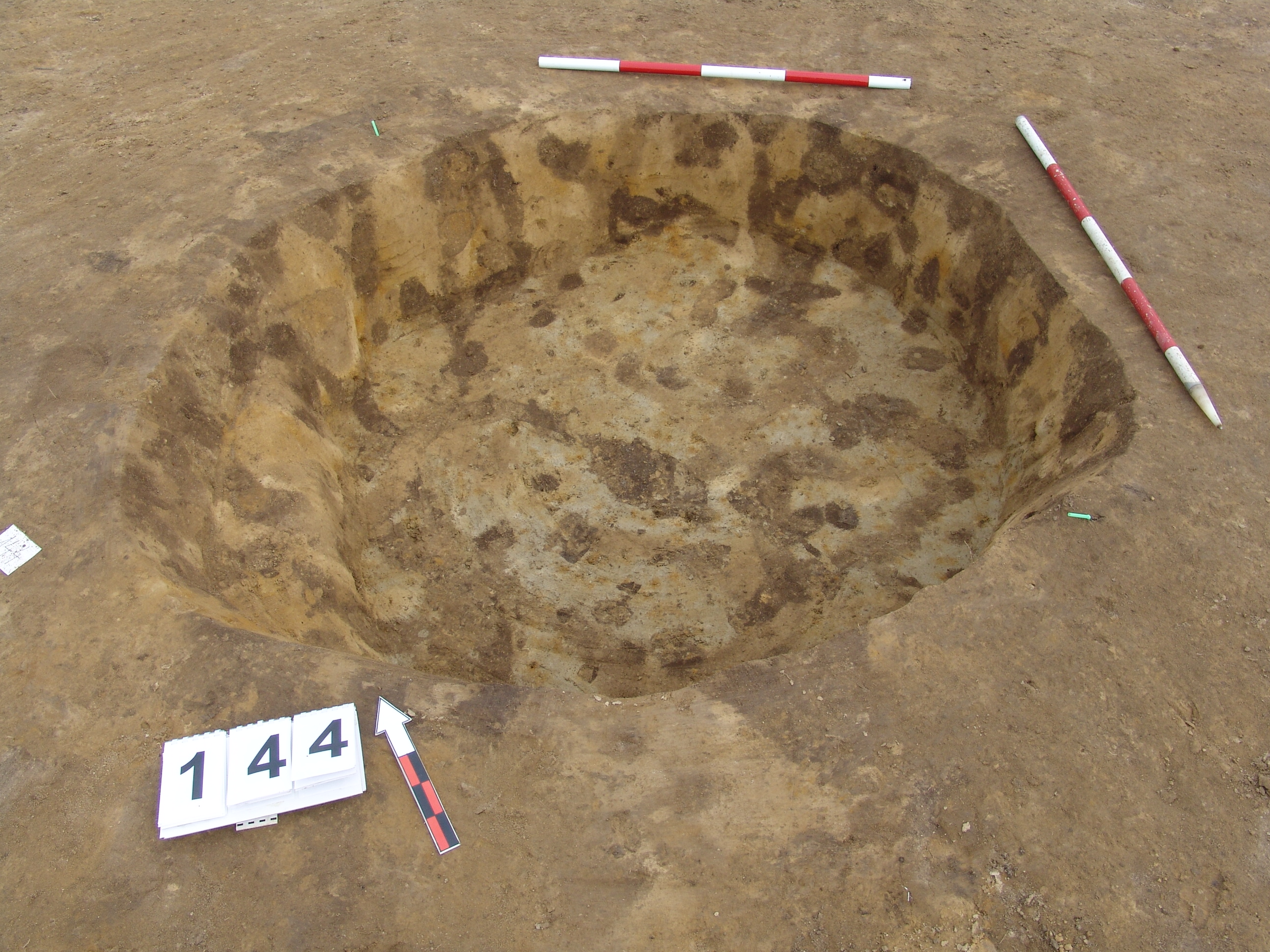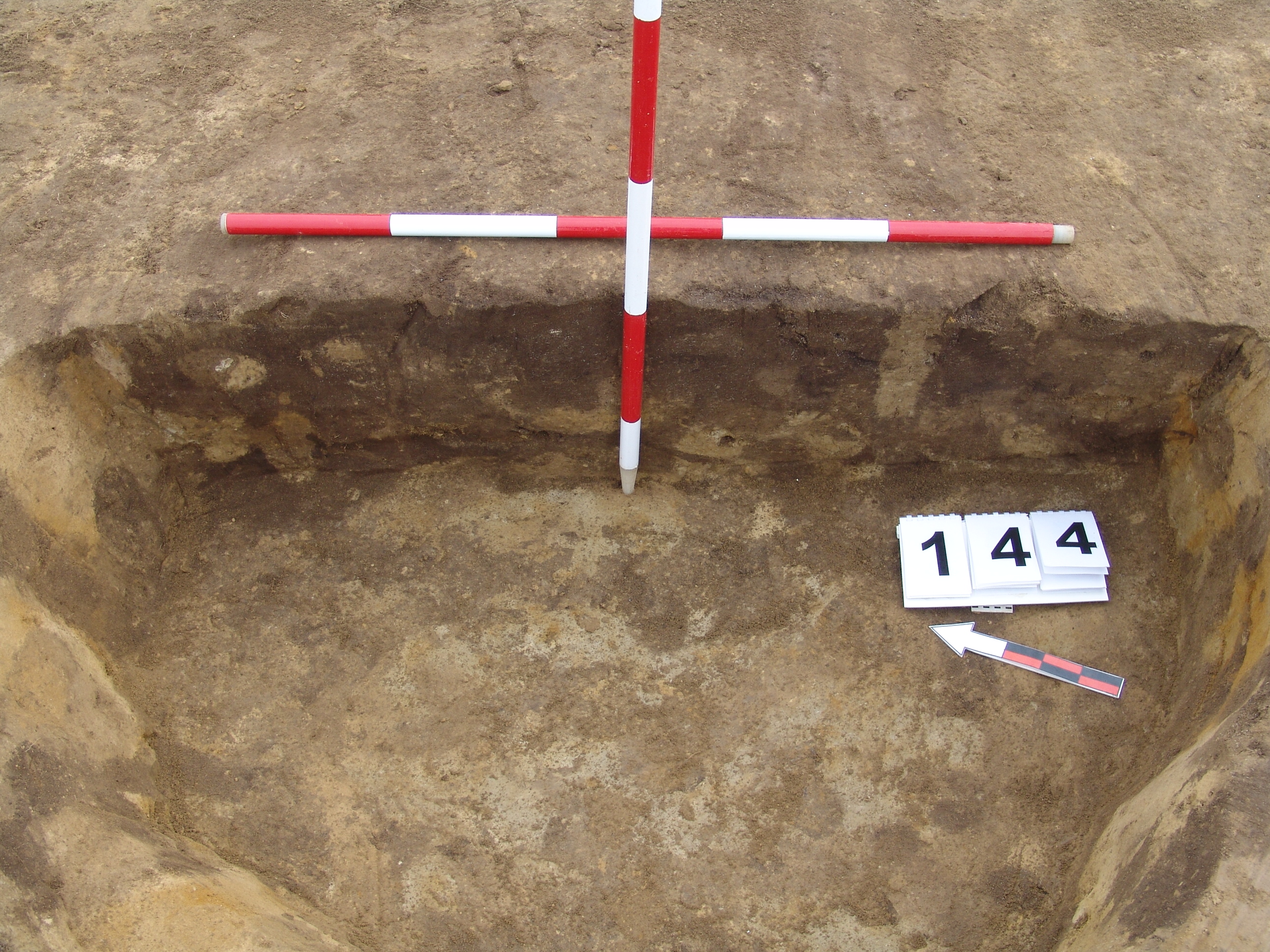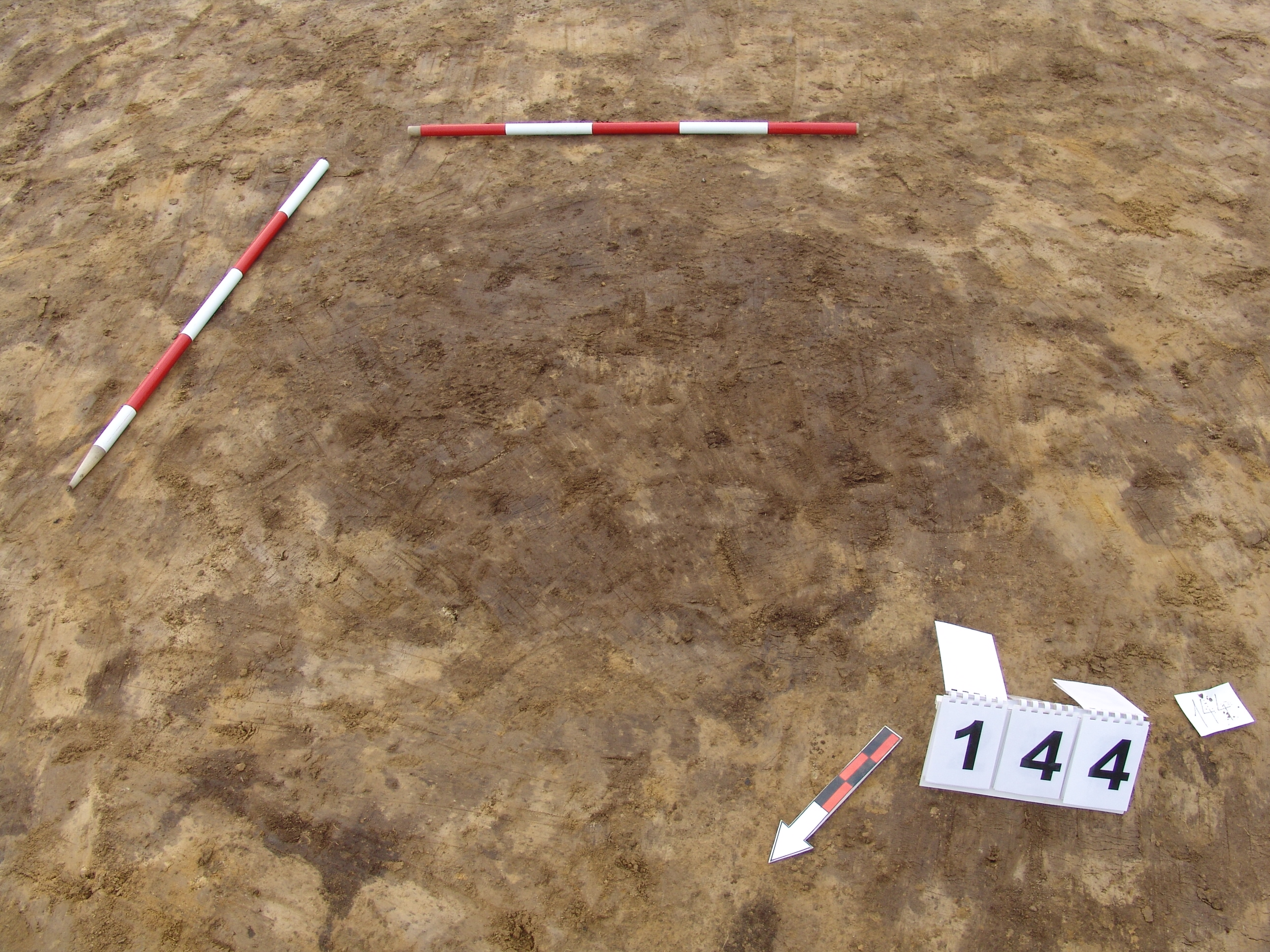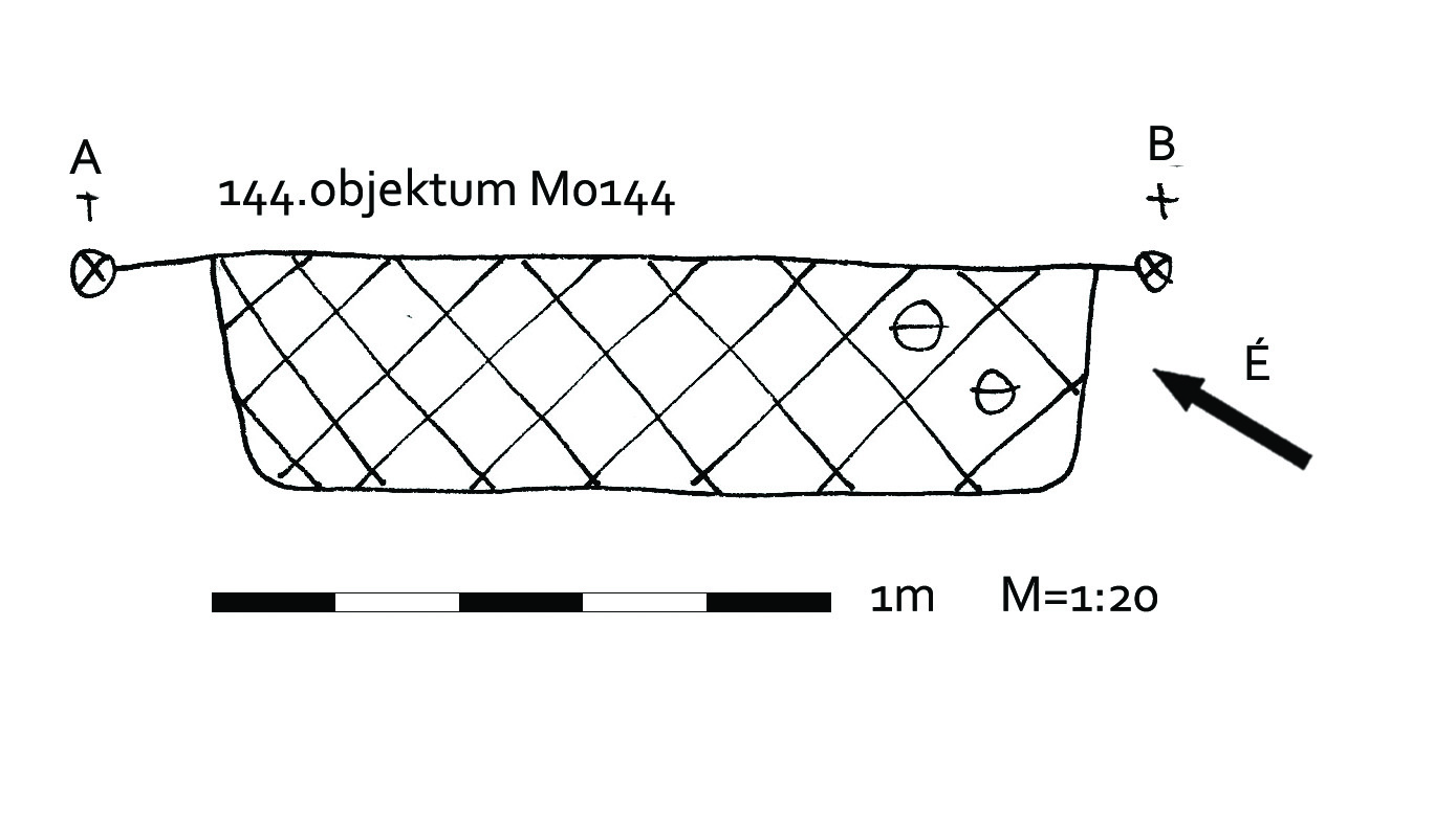 A 142 - 143 objektumoktól D - re jól rajzolódó kerek folttal jelentkezett. Függőleges falú, egyenes aljú, kör alaprajzú gödör. A Ny - i oldalon egy padkát bontottak - ez valószínűleg nem létezett, csak túlbontás. Betöltése egynemű barnásszürke, állatjáratos. Átmérője fent 150, lent É - D 130, Ny - K 140 cm. Mélysége 34 - 36 cm.