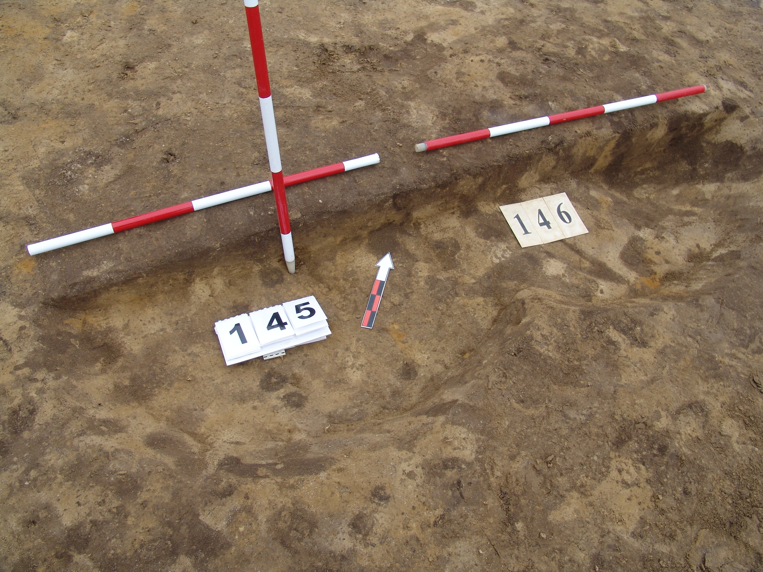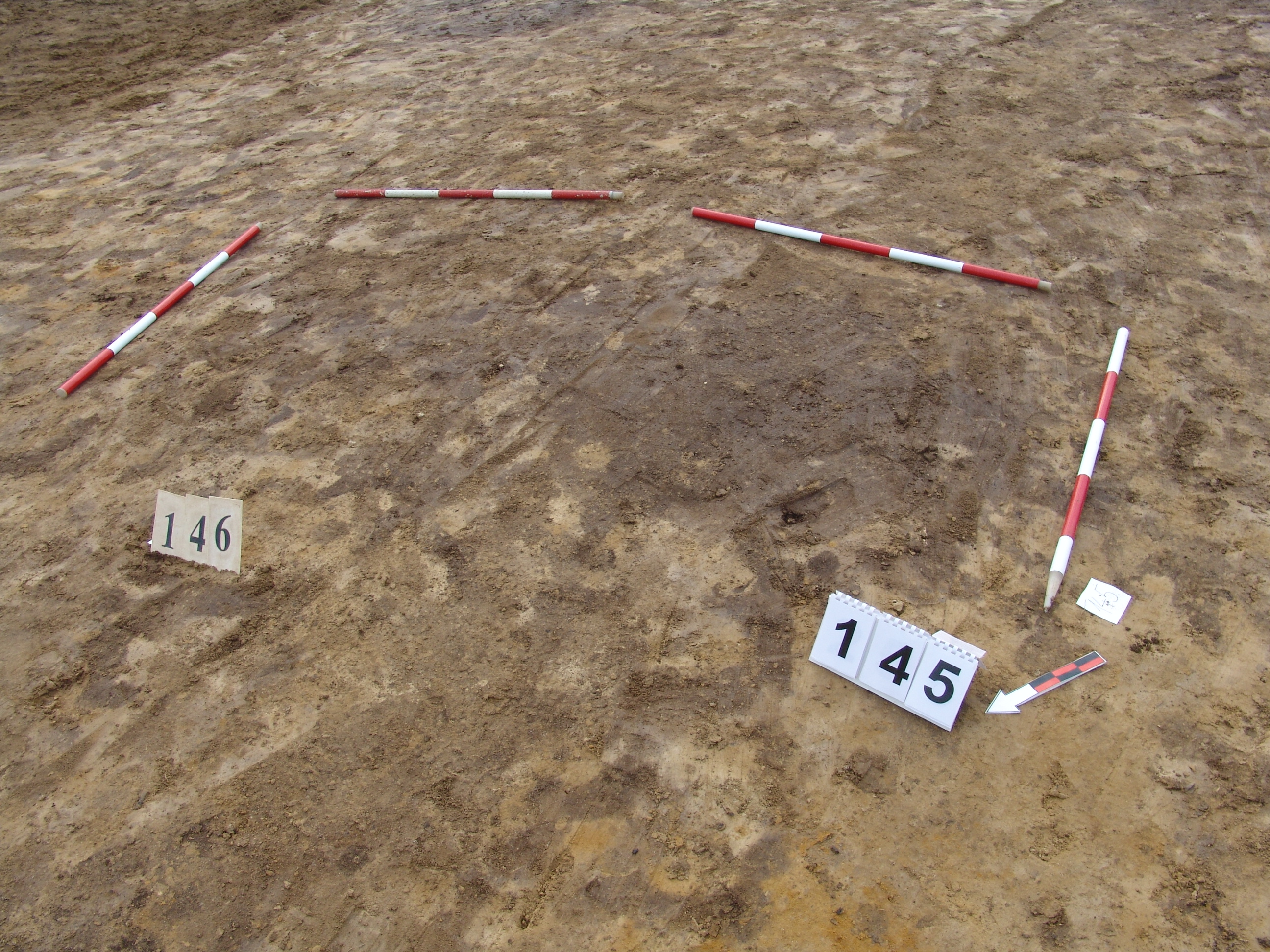 A 145 objektum K -i oldala alatt halványabban, elúszóan jelentkező folt. "Maszatos" sötét szürke erősen állatjáratos betöltésű, meredek falú, egyenes aljú, kör alaprajzú gödör. Átmérője fent É - D 113, Ny - K 120 cm, lent É - D 94, Ny - K 103 cm. Mélysége 15 cm.