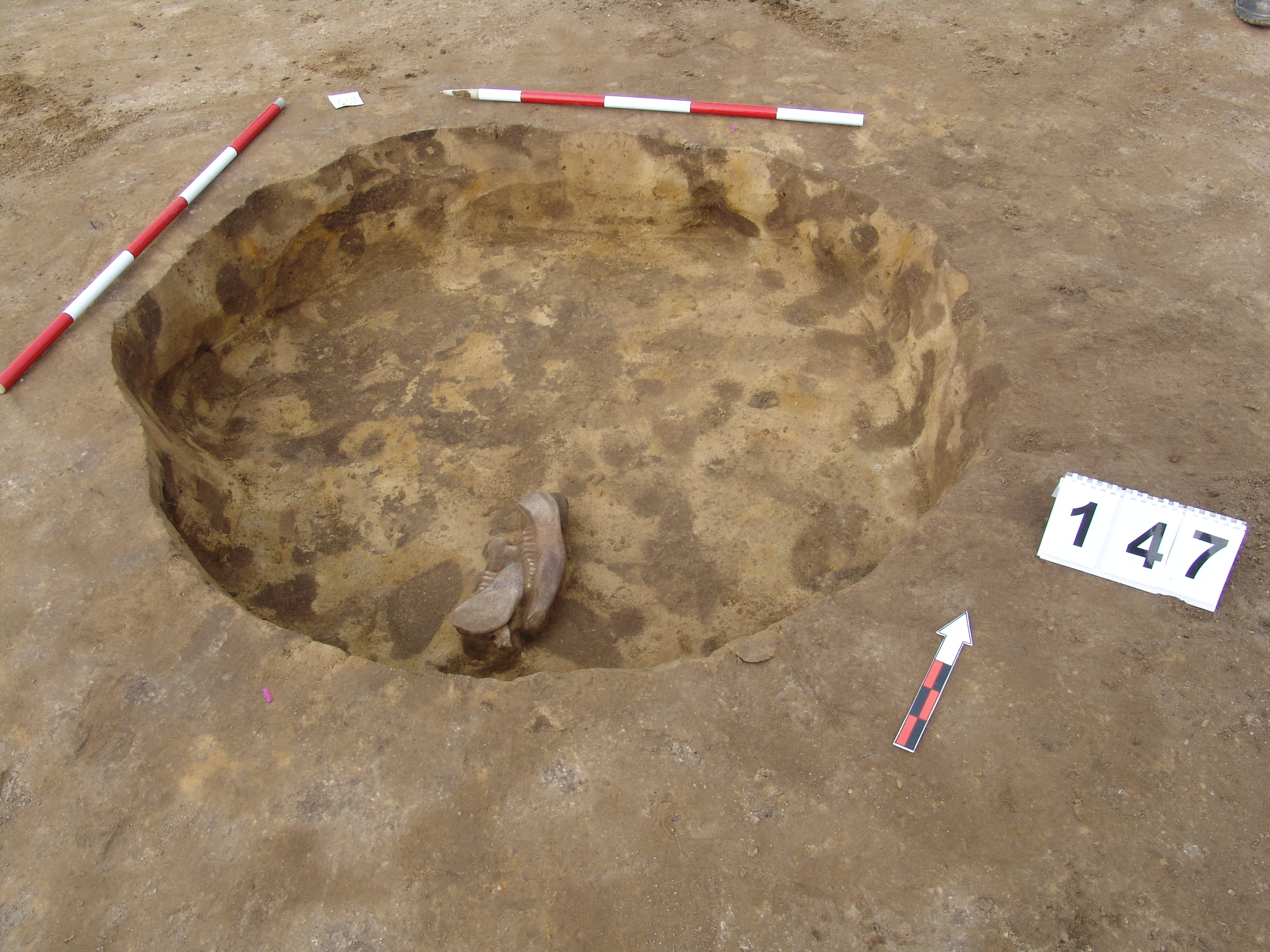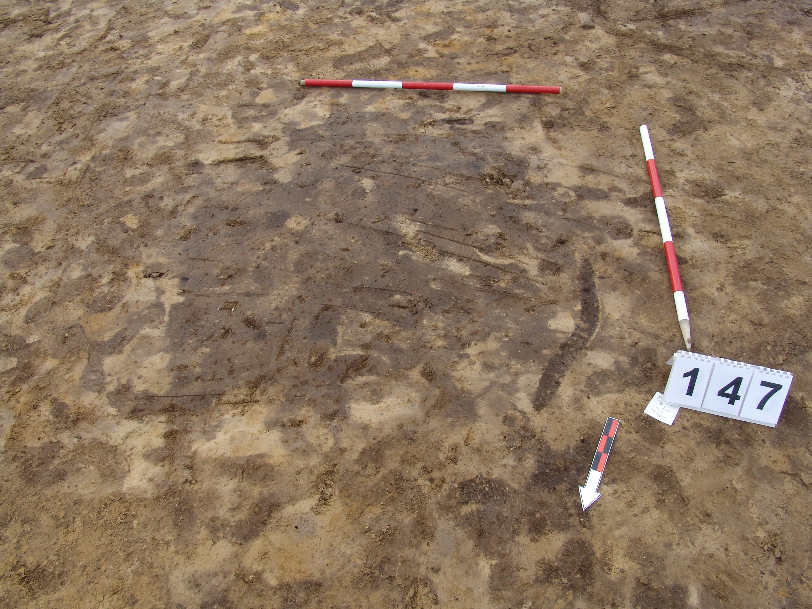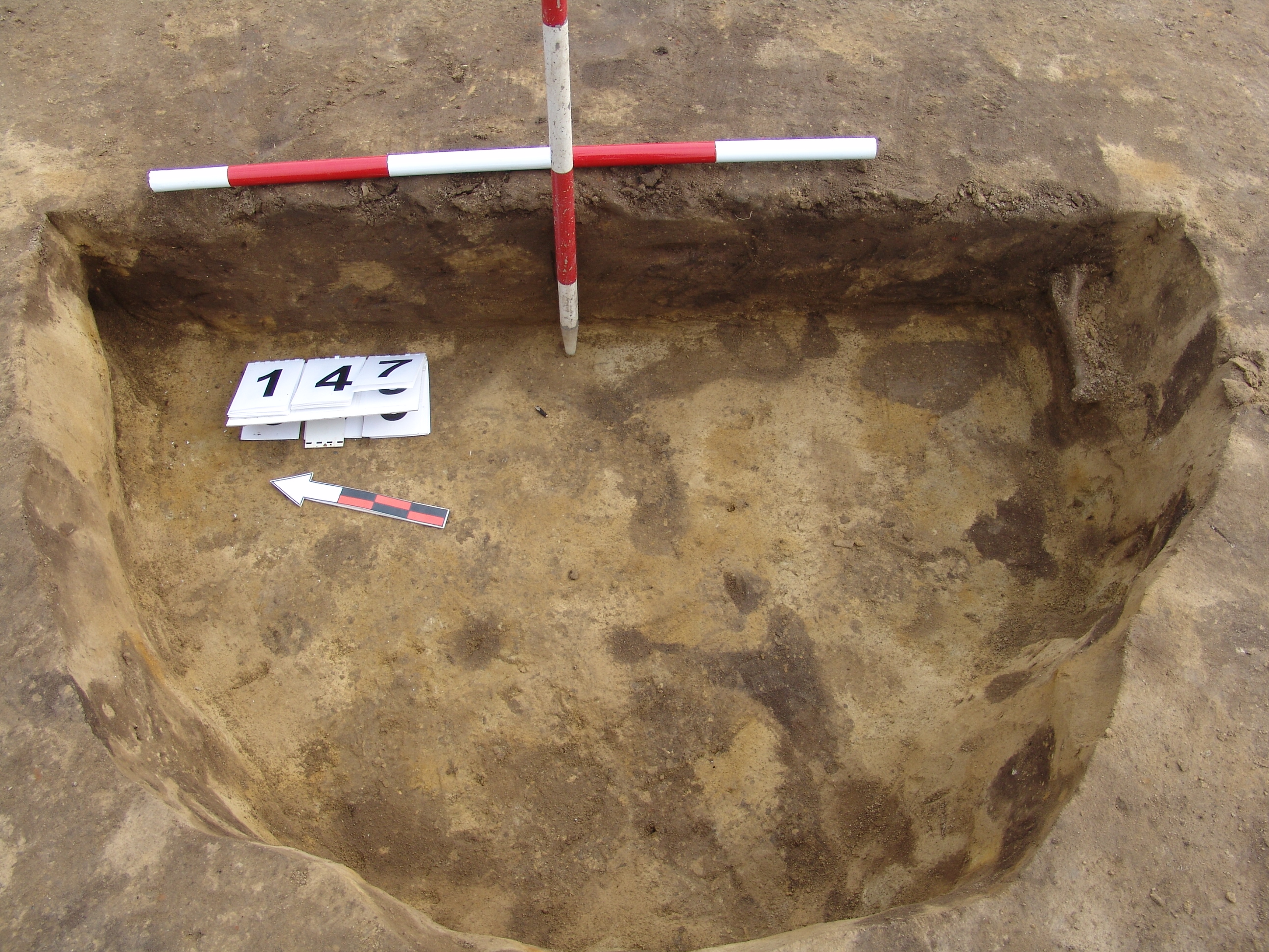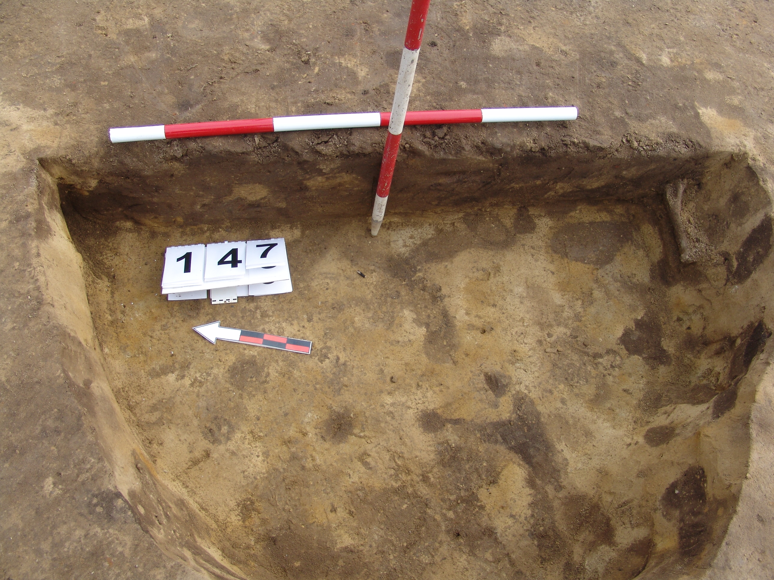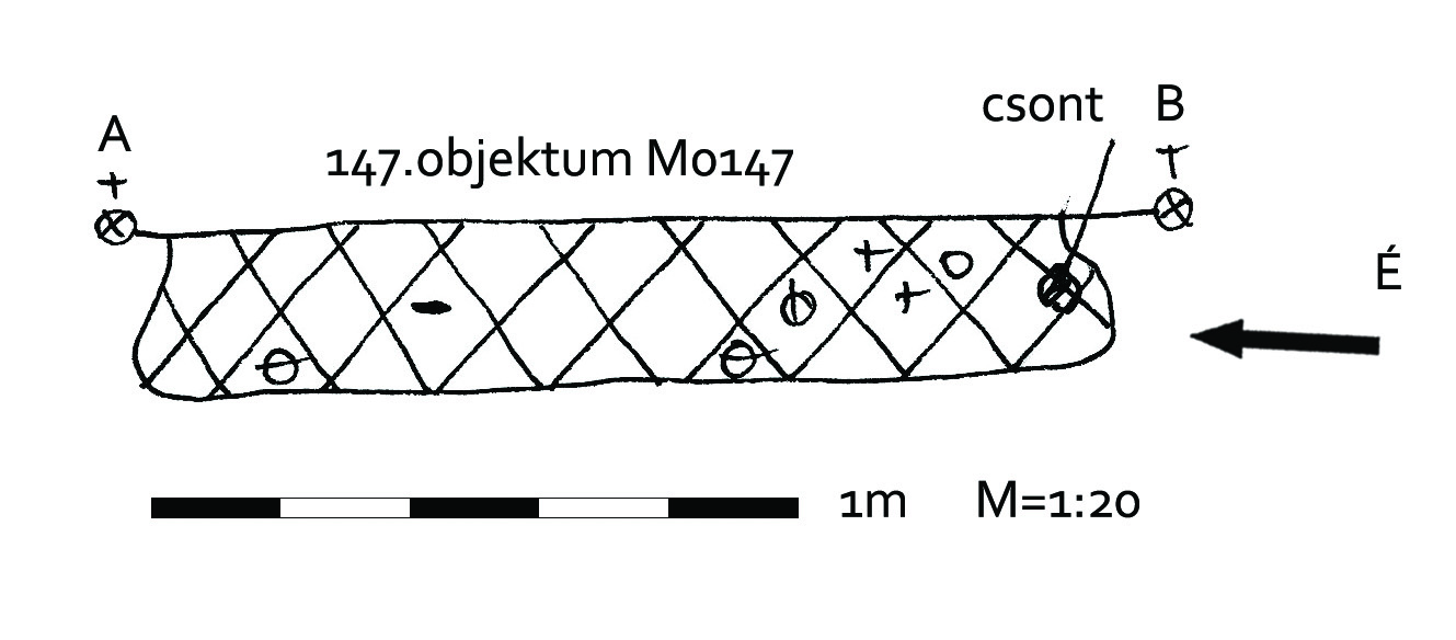 A 138 objektumtól D - re, a 146 objektumtól ÉK - re kissé elúszó, de pregnáns fekete folttal jelentkező gödör a sárga homokban, erősen patics szemcsés. Kör alaprajzú, enyhén méhkas alakú, egyenes aljú gödör. Betöltése egynemű sárga szemcsés barnásszürke. Átmérője fent É - D 141, Ny - K 162 cm, lent É - D 143, Ny - K 145 cm. Mélysége 26 - 34 cm.