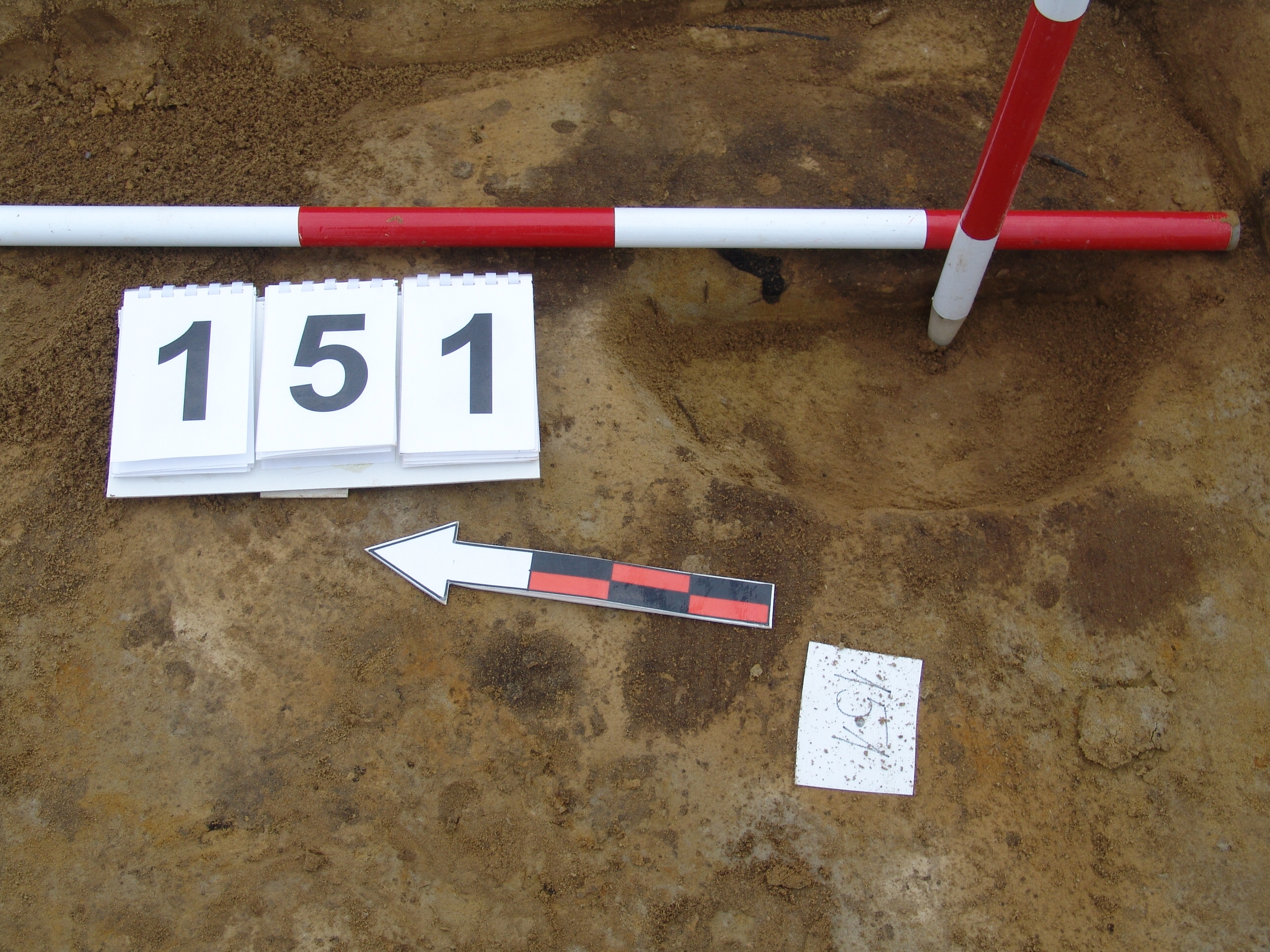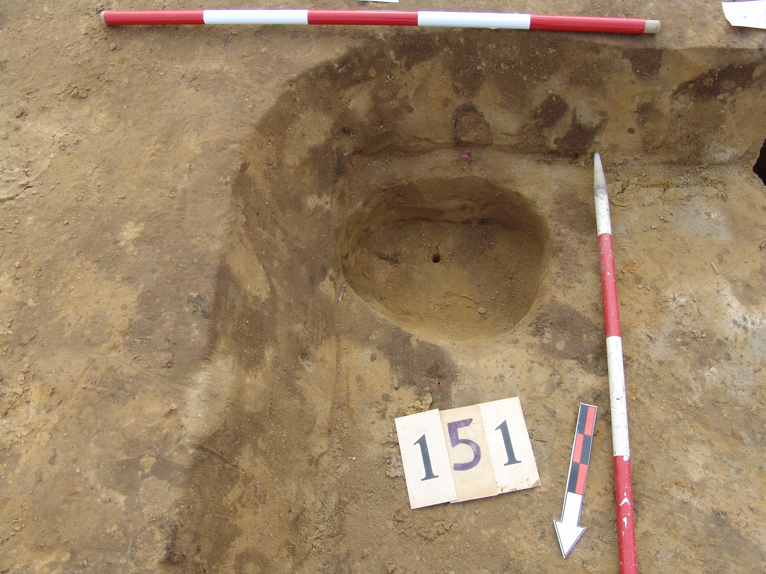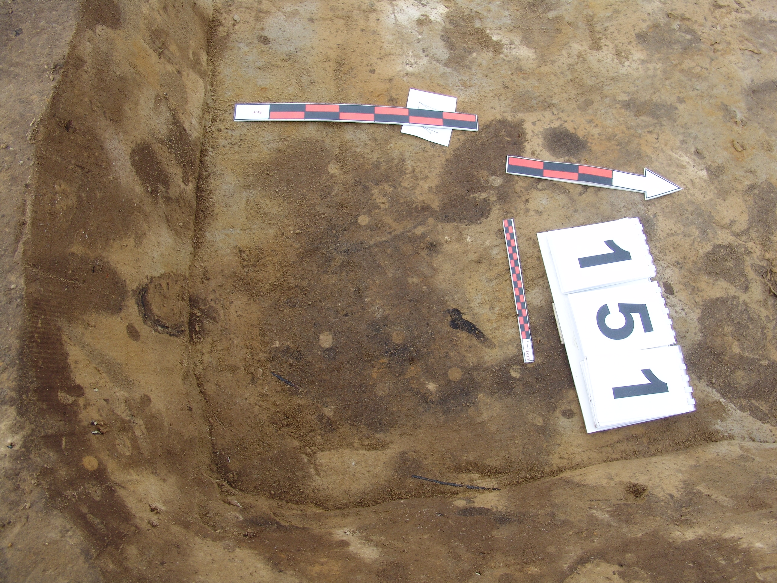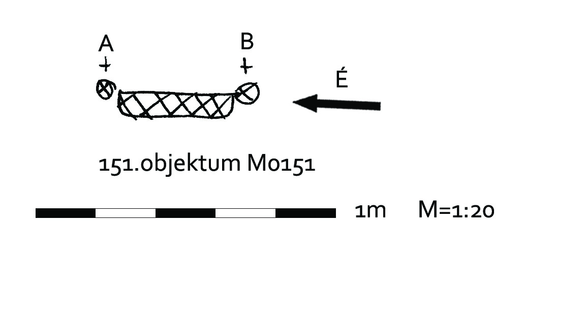 A 85 objektum ( ház ) DK - i sarkában szabályos kerek folttal jelentkező cölöplyuk. Átmérője É - D 36, Ny - K 40 cm. Mélysége a padlószinttől 14 cm, a ház jelentkezési szintjétől 39 cm. Betöltése a sárga szemcsés szürke.