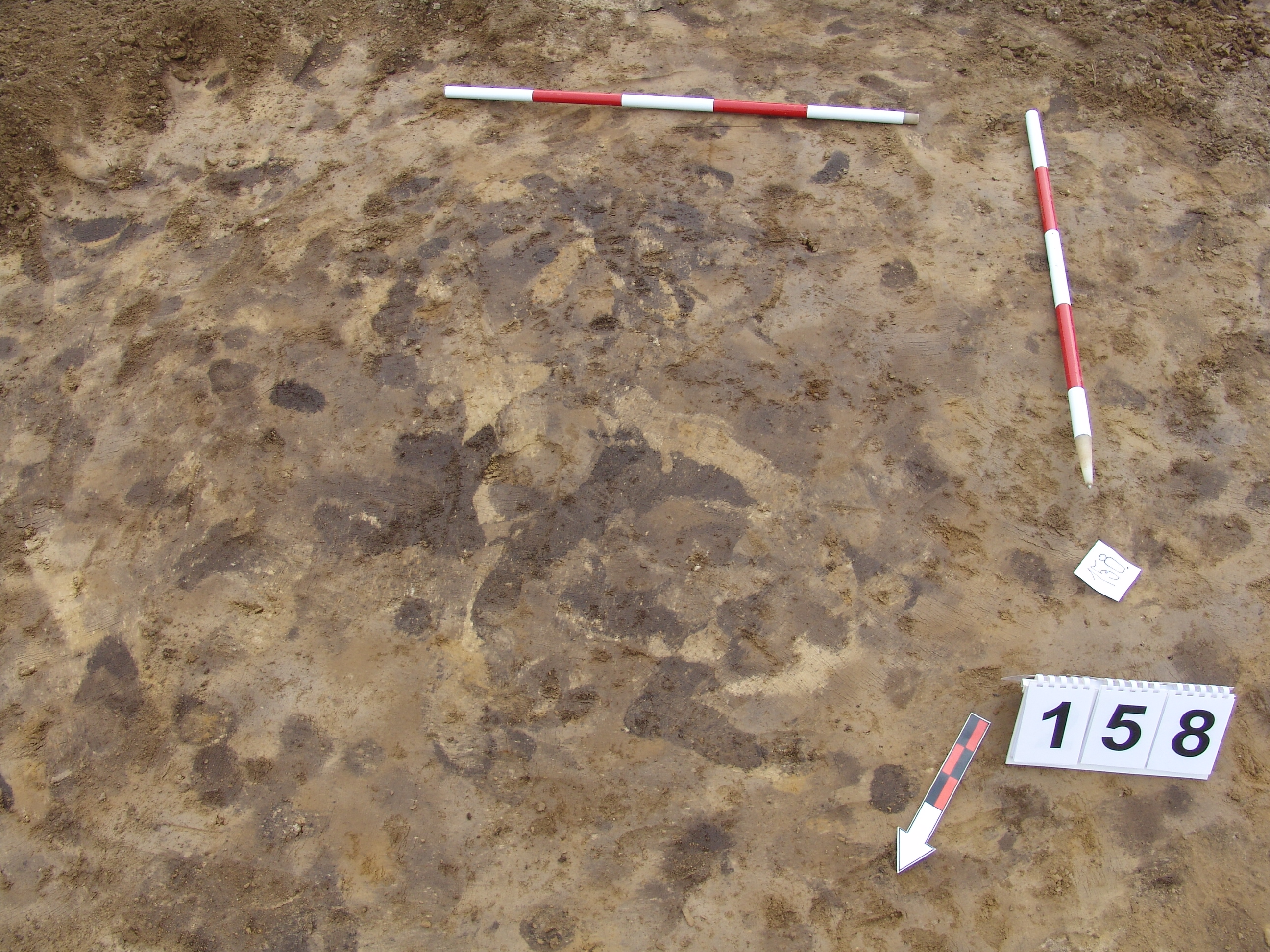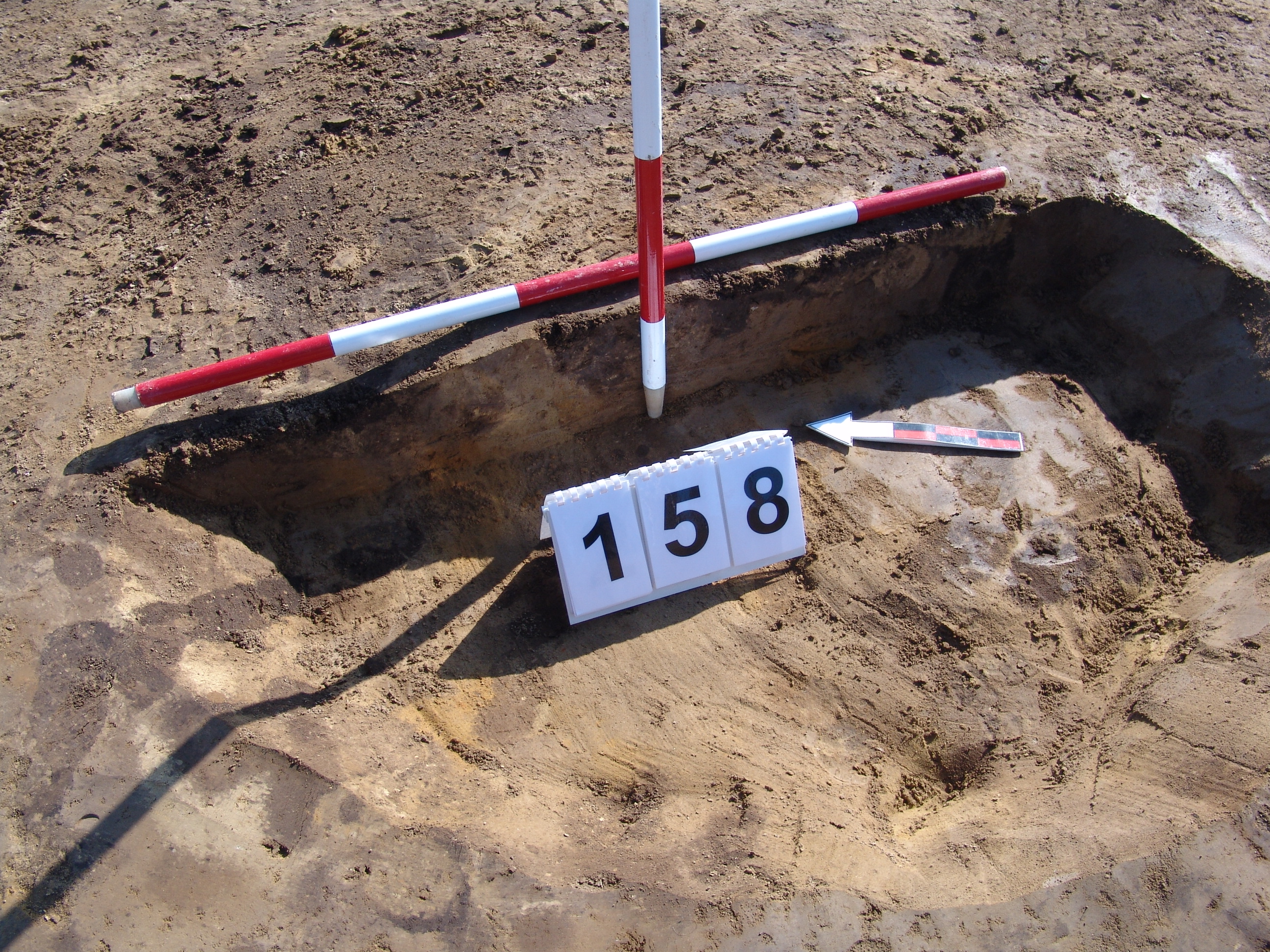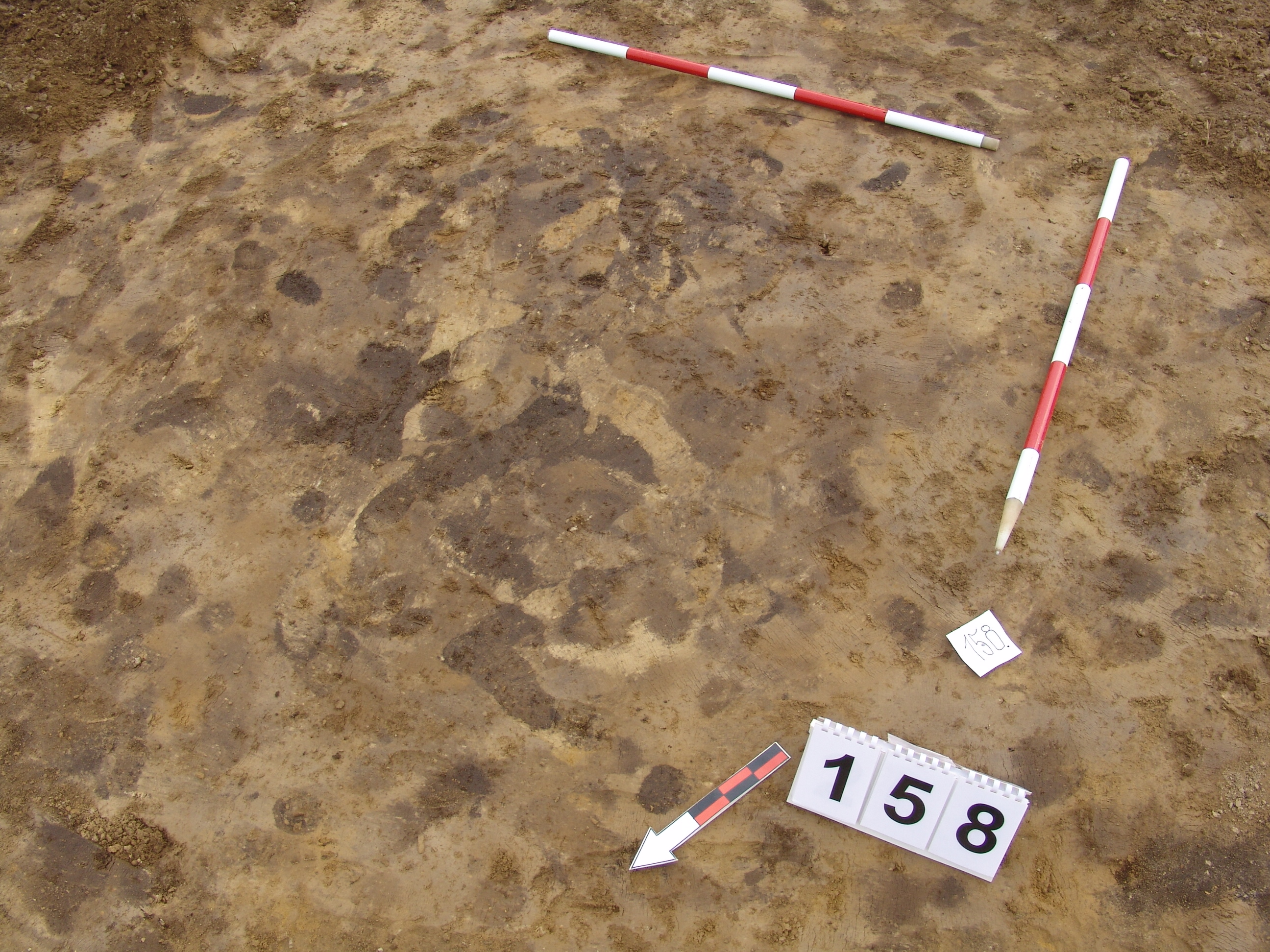 A 157 objektumtól K - re körülbelül 3 méterre maszatos, világosabb kerek folttal jelentkező gödör. A bontás során tisztáztuk, hogy nem régészeti jelenség.