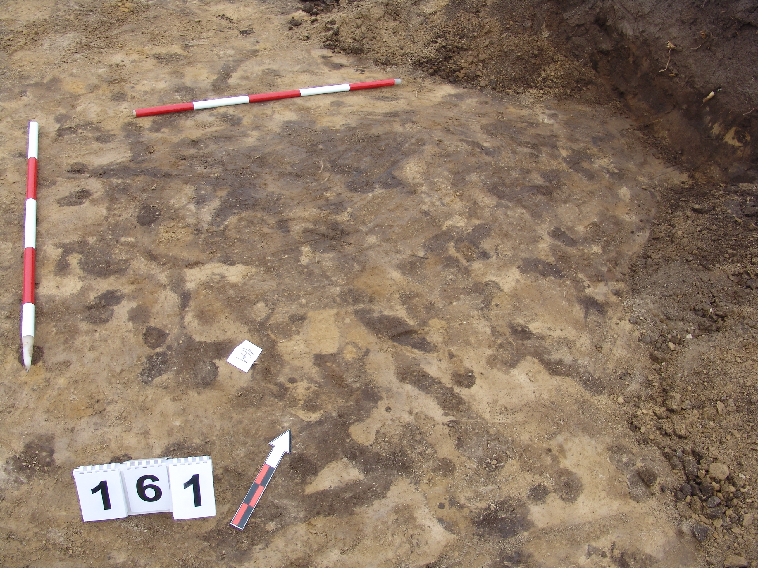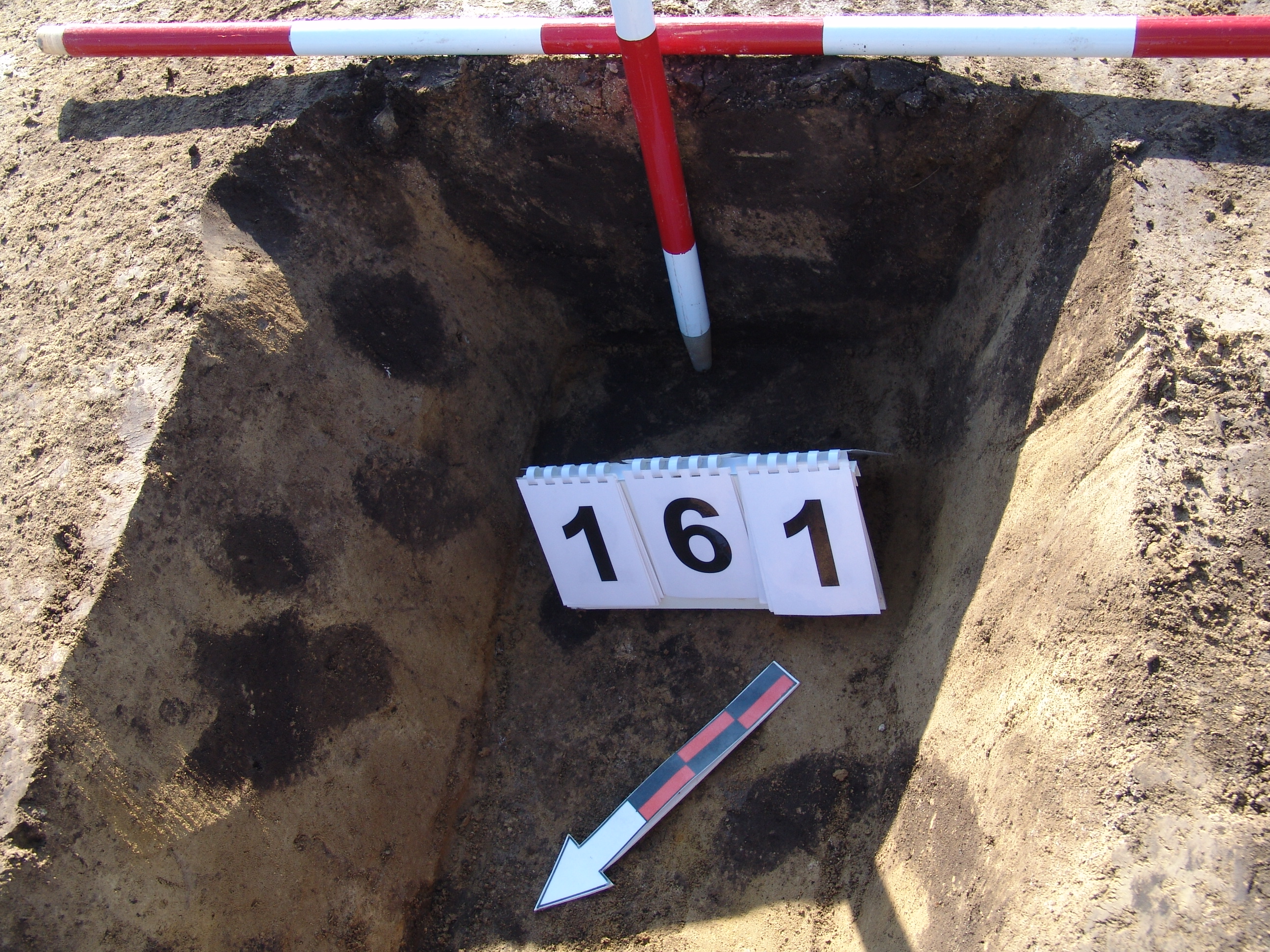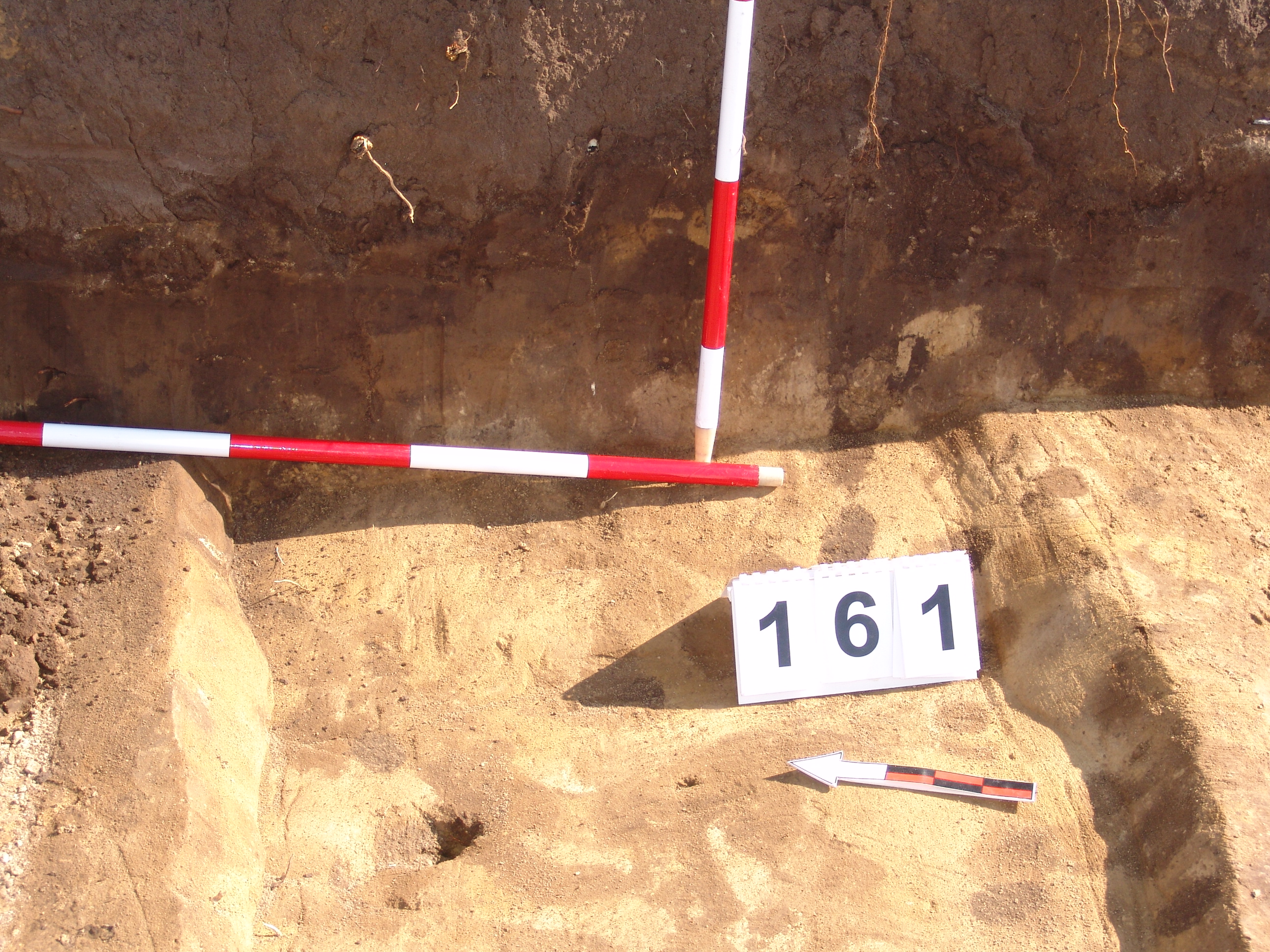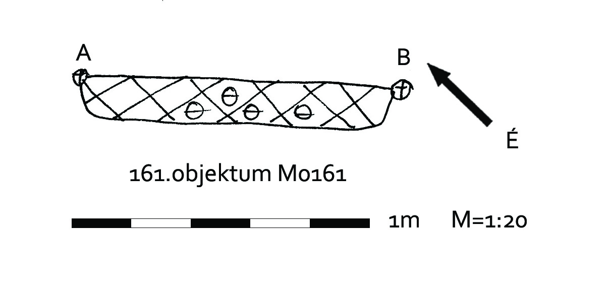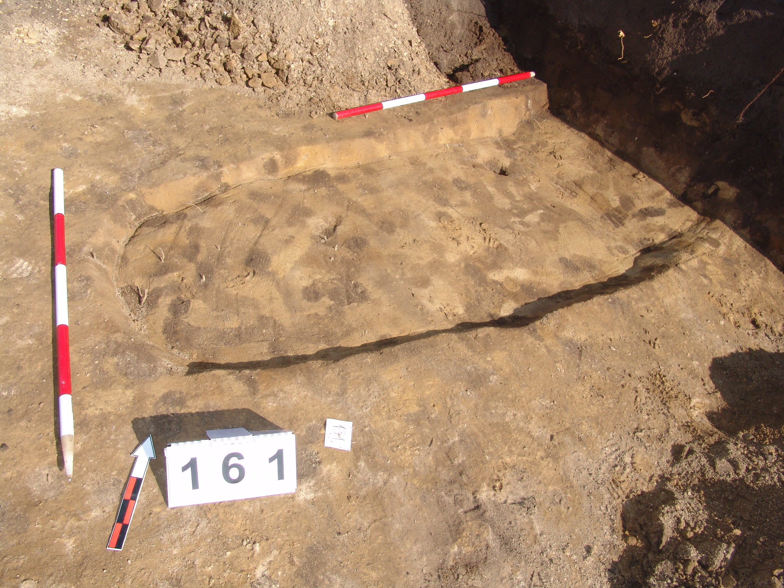 A tanya sarkánál a feltárandó terület K - i szélénél elúszó, szabálytalan folt. Meredek falú, egyenes aljú rövidke É - D - i árok. Betöltése egynemű sárga szemcsés kevert sötétbarna. Hosszúsága fent 210 lent 205 cm. Mélysége 8 - 12 cm. Szélessége fent 100, lent 75 cm.