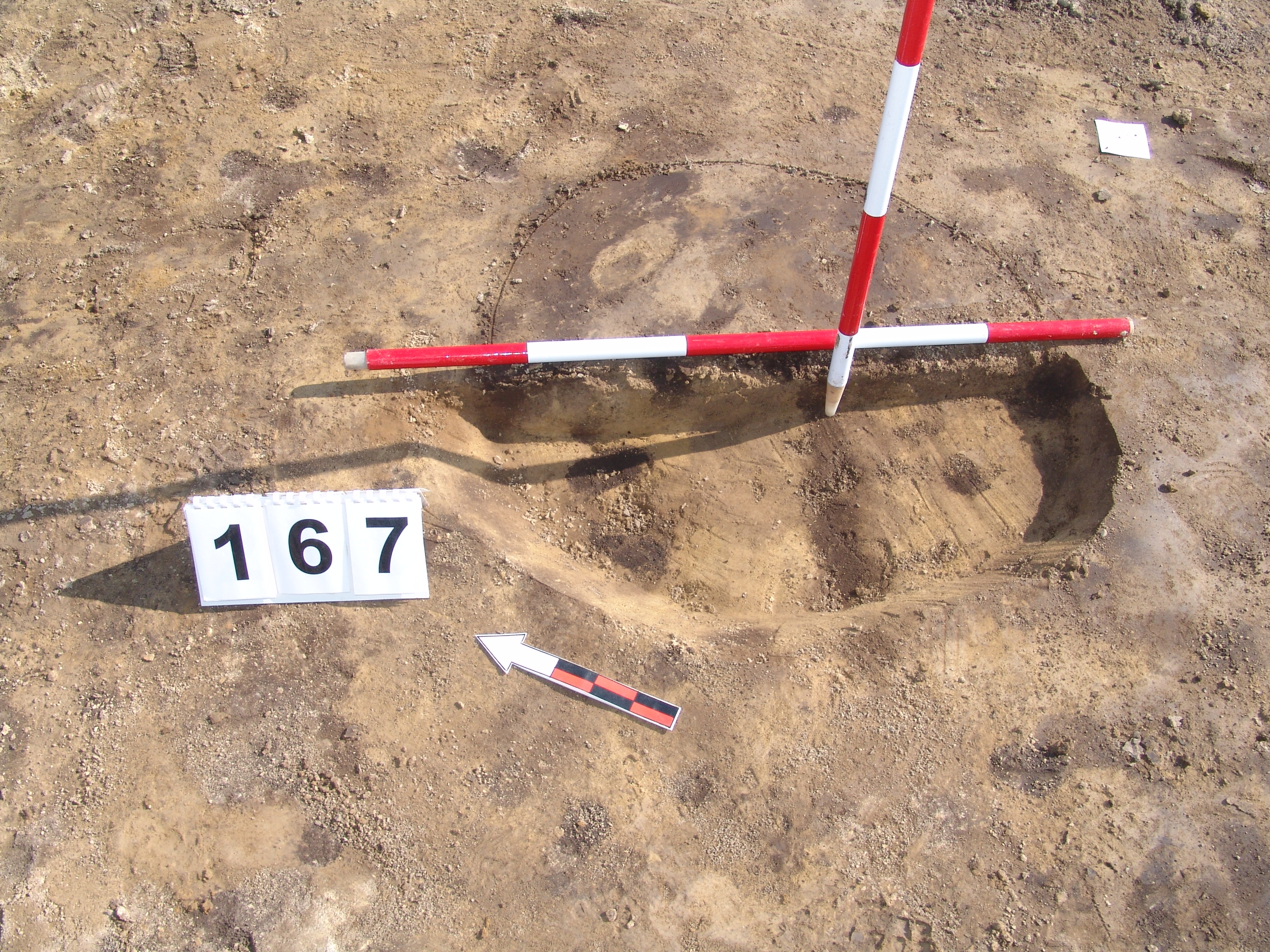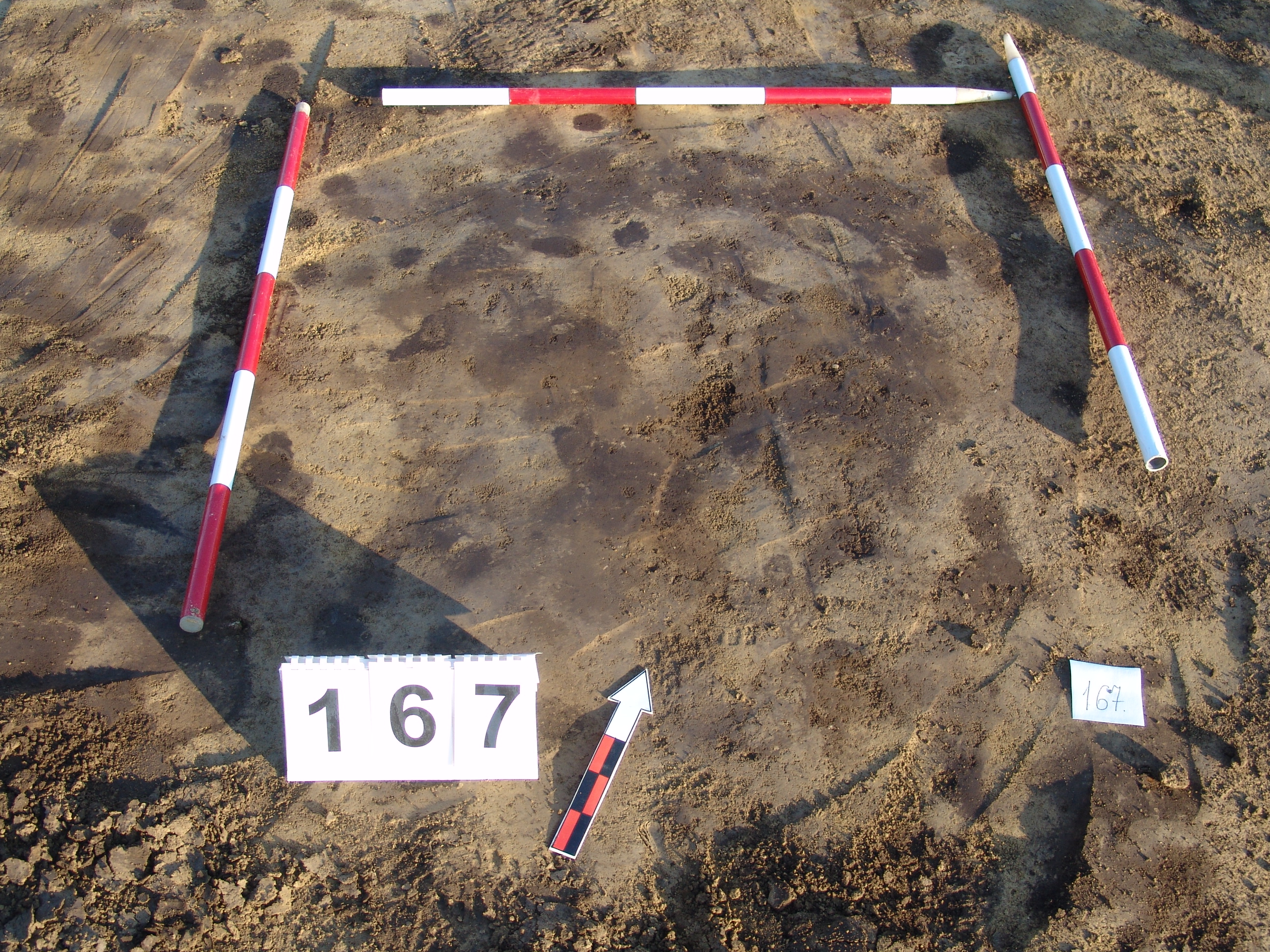 Kissé elúszó, kerek sötét folttal jelentkező gödör. Bontásnál kiderült, hogy a sötét rész max. 1 - 2 cm. Nem egyértelmű, hogy régészeti jelenség -e. Ha igen, a legalja valaminek, de inkább talaj elszíneződés.
