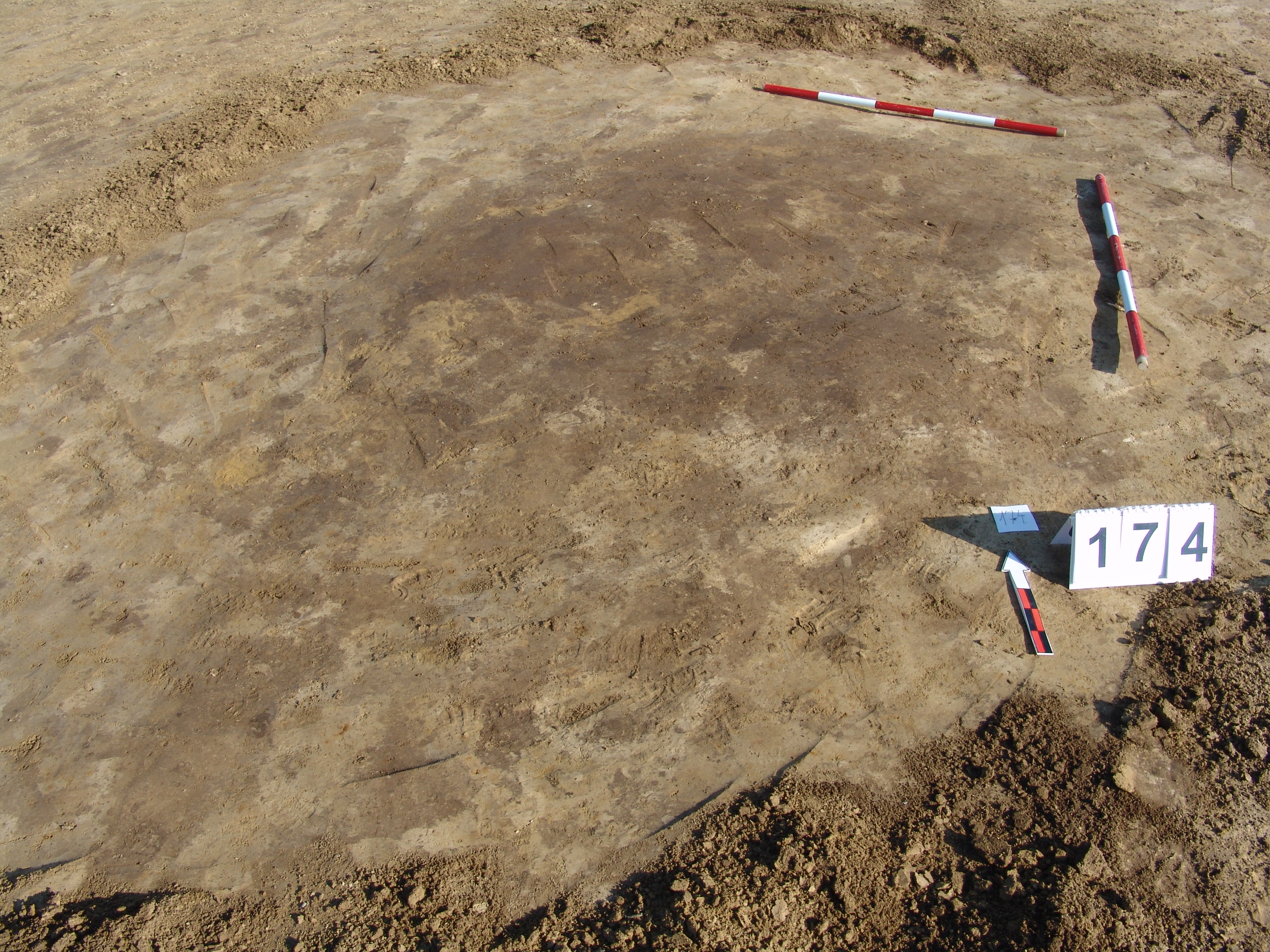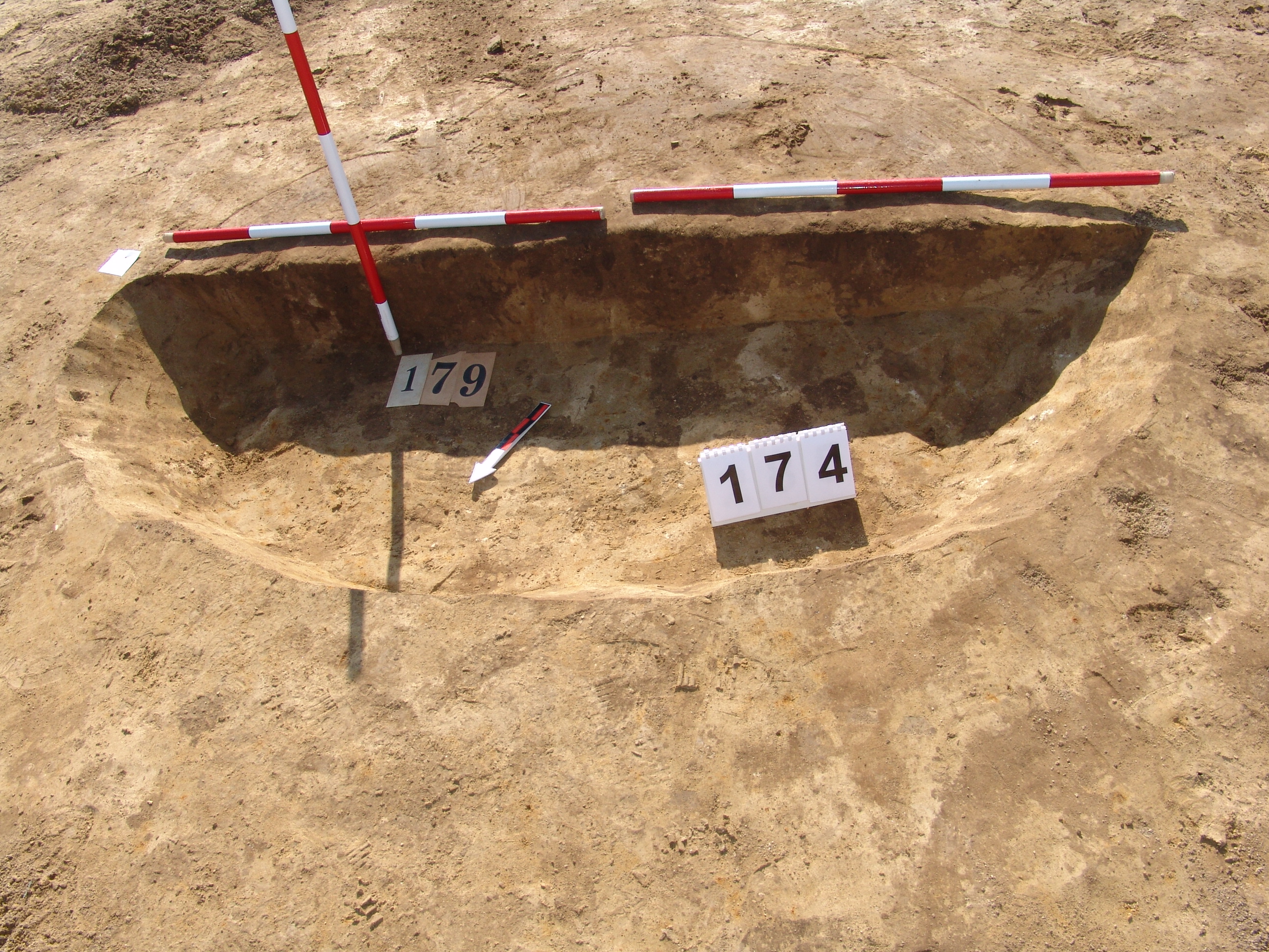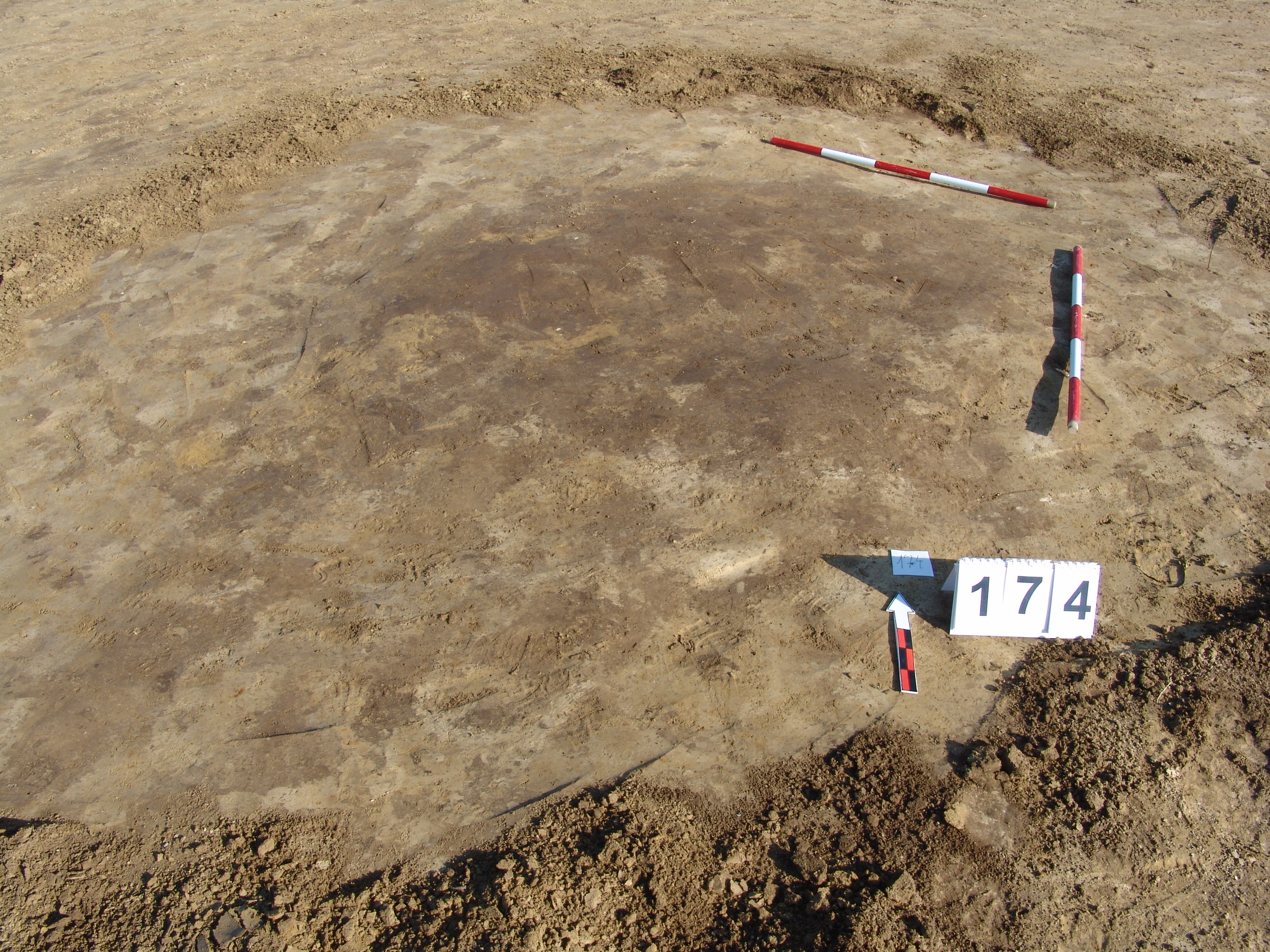 Barnás világosabb nagyobb ovális folttal jelentkezett a sárga homokban a feltárandó terület K -i szélénél. Kissé elúszó. A bontásnál kiderült, hogy 2 gödör. A 174 számot a Ny - i nagyobb objektumnak hagytuk meg. Meredek falú, egyenes aljú. Alját lefelé túlbontottuk. Betöltése egynemű, sárga szemcsés sötétbarna. Fala meredek, alja egyenes, kör alaprajzú. Átmérője fent É - D 155, Ny - K 150, lent É - D 140, Ny - K 140 cm. Mélysége 10 - 15 cm.