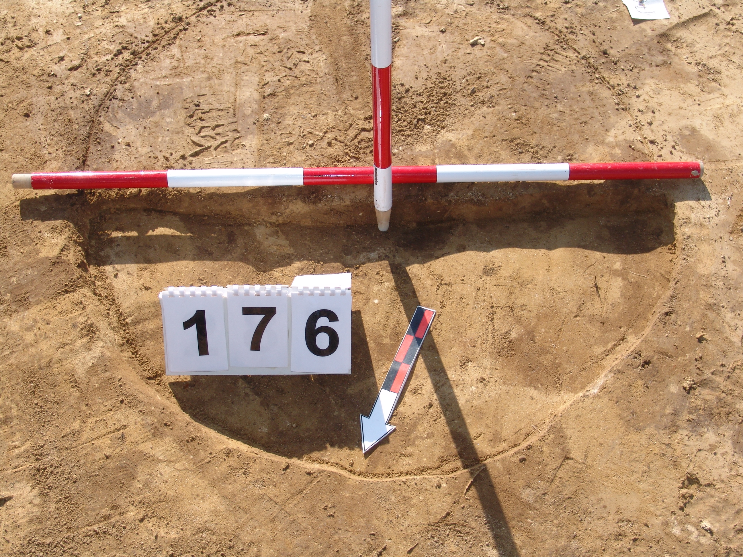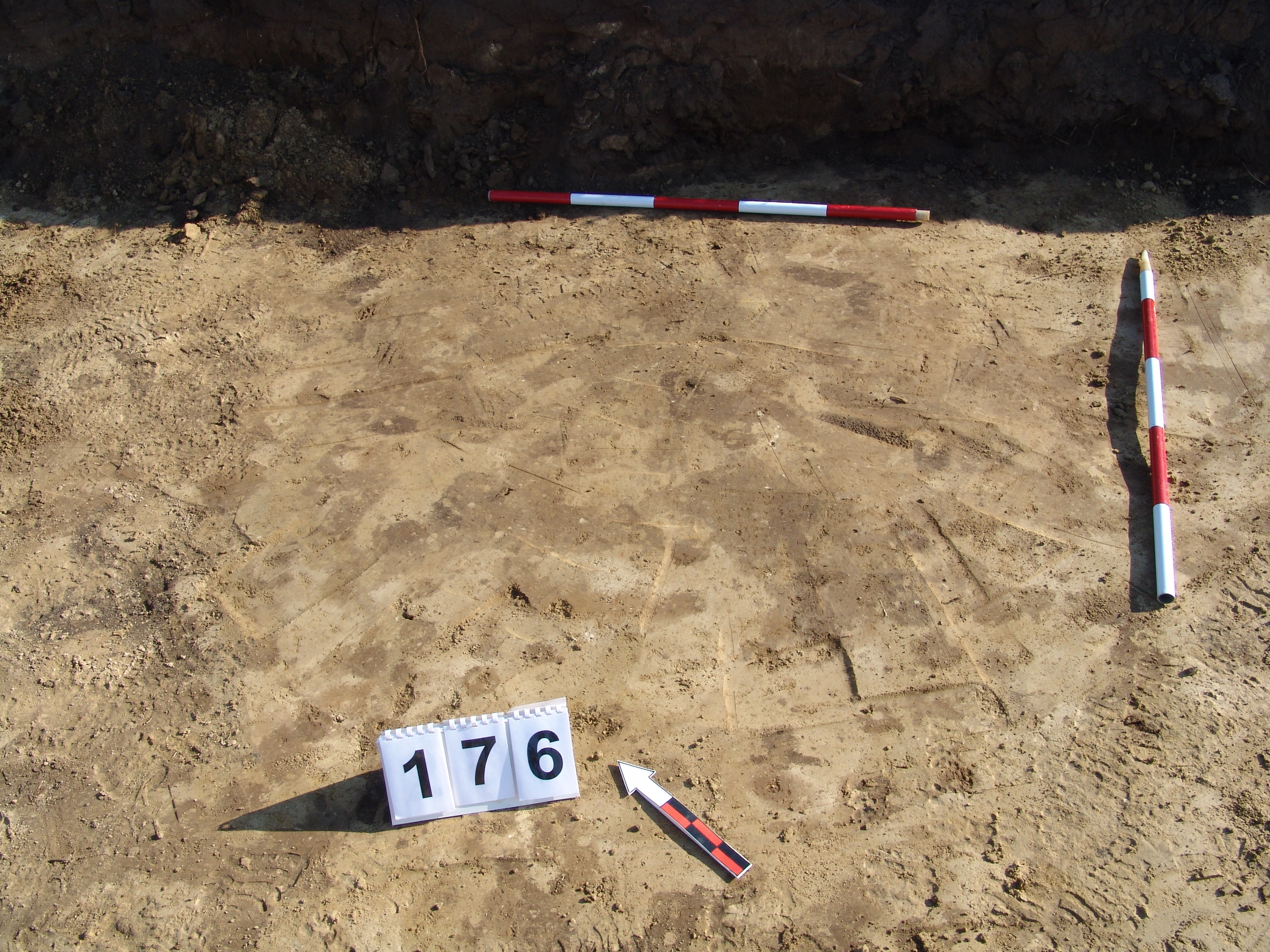 A 175 objektumtól ÉK - re a feltárás széle alű "futó" kerek, kissé elúszó világosabb, barnás folt. A bontásnál tisztáztuk, hogy nem régészeti jelenség.