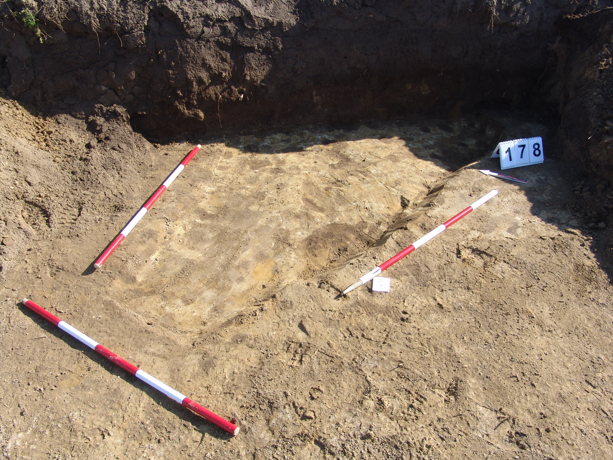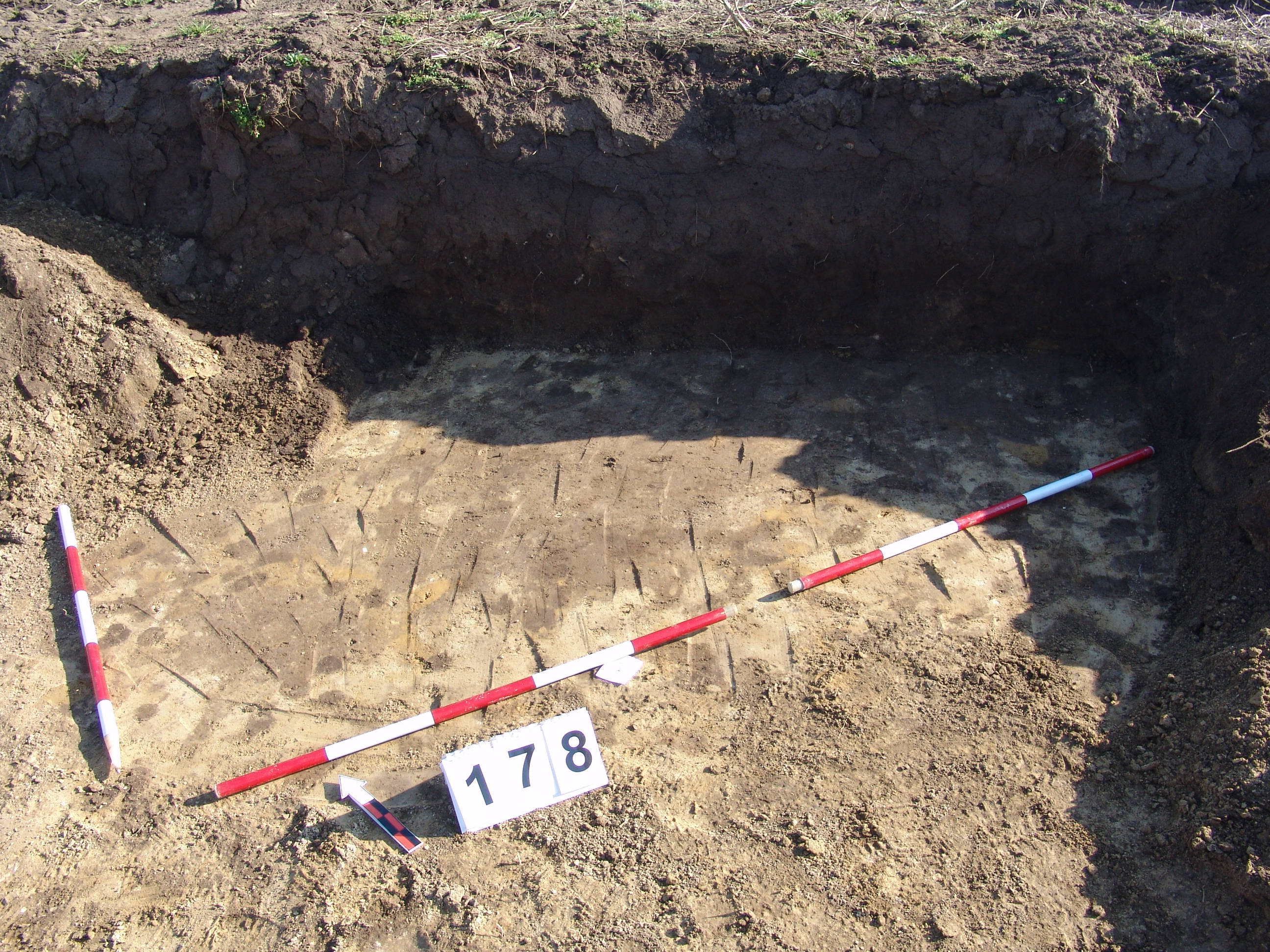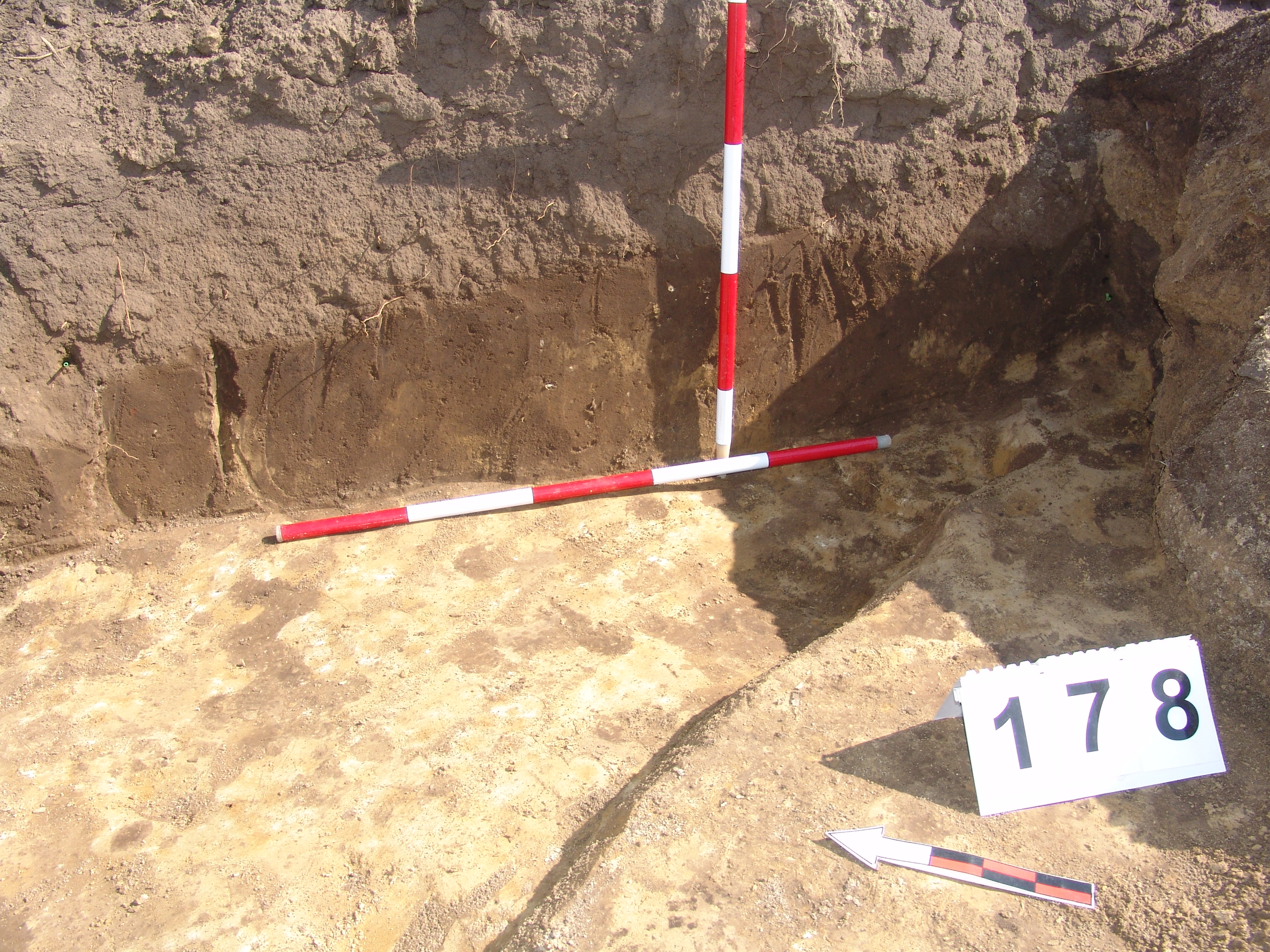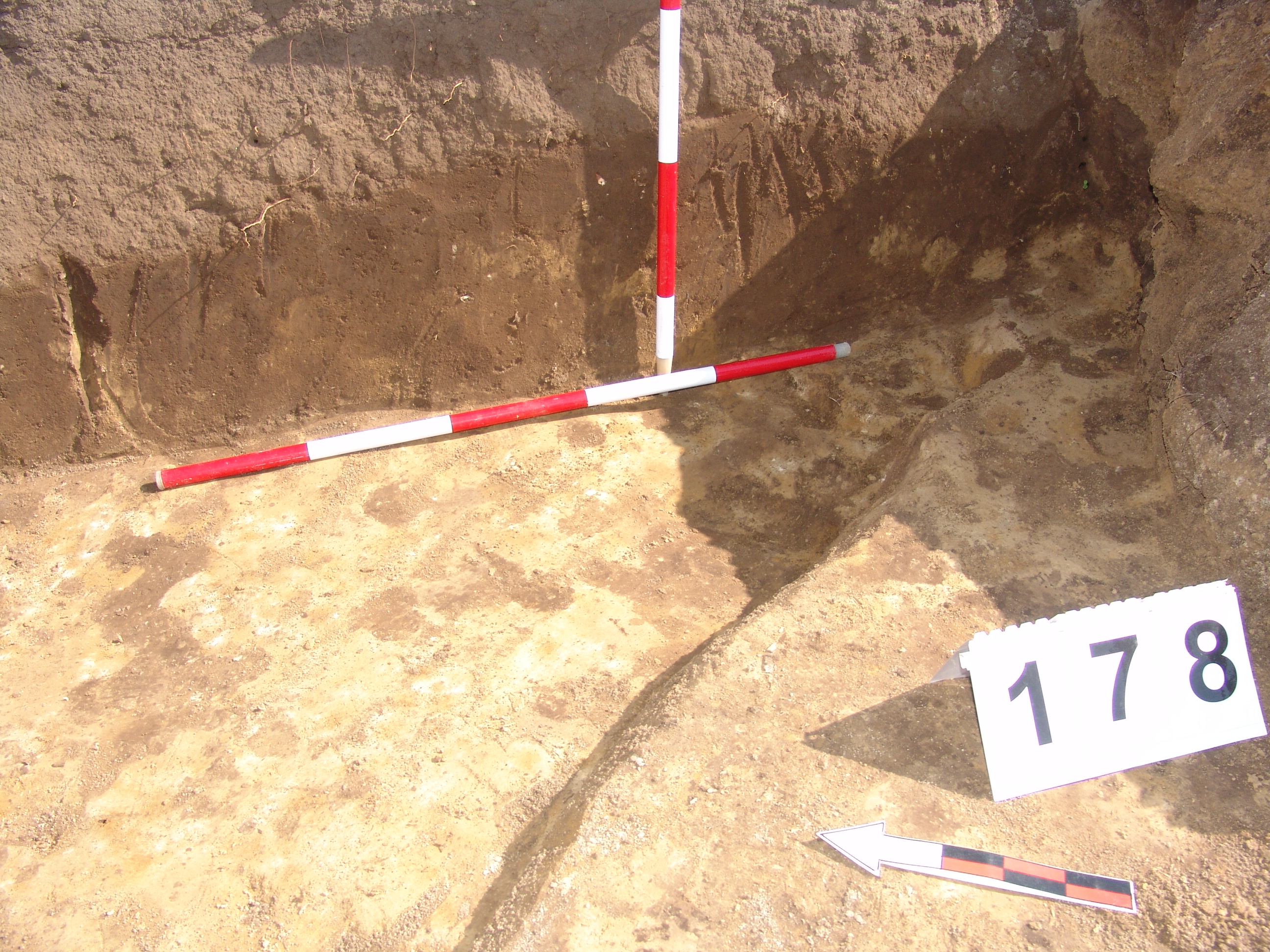 A 106 objektumtól D - re a feltárás széle alá futó elúszó szürkés árokszerű folt. A Ny - i felét alaposan túlbontották. A metszetfalon azonban jól látszott a betöltés. Kör alaprajzú, íves falú, egyenes aljú volt. Betöltése sárga szemcsés barnásszürke. Átmérője fent 158, lent 142 cm. Mélysége 34 cm.