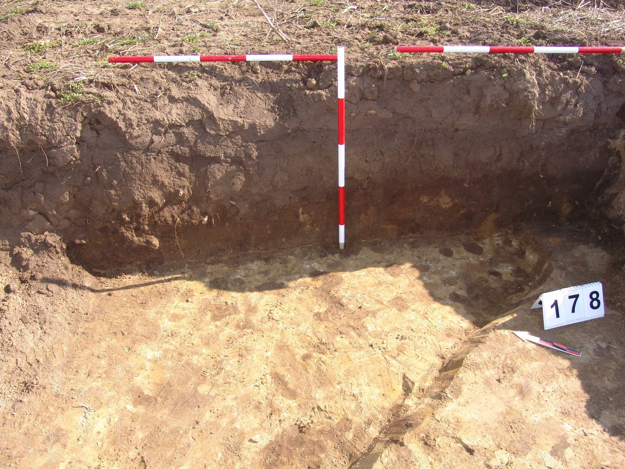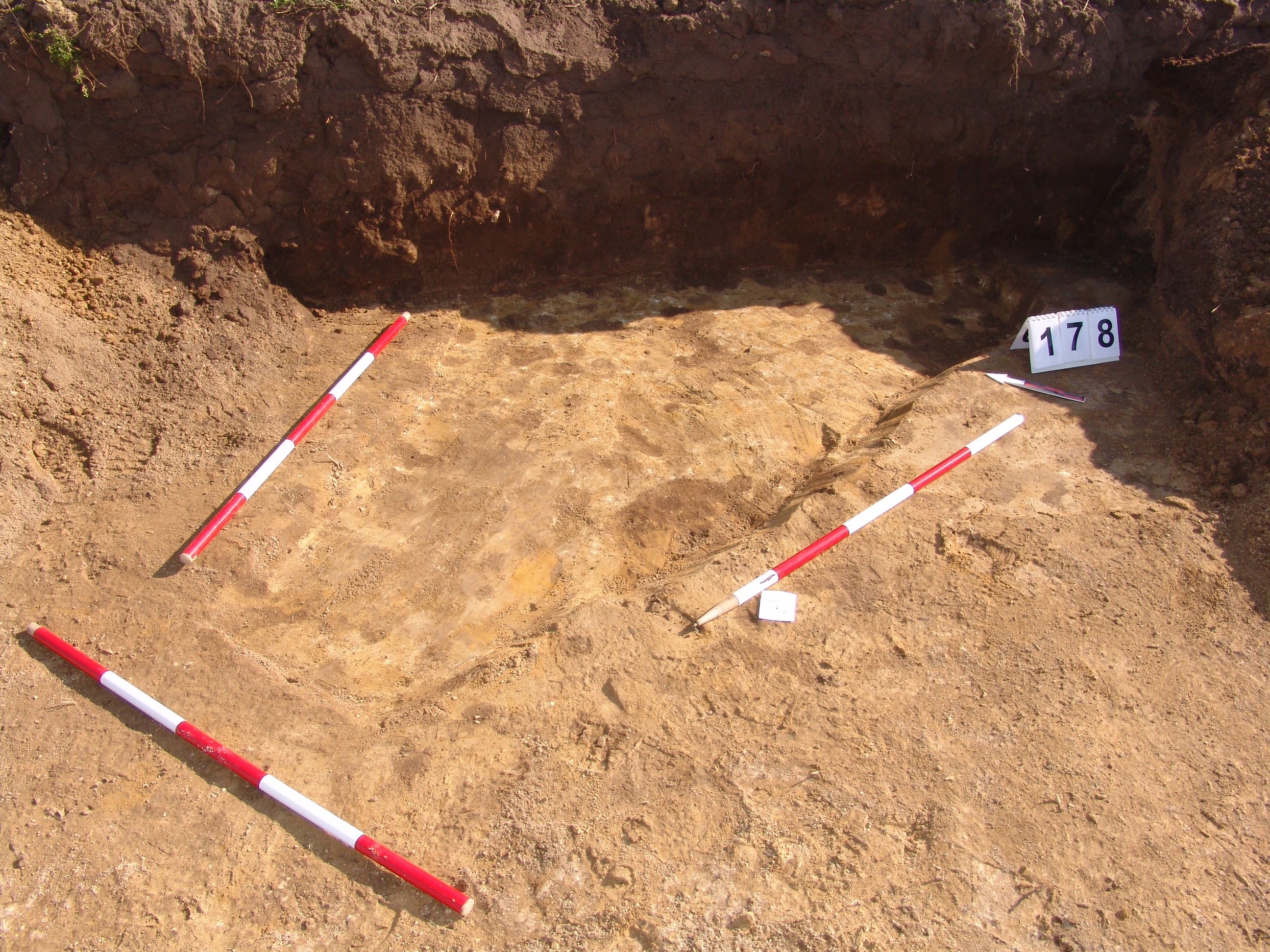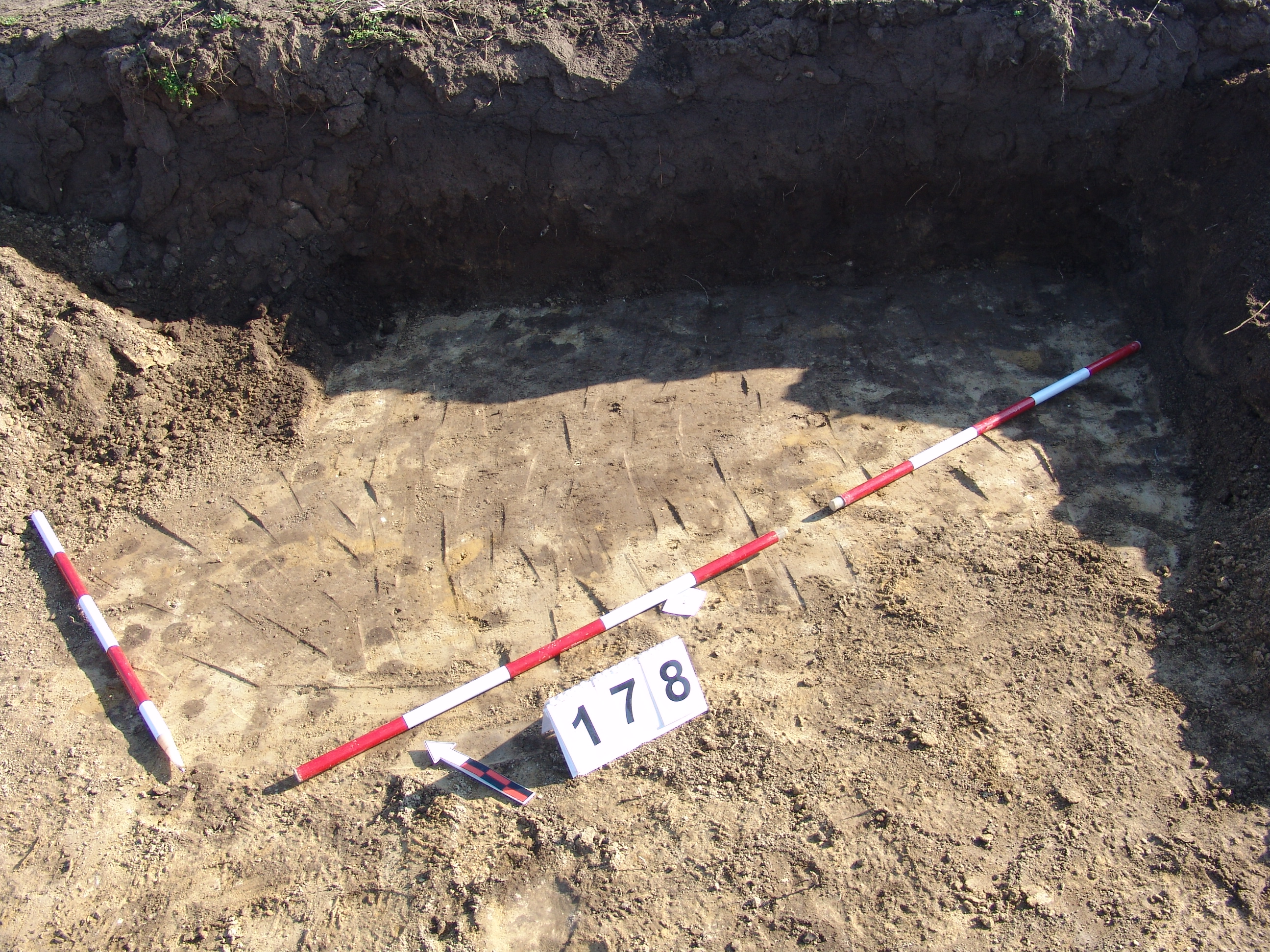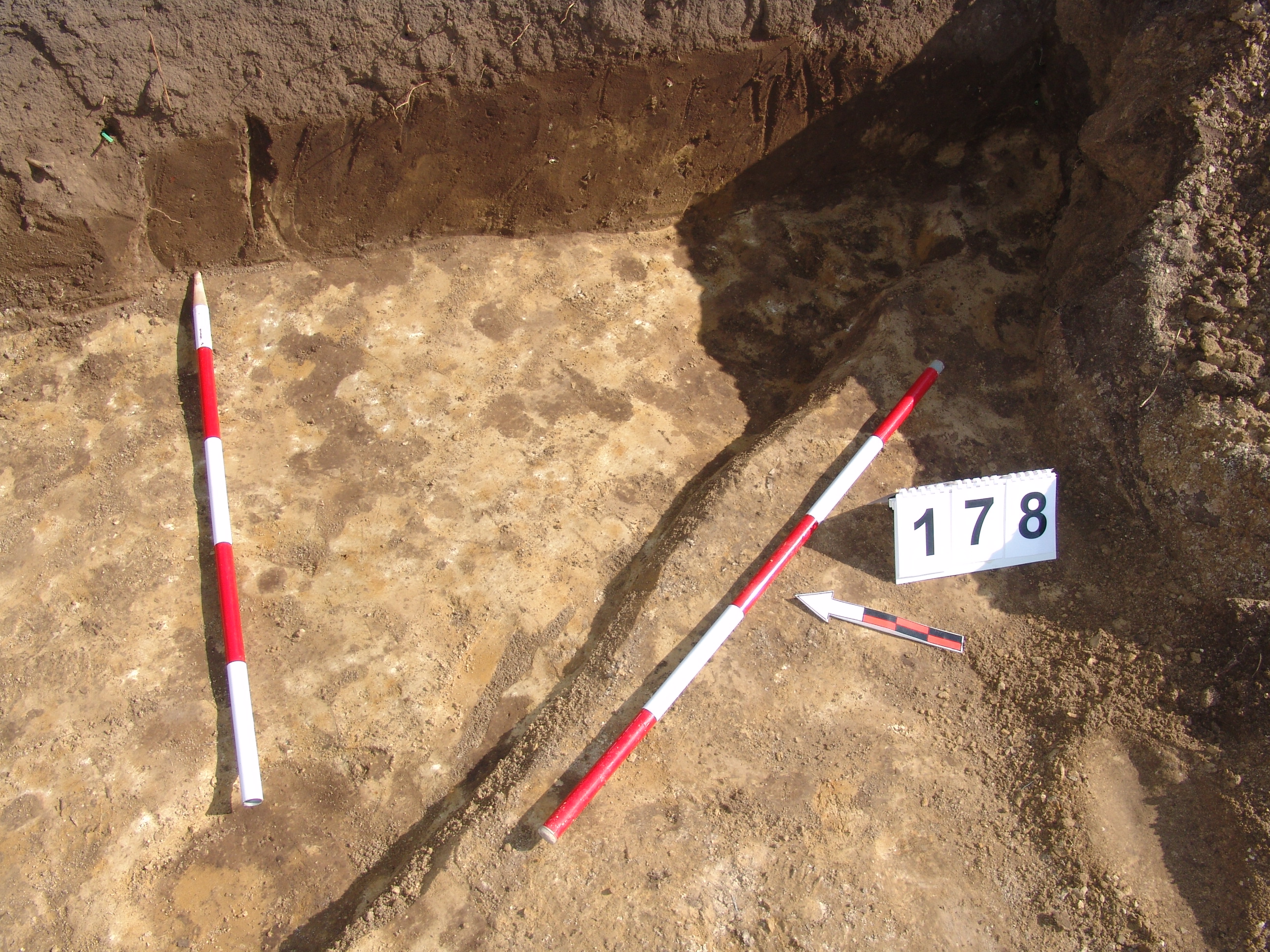 A 106 objektumtól D - re a feltárás széle alá futó elúszó szürkés árokszerű folt. A Ny - i felét alaposan túlbontották. A metszetfalon azonban jól látszott a betöltés. Kör alaprajzú, íves falú, egyenes aljú volt. Betöltése sárga szemcsés barnásszürke. Átmérője fent 158, lent 142 cm. Mélysége 34 cm.