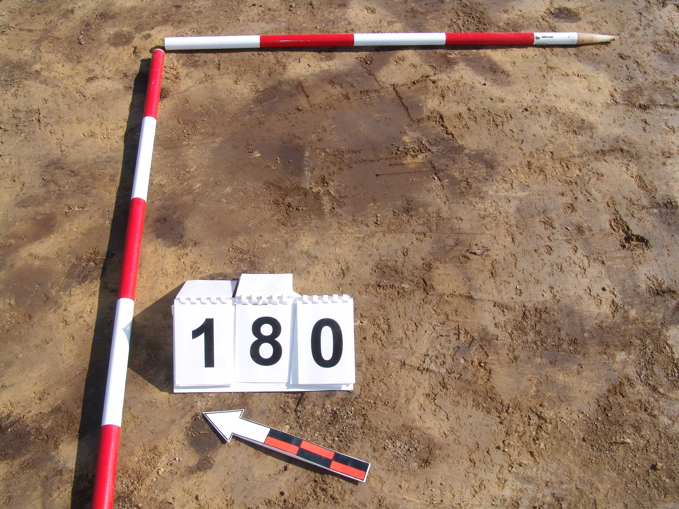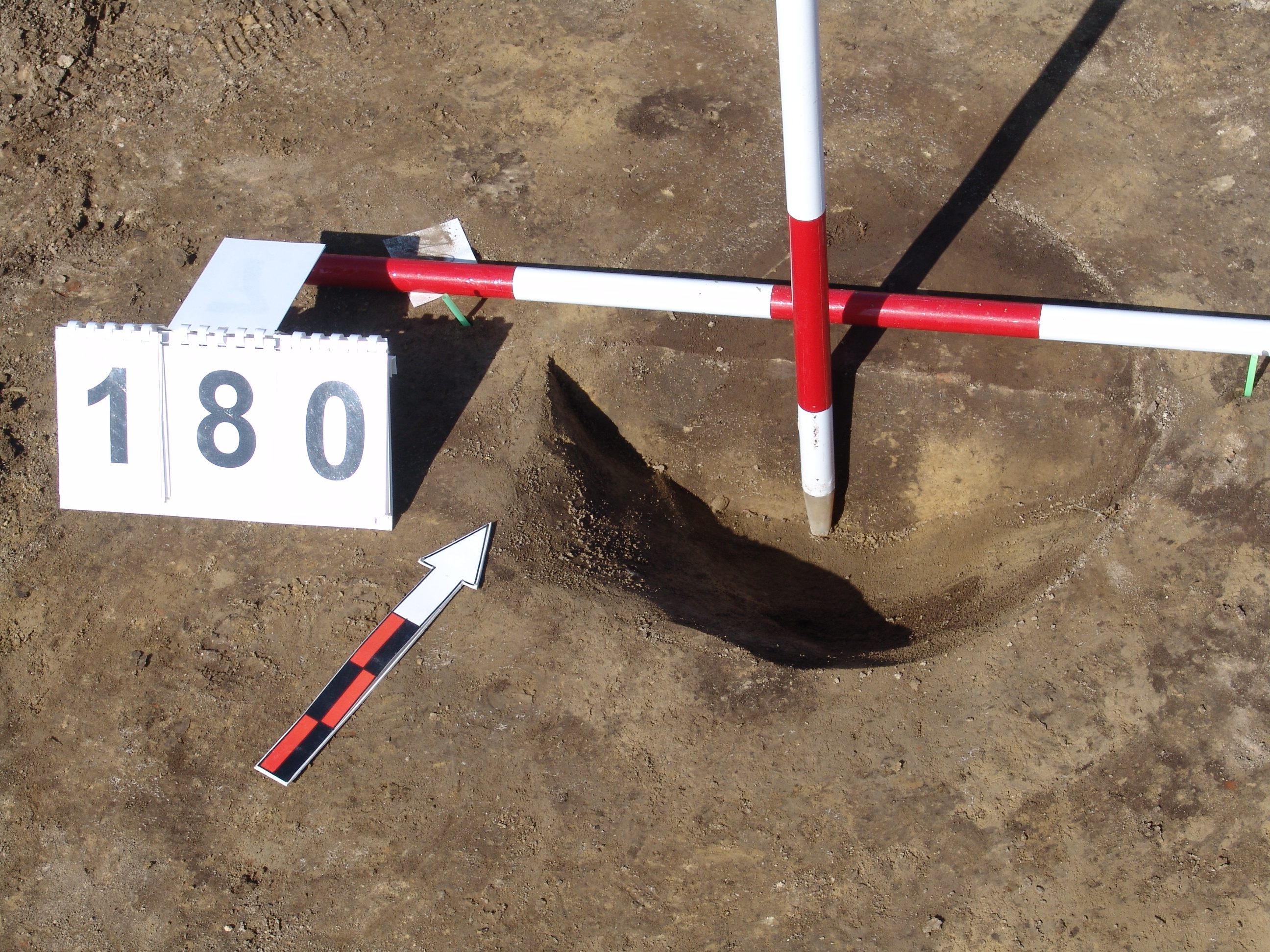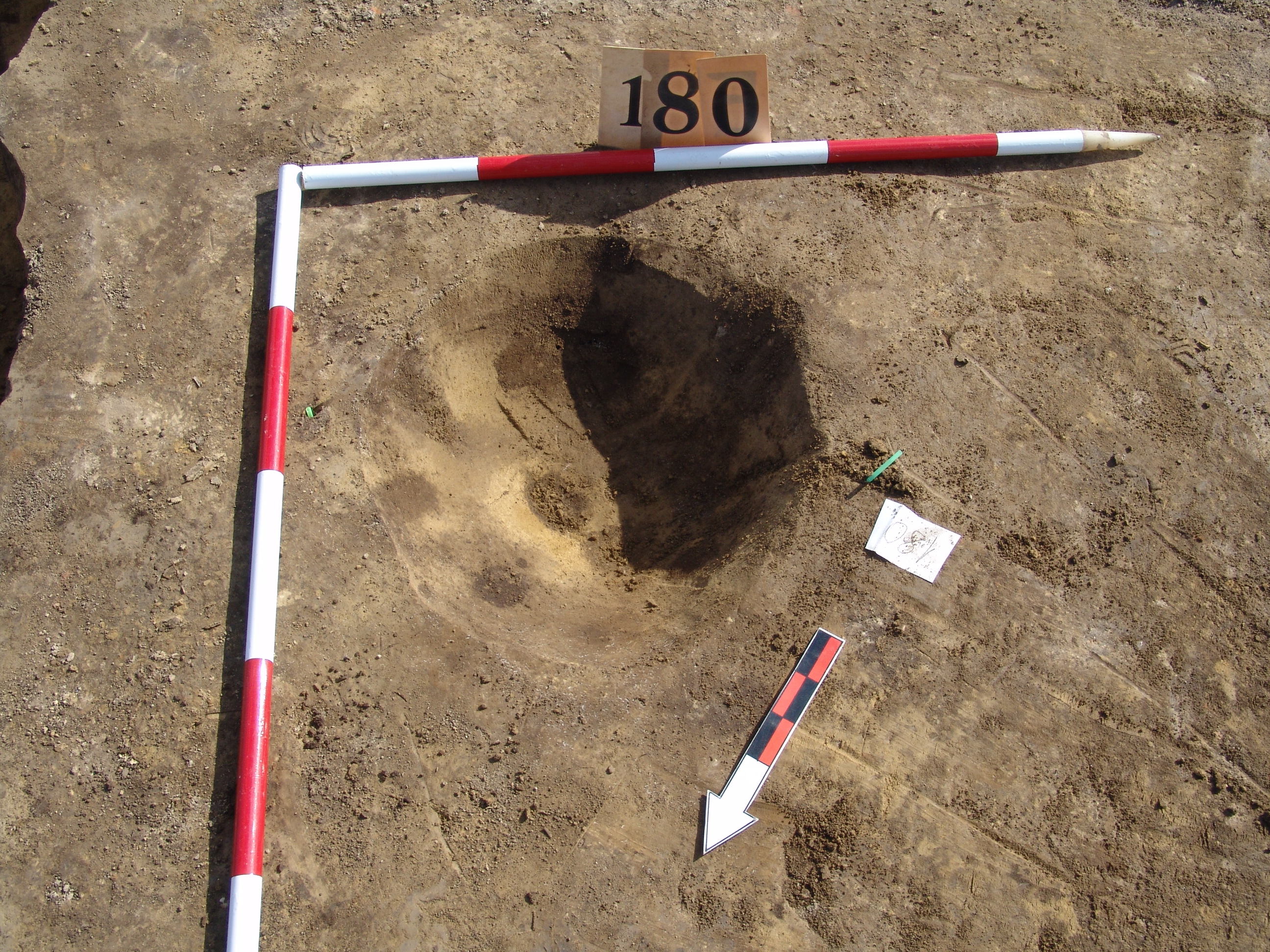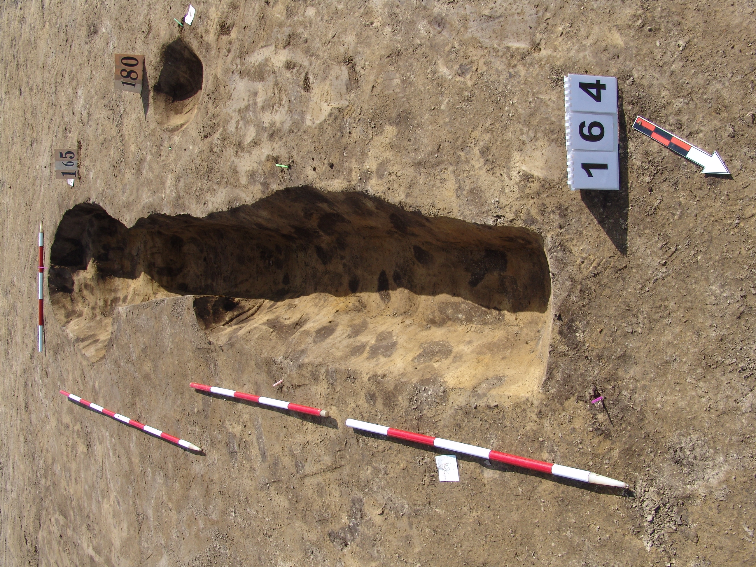 A 164 és a 165 objektumok találkozásánál, azoktól Ny - ra kerek sötét kis folt jelentkezett határozott széllel. Meredek falú, alján hegyesedő, sötét barnásszürke, egynemű betöltésű cölöplyuk.