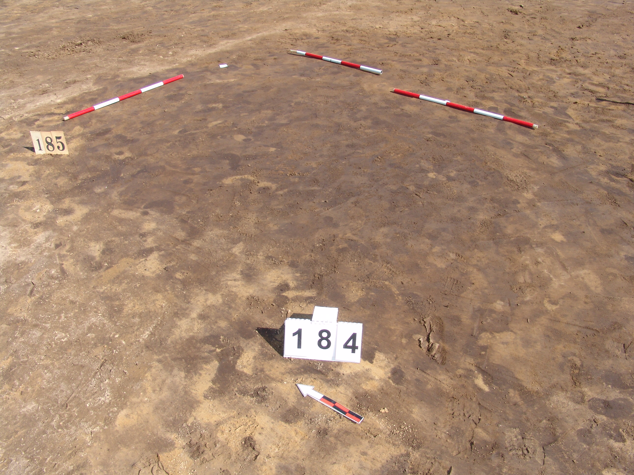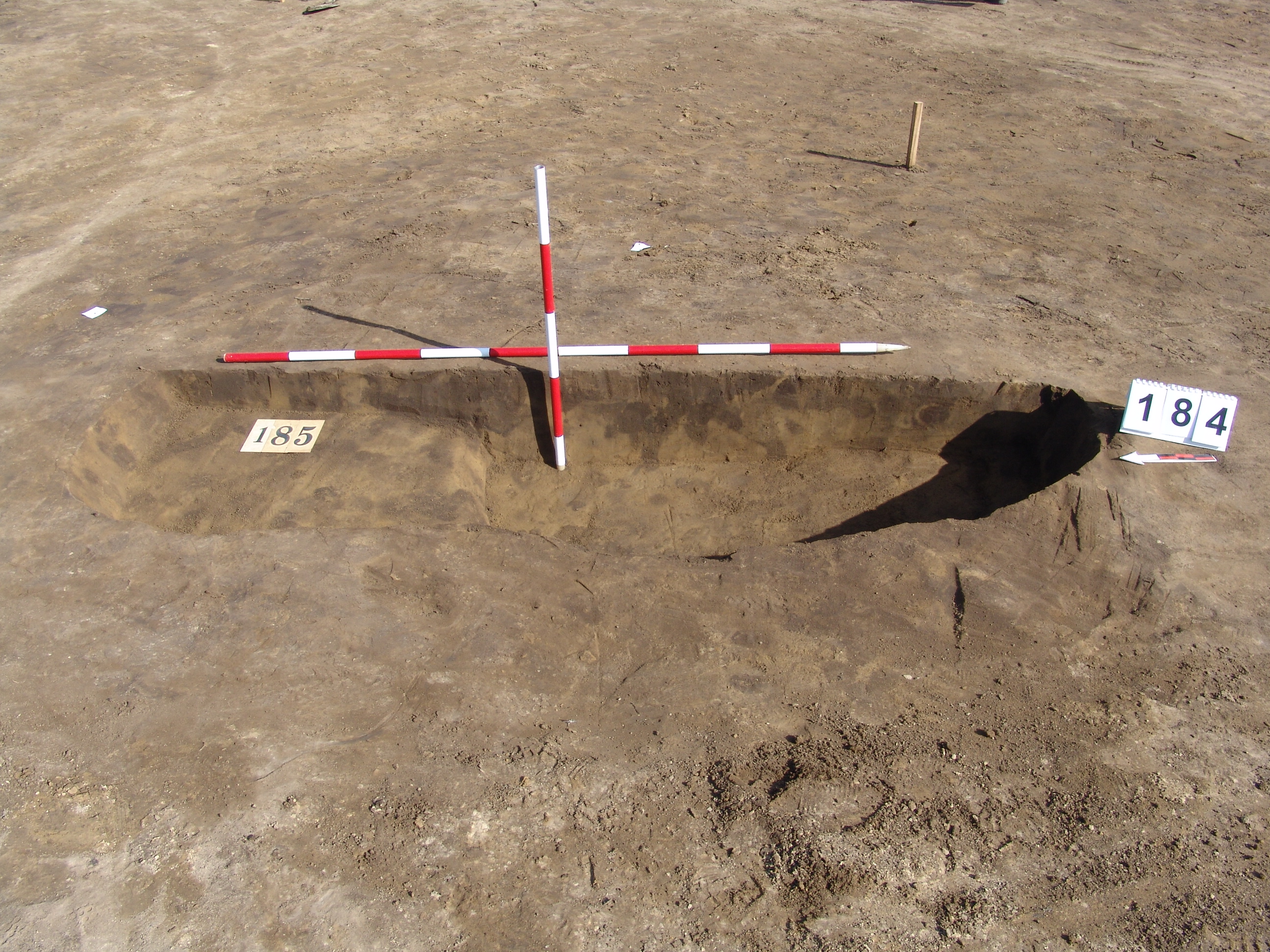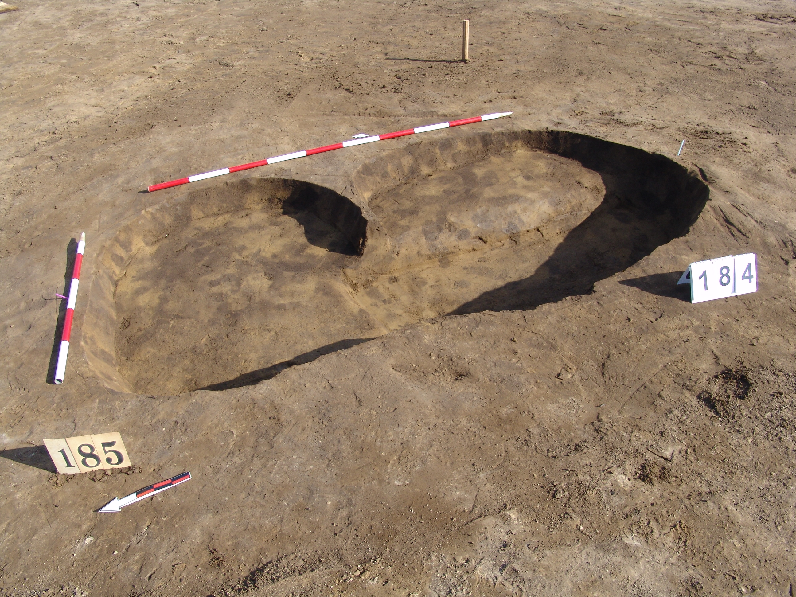 Rosszul, elúszóan rajzolódó kettős folt. ÉÉK - DDNy - i irányú. A DDNy - i rész a 184 számú, melyet valószínűleg ráástak a 185 objektumra. A bontáskor tisztáztuk, hogy valójában nem érnek össze. Betöltése sárga szemcsés barnásszürke. Átmérője fent É - D 146, Ny - K 143 cm, lent É - D 134, Ny - K 134 cm.