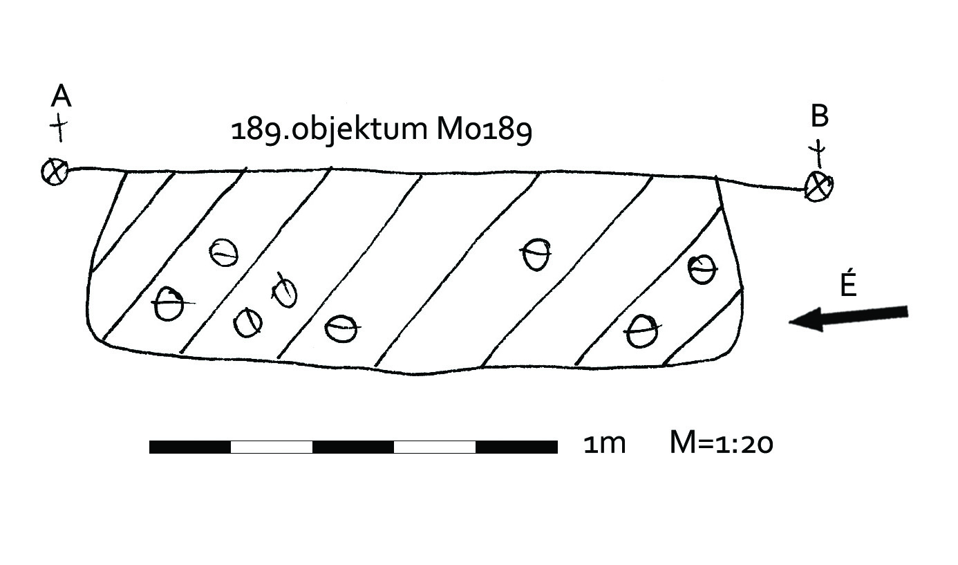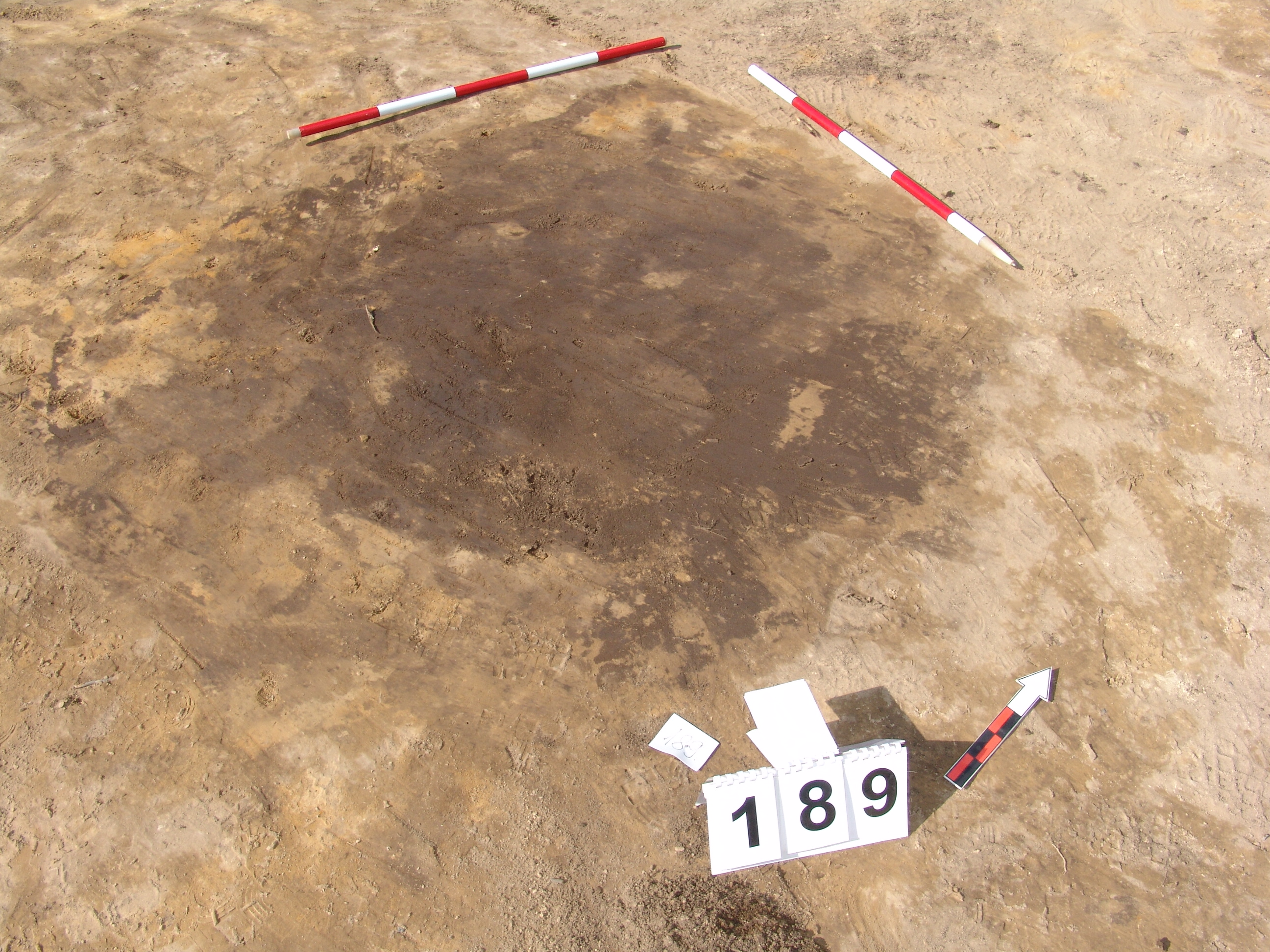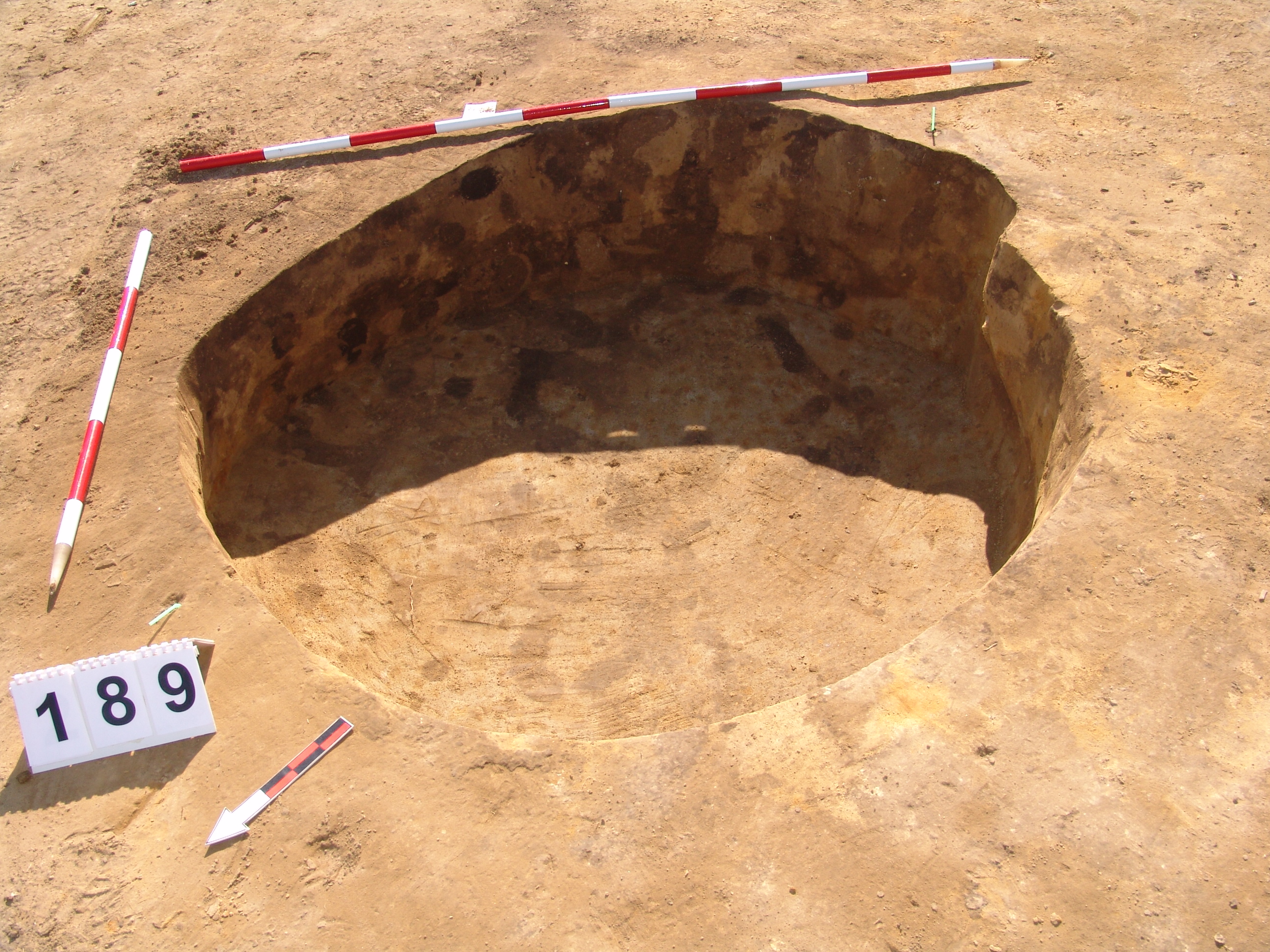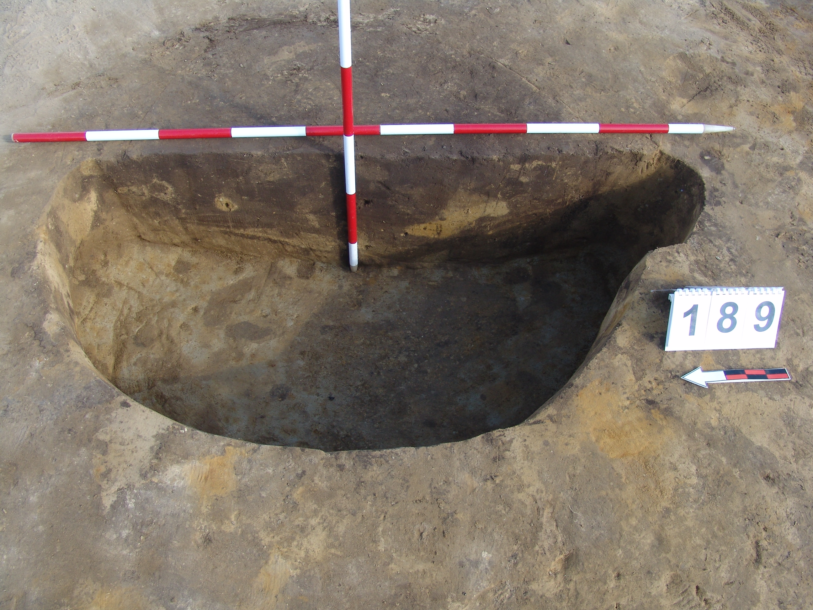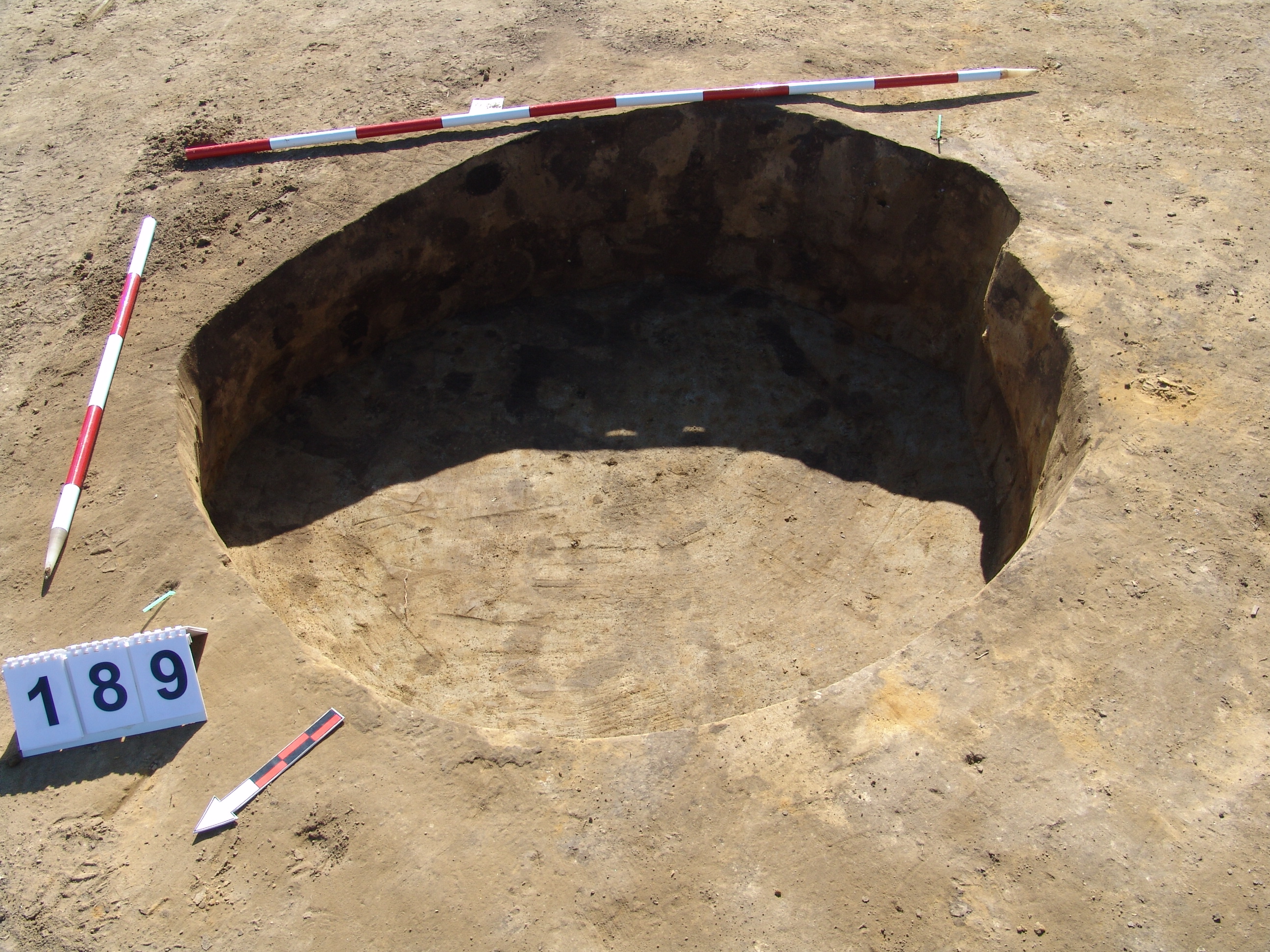 A 188 objektumtól Ny - ra 1,5 cm - re, jól rajzolódó kerek folttal jelentkezett. Kör alaprajzú, az alja felett 5 - 10 centiméterrel erősen bővülő, kis méhkas alakú gödör. Betöltése felül sárga szemcsés sötét barnásszürke. Átmérője fent É - D 150, Ny - K 140 cm, lent É - D 160, Ny - K 153 cm. Mélysége 43 - 45 cm. Helyenként (pl. D - re) a fala felül túlbontva.