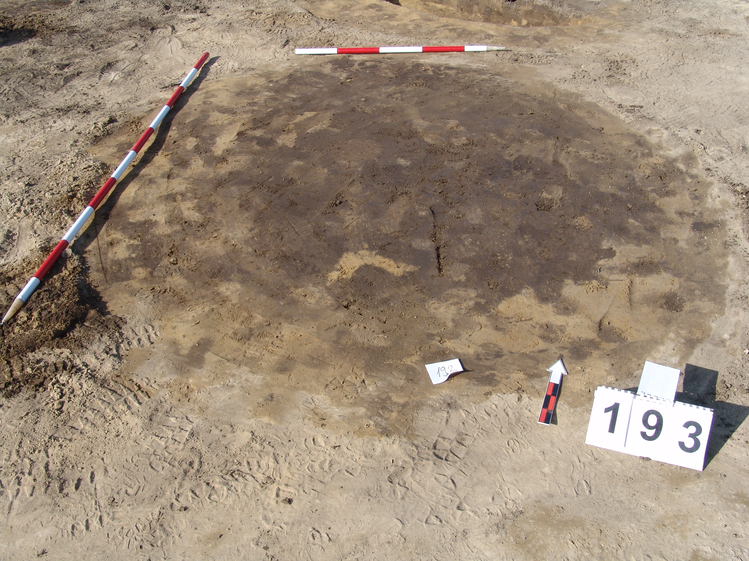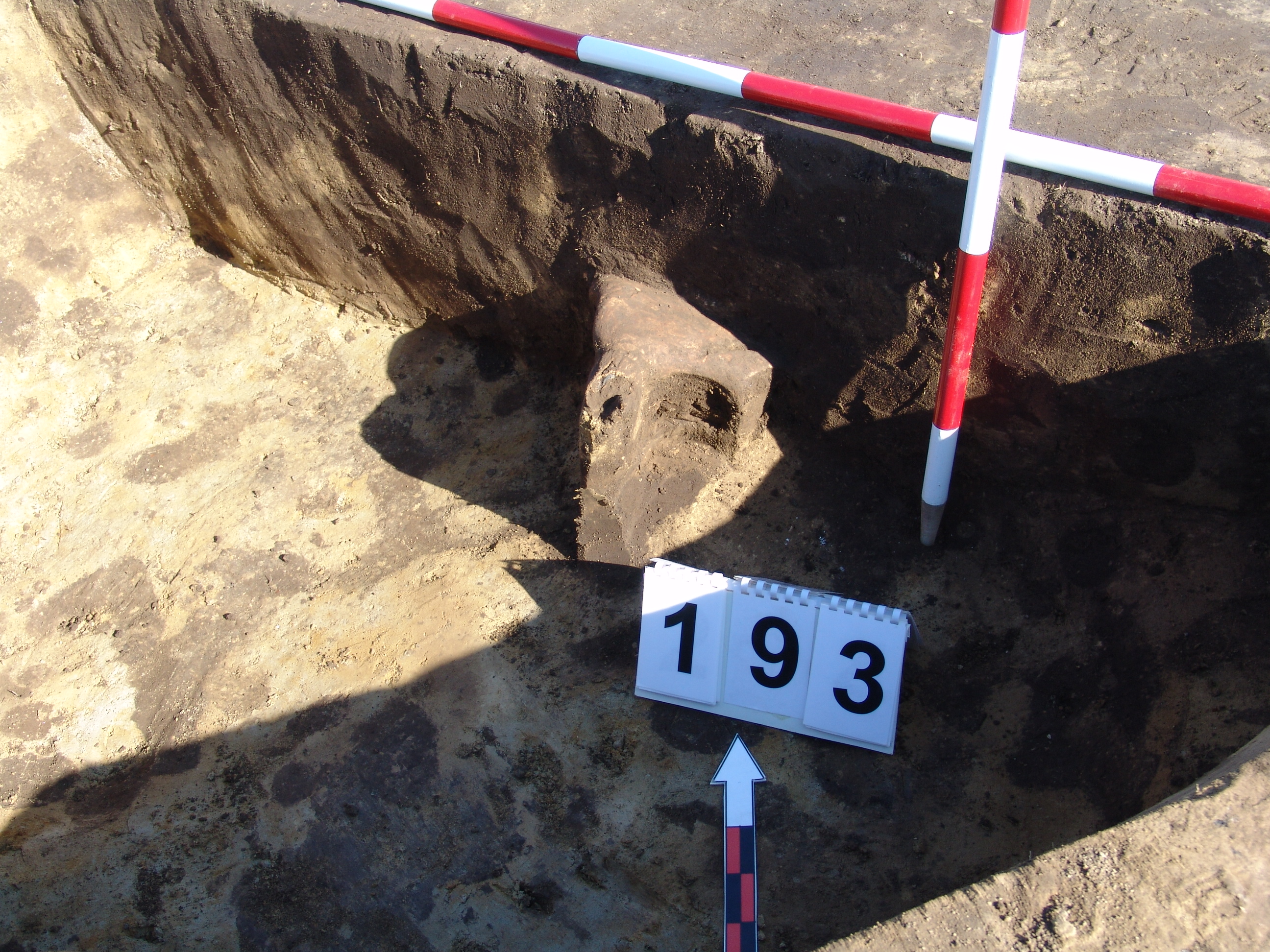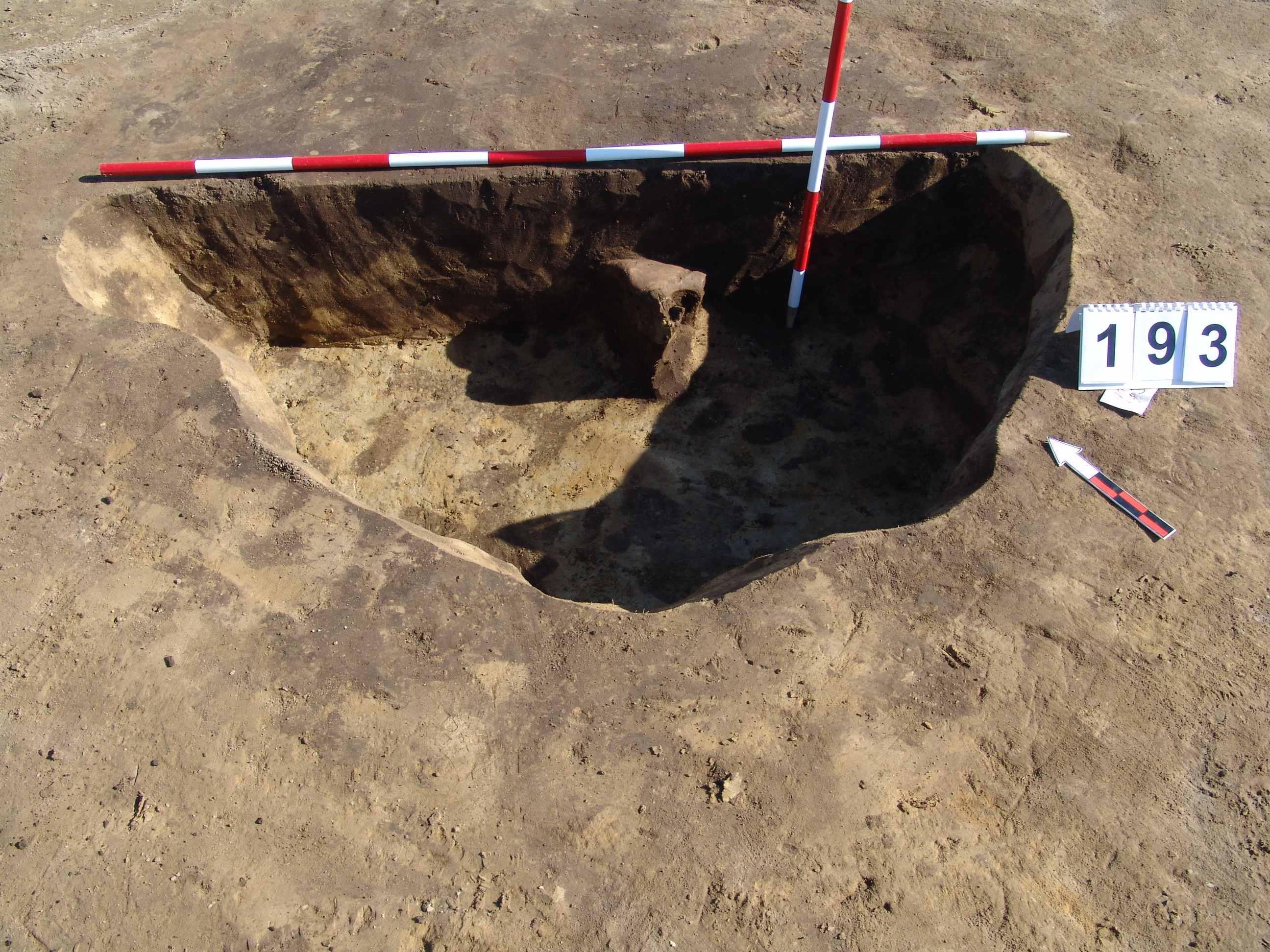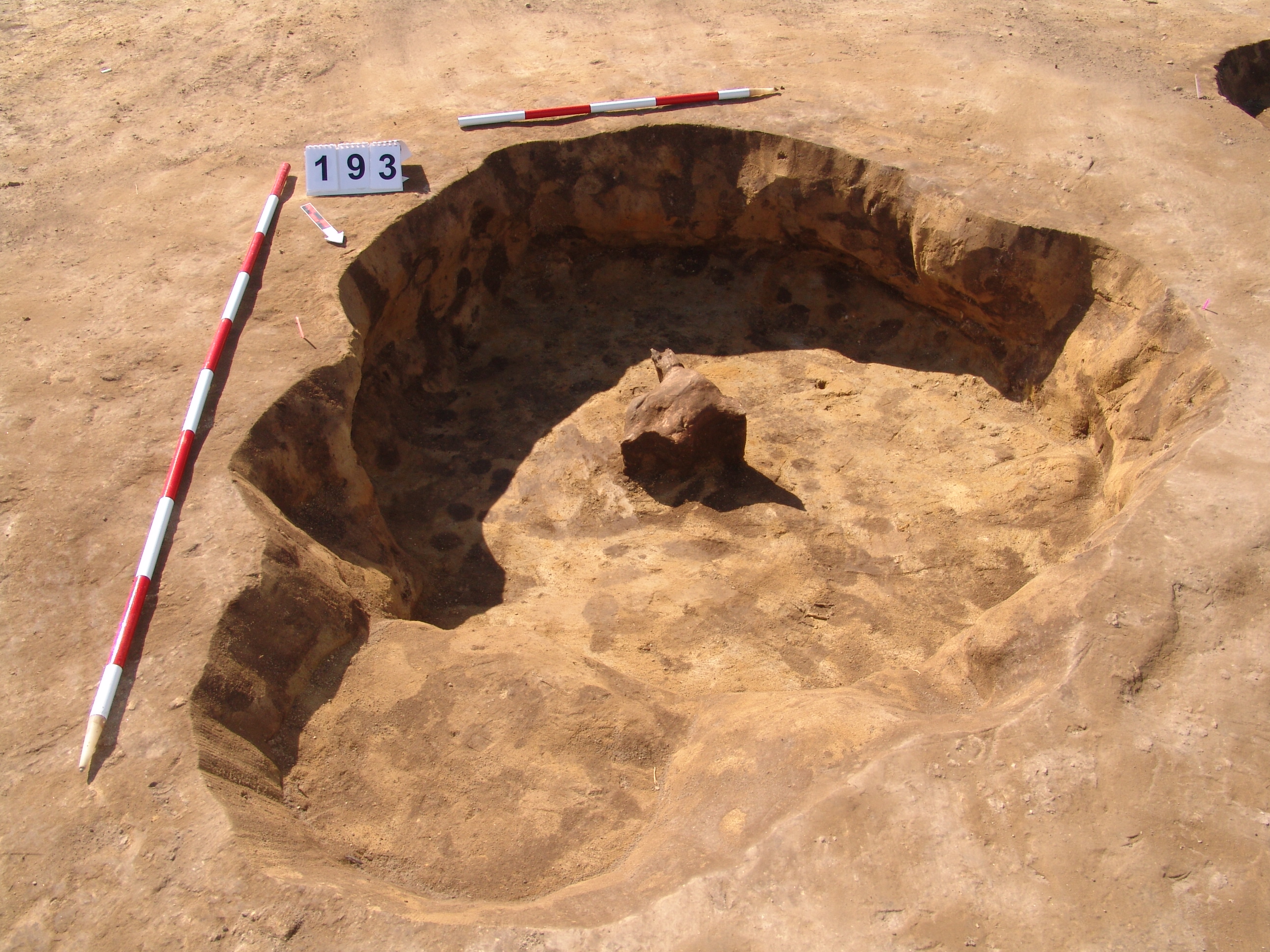 Jól rajzolódó kerek sötét folttal jelentkező gödör a 190 objektumtól D - re közvetlen mellette. Méhkas alakú, kör alaprajzú, egyenes aljú gödör. Betöltése sárga szemcsés barnásszürke egynemű. A gödör alja felett körülbelül 15 cm - rel középtáján orral DK - re marha koponya. É - i oldalán a metszetnél kicsit túlbontott. Átmérője fent É - D 170, ny - K 170 cm, lent É - D 185, Ny - K 180 cm. Mélysége: 46 - 50 cm. A marha koponya megmaradt M. 25,5 cm. A 2. szarvcsaptő közt Sz: 15 cm. K -i szélén főleg, de közben mindenhol állatjáratok után bontották.