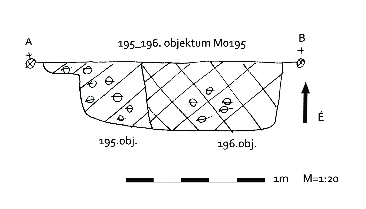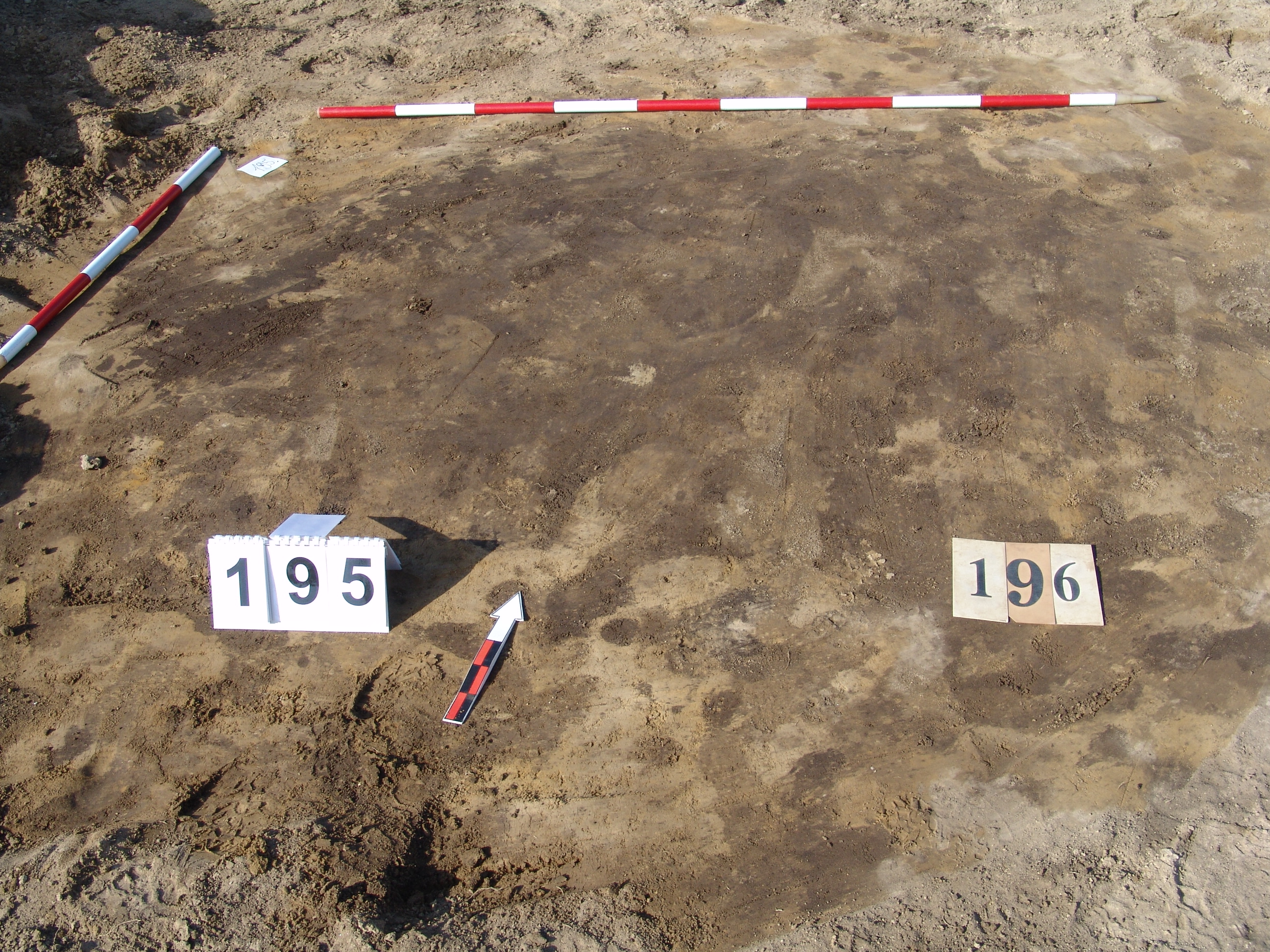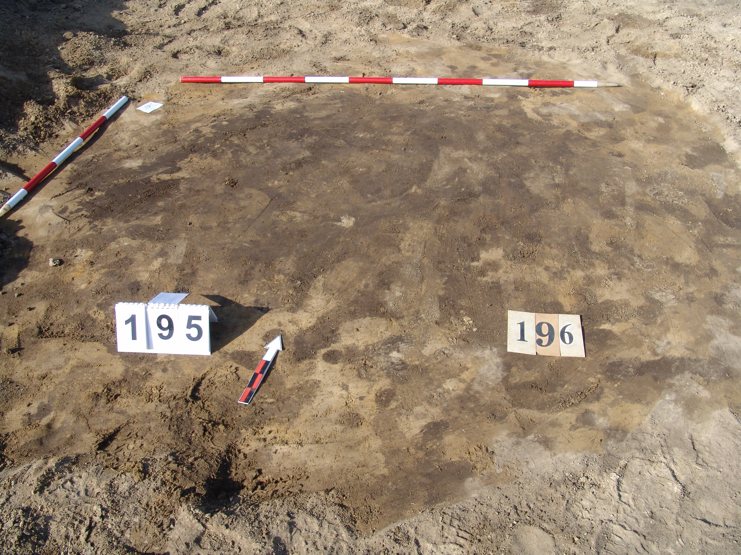 A 195 objektumtól K - re, az alatt jelentkező jól látható kerek folt. Függőleges falú, egyenes aljú, kör alaprajzú gödör, melyet ráástak a metszet alapján a 195 gödörre. Betöltése sárga szemcsés sötét barnásszürke. Átmérője É - D 140 cm, Ny - K 146 cm. Mélysége 43 cm.