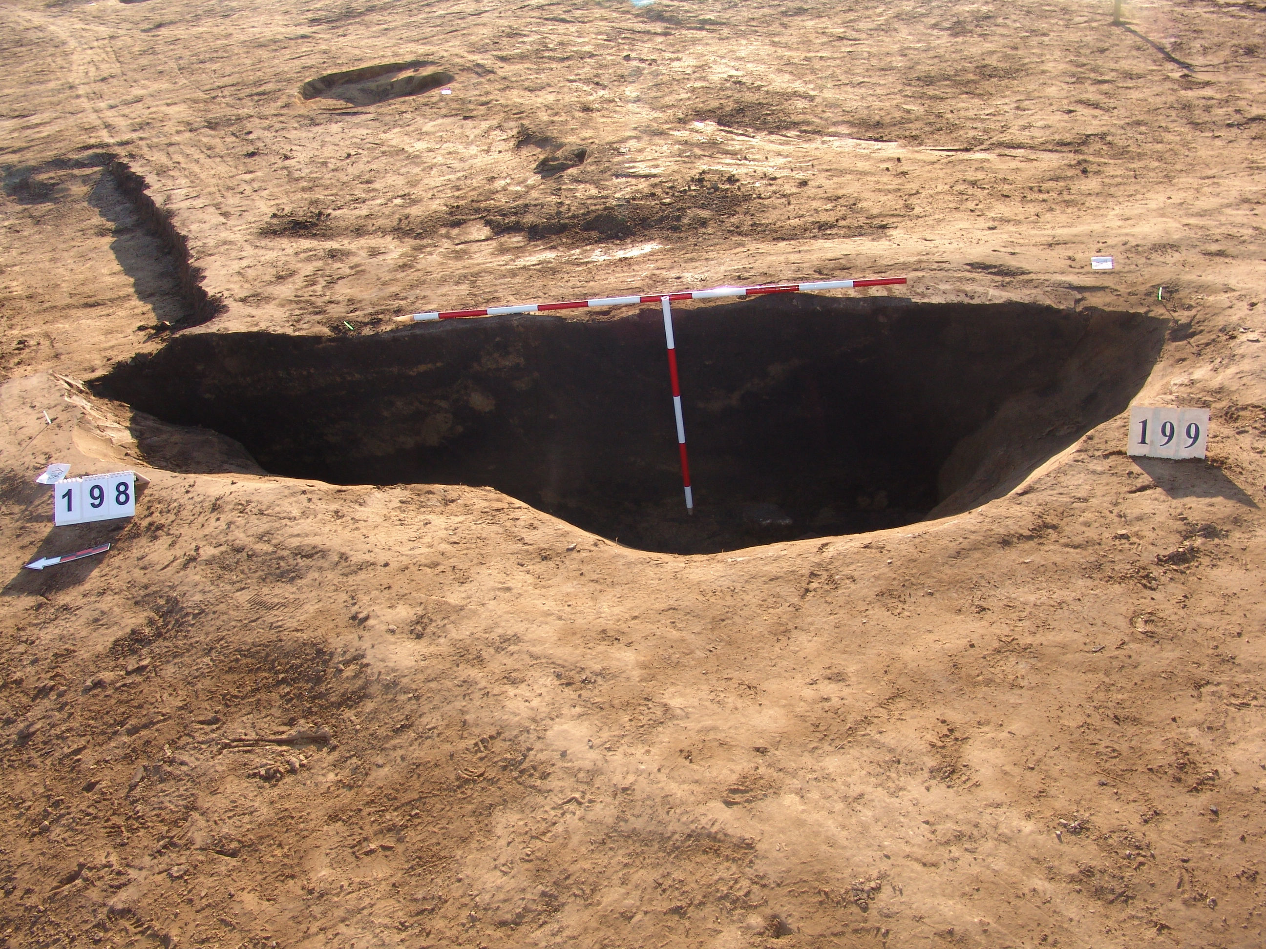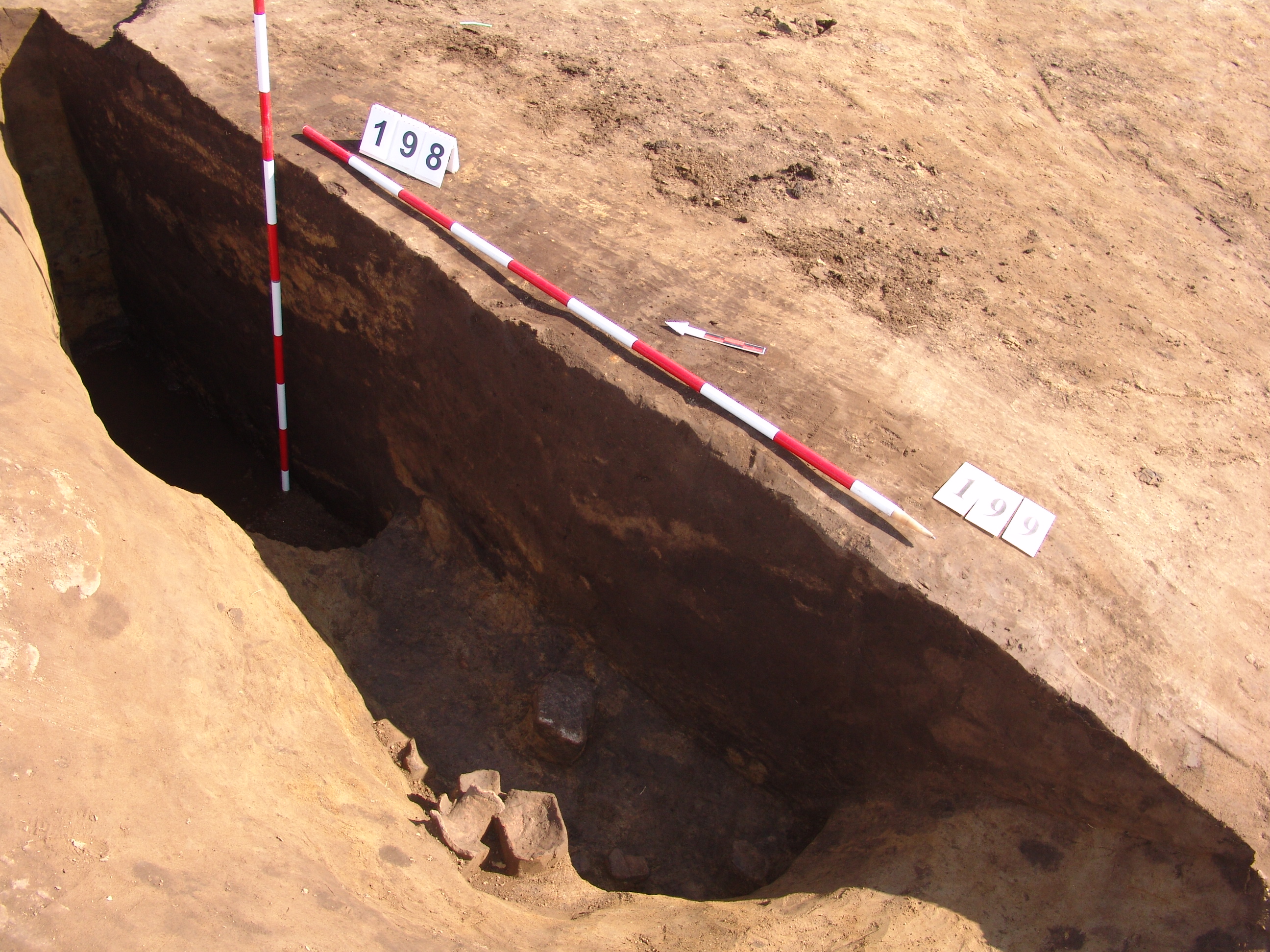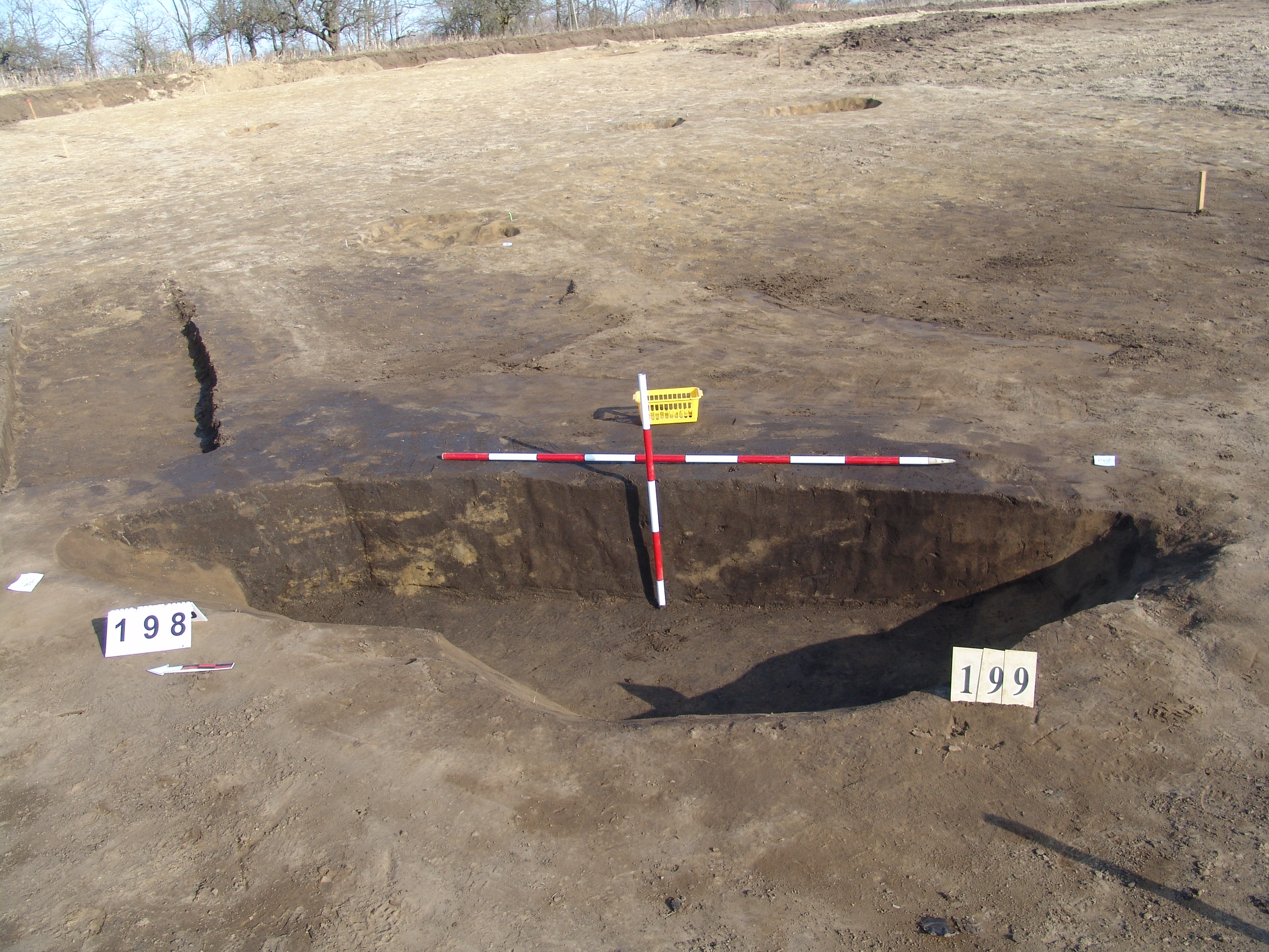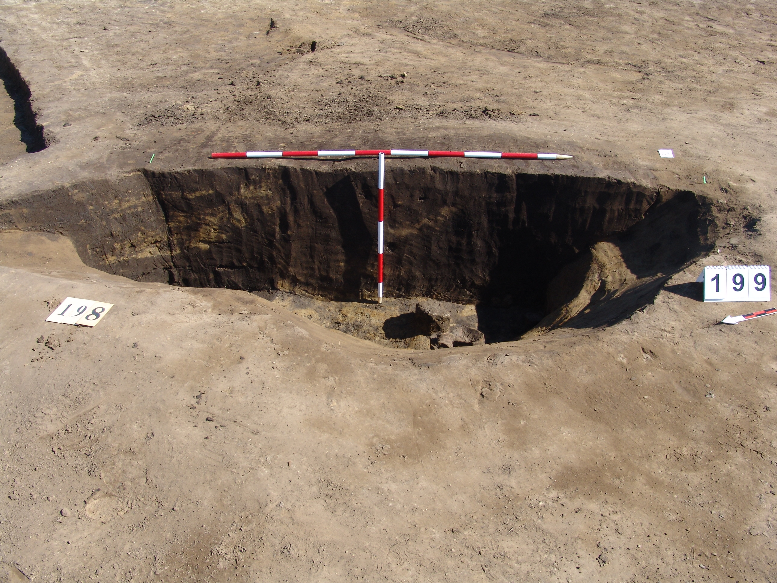 Kettős nagy objektum a terület mély részén, a 3297. karótól DNy-ra. A MNM NÖK elkezdte ásni. Az ÉK-i fekete betöltésű, kerek folt a 199. objektum felett jelentkezett. Csak egy stratszámot (17) találtunk.