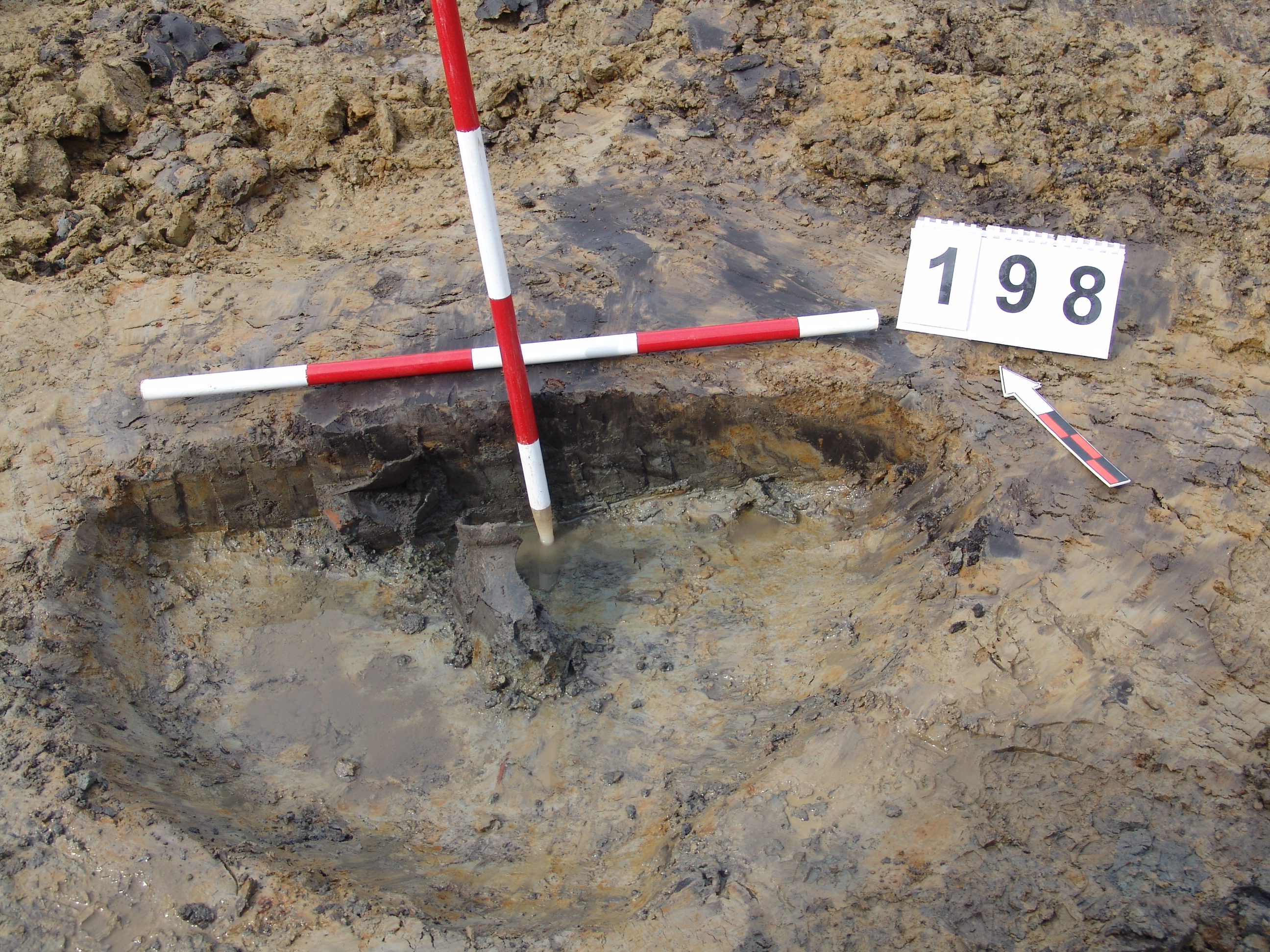 Betöltése alul egynemű, iszapos fekete. A bontás során kiderült, hogy nem ovális az alaprajza, hanem lekerekített sarkú négyszög. 198 cm-nél feljött a víz. Megpróbáltuk szivattyúzni, de mivel a terület legmélyebb részén volt, így ez nem működött.