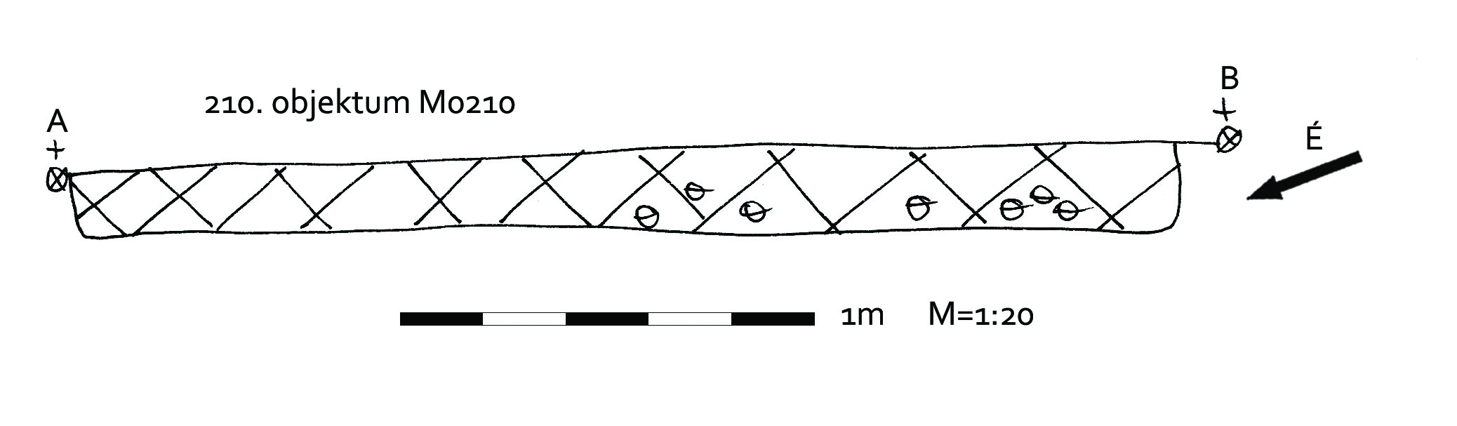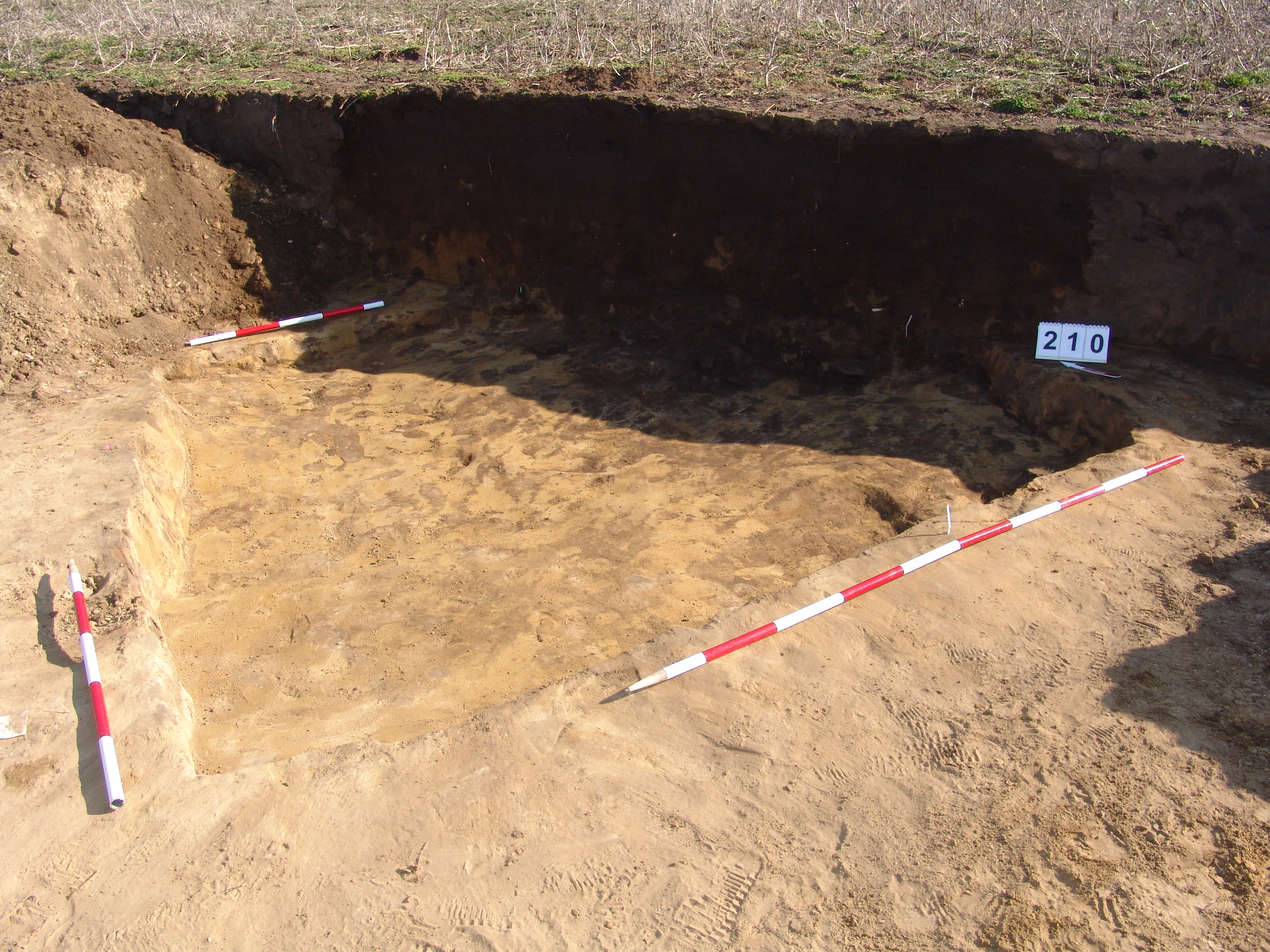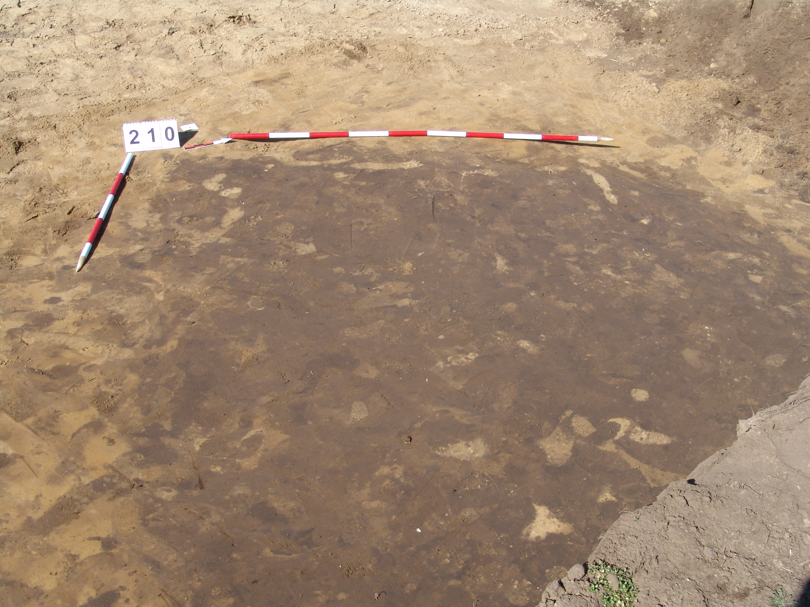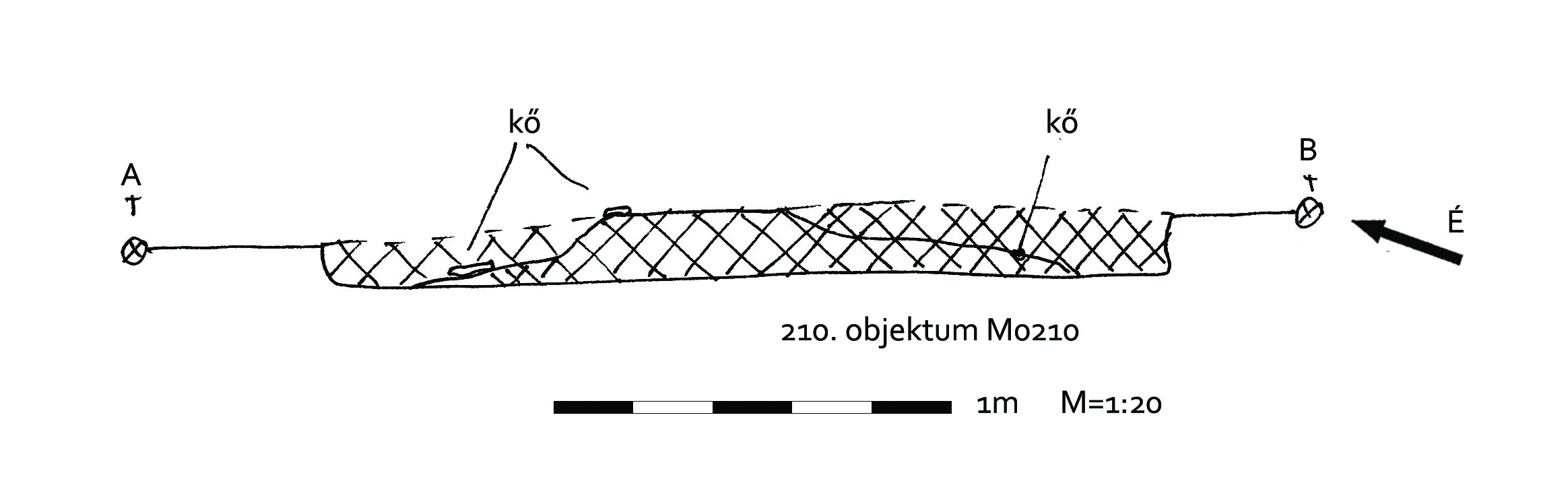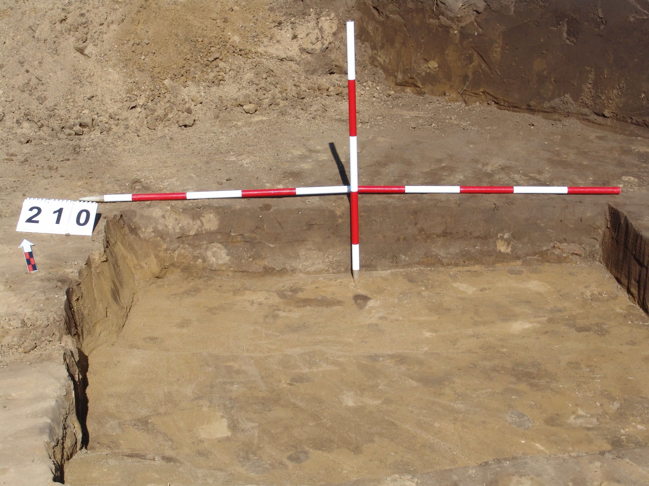 A feltárás keleti szélénél, a feltáratlan rész alá „futó” négyszögletes nagy sötét, kissé elúszó folttal jelentkező objektum a 175. gödörtől D-re mintegy 8-10 m-re. Fala függőleges, alja egyenes. D-Ny-i sarkában kis „padka szerűség” - talán a lejáró? Betöltése sárga szemcsés barnásszürke. Az ÉK-i sarkon nagy korongolatlan edényhez tartozó töredékek egy halomban. A szelvényfalon látszott, hogy a beásás kb. 55 cm mélyen indul. Rábontottunk az ÉK-i sarkára, mely a feltáratlan rész alatt volt. A háznak ebben a sarkában 130x140-es szögletes részen szétomlott edény cserepei egy halomban. É-D-re 290 cm Ny-K 310 cm. M:13-30 cm. 110-290° tájolású. A DK-i sarkon fekete, talán kiégetetlen edény oldala. Az ÉK-i sarokban ovális tűzhely maradvány a felszedett cserepek alatt:égett foltokkal jelentkezett. 75x90 cm-es ÉK-DNy-i /250.obj./