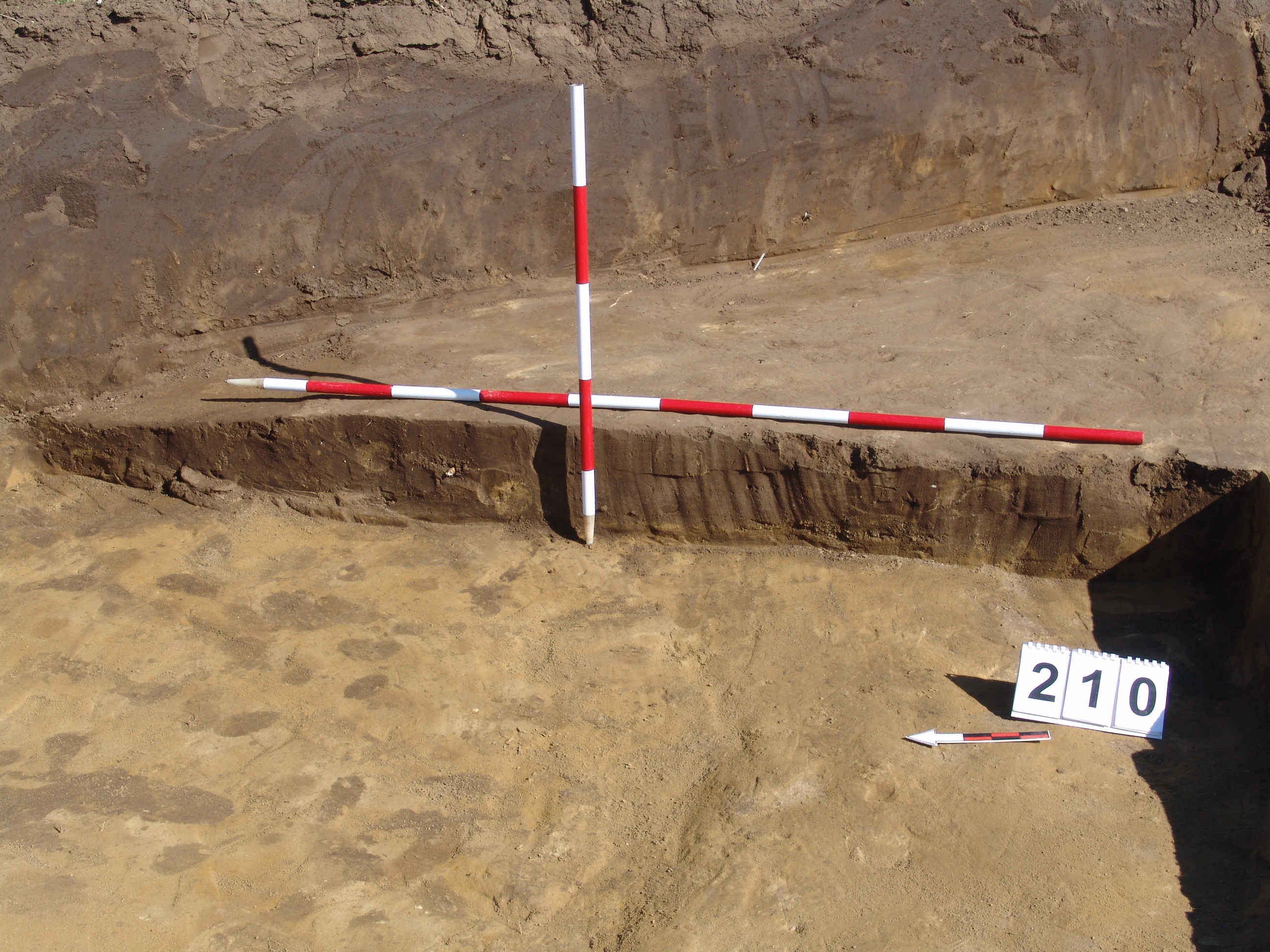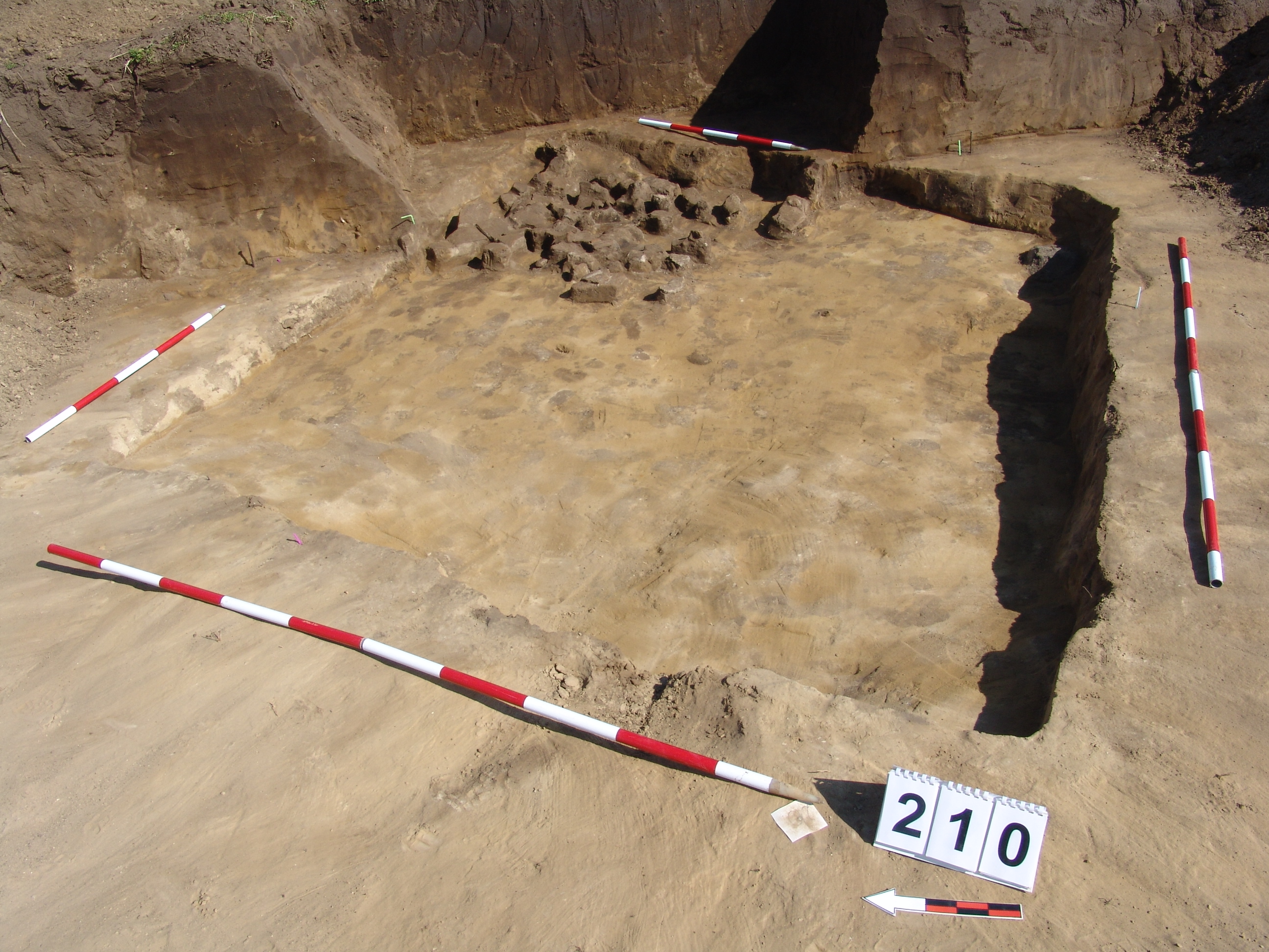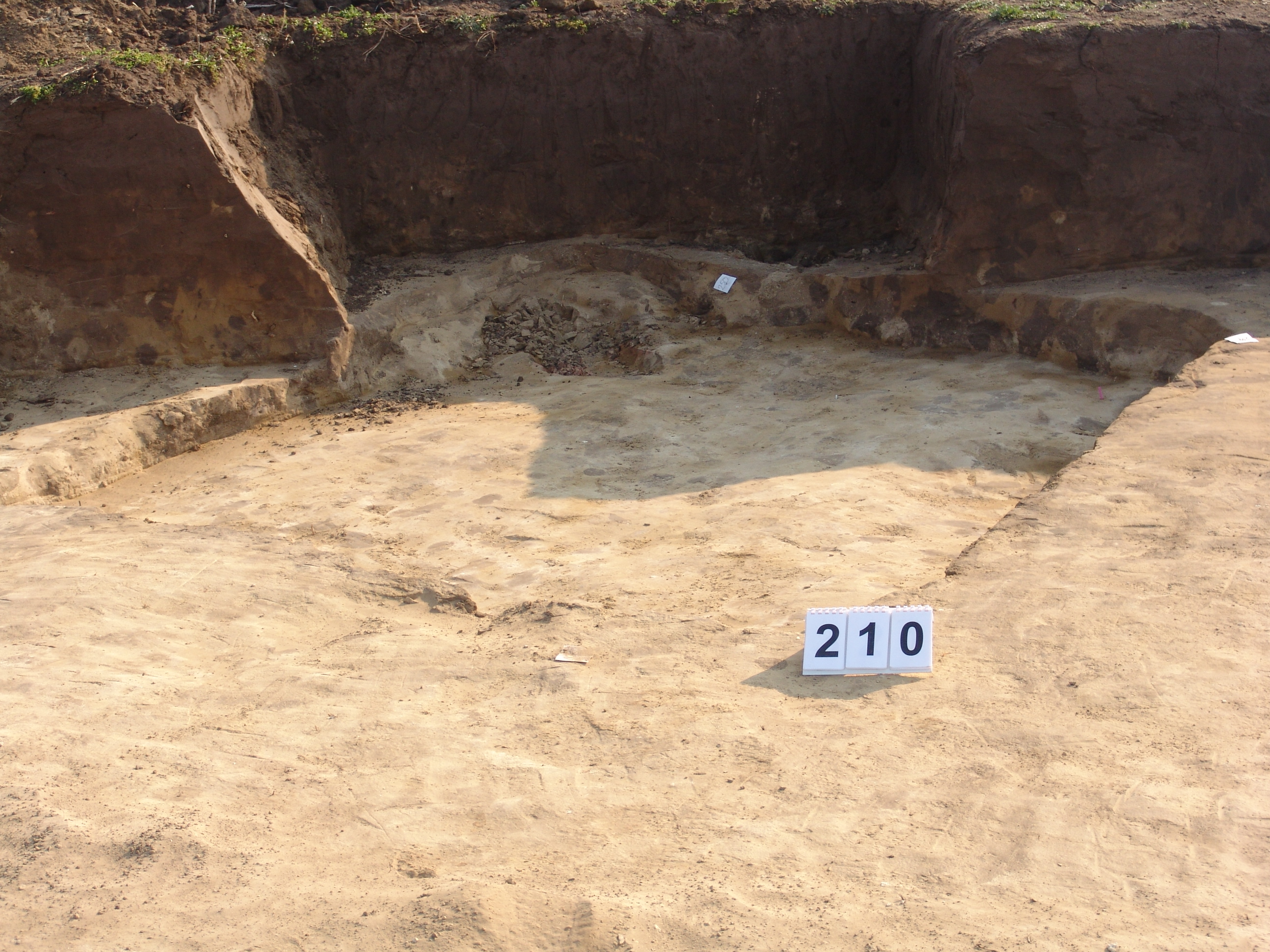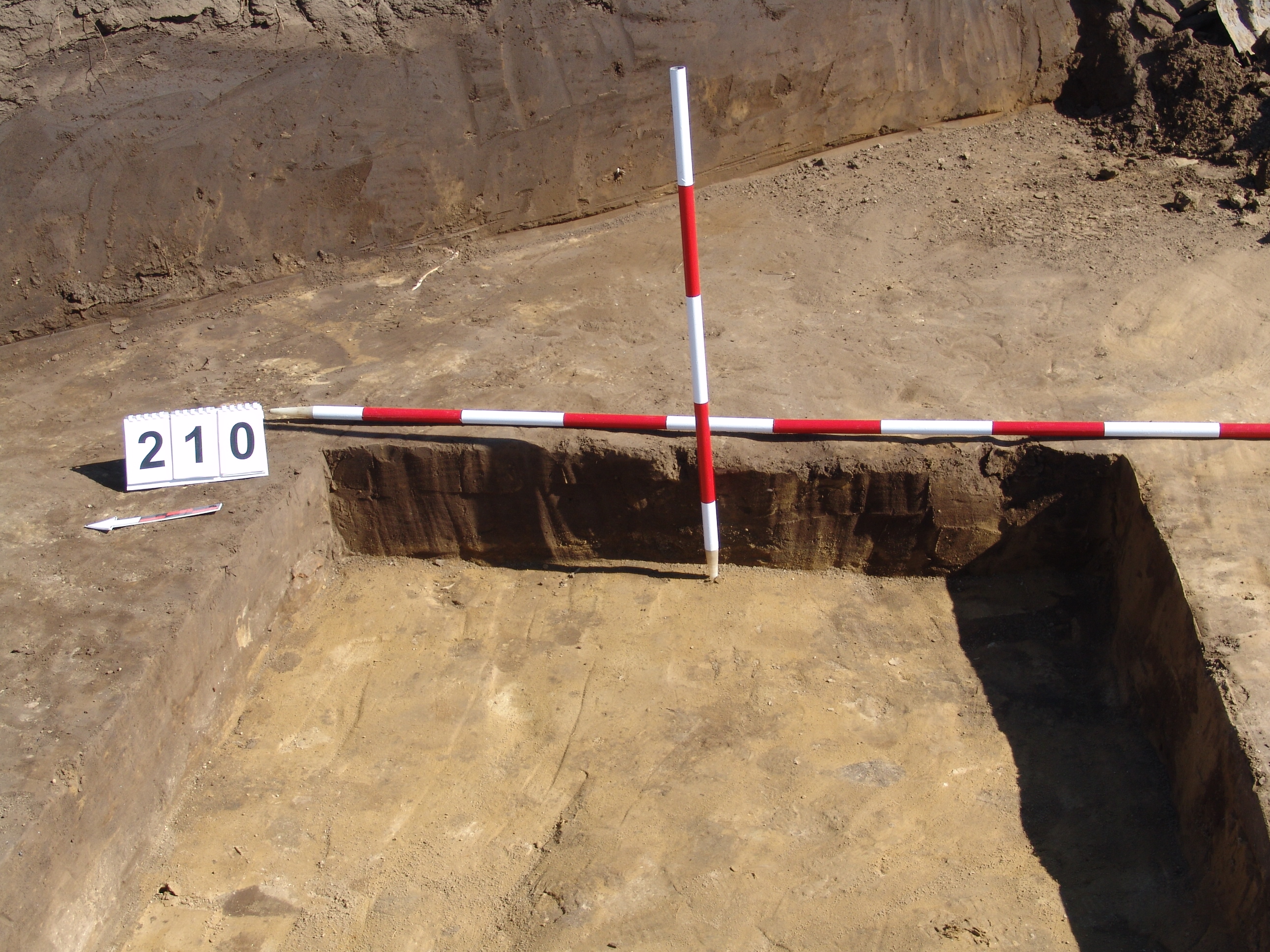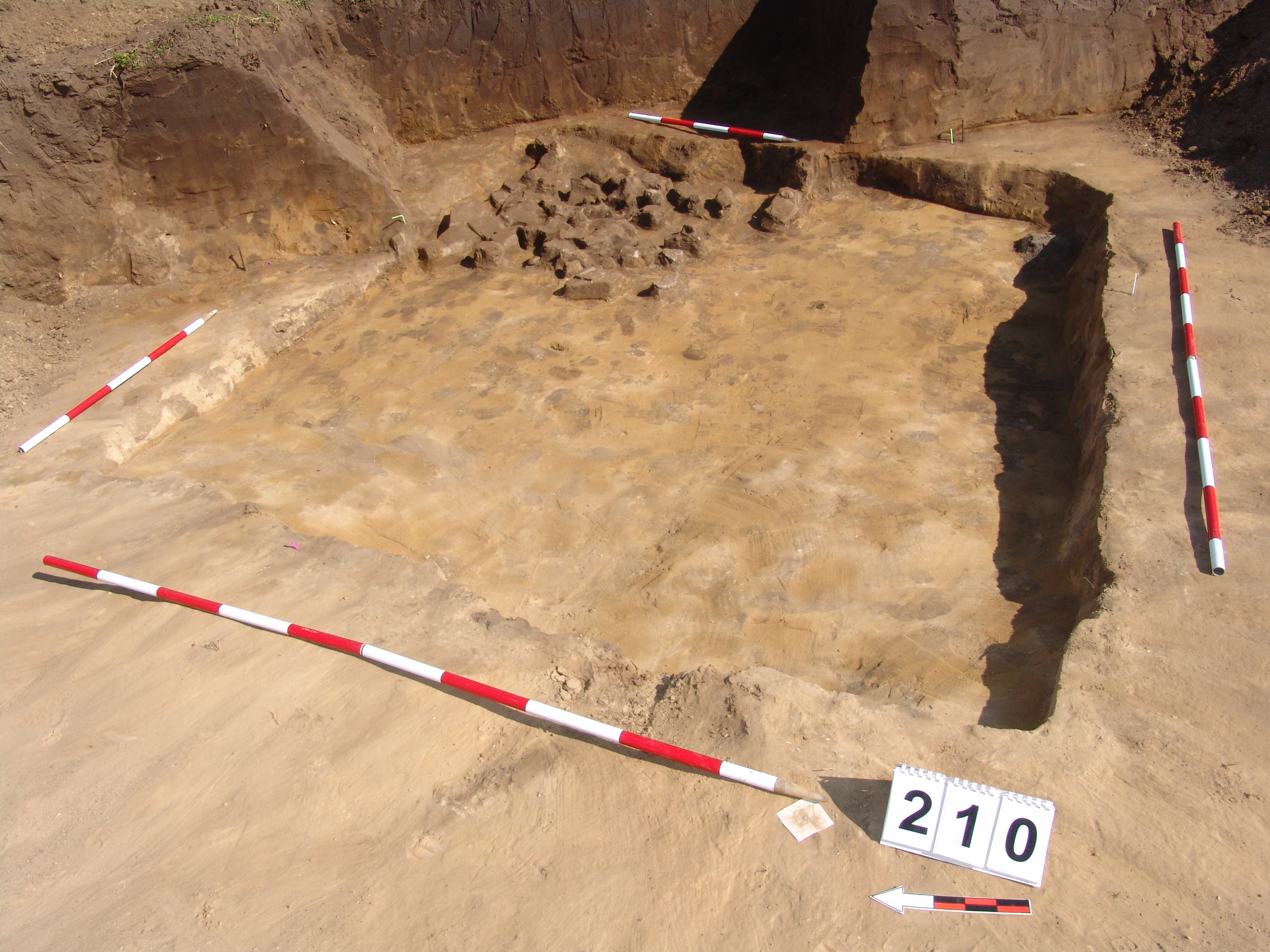 A feltárás keleti szélénél, a feltáratlan rész alá „futó” négyszögletes nagy sötét, kissé elúszó folttal jelentkező objektum a 175. gödörtől D-re mintegy 8-10 m-re. Fala függőleges, alja egyenes. D-Ny-i sarkában kis „padka szerűség” - talán a lejáró? Betöltése sárga szemcsés barnásszürke. Az ÉK-i sarkon nagy korongolatlan edényhez tartozó töredékek egy halomban. A szelvényfalon látszott, hogy a beásás kb. 55 cm mélyen indul. Rábontottunk az ÉK-i sarkára, mely a feltáratlan rész alatt volt. A háznak ebben a sarkában 130x140-es szögletes részen szétomlott edény cserepei egy halomban. É-D-re 290 cm Ny-K 310 cm. M:13-30 cm. 110-290° tájolású. A DK-i sarkon fekete, talán kiégetetlen edény oldala. Az ÉK-i sarokban ovális tűzhely maradvány a felszedett cserepek alatt:égett foltokkal jelentkezett. 75x90 cm-es ÉK-DNy-i /250.obj./