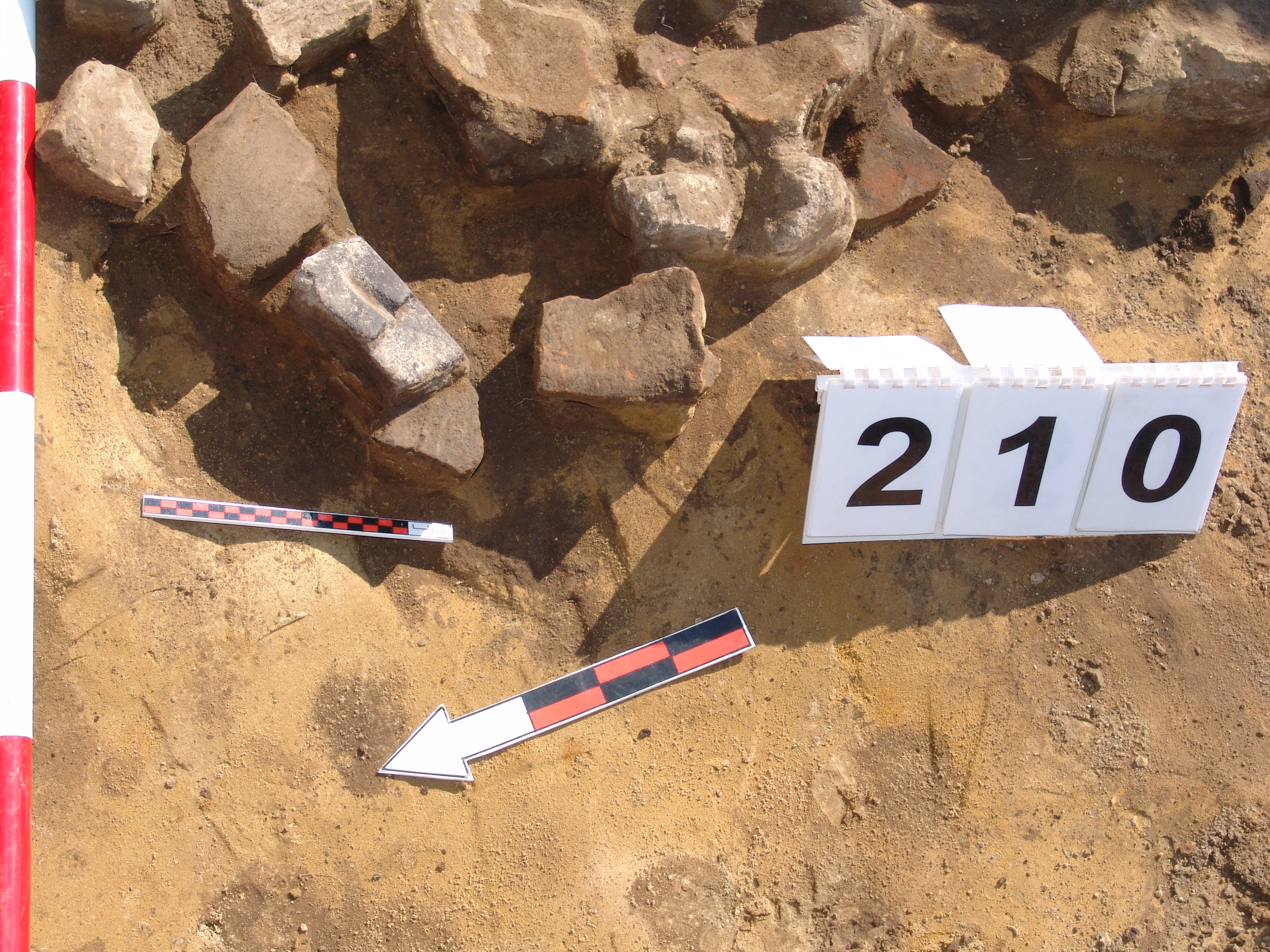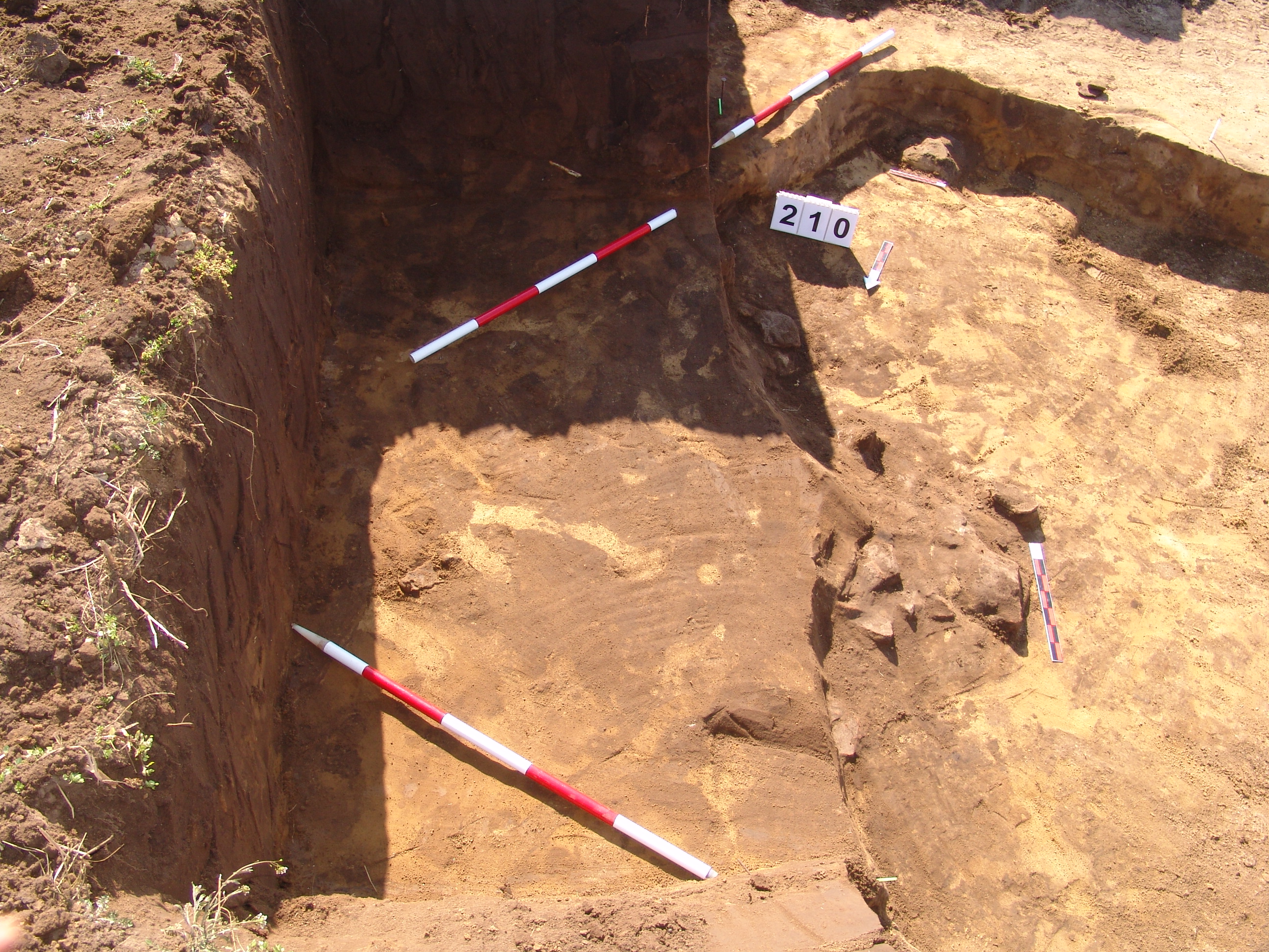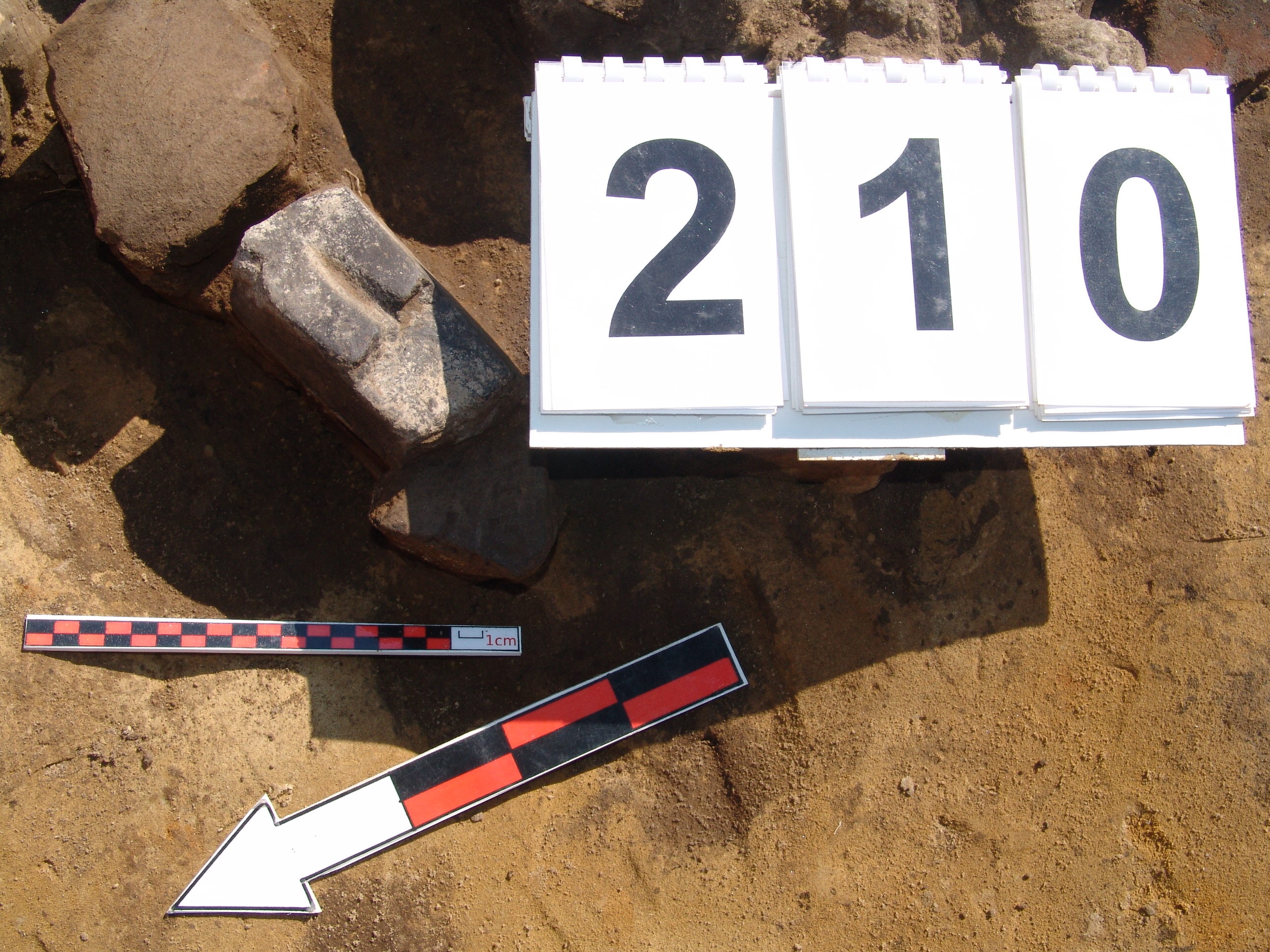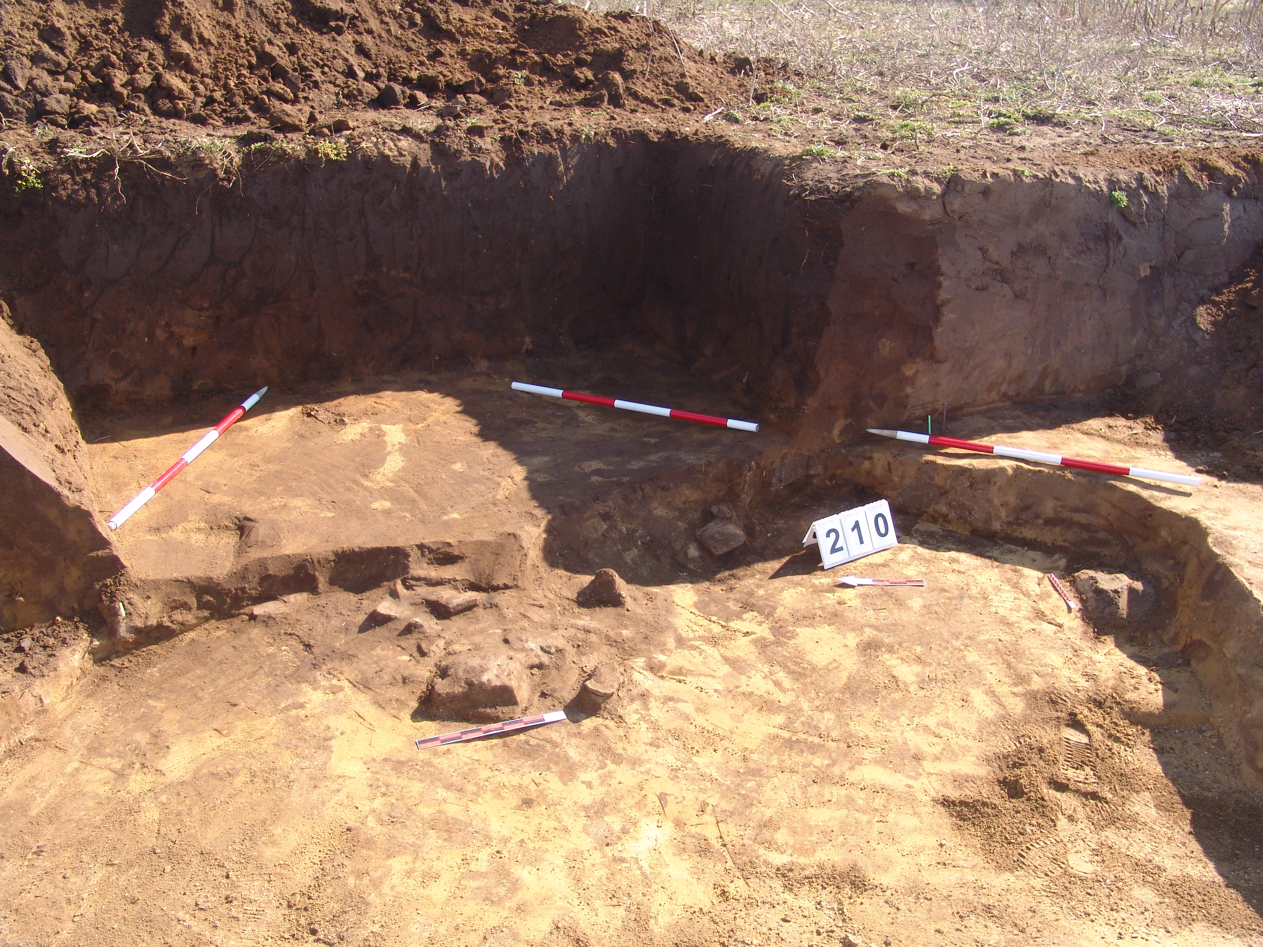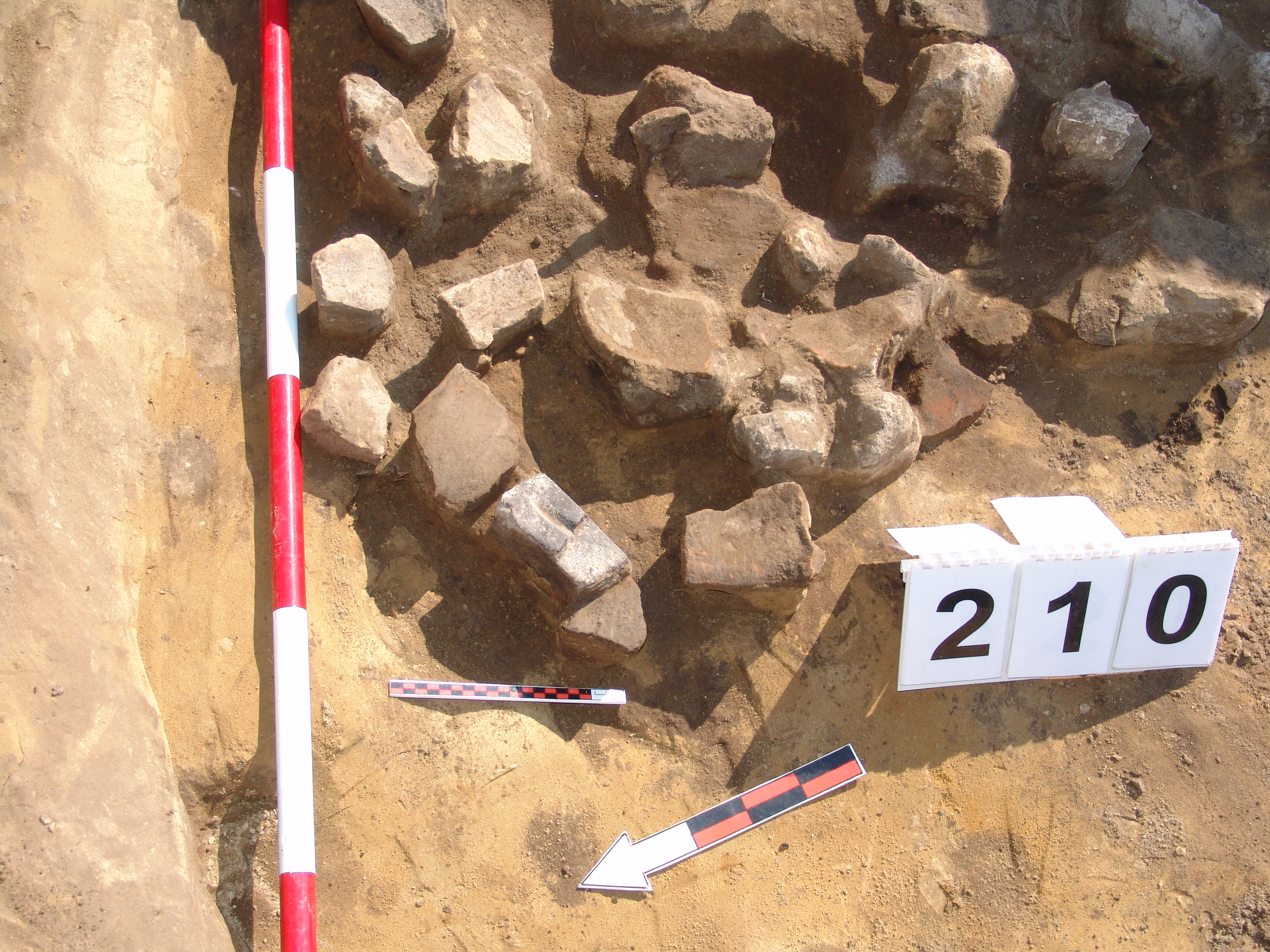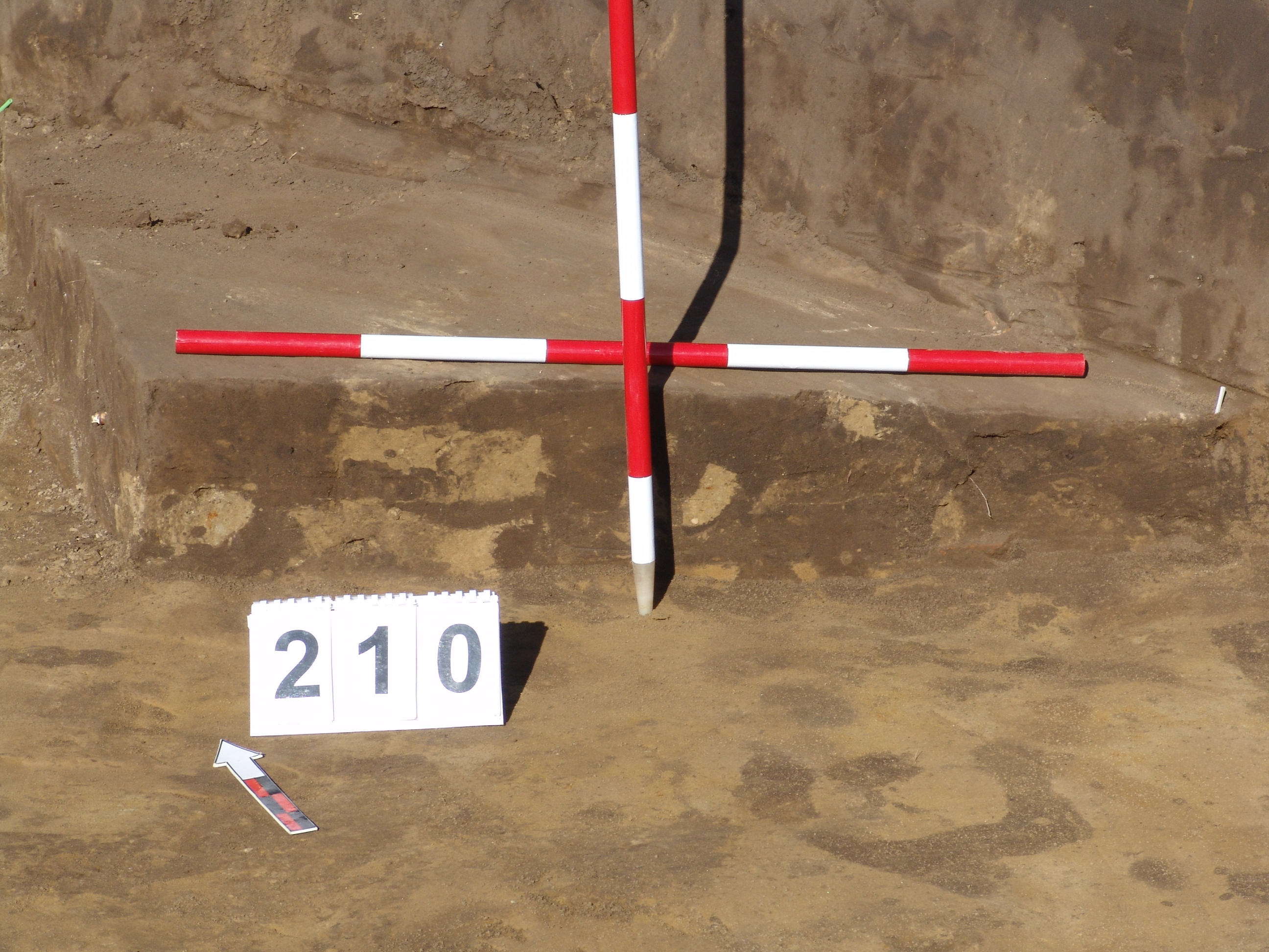 A feltárás keleti szélénél, a feltáratlan rész alá „futó” négyszögletes nagy sötét, kissé elúszó folttal jelentkező objektum a 175. gödörtől D-re mintegy 8-10 m-re. Fala függőleges, alja egyenes. D-Ny-i sarkában kis „padka szerűség” - talán a lejáró? Betöltése sárga szemcsés barnásszürke. Az ÉK-i sarkon nagy korongolatlan edényhez tartozó töredékek egy halomban. A szelvényfalon látszott, hogy a beásás kb. 55 cm mélyen indul. Rábontottunk az ÉK-i sarkára, mely a feltáratlan rész alatt volt. A háznak ebben a sarkában 130x140-es szögletes részen szétomlott edény cserepei egy halomban. É-D-re 290 cm Ny-K 310 cm. M:13-30 cm. 110-290° tájolású. A DK-i sarkon fekete, talán kiégetetlen edény oldala. Az ÉK-i sarokban ovális tűzhely maradvány a felszedett cserepek alatt:égett foltokkal jelentkezett. 75x90 cm-es ÉK-DNy-i /250.obj./