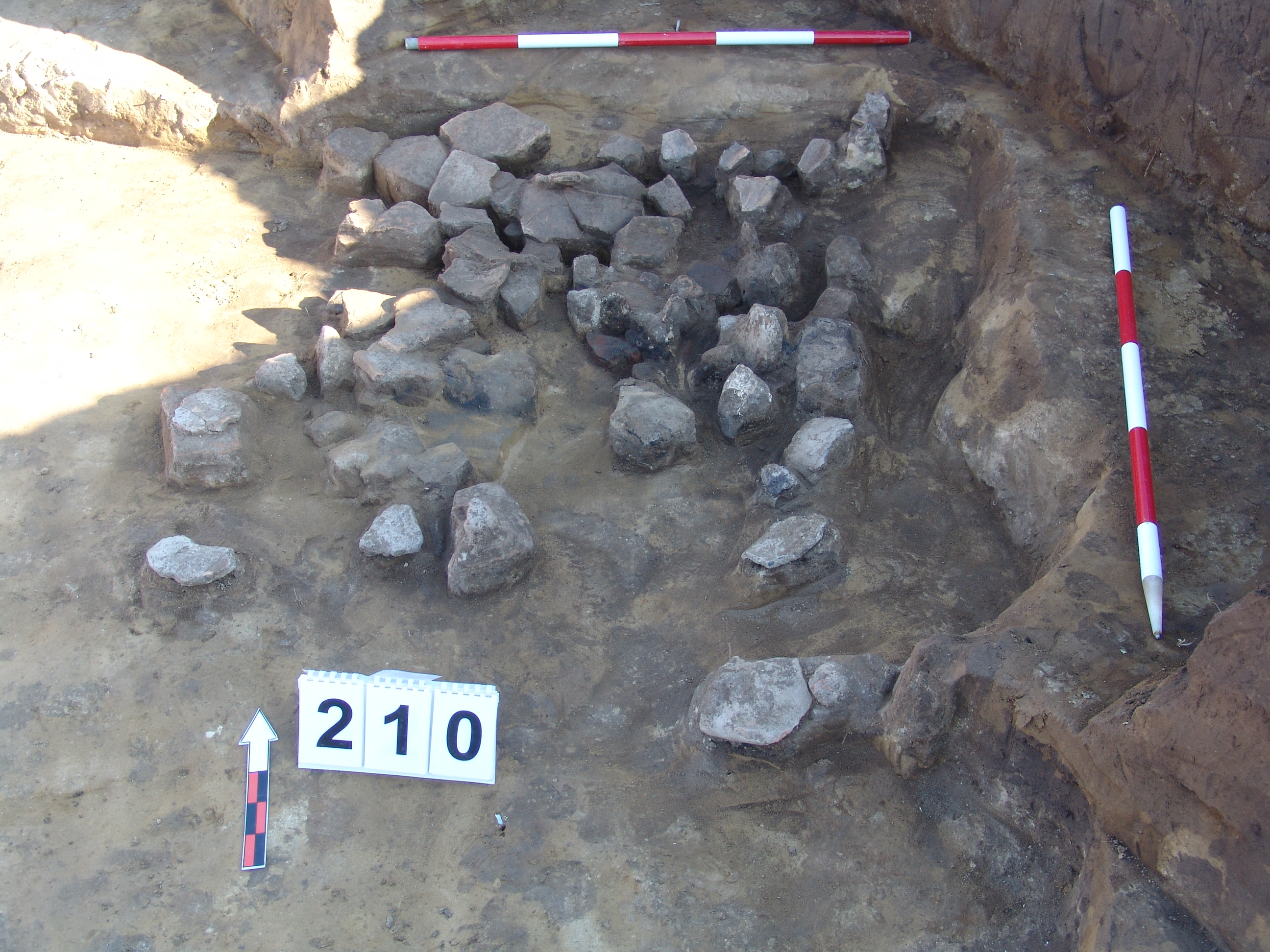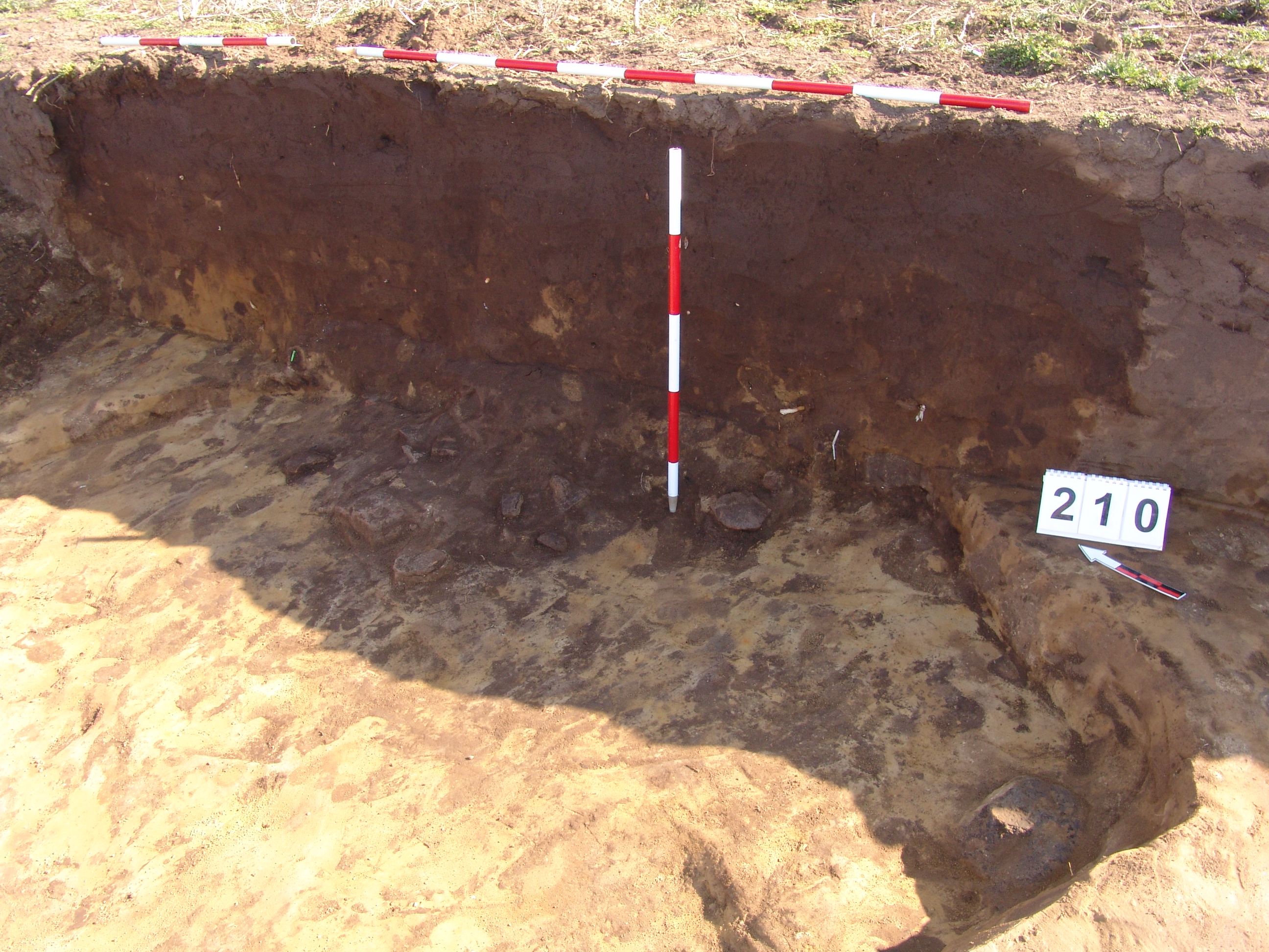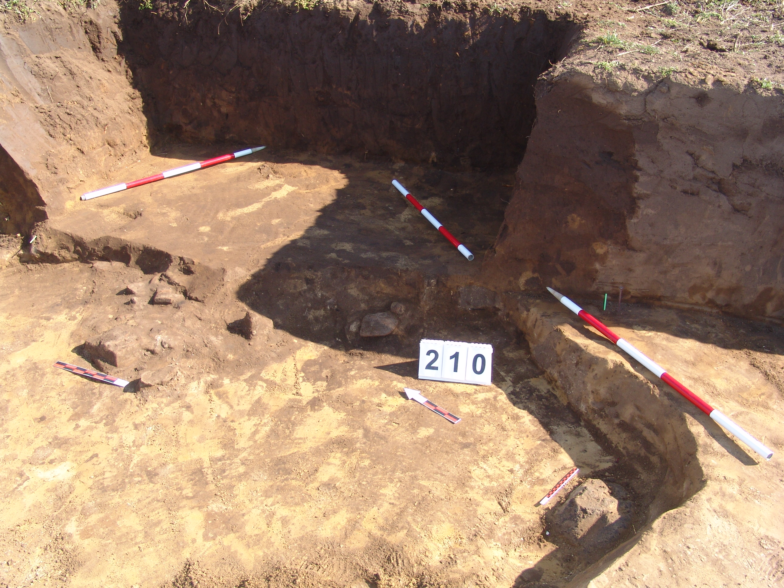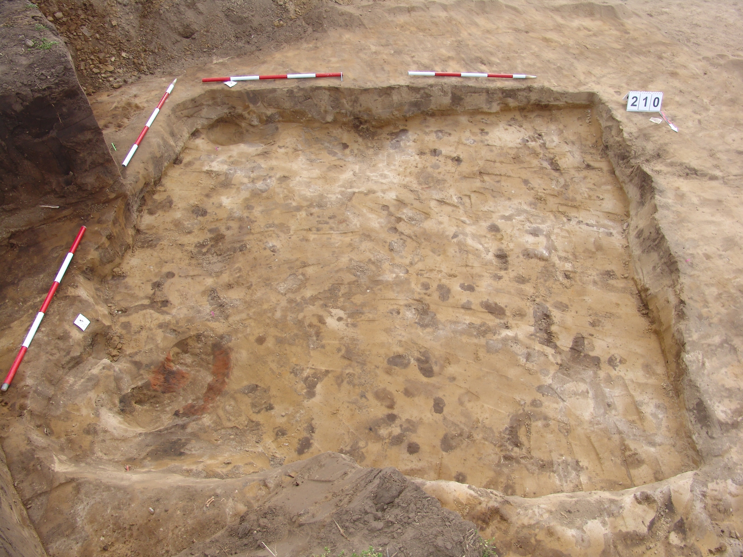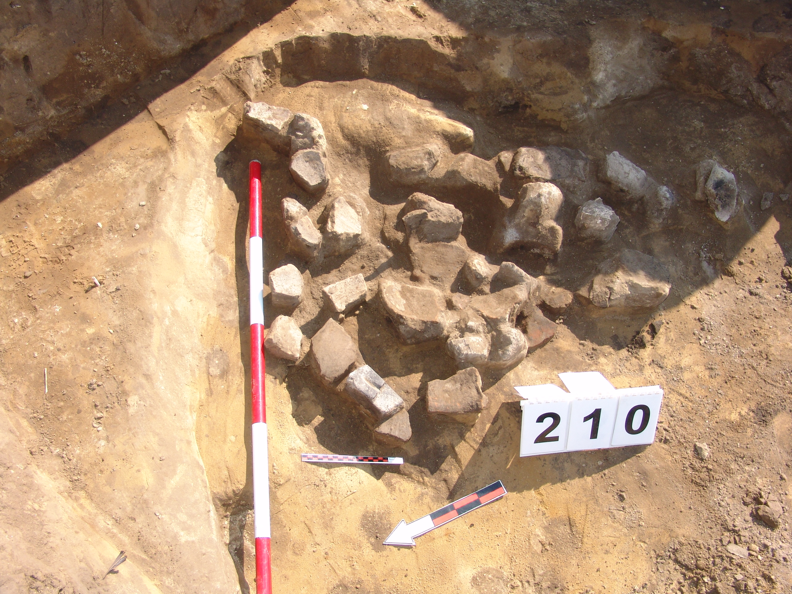 A feltárás keleti szélénél, a feltáratlan rész alá „futó” négyszögletes nagy sötét, kissé elúszó folttal jelentkező objektum a 175. gödörtől D-re mintegy 8-10 m-re. Fala függőleges, alja egyenes. D-Ny-i sarkában kis „padka szerűség” - talán a lejáró? Betöltése sárga szemcsés barnásszürke. Az ÉK-i sarkon nagy korongolatlan edényhez tartozó töredékek egy halomban. A szelvényfalon látszott, hogy a beásás kb. 55 cm mélyen indul. Rábontottunk az ÉK-i sarkára, mely a feltáratlan rész alatt volt. A háznak ebben a sarkában 130x140-es szögletes részen szétomlott edény cserepei egy halomban. É-D-re 290 cm Ny-K 310 cm. M:13-30 cm. 110-290° tájolású. A DK-i sarkon fekete, talán kiégetetlen edény oldala. Az ÉK-i sarokban ovális tűzhely maradvány a felszedett cserepek alatt:égett foltokkal jelentkezett. 75x90 cm-es ÉK-DNy-i /250.obj./