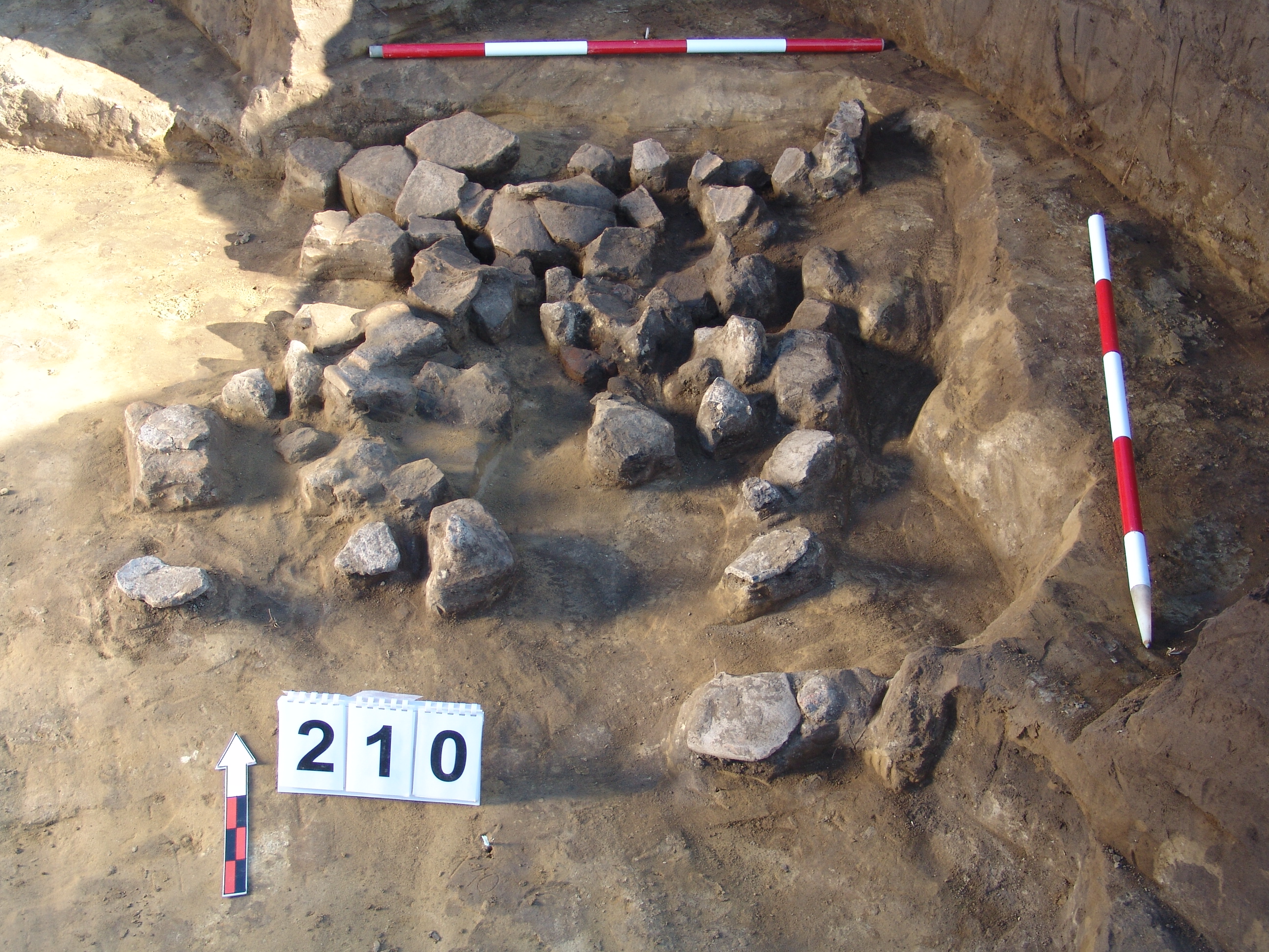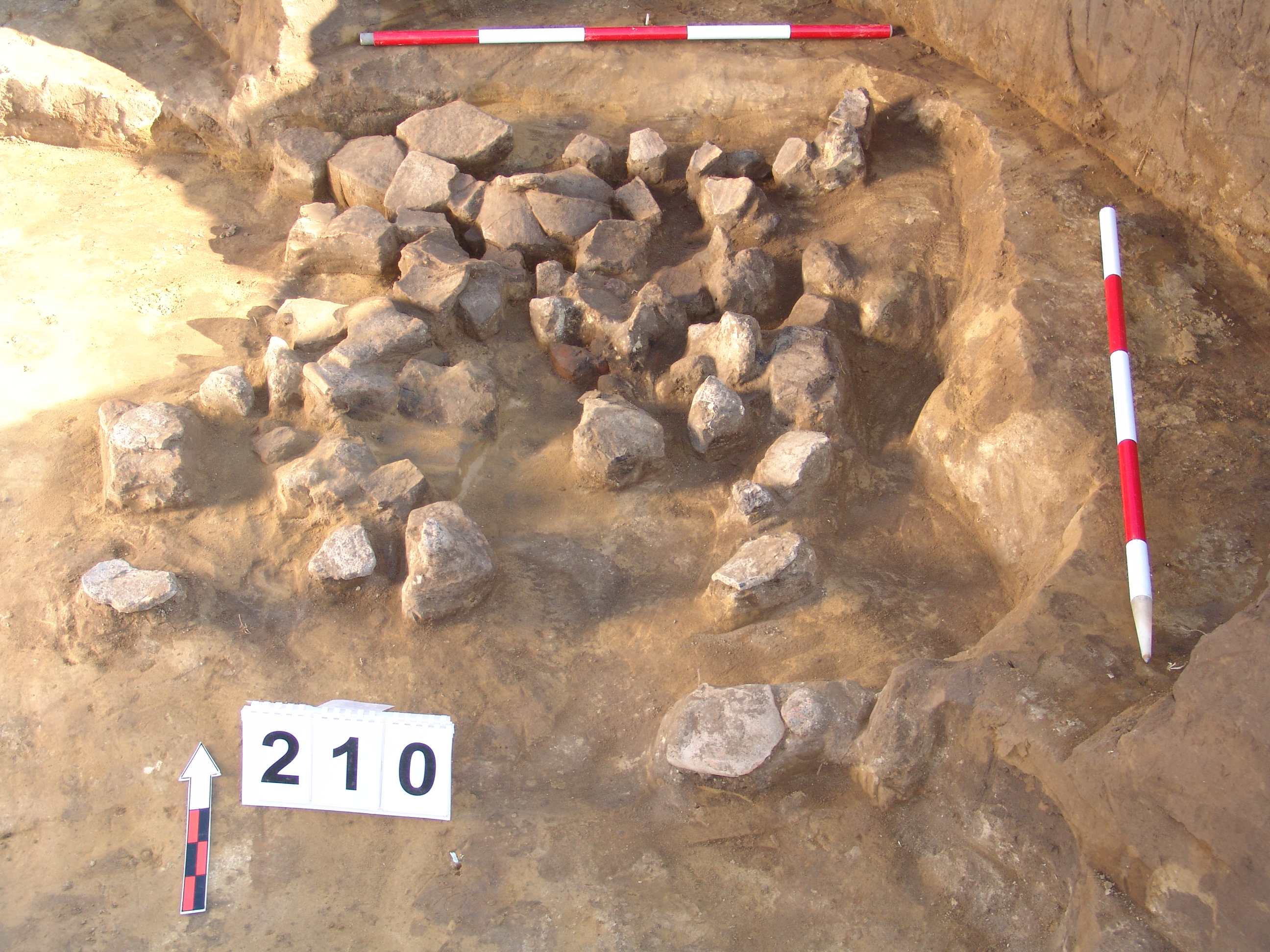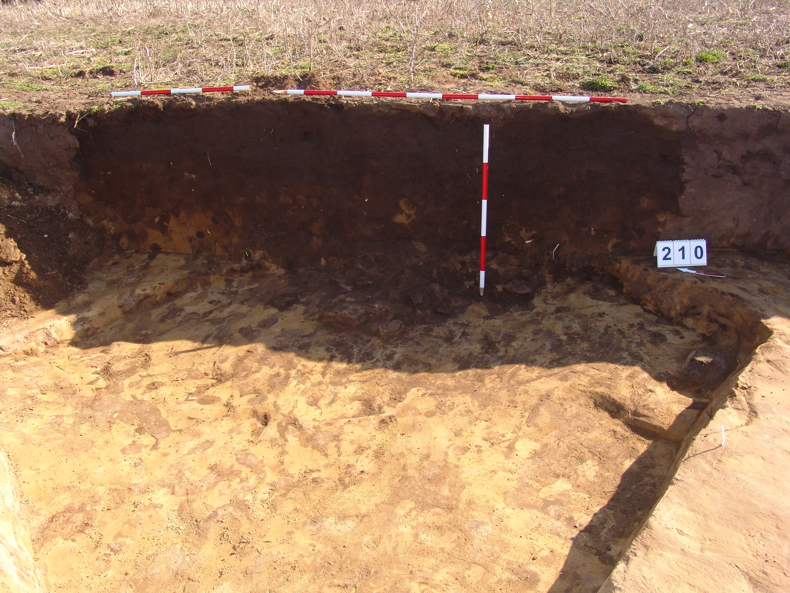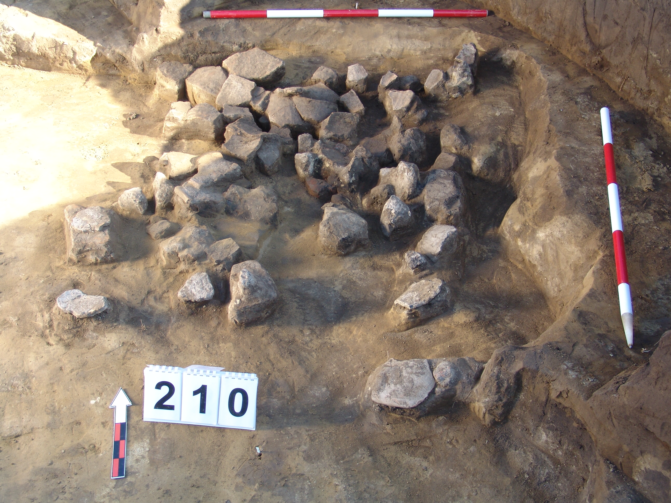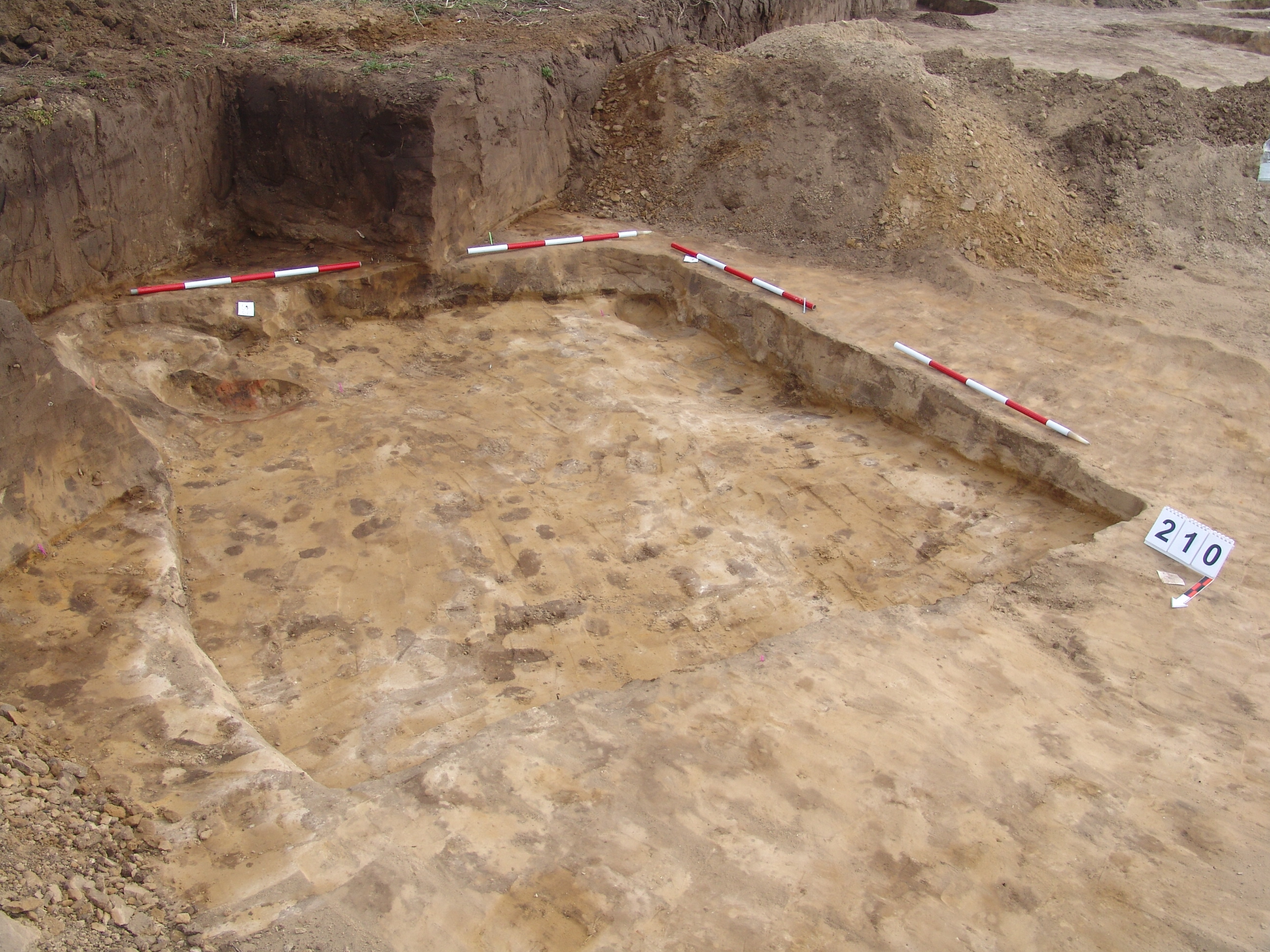 A feltárás keleti szélénél, a feltáratlan rész alá „futó” négyszögletes nagy sötét, kissé elúszó folttal jelentkező objektum a 175. gödörtől D-re mintegy 8-10 m-re. Fala függőleges, alja egyenes. D-Ny-i sarkában kis „padka szerűség” - talán a lejáró? Betöltése sárga szemcsés barnásszürke. Az ÉK-i sarkon nagy korongolatlan edényhez tartozó töredékek egy halomban. A szelvényfalon látszott, hogy a beásás kb. 55 cm mélyen indul. Rábontottunk az ÉK-i sarkára, mely a feltáratlan rész alatt volt. A háznak ebben a sarkában 130x140-es szögletes részen szétomlott edény cserepei egy halomban. É-D-re 290 cm Ny-K 310 cm. M:13-30 cm. 110-290° tájolású. A DK-i sarkon fekete, talán kiégetetlen edény oldala. Az ÉK-i sarokban ovális tűzhely maradvány a felszedett cserepek alatt:égett foltokkal jelentkezett. 75x90 cm-es ÉK-DNy-i /250.obj./