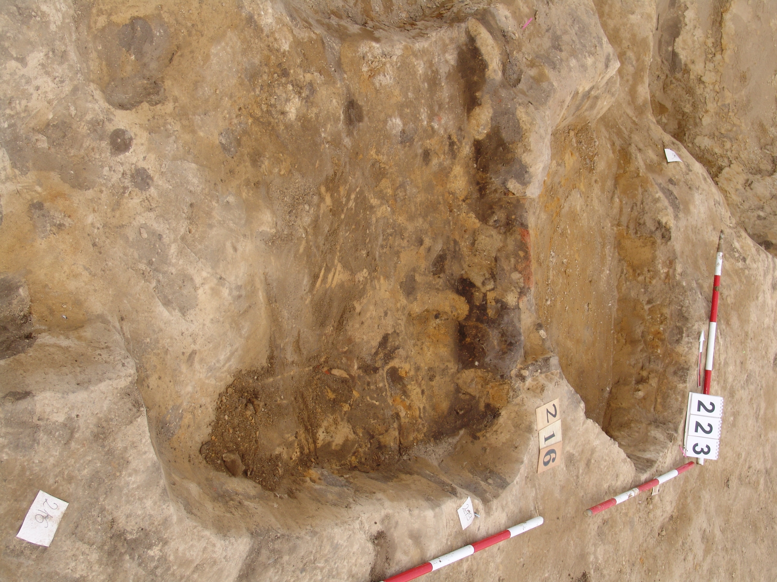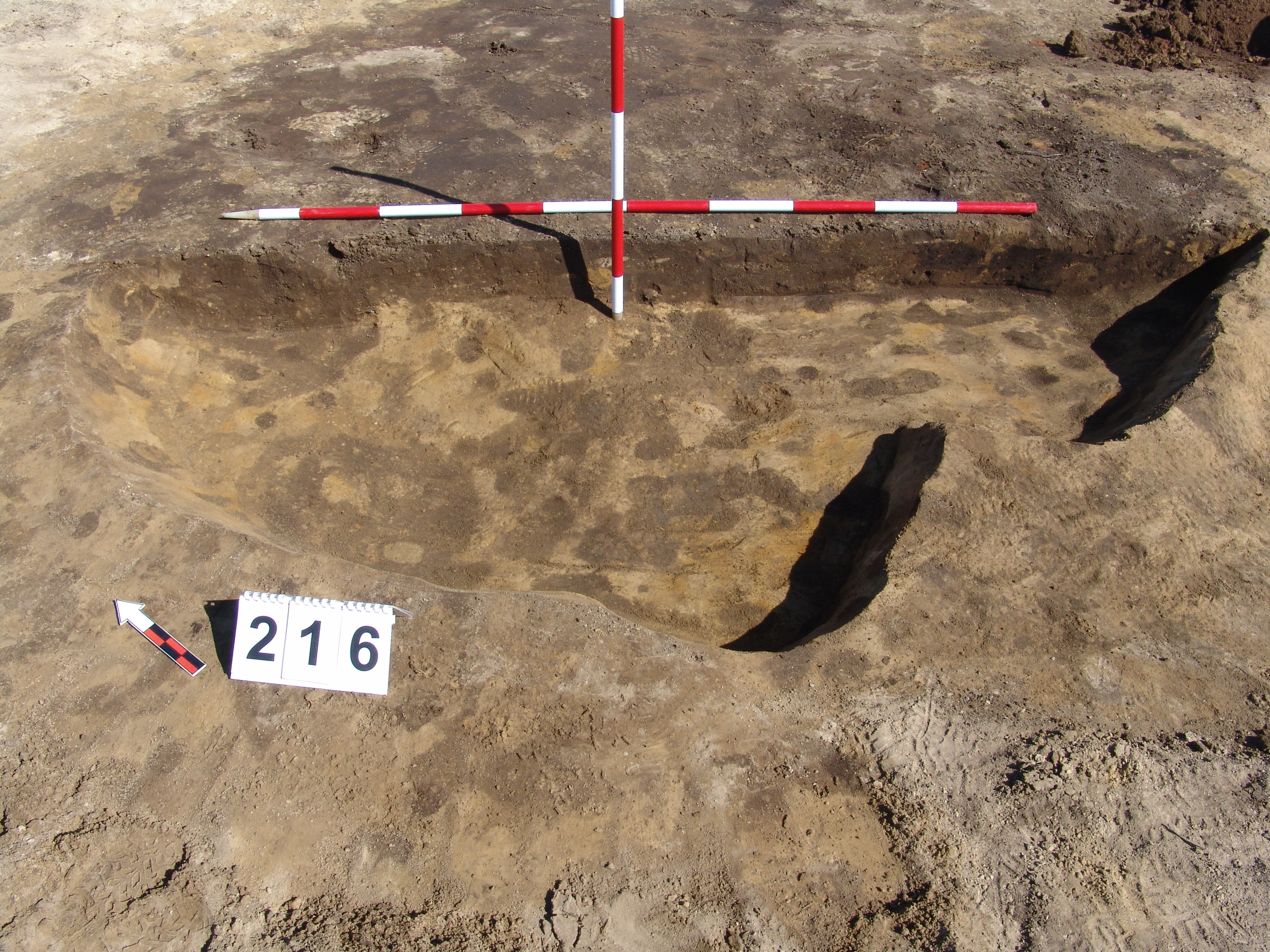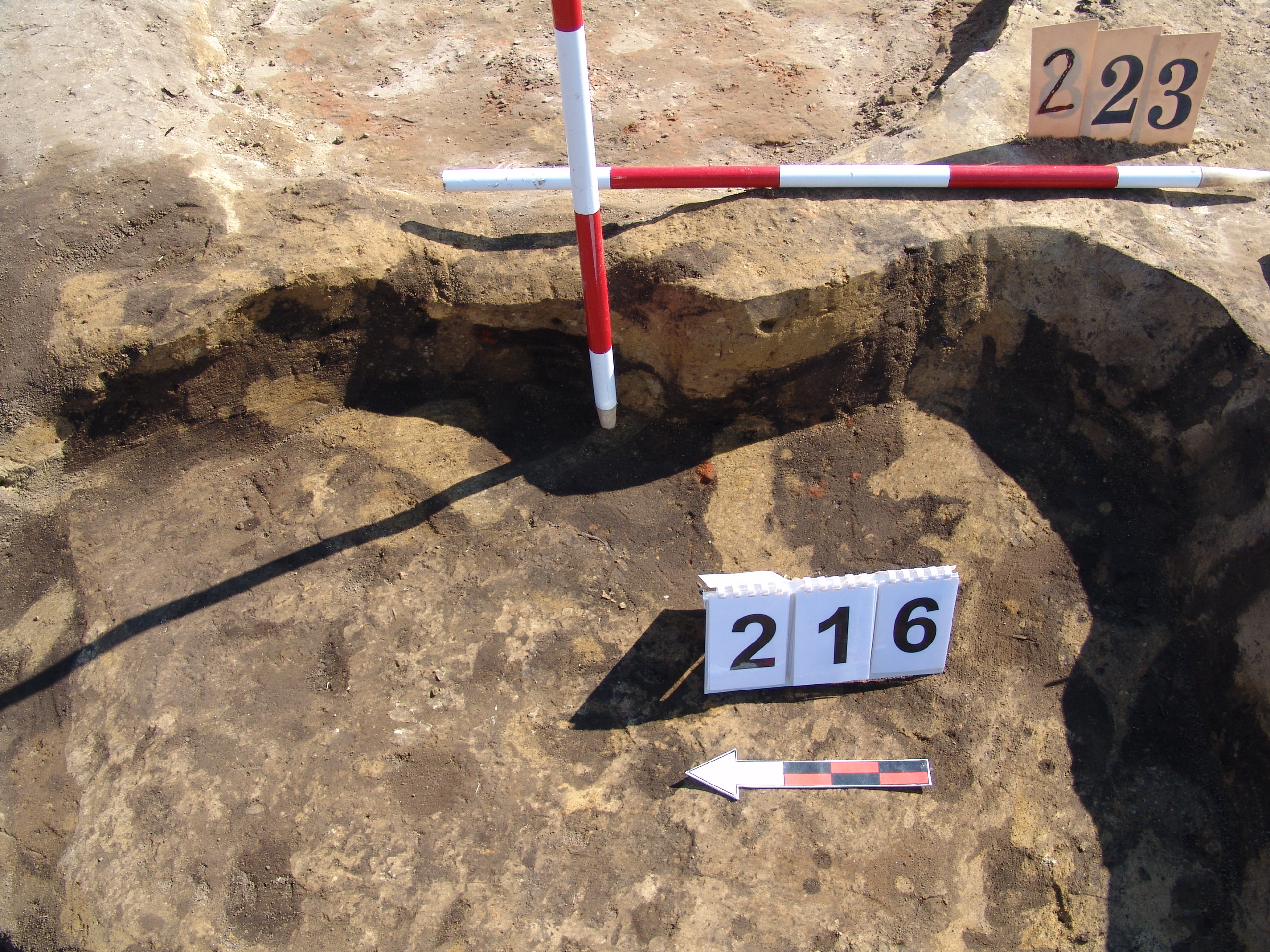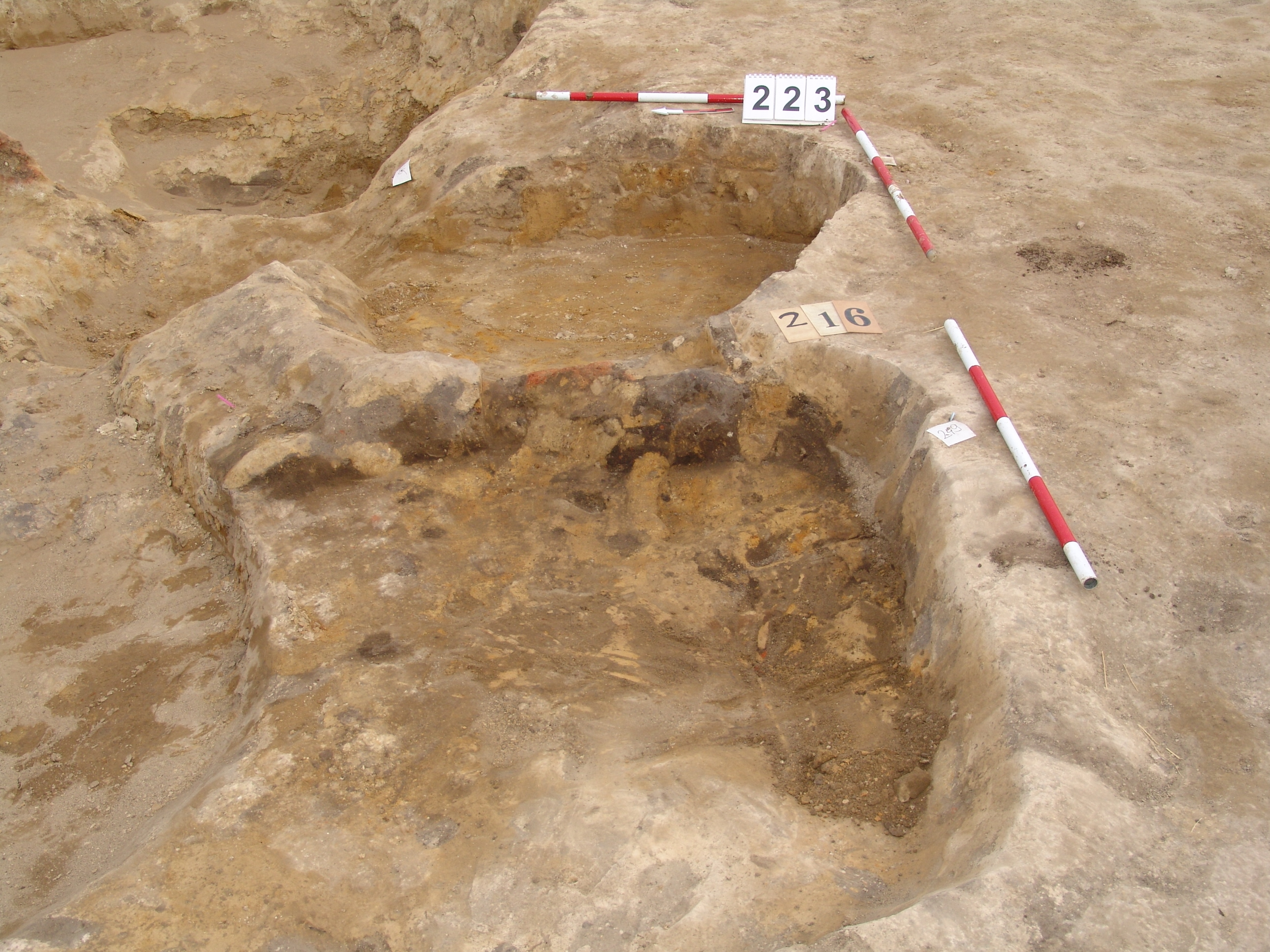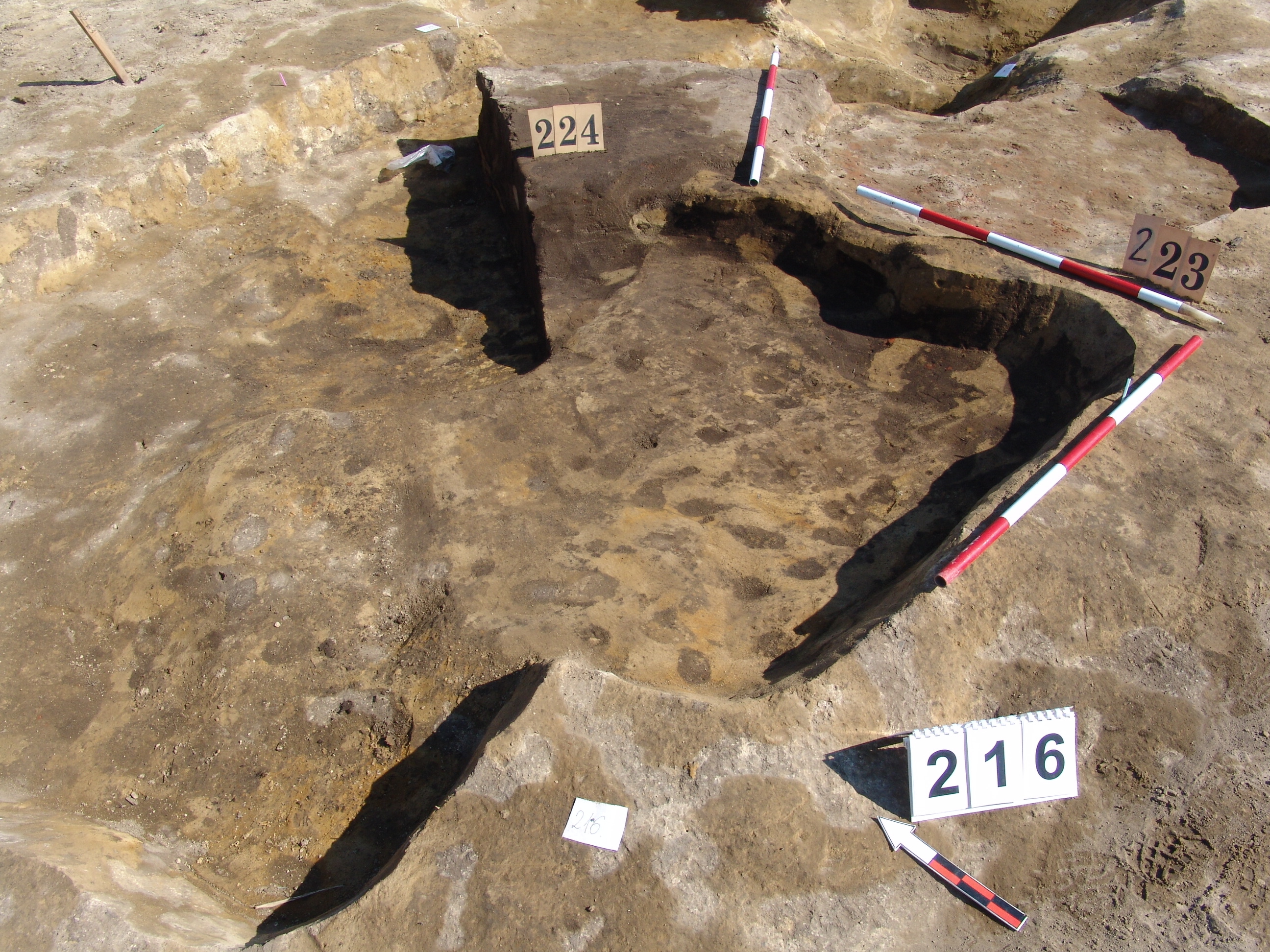 Az MNM NÖK által elkezdett és általunk 19. számmal jelölt objektum komlexum Ny-i oldalán kezdtük el a bontást. Lekerekített sarkú, szögletes objektumként indul. A D-i részen erősen romos, hamus rész kezdődik. A többi részén sárga szemcsés sötét barnásszürke a betöltés. A kormos rész valószínűleg egy másik objektum /217/. Fala meredek, alja egyenes. A Ny-i oldali „kiugró” rész nem biztos, hogy létezett. A DNy-i részen kemény döngölt padló jelentkezett, amelyen jól látszott, hogy a 224. obj.-t beleásták. A 223. kemencét meg rátapasztották. Az is elképzelhető, hogy a 223. kemence a 216 házhoz tartozott, de annyira erősen állatjáratos, hogy nem dönthető el. Annyi bizonyos, hogy a kemencétől a 216. irányban lejt egy kis pirosra égett rész.