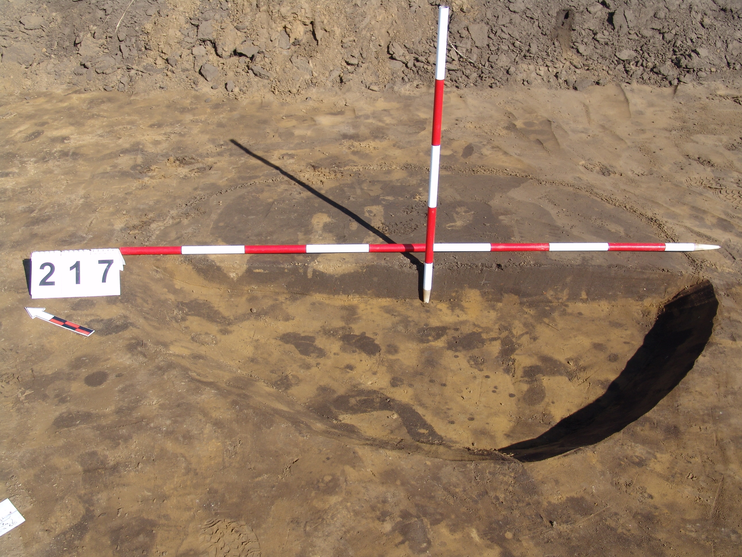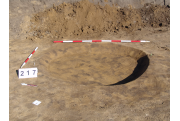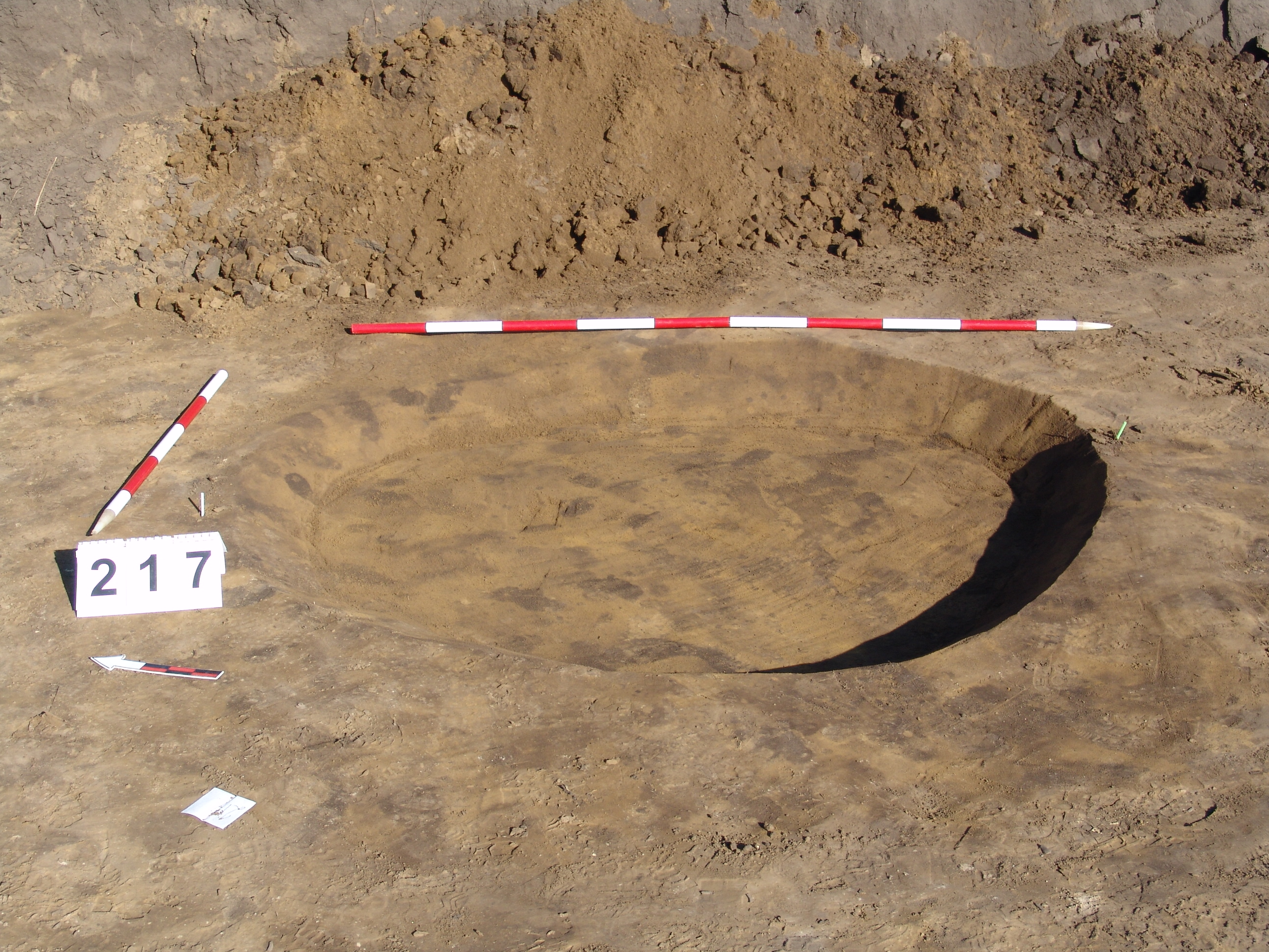 A feltárás K-i szélénél, a 3940 karótól KDK-re a fal mellett jól látszó, kerek folttal jelentkezett. Meredek falú, egyenes aljú, egynemű, egészen sötét szürke betöltésű gödör. Átm.: fent: É-D:165 Ny-K: 155 lent: É-D:156 Ny-K:135 M:15-18