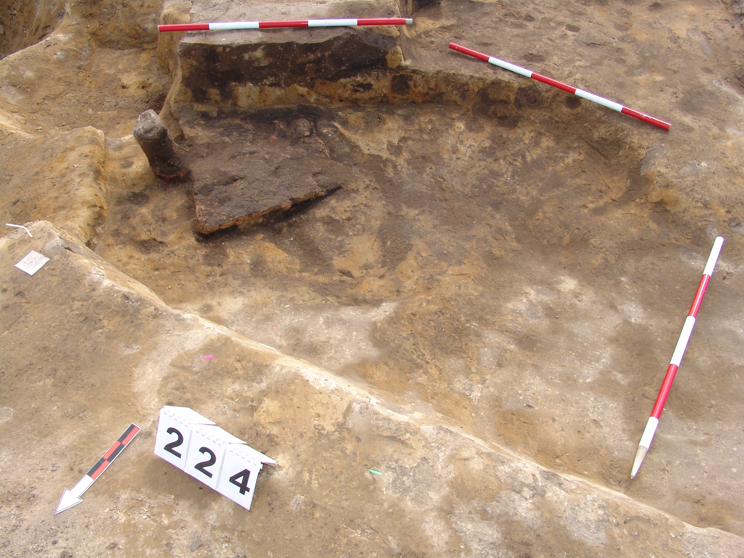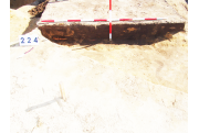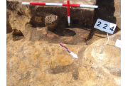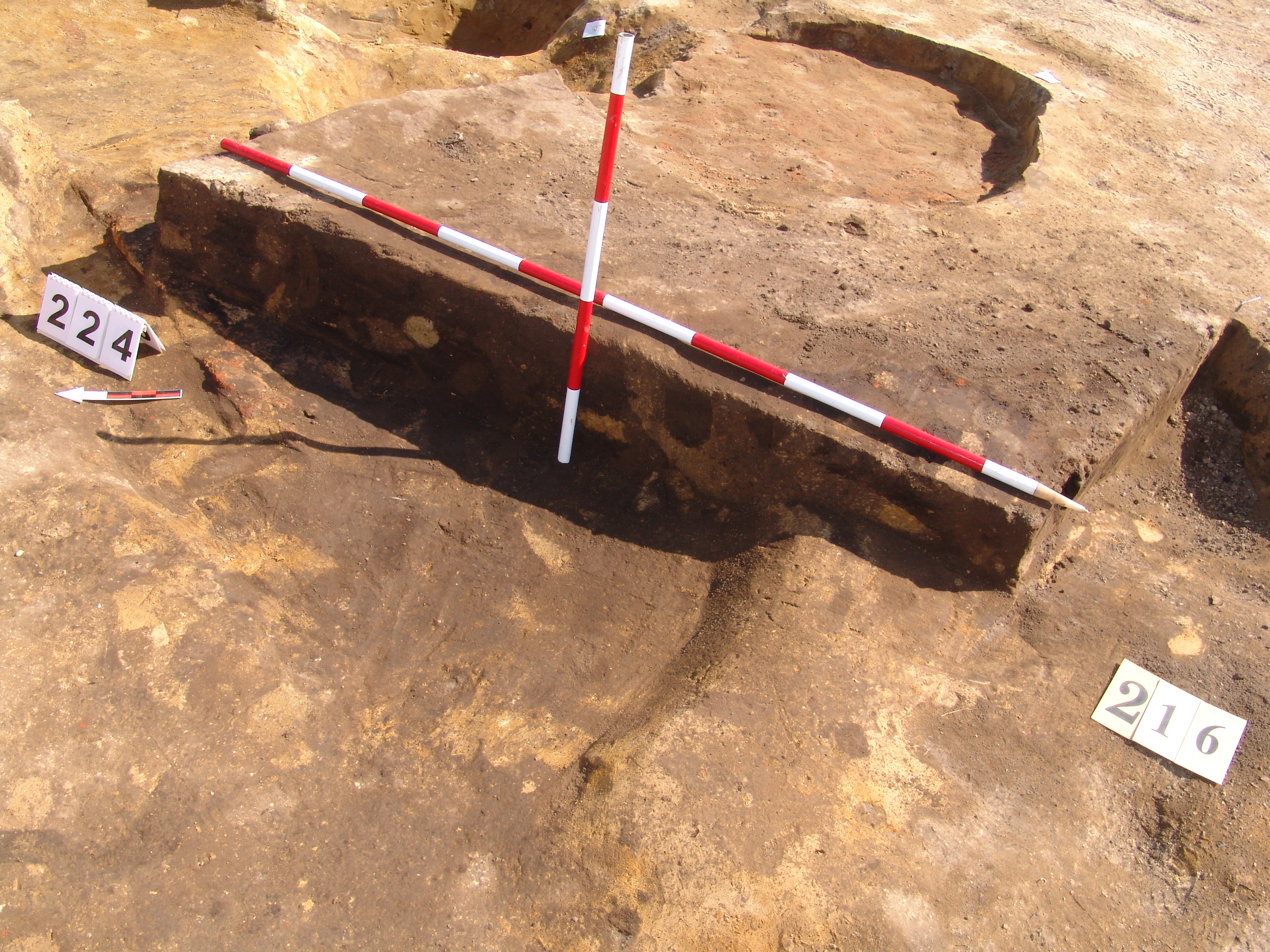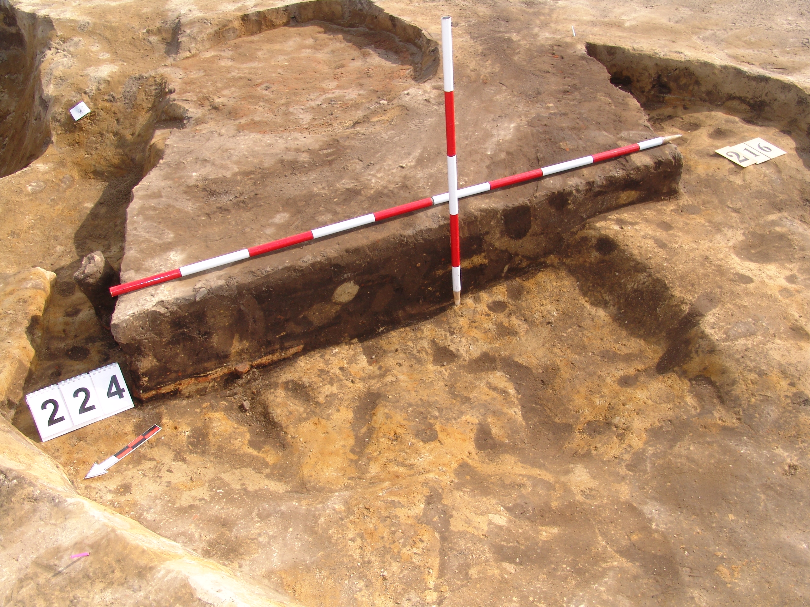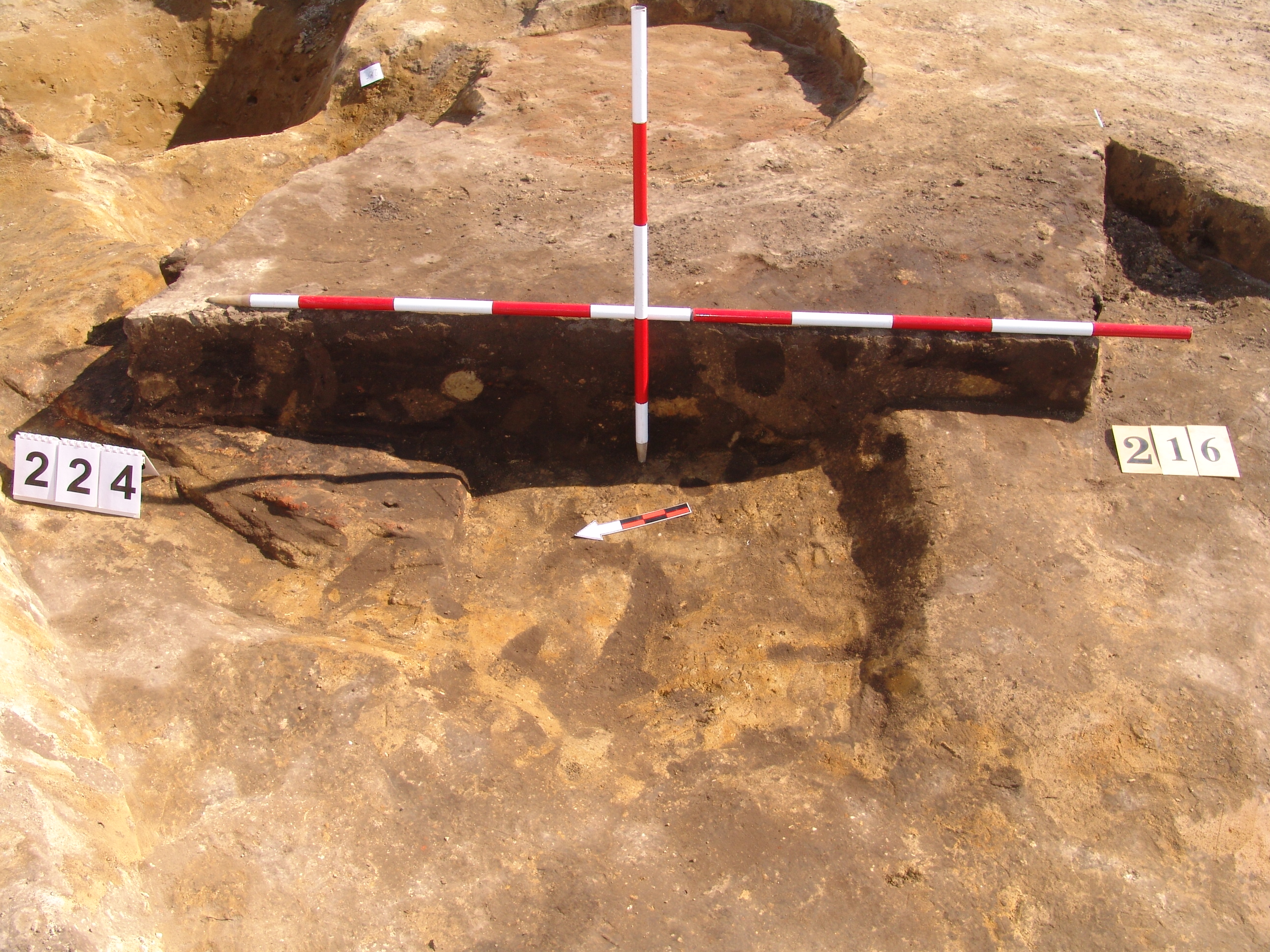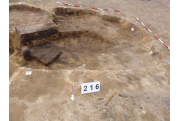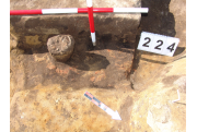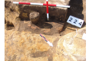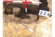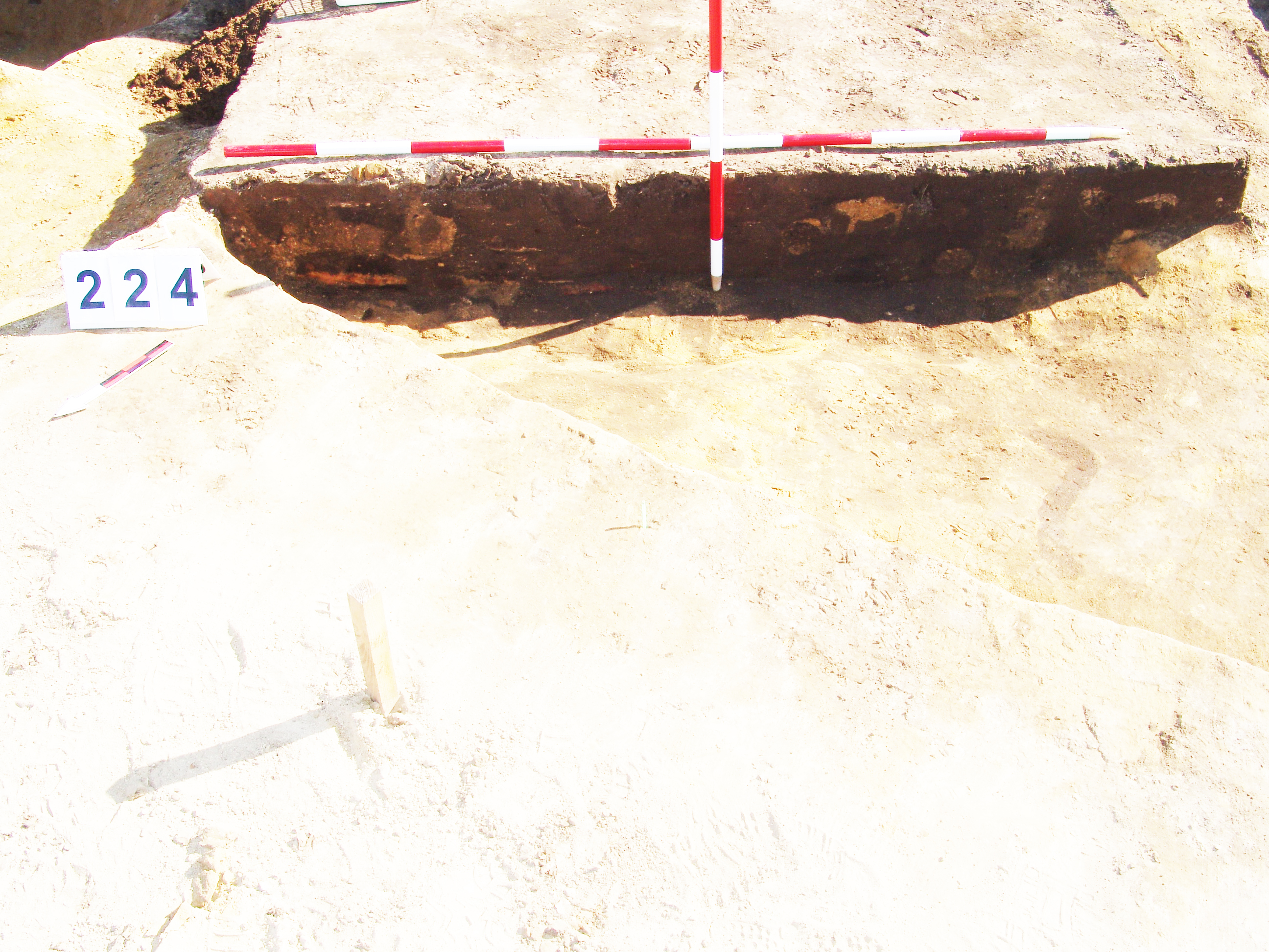 Az MNM NÖK által elkezdett, általunk 19 számot kapott objektumbokor közepe táján a meghagyott metszet É-i széle mellett egy kemence platnija kezdett rajzolódni, ez kapta a 224. számot. Felette a betöltés erősen sárga szemcsés sötét barnásszürke, csaknem fekete. A bontáskor a jelentkezési szint alatt 5 cm-re középen egy koponya és apró csontok /talán kisebb kutya ???/ csontjai egy kupacban. Alján 2 cm vastag tapasztás réteg, mely helyenként átégett. Fala K-ről egyenes. Végül egy szögletes bemélyedés lett a 216. objektum É-K-i sarkánál, alól az alján jön 2 db 1 cm fekete korom, ezen sárga 2-3 cm vastag tapasztás. Átm.: 80 cm. A 216. ház padlóját bontva egyértelmű, hogy abba beleástak. Nagyjából téglalap alaprajzú, kissé meredek falú bemélyedés lett belőle, kb. Ny-K-i irányban. M:200 Sz:120 Mélysége az egész 19 obj. jelentkezési szintjétől 30 cm. A kemence tapasztása az É-K-i végén volt. Átm.: 90 cm volt. /ebbe K-ről és É-ról kicsit belebontottunk./ A kormos réteg 3 cm vastag, melyre 2 cm vastag sárga tapasztás került. Ez keményre égett, helyenként vörös.