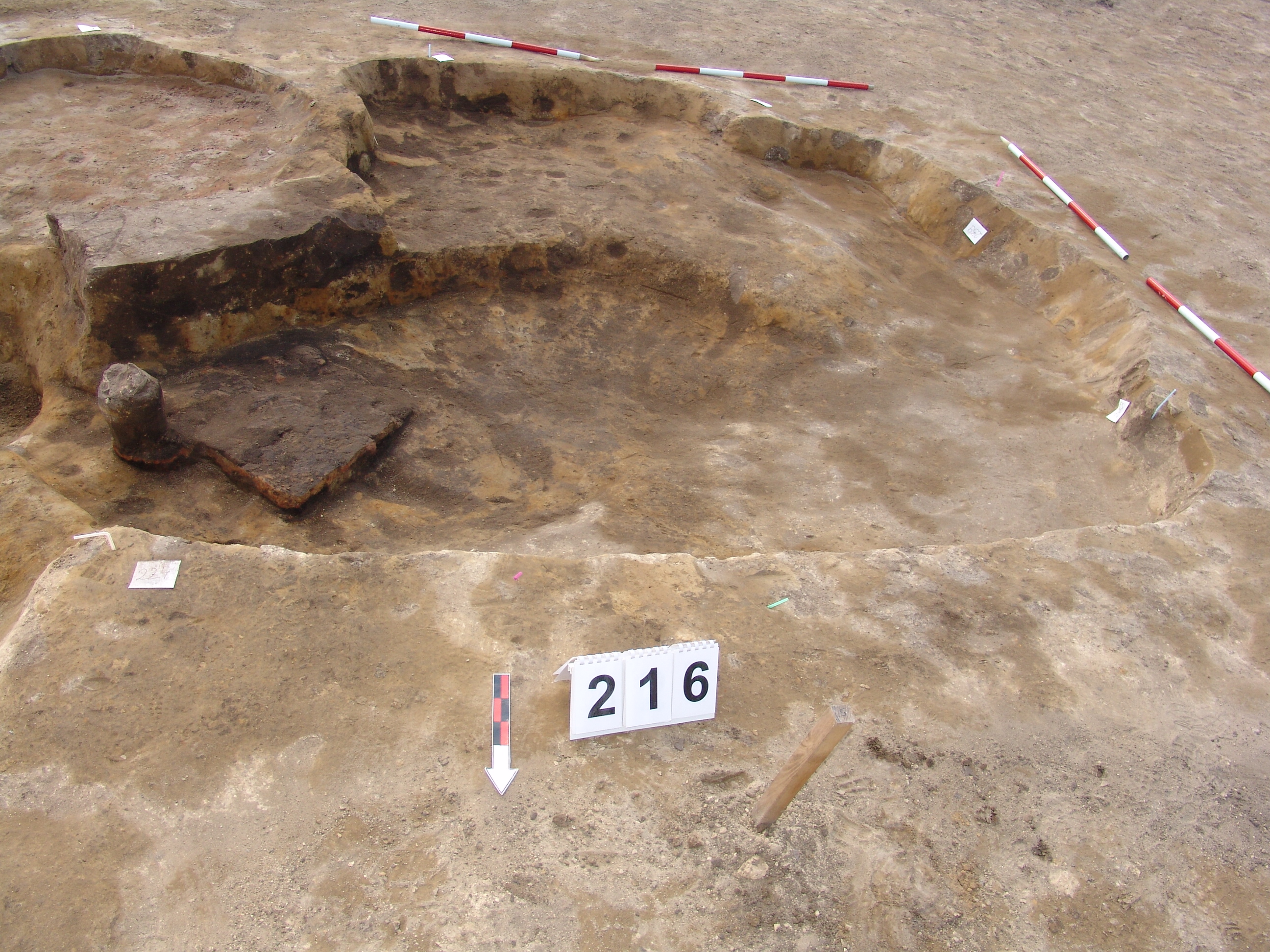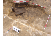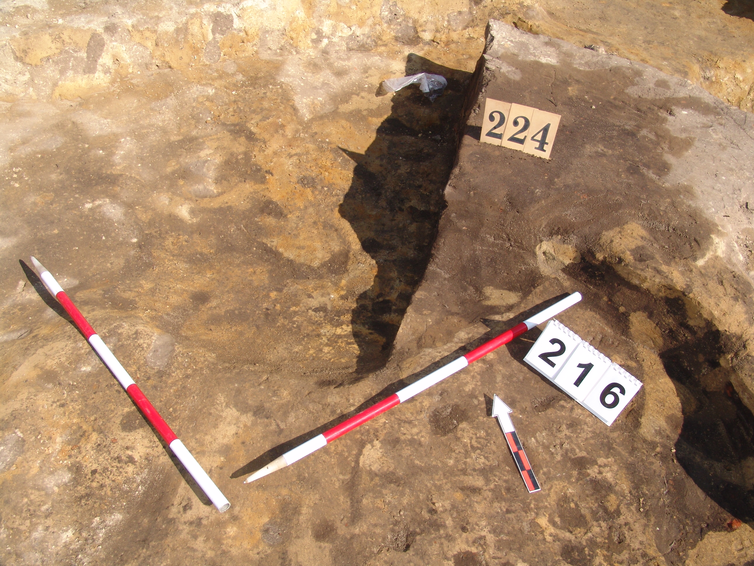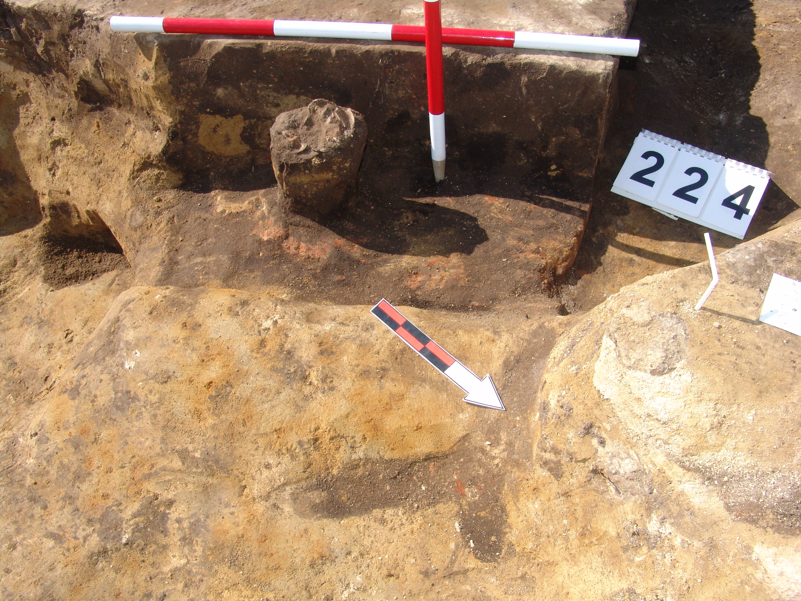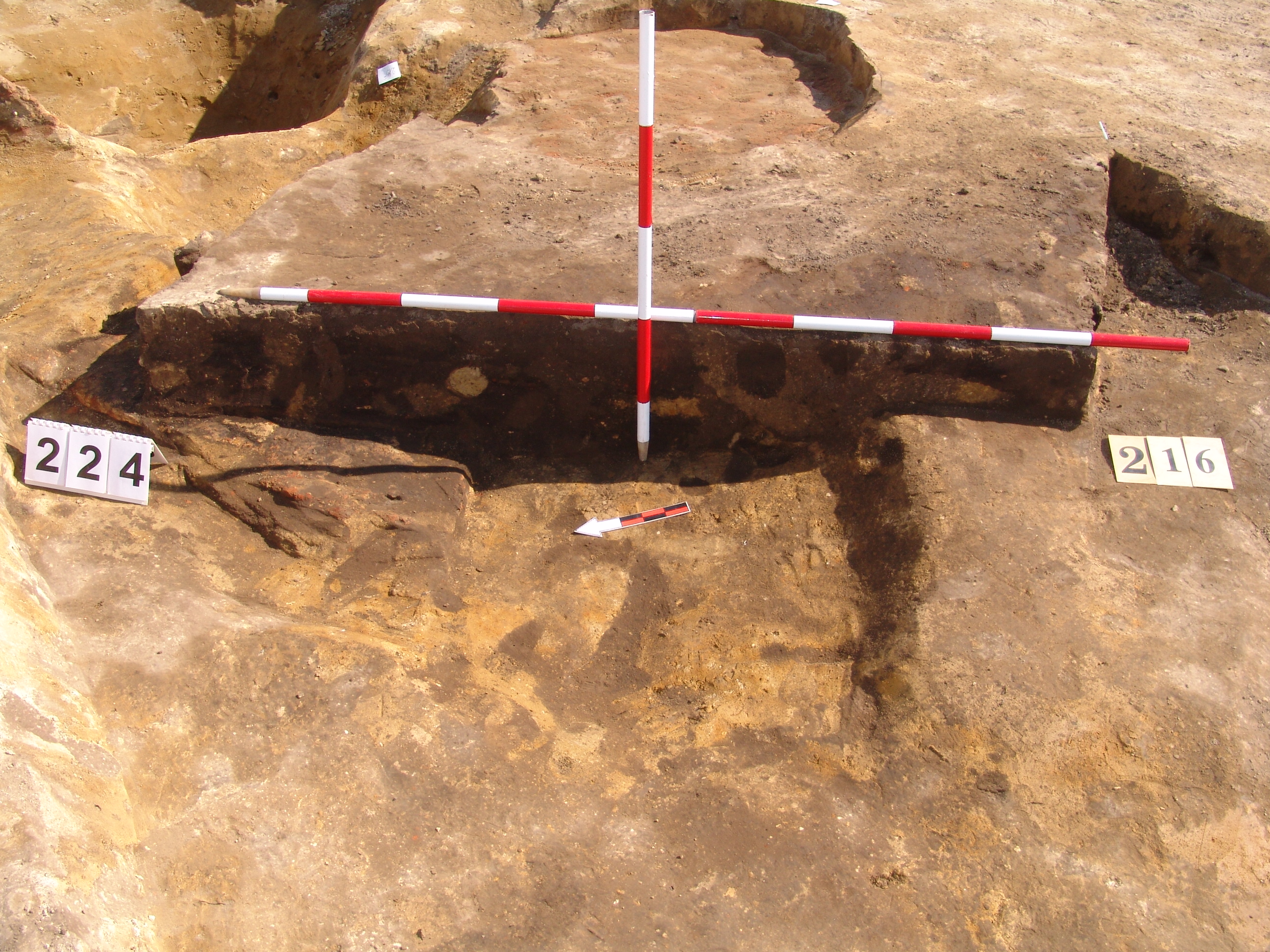 Az MNM NÖK által elkezdett, általunk 19 számot kapott objektumbokor közepe táján a meghagyott metszet É-i széle mellett egy kemence platnija kezdett rajzolódni, ez kapta a 224. számot. Felette a betöltés erősen sárga szemcsés sötét barnásszürke, csaknem fekete. A bontáskor a jelentkezési szint alatt 5 cm-re középen egy koponya és apró csontok /talán kisebb kutya ???/ csontjai egy kupacban. Alján 2 cm vastag tapasztás réteg, mely helyenként átégett. Fala K-ről egyenes. Végül egy szögletes bemélyedés lett a 216. objektum É-K-i sarkánál, alól az alján jön 2 db 1 cm fekete korom, ezen sárga 2-3 cm vastag tapasztás. Átm.: 80 cm. A 216. ház padlóját bontva egyértelmű, hogy abba beleástak. Nagyjából téglalap alaprajzú, kissé meredek falú bemélyedés lett belőle, kb. Ny-K-i irányban. M:200 Sz:120 Mélysége az egész 19 obj. jelentkezési szintjétől 30 cm. A kemence tapasztása az É-K-i végén volt. Átm.: 90 cm volt. /ebbe K-ről és É-ról kicsit belebontottunk./ A kormos réteg 3 cm vastag, melyre 2 cm vastag sárga tapasztás került. Ez keményre égett, helyenként vörös.