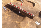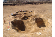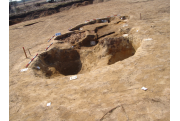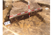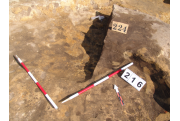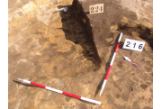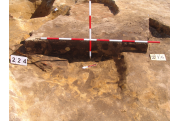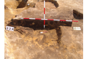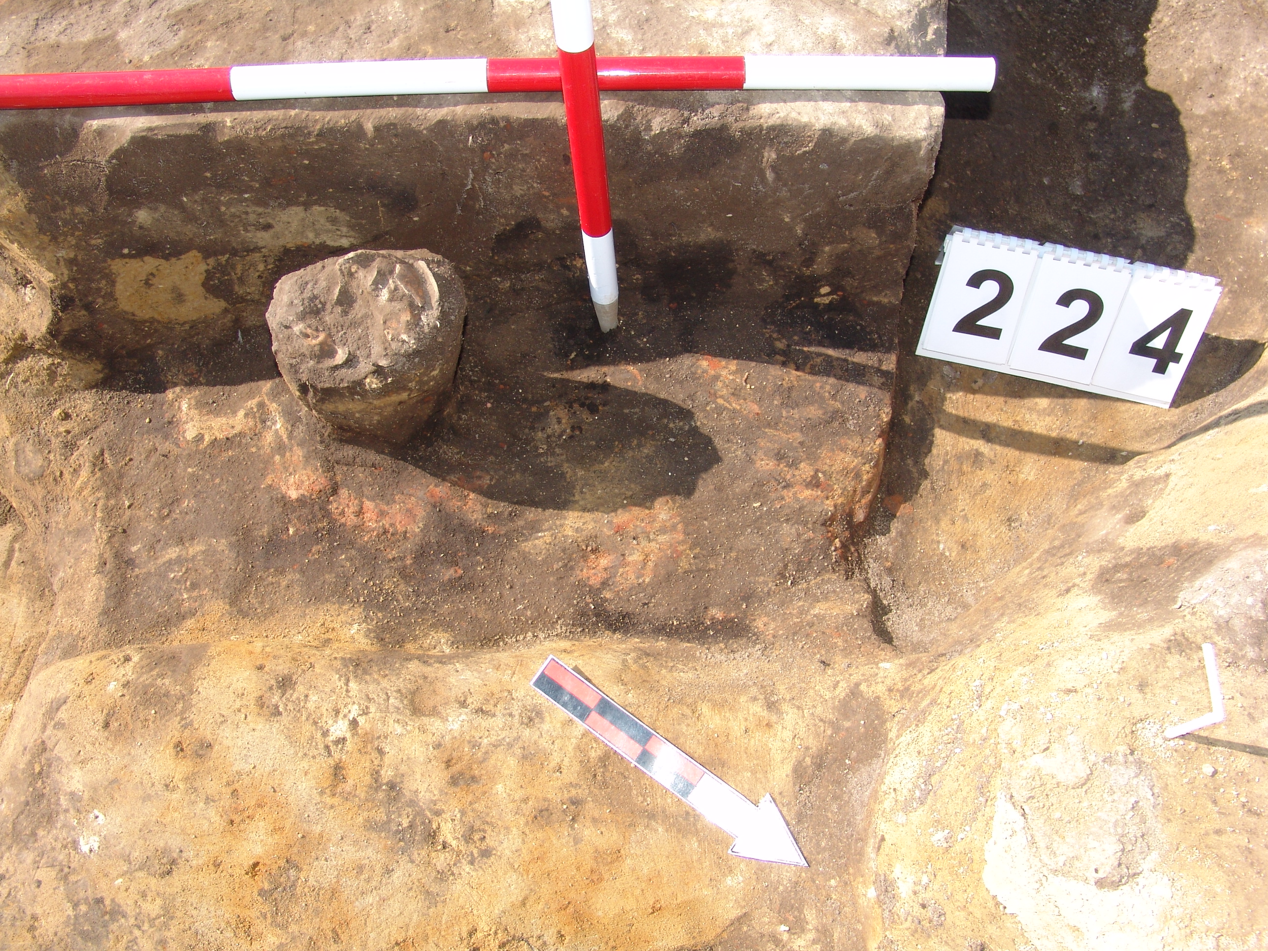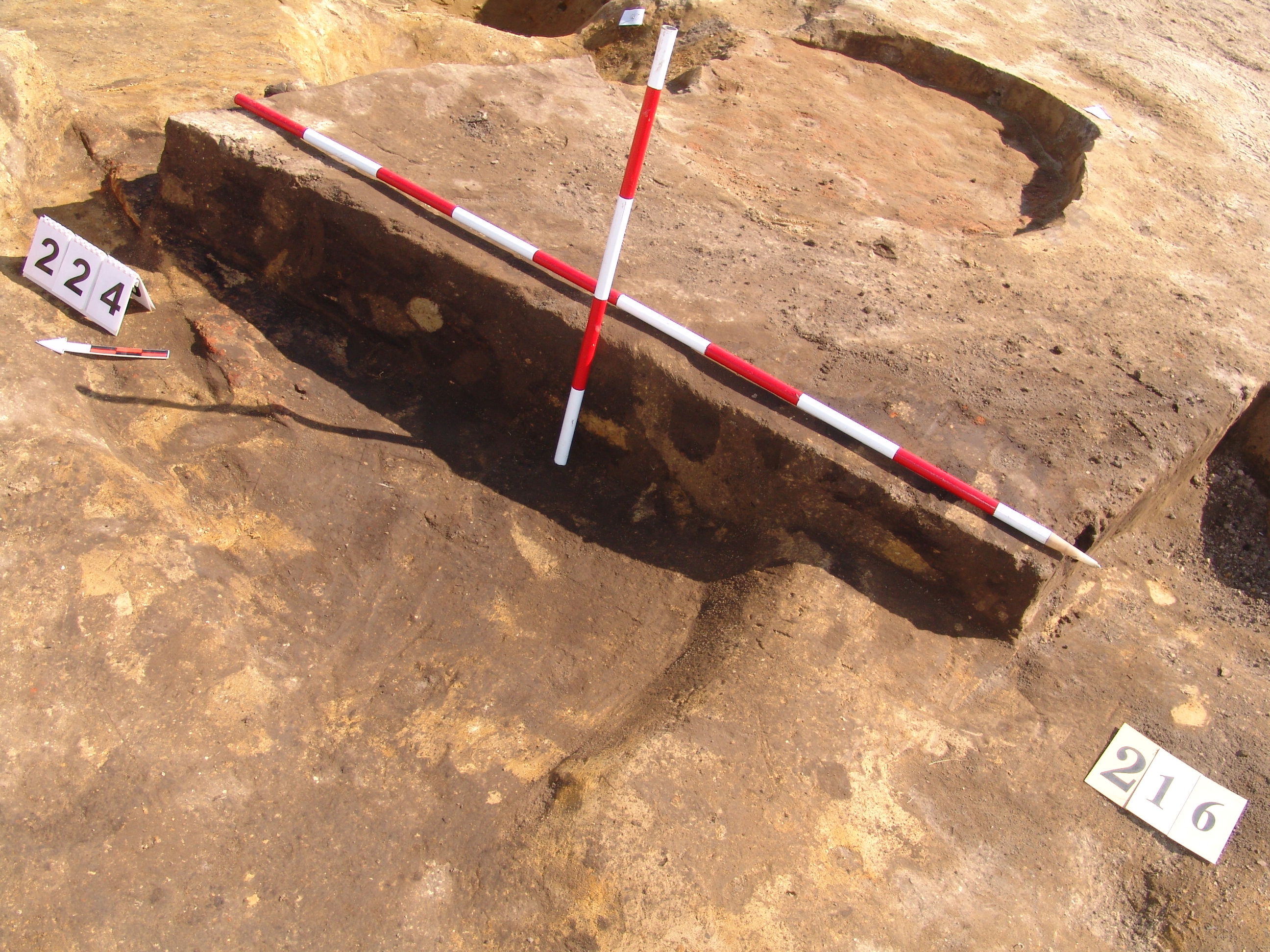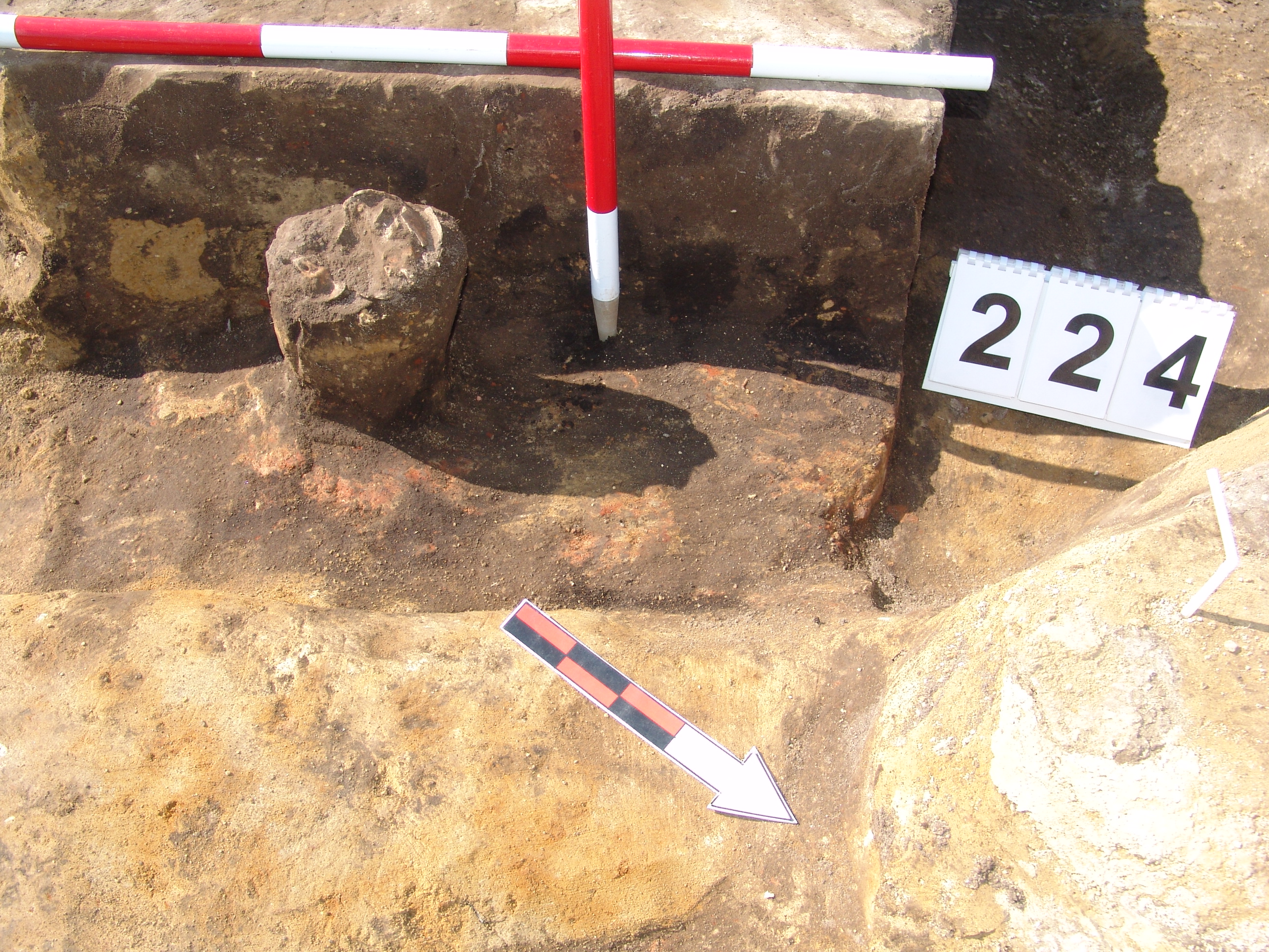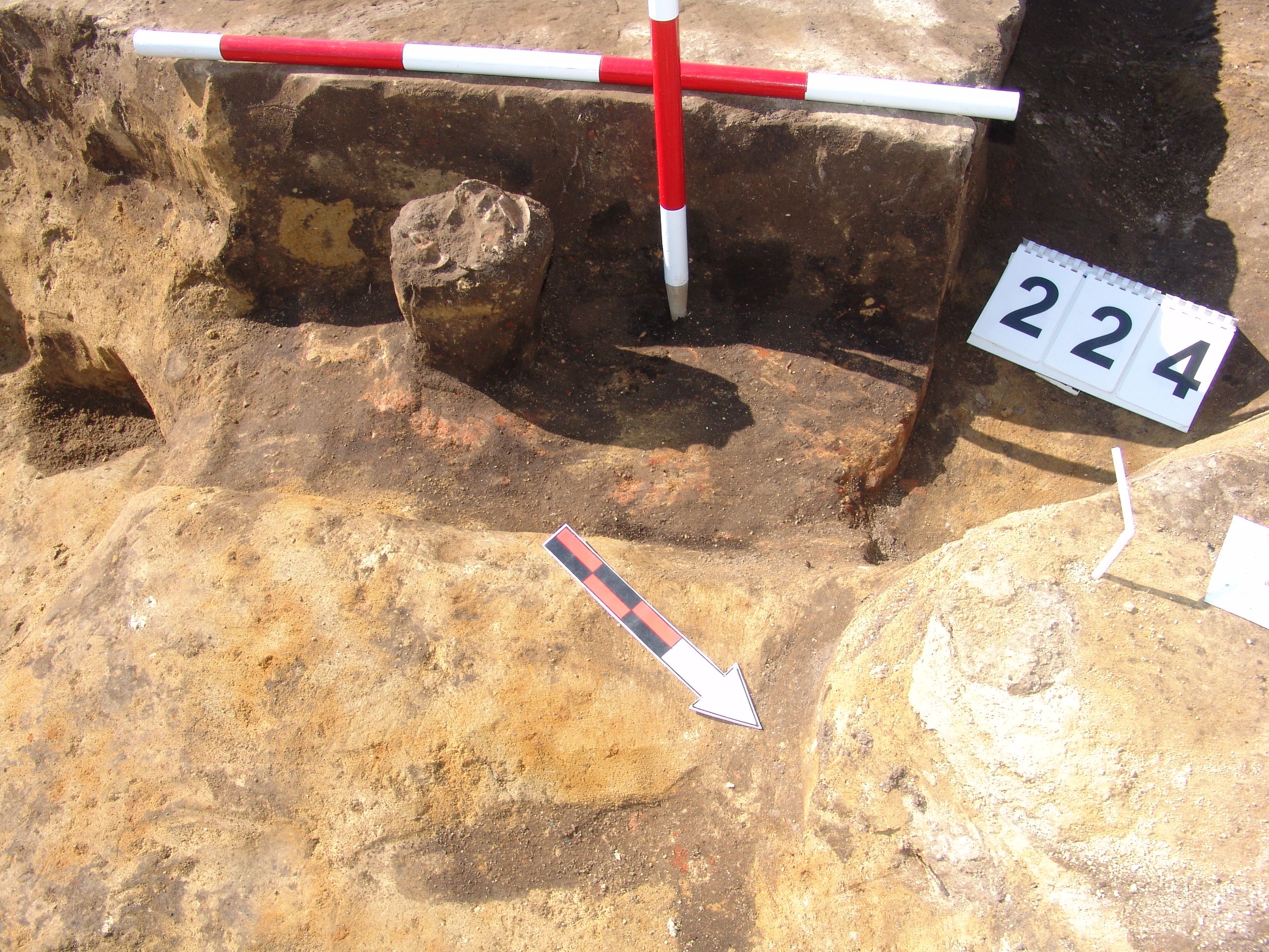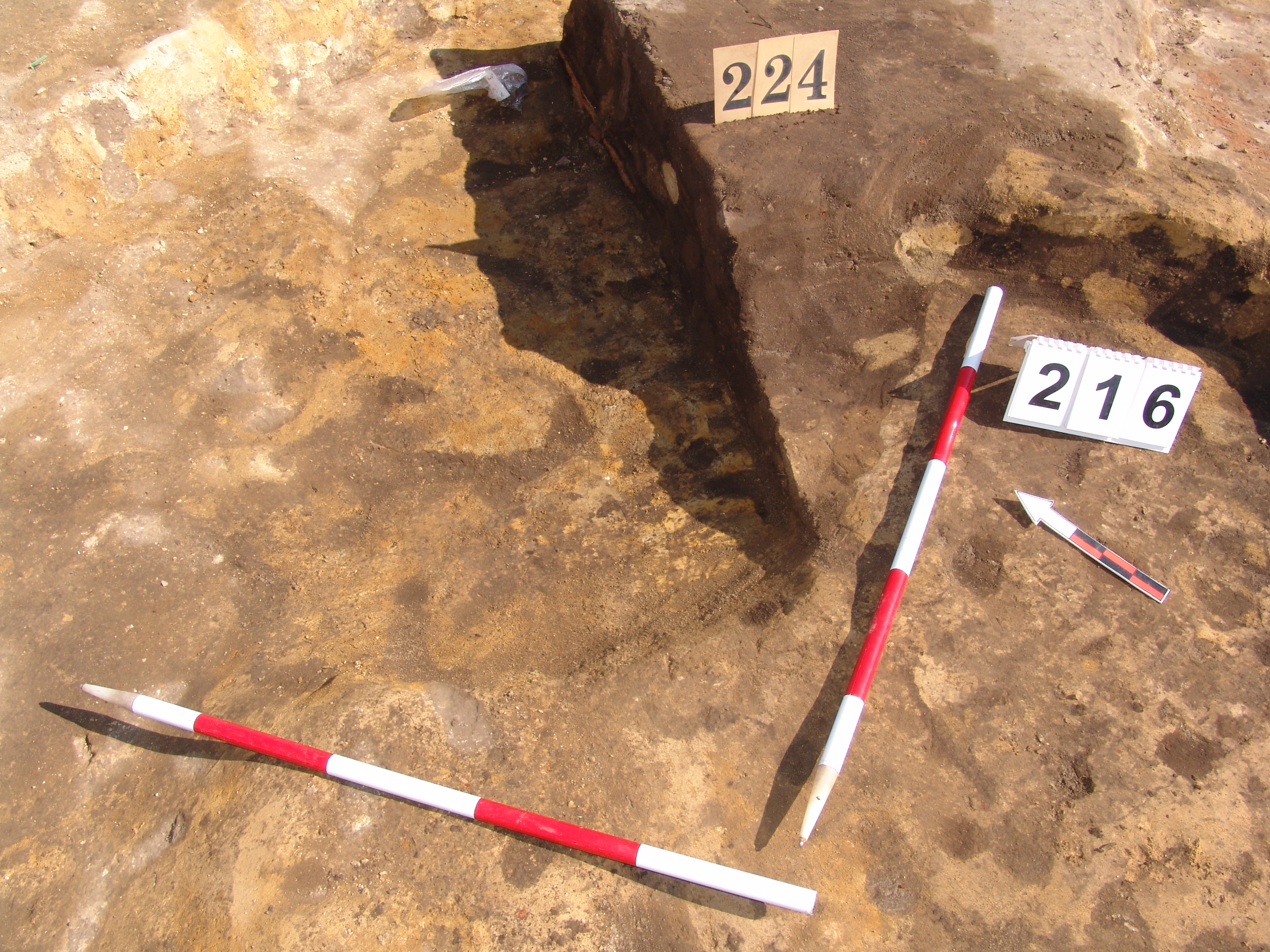 Az MNM NÖK által elkezdett, általunk 19 számot kapott objektumbokor közepe táján a meghagyott metszet É-i széle mellett egy kemence platnija kezdett rajzolódni, ez kapta a 224. számot. Felette a betöltés erősen sárga szemcsés sötét barnásszürke, csaknem fekete. A bontáskor a jelentkezési szint alatt 5 cm-re középen egy koponya és apró csontok /talán kisebb kutya ???/ csontjai egy kupacban. Alján 2 cm vastag tapasztás réteg, mely helyenként átégett. Fala K-ről egyenes. Végül egy szögletes bemélyedés lett a 216. objektum É-K-i sarkánál, alól az alján jön 2 db 1 cm fekete korom, ezen sárga 2-3 cm vastag tapasztás. Átm.: 80 cm. A 216. ház padlóját bontva egyértelmű, hogy abba beleástak. Nagyjából téglalap alaprajzú, kissé meredek falú bemélyedés lett belőle, kb. Ny-K-i irányban. M:200 Sz:120 Mélysége az egész 19 obj. jelentkezési szintjétől 30 cm. A kemence tapasztása az É-K-i végén volt. Átm.: 90 cm volt. /ebbe K-ről és É-ról kicsit belebontottunk./ A kormos réteg 3 cm vastag, melyre 2 cm vastag sárga tapasztás került. Ez keményre égett, helyenként vörös.