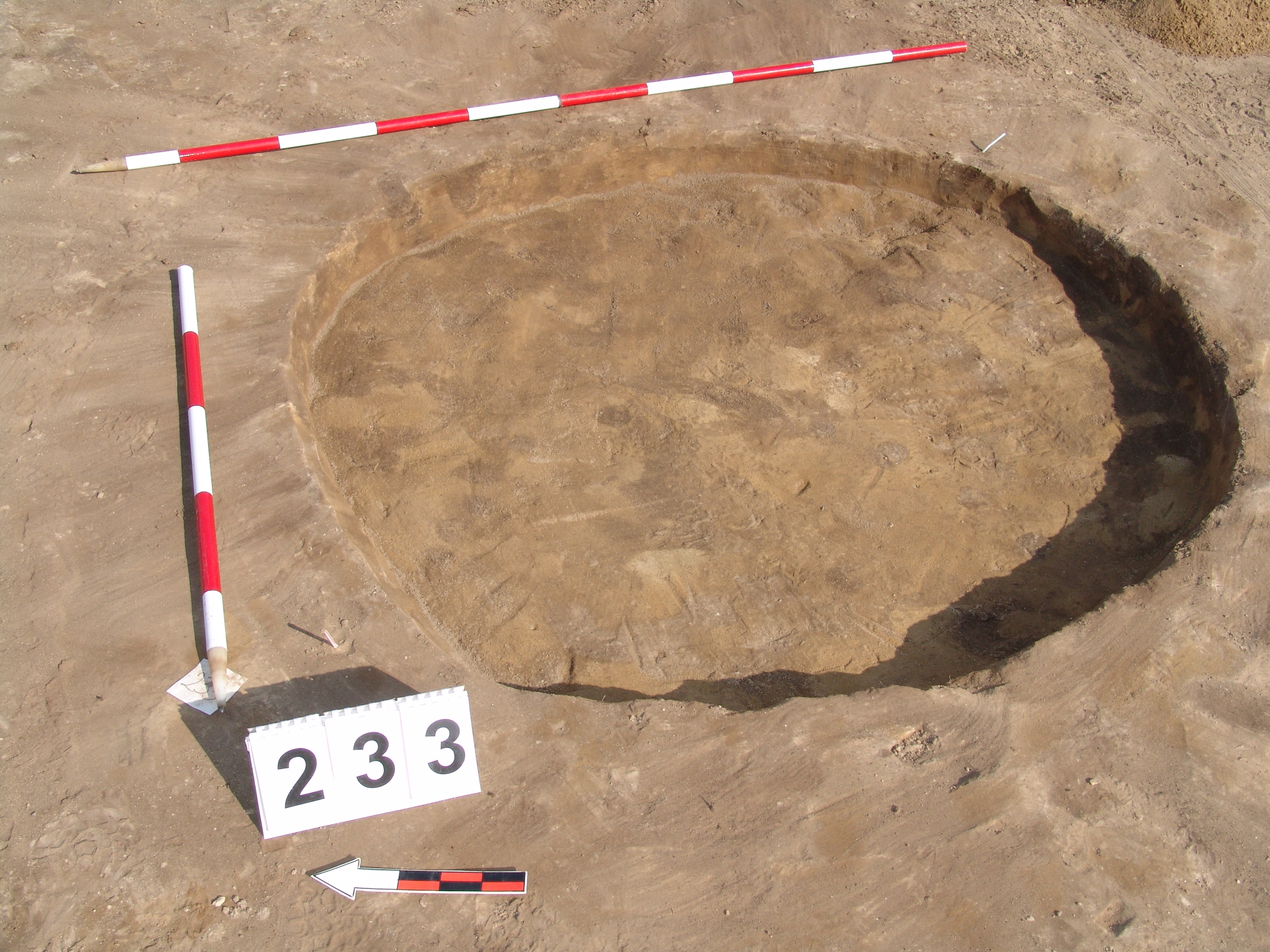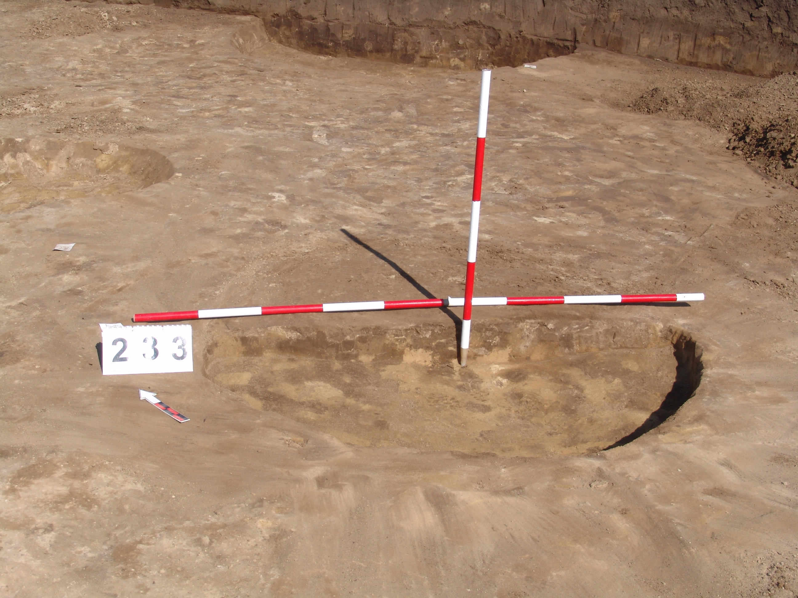 Enyhén méhkas alakú, kör alaprajzú, egyenes aljú gödör.
