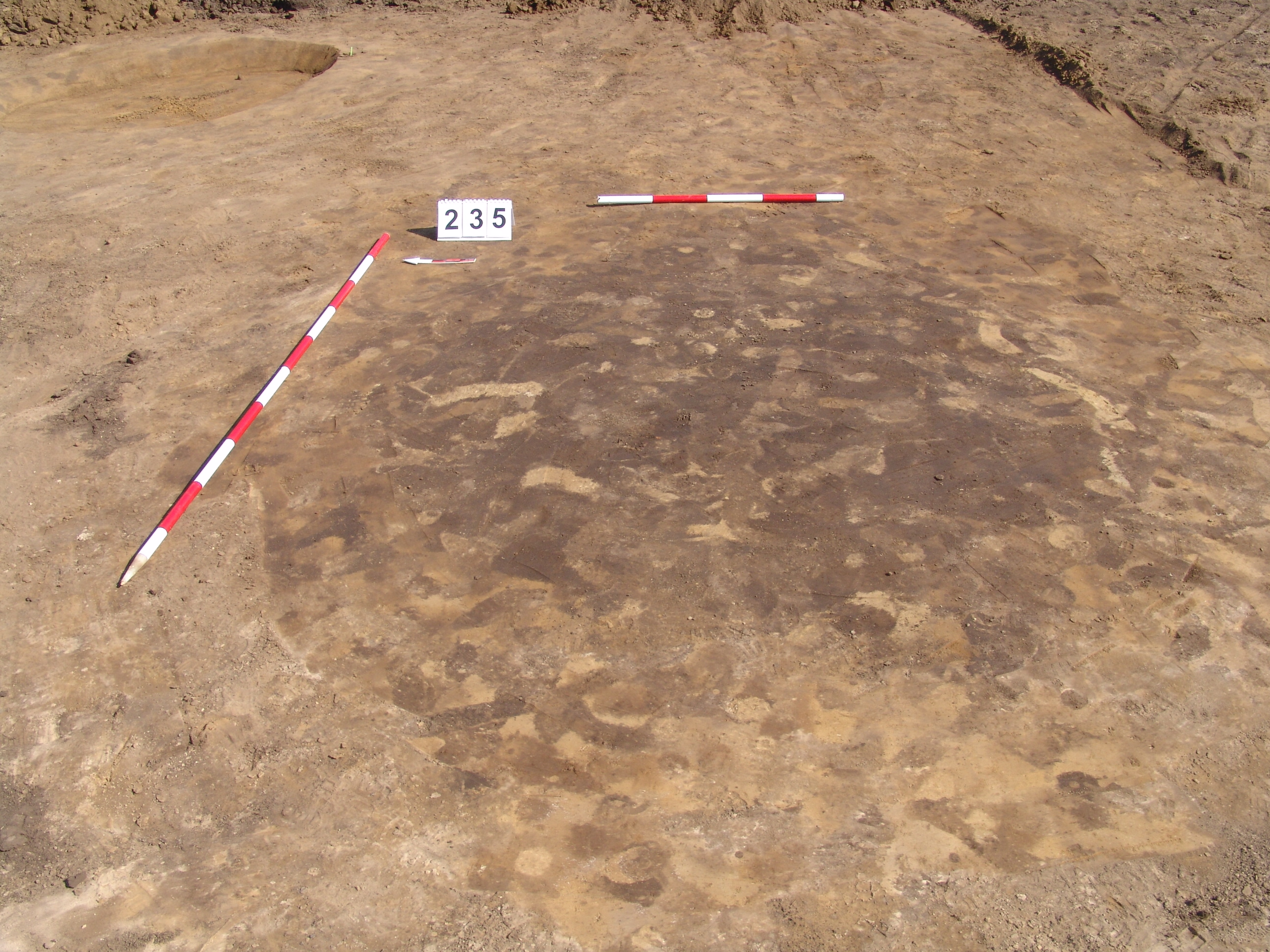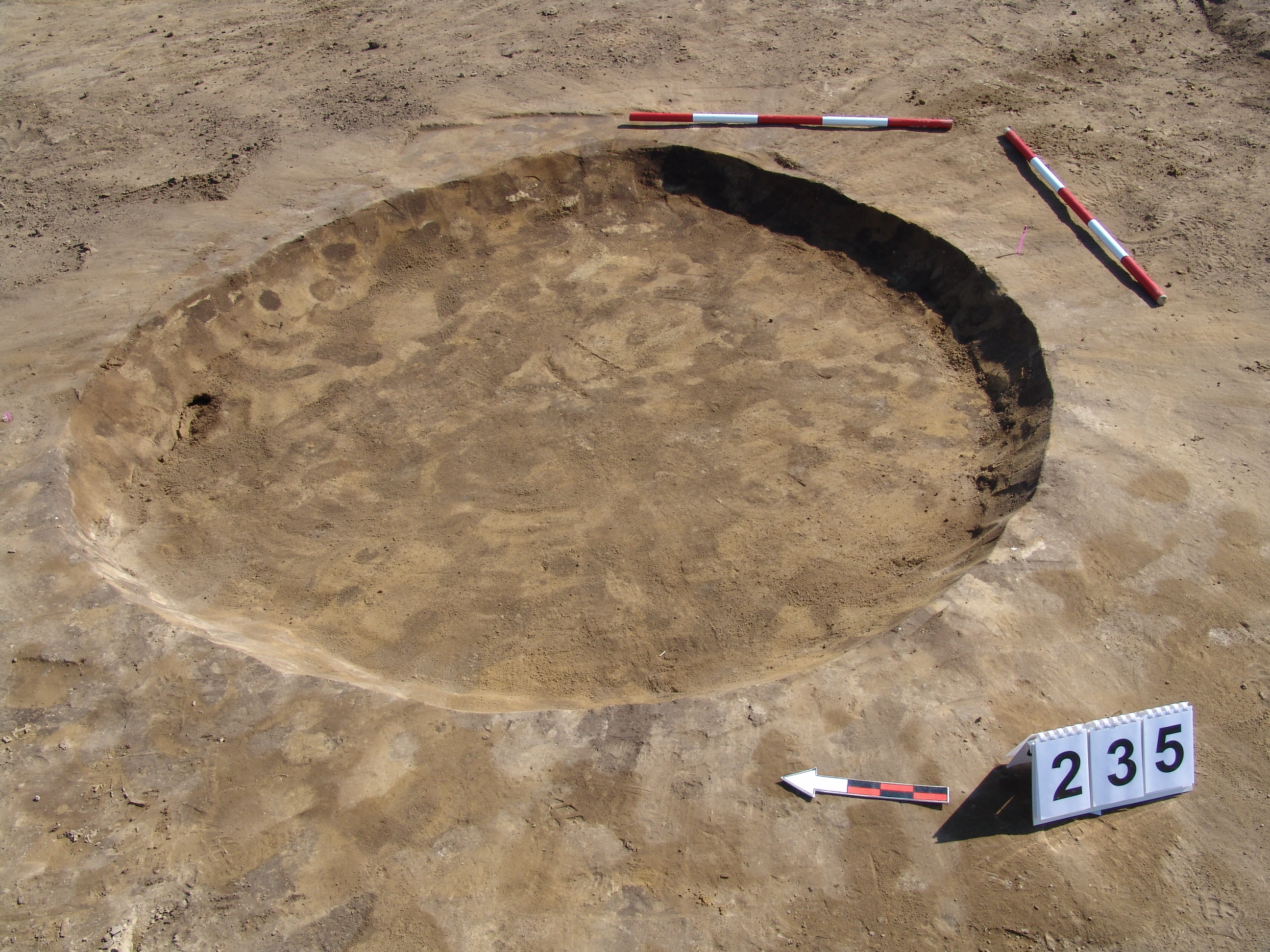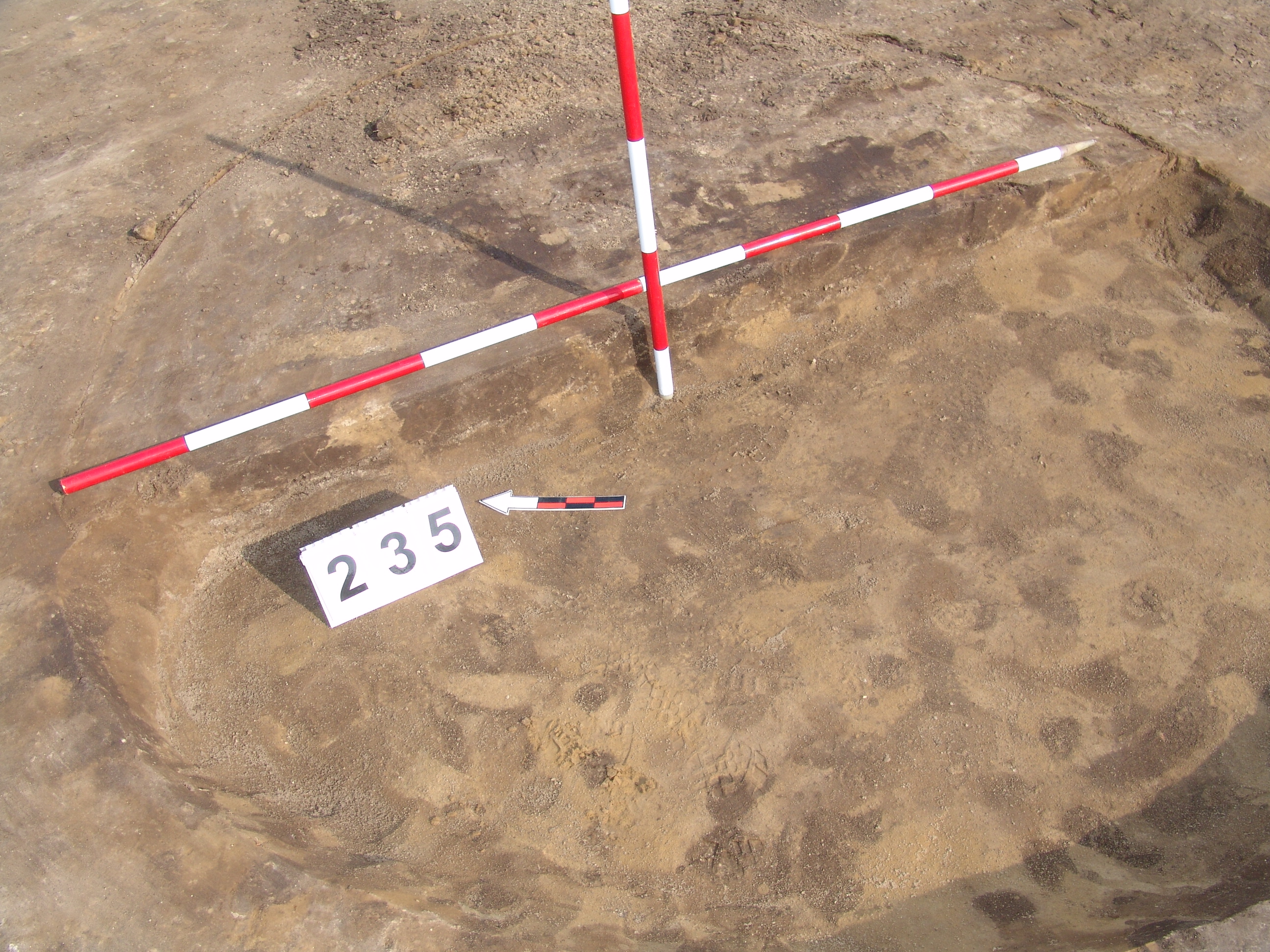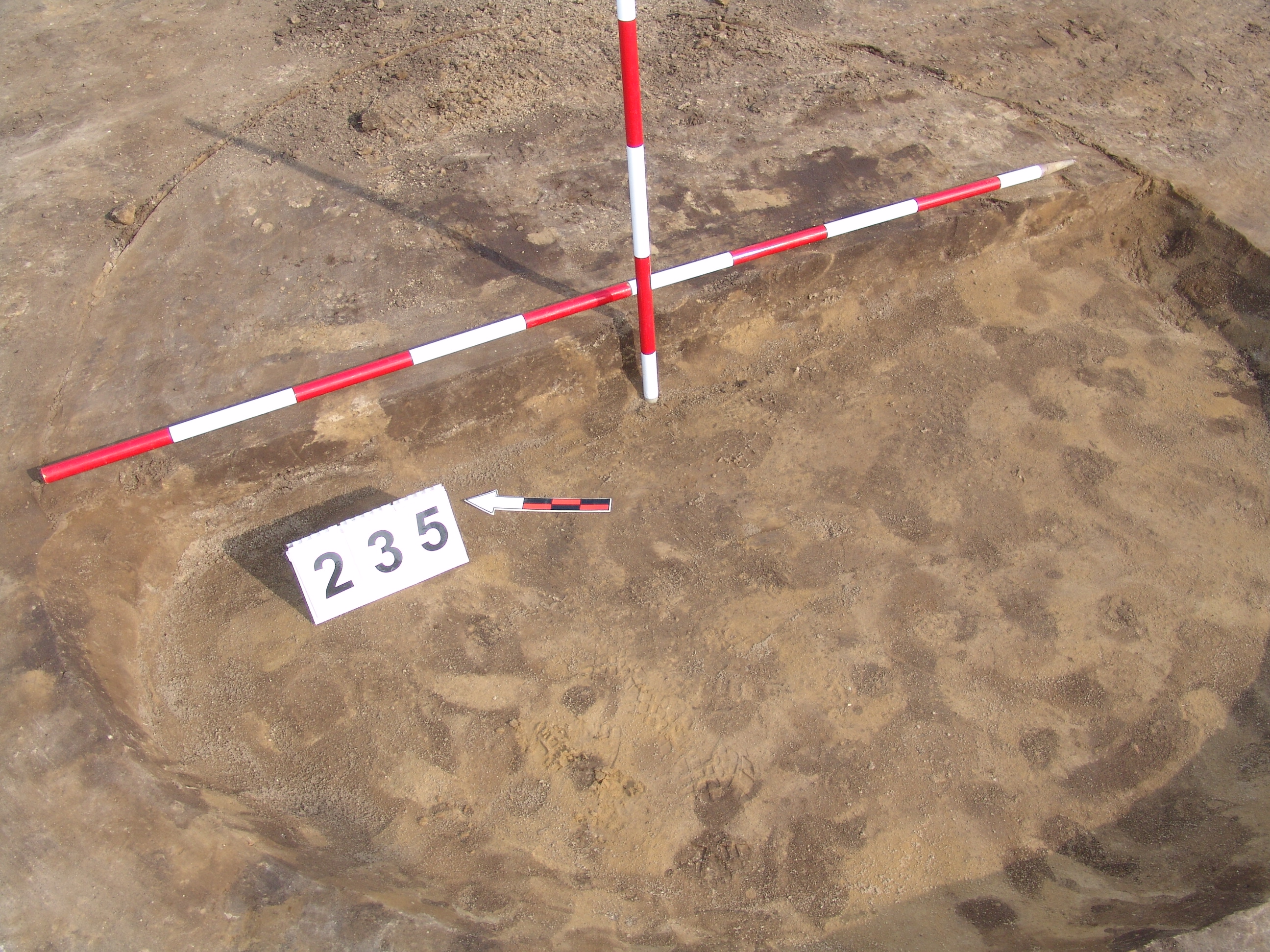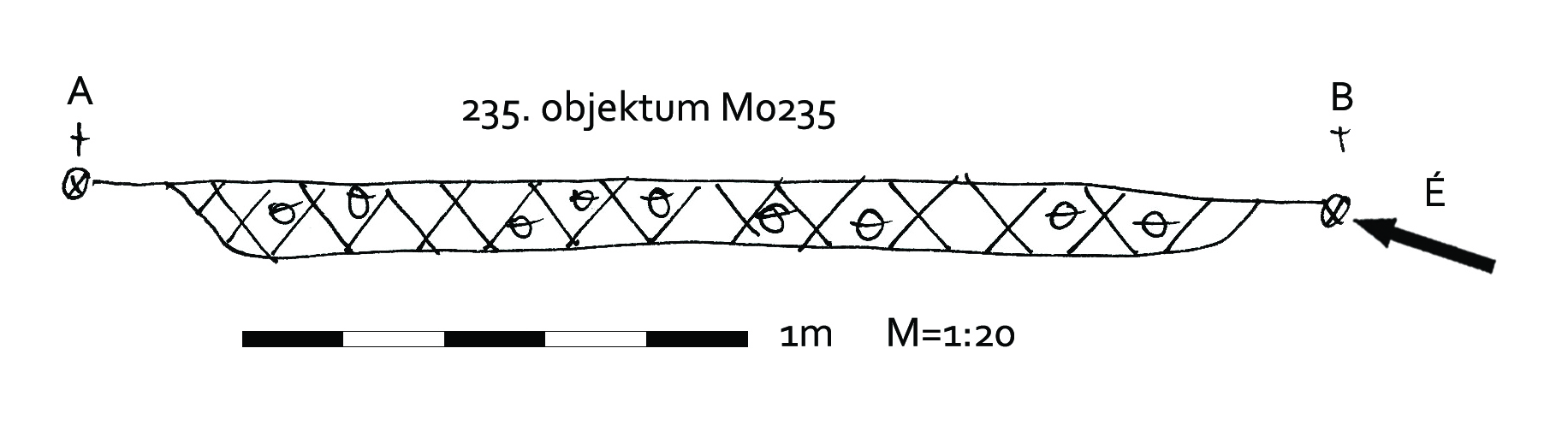 A 234-től D-re kb. 5 cm-re jól rajzolódó kerek folttal jelentkezett. A szélén körben túlbontott. Fala függőleges, alja egyenes.