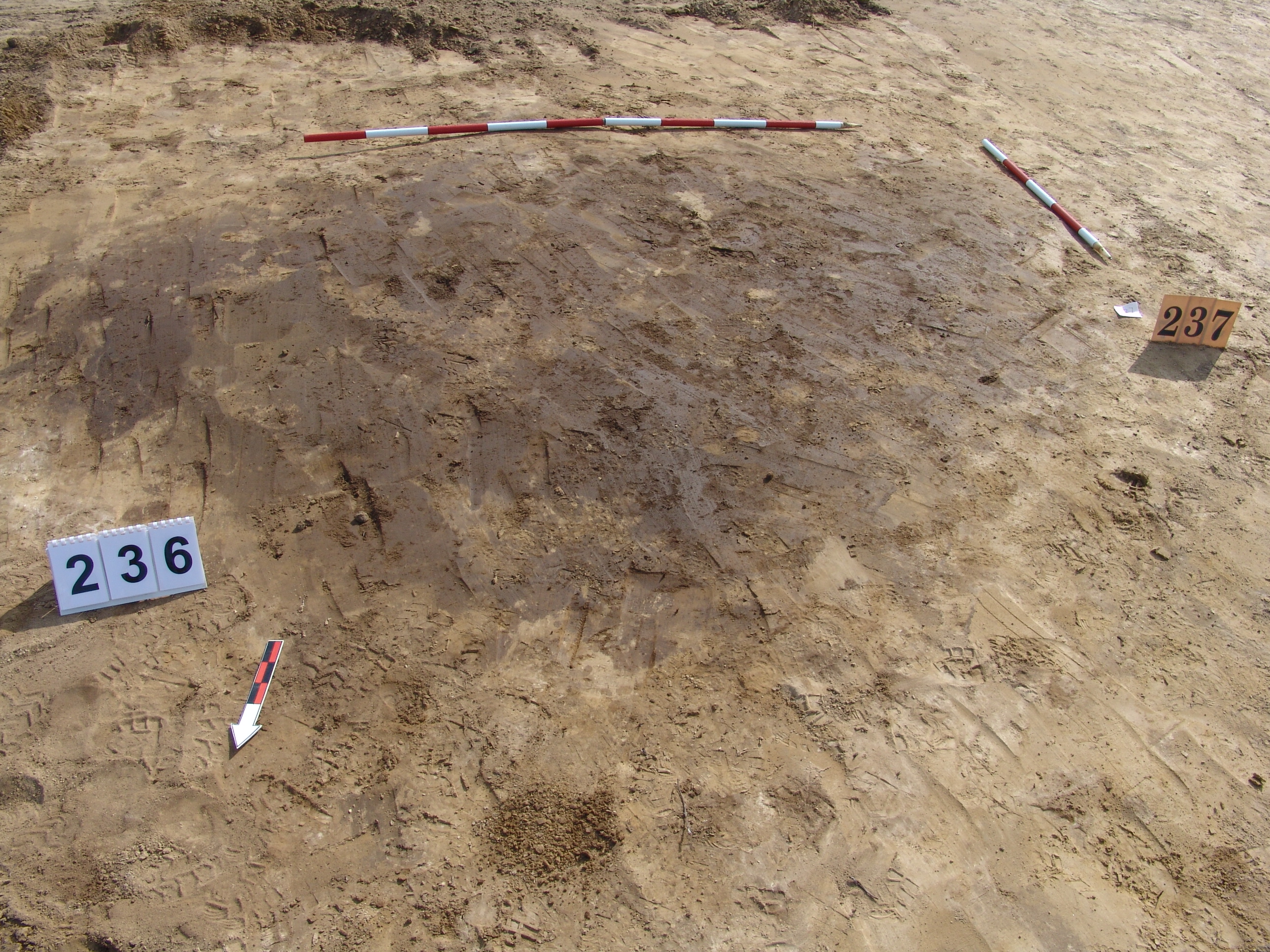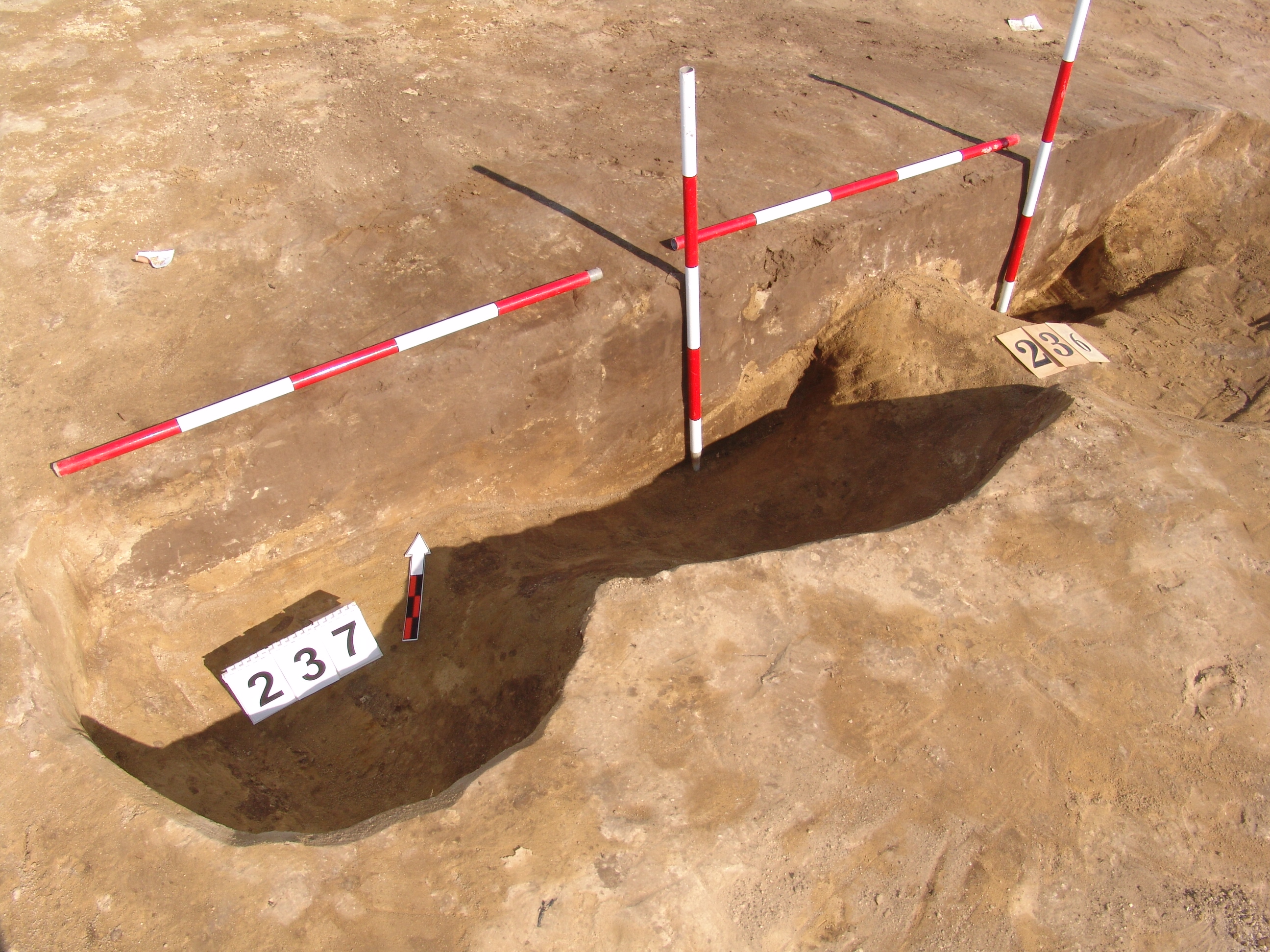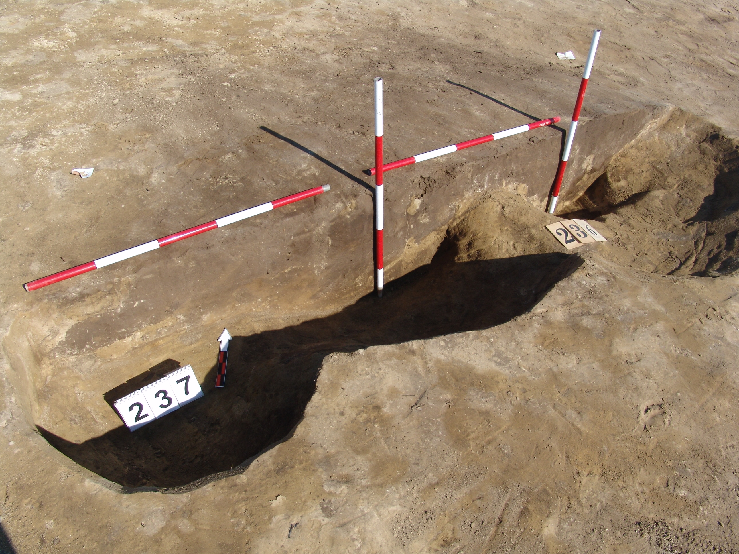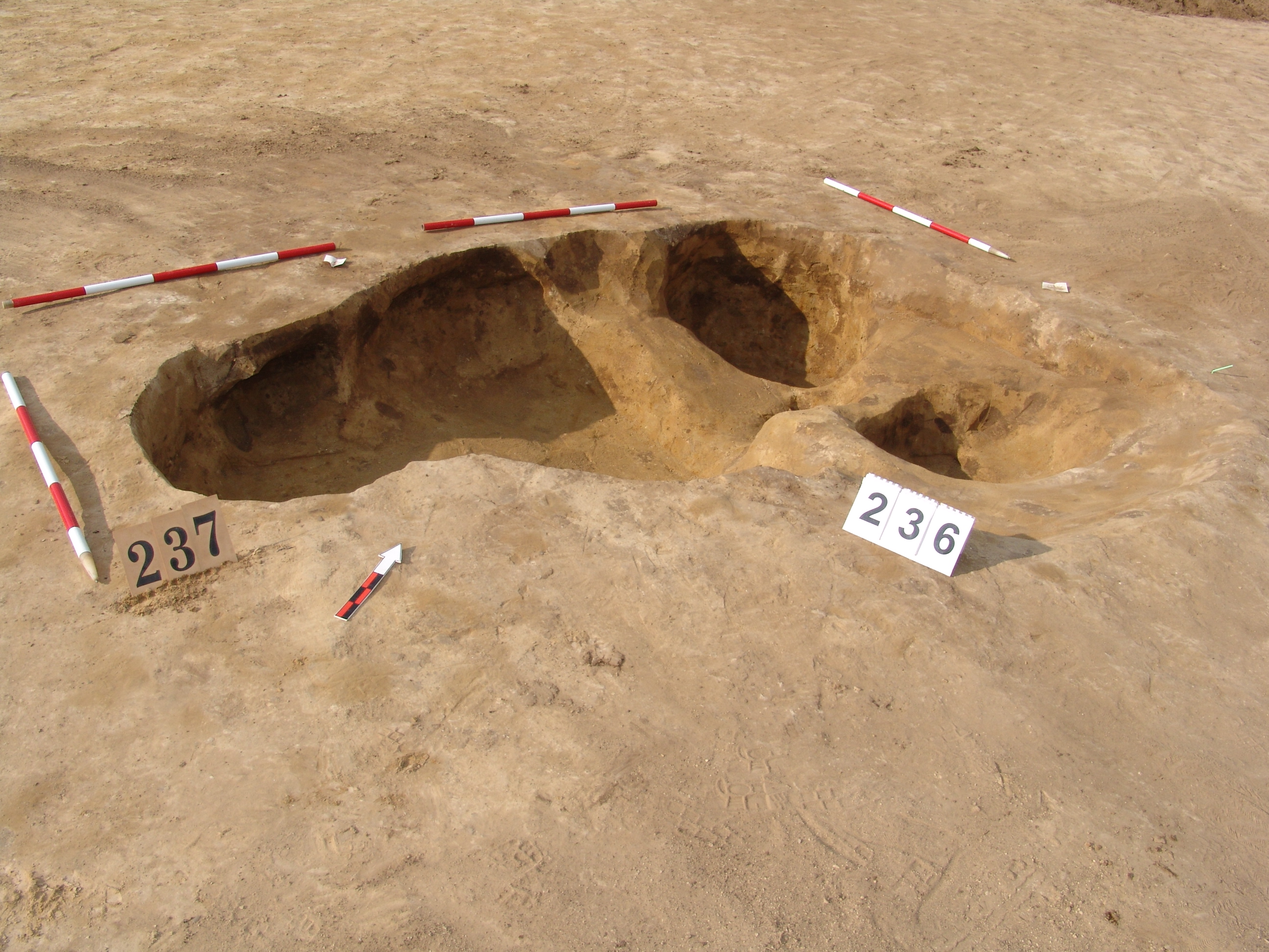 A kettős gödör Ny-DNy-i tagja. Feltehetőleg a 236 vágta. Elúszó, halványabb kerek folttal jelentkezett. Kis alaprajzú, méhkas alakú, sárga-sötétbarna réteges betöltésű gödör a 236 objektum Ny-i fele alatt.