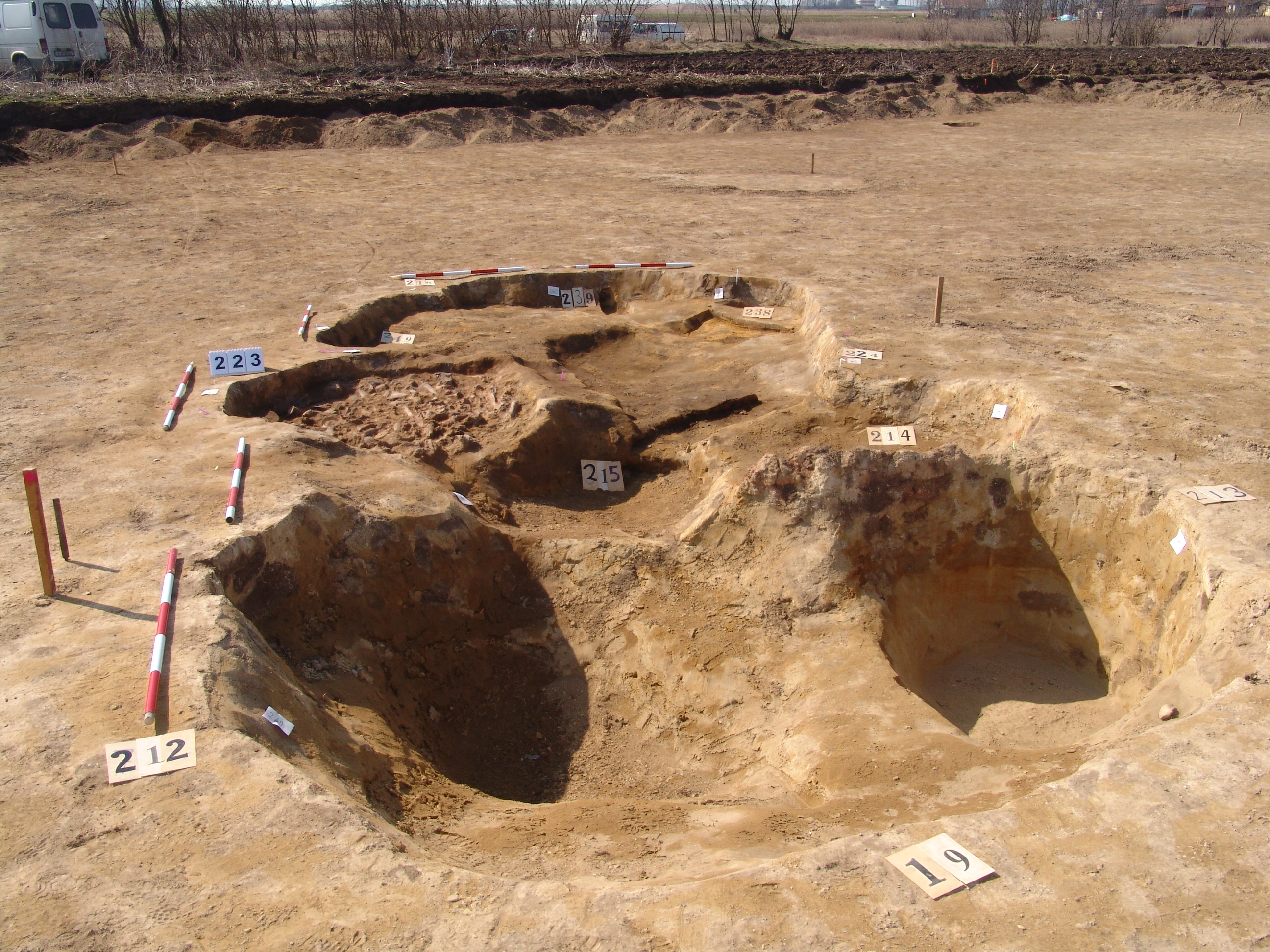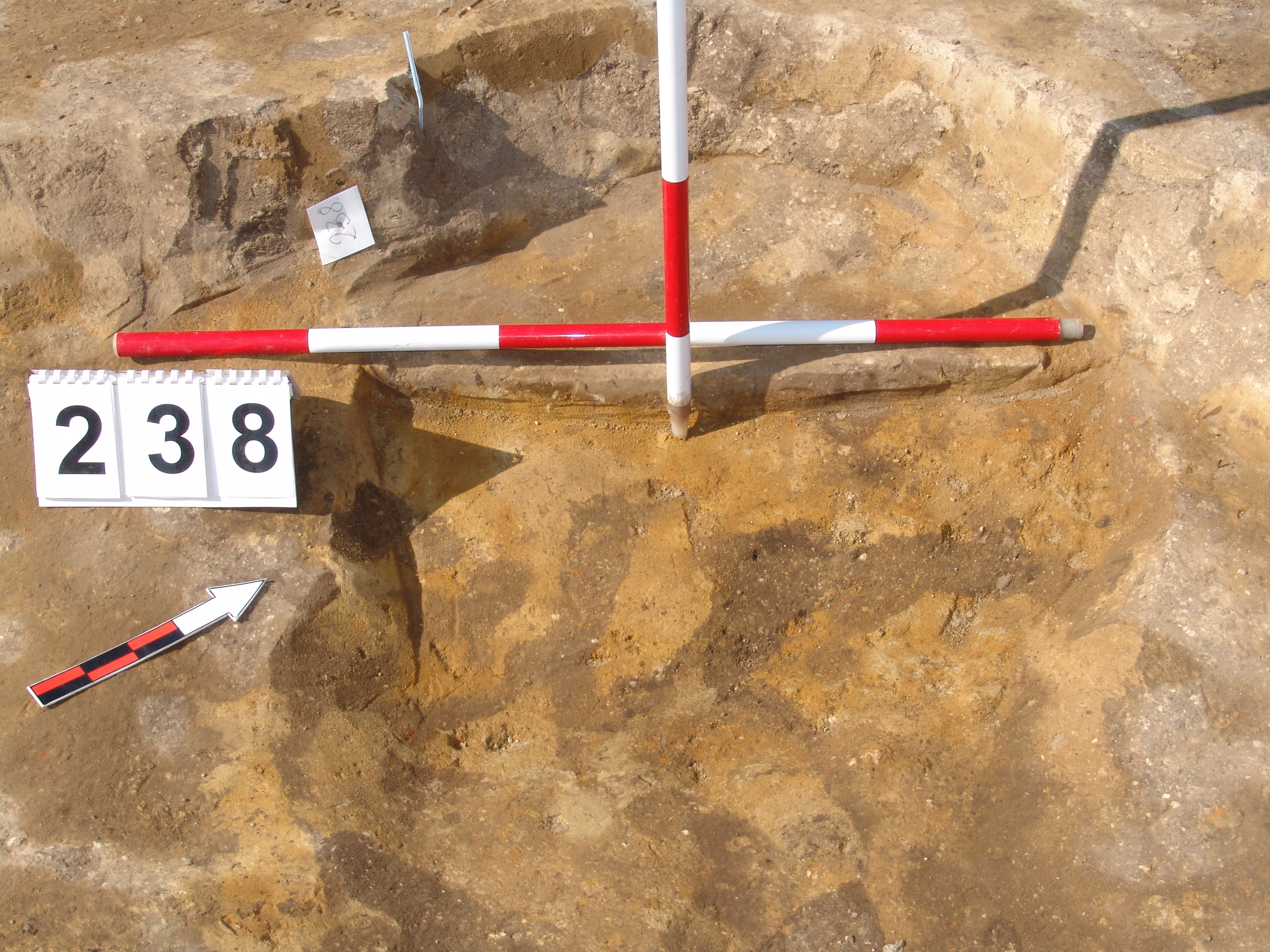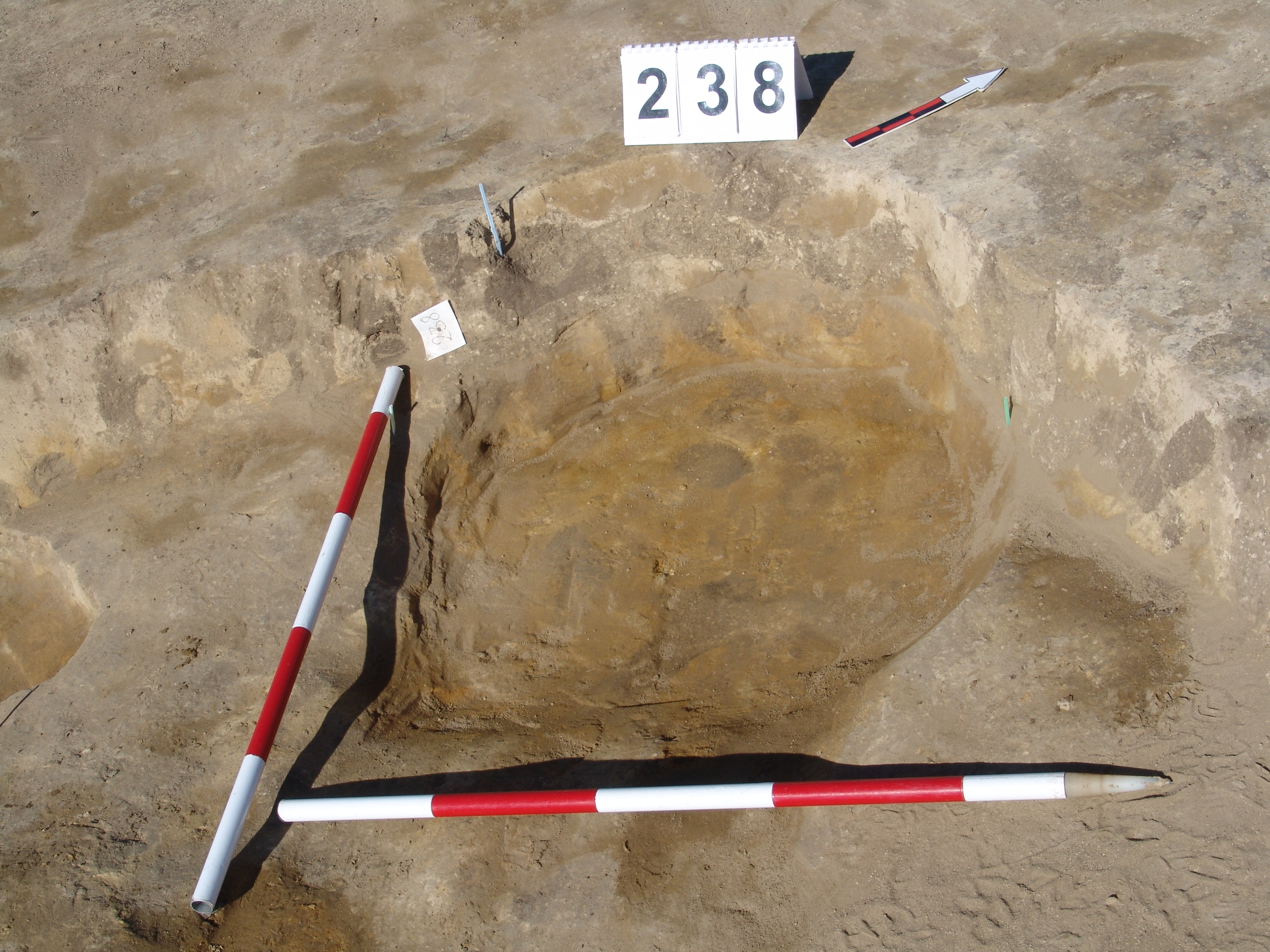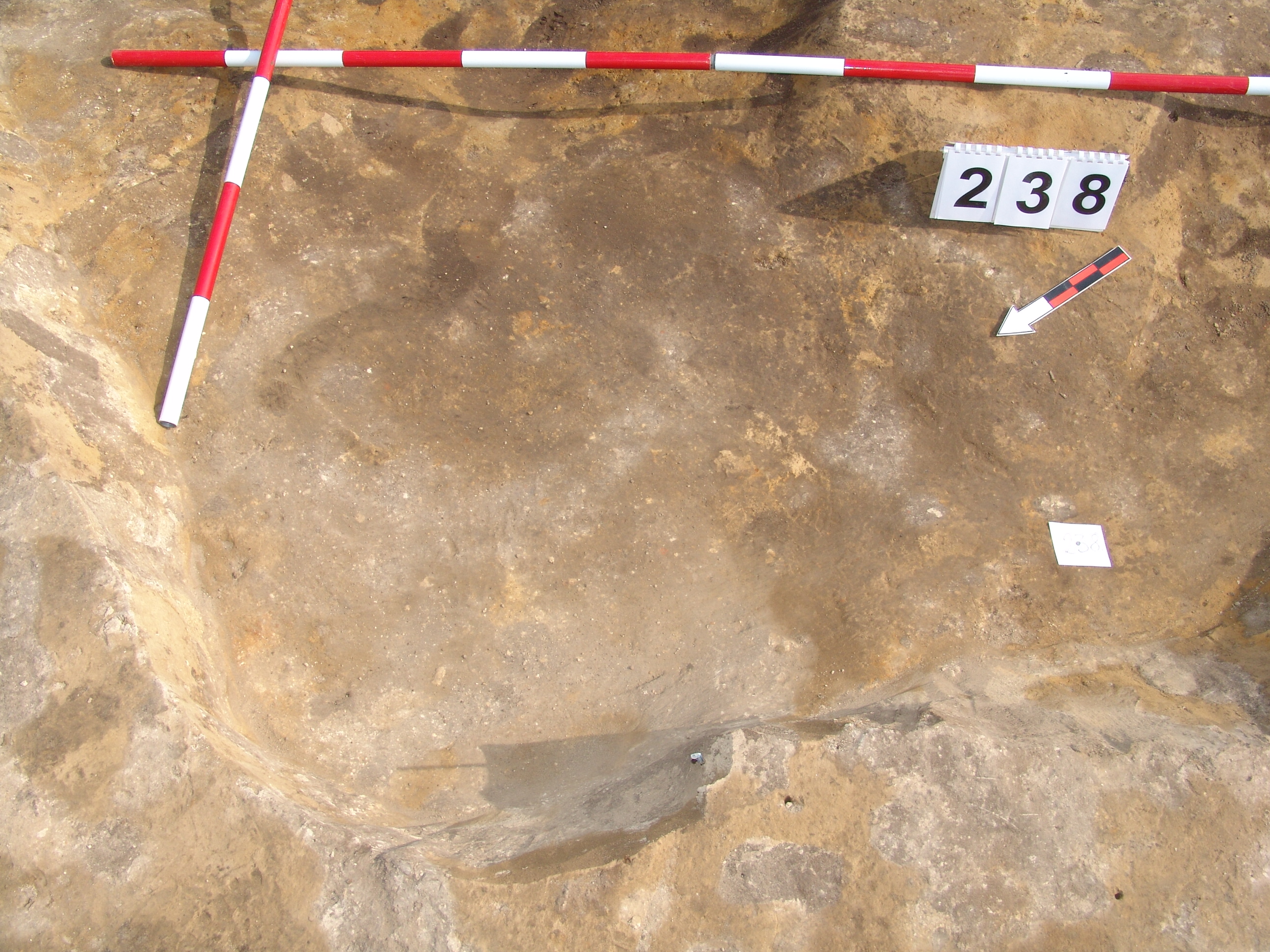 A 216 objektum ÉNy-i sarka alatt kerek folttal jelentkezett a padló horolásakor. Sekély kör alakú bemélyedés. Átmérő: 78 cm Fala meredek, alja egyenes. Betöltése: sötét barnásszürke, egynemű Kapcsolósó objektum: 216