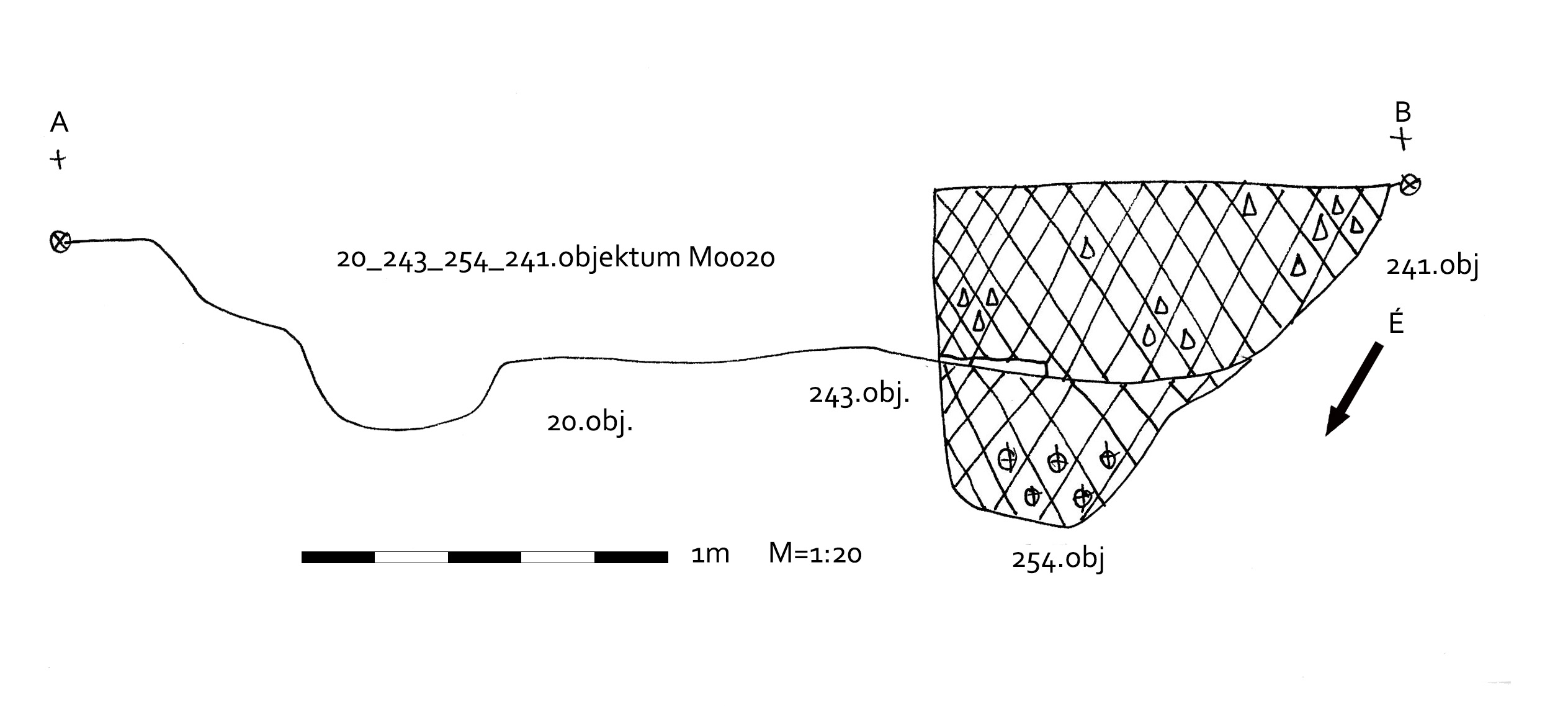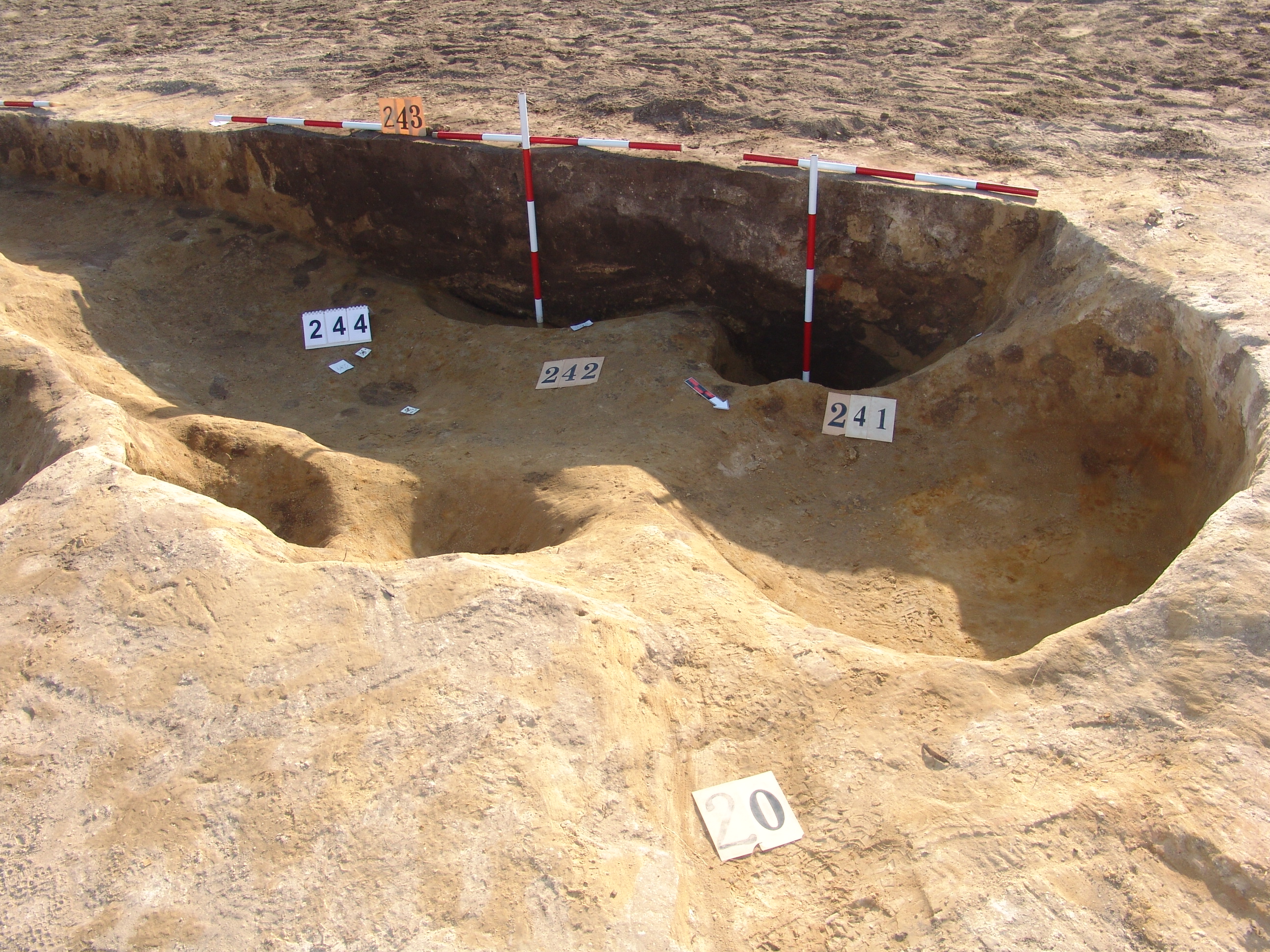 Az MNM-NÖK által elkezdett objektum komplexum, melyet 20. számmal jelöltünk, metszetfalának É-i végénél jelentkezett egy meredek falú gödörrész. A NÖK 50. strat. száma. A metszet alapján vágta a 243. házat.