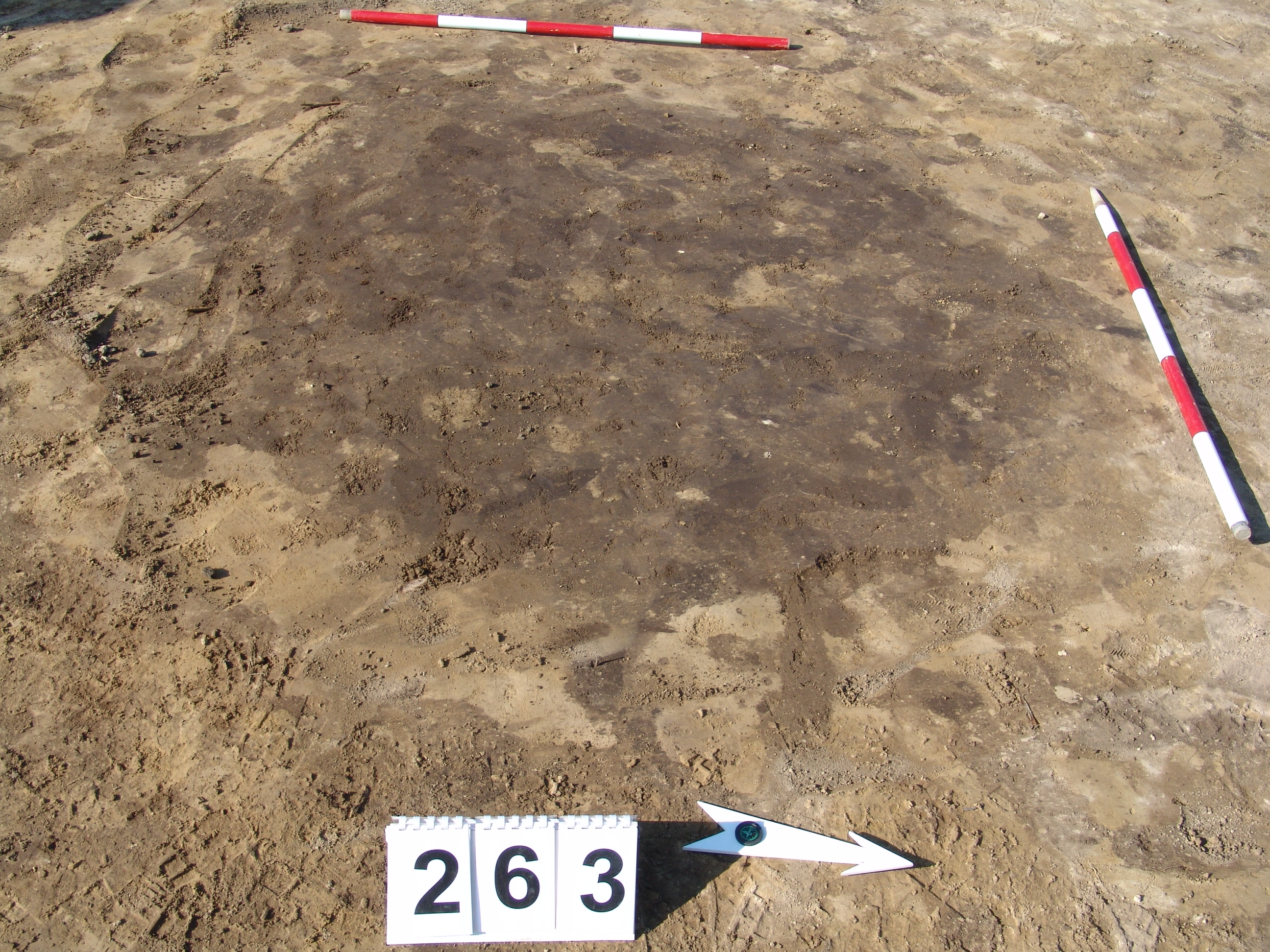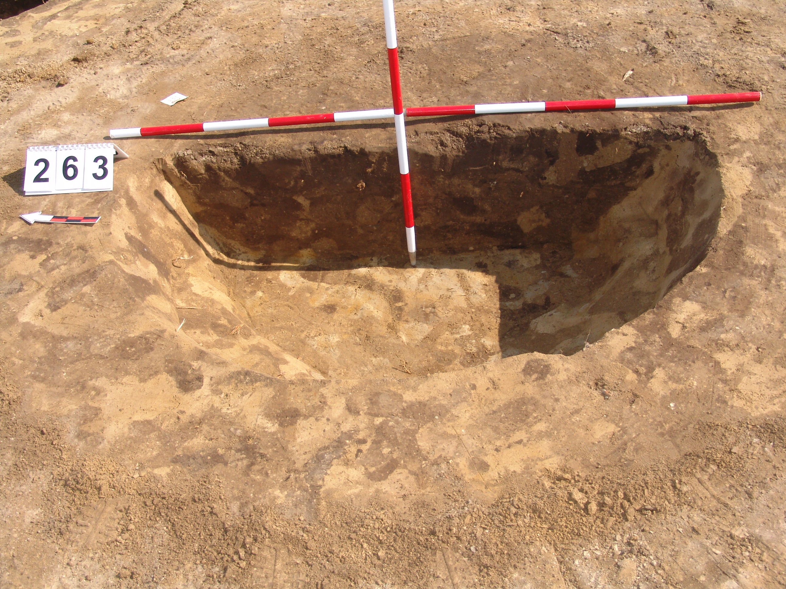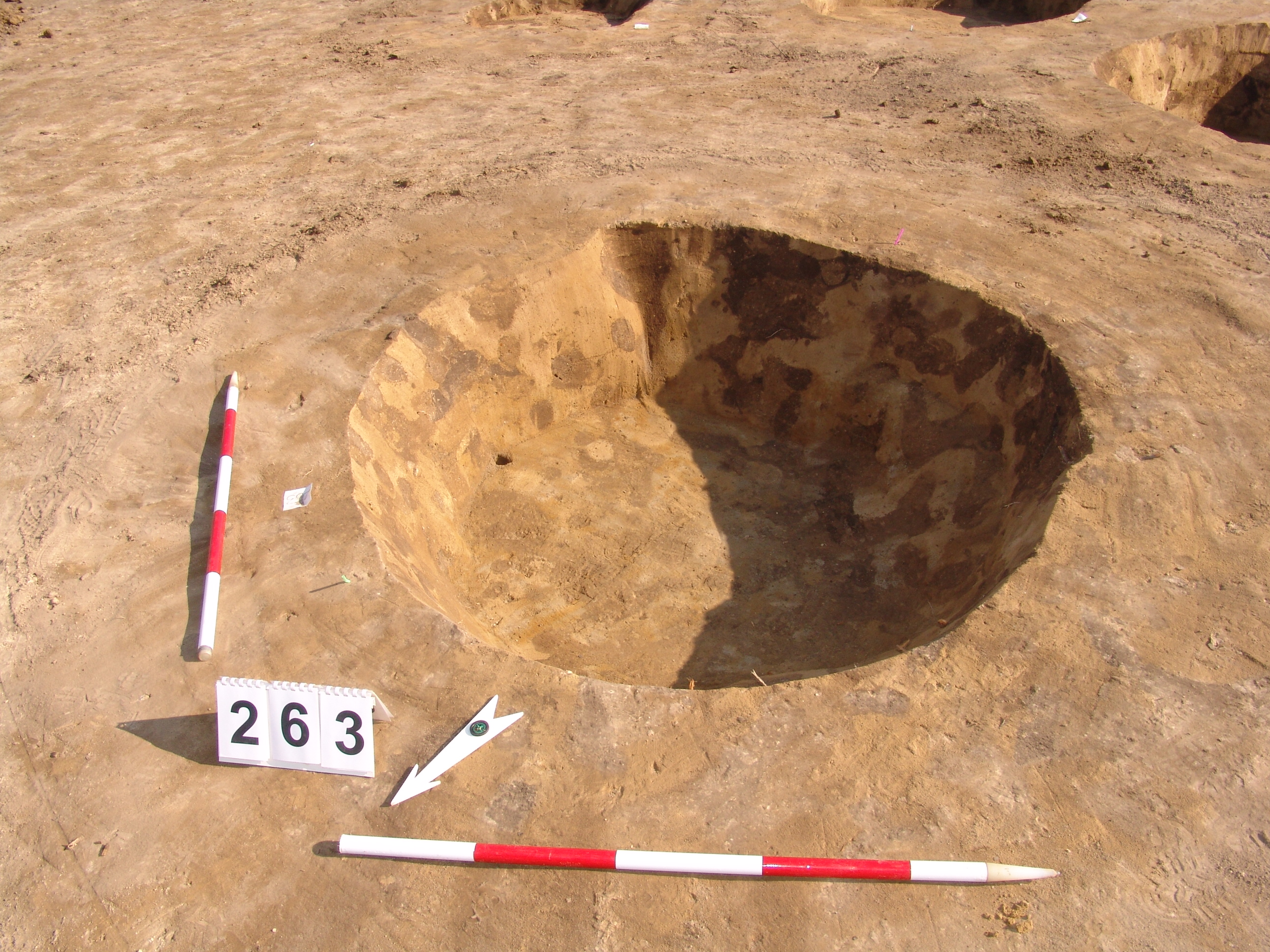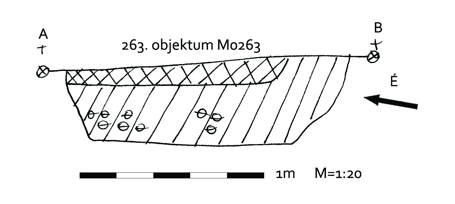 A 260. obj.-tól DDNy-ra kerek, jól rajzolódó folttal jelentkező gödör. Íves falú, egyenes aljú, kör alaprajzú gödör. Betöltése felül egy kb. 15 cm-es rétegek, egynemű barnásszürke, alatta sárga szemcsés sötétbarna.