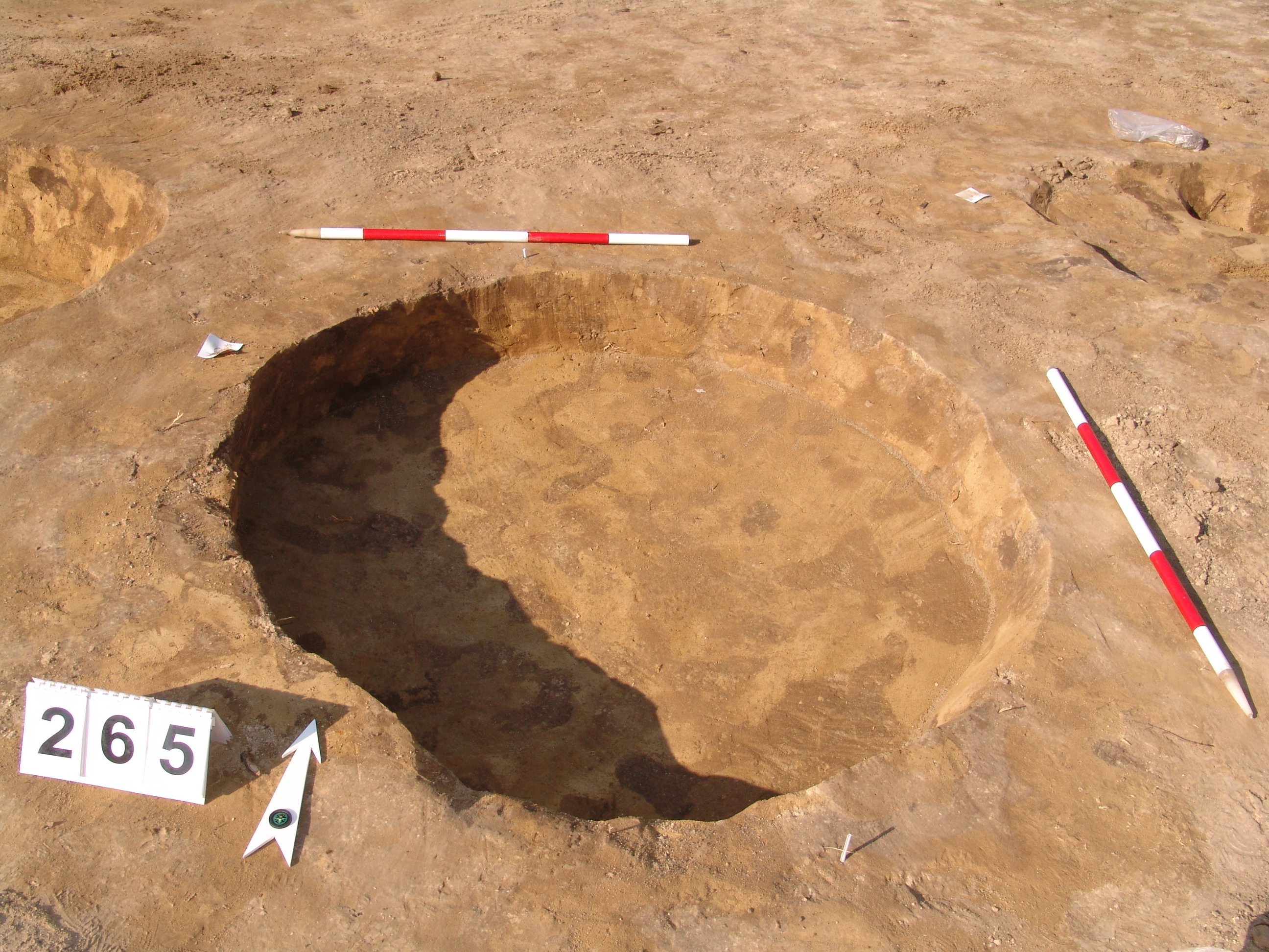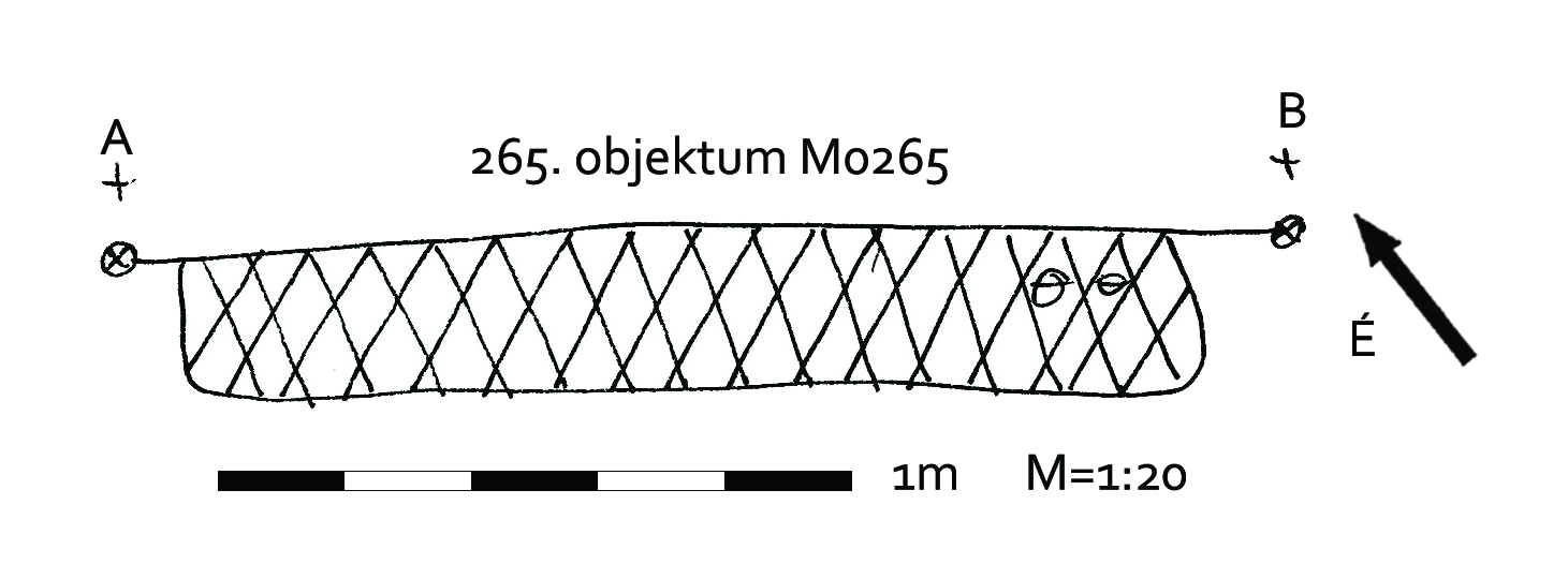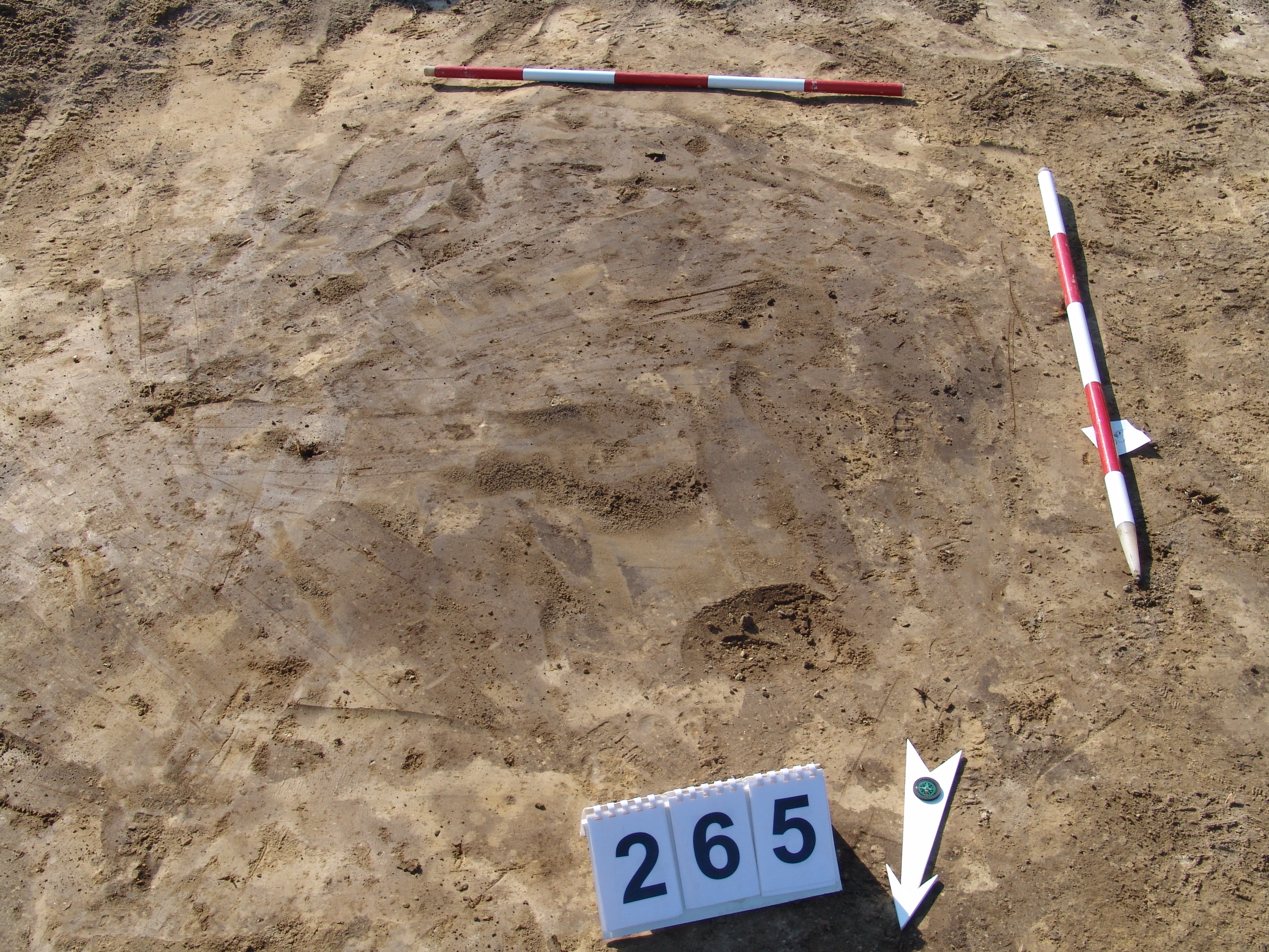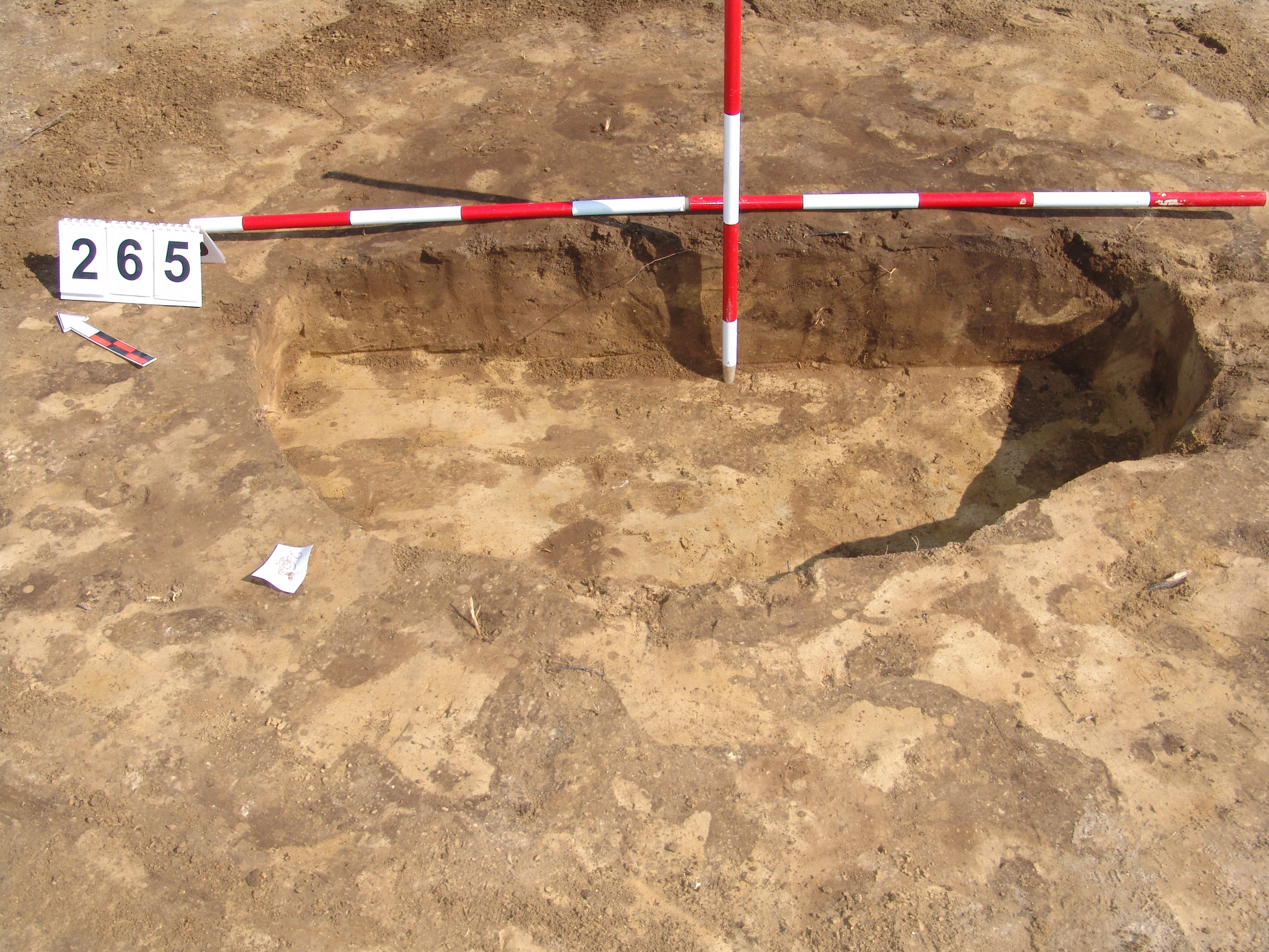 A 263. obj.-tól DDNy-ra kerek, jól rajzolódó folttal jelentkezett. Méhkas alakú, egyenes aljú, kör alaprajzú gödör. Betöltése egynemű barnásszürke, enyhén szemcsés állatjáratos. Átm. Fent:É-D:155 Ny-K:140 lent:É-D:165 Ny-K:155 M:22-30