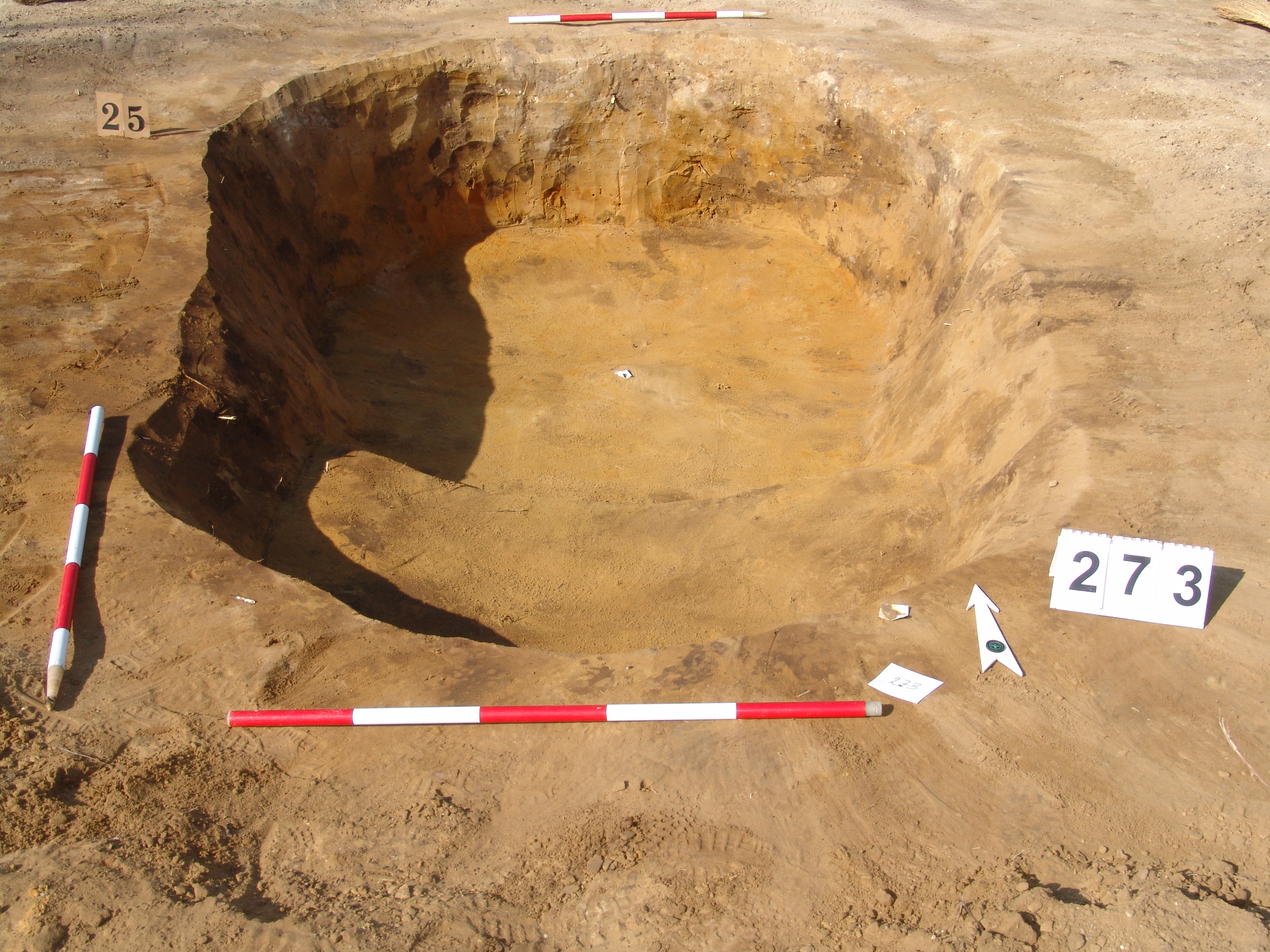 A 25. (NÖK által bontott) objektum kettős gödör lett. A D-i oldalnak így kiadtunk egy számot. Ez a 273. Elvben teljesen ki volt bontva, de találtunk benne leletet. Meredek falú, egyenes aljú gödör.