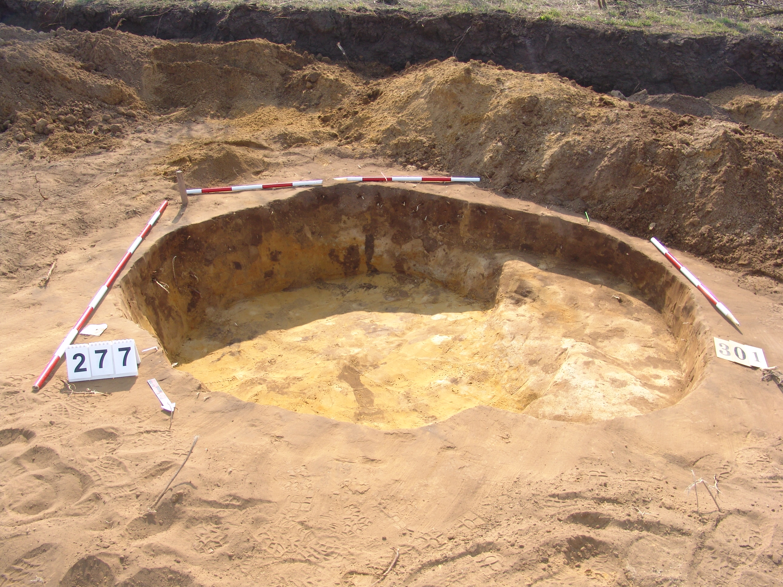 Fala kicsit méhkasos, egyenes aljú, kör alaprajzú gödör.