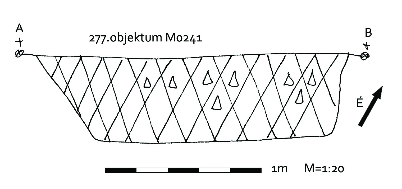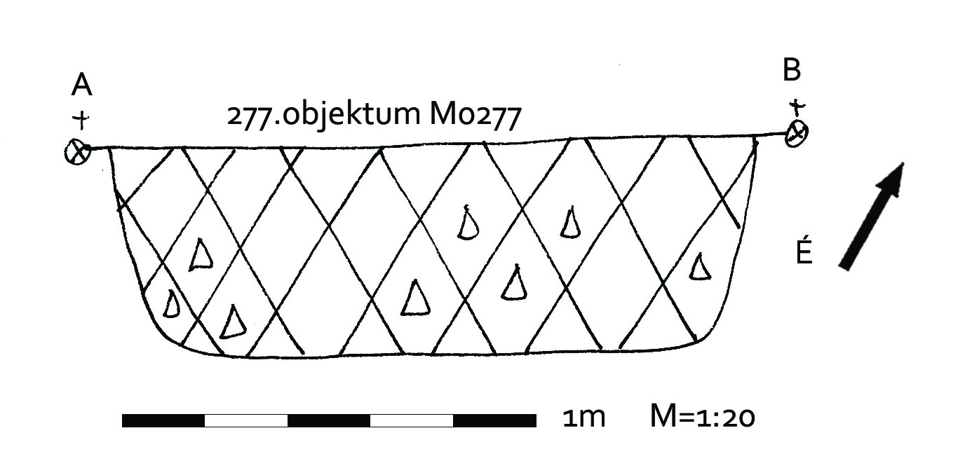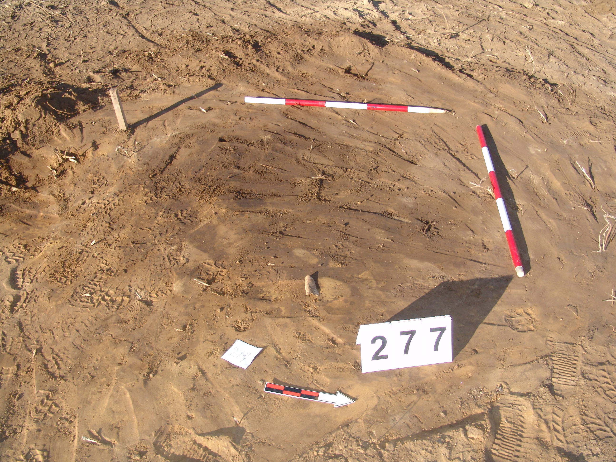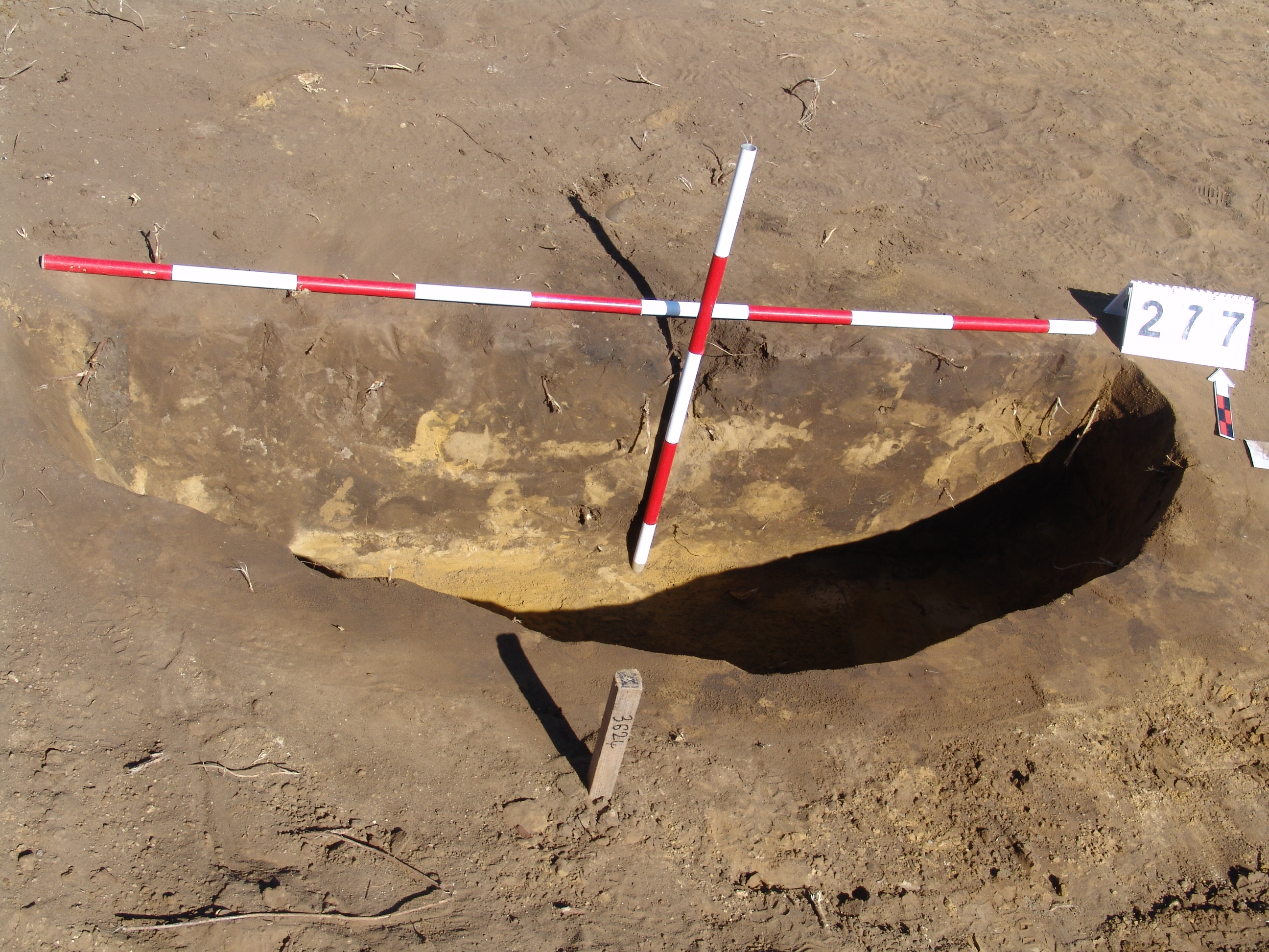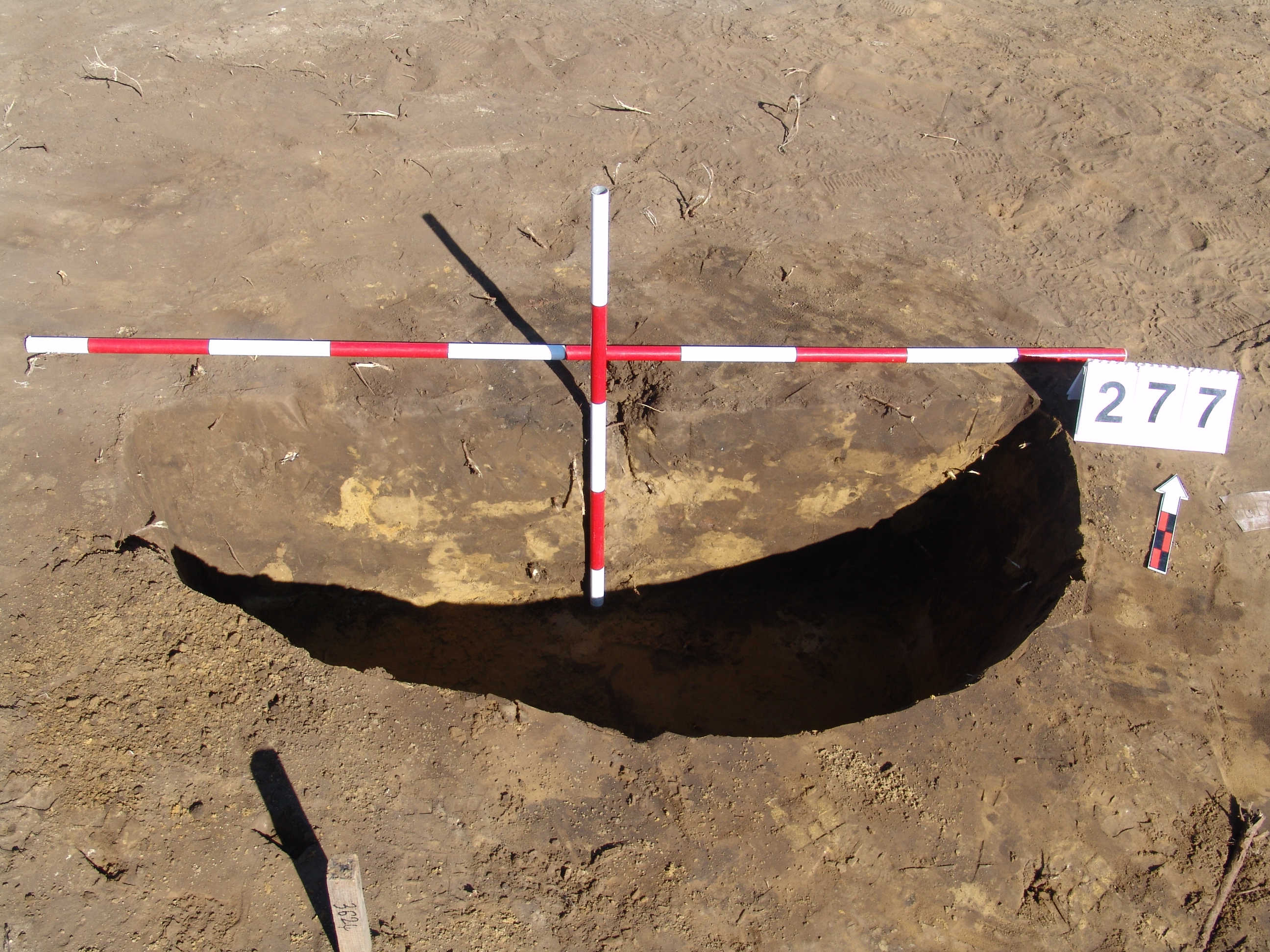 Megközelítőleg kerek, szürkésbarna felületű folttal jelentkezett. A 276. gödörtől D-re található kb. 3 méterre.
