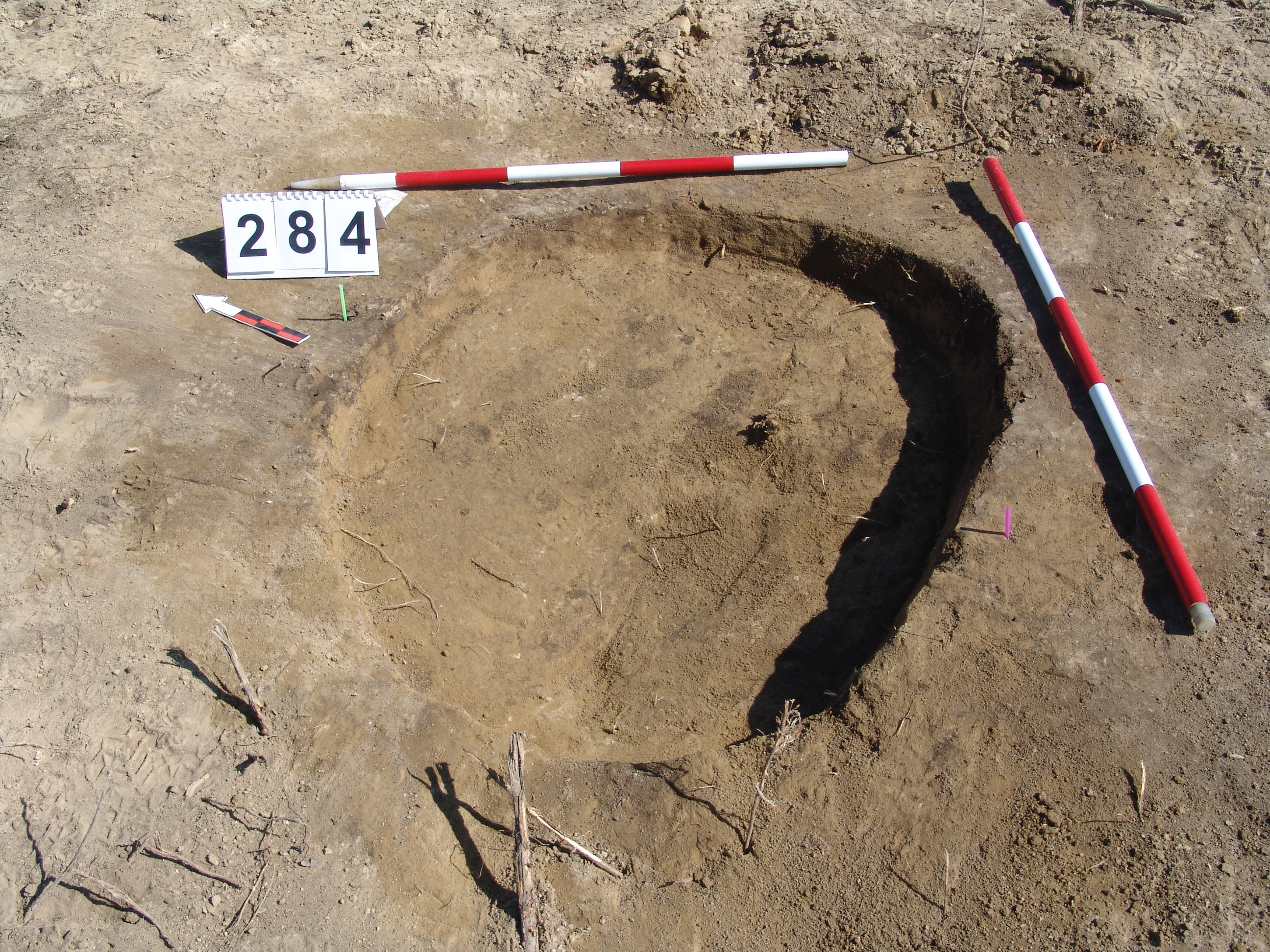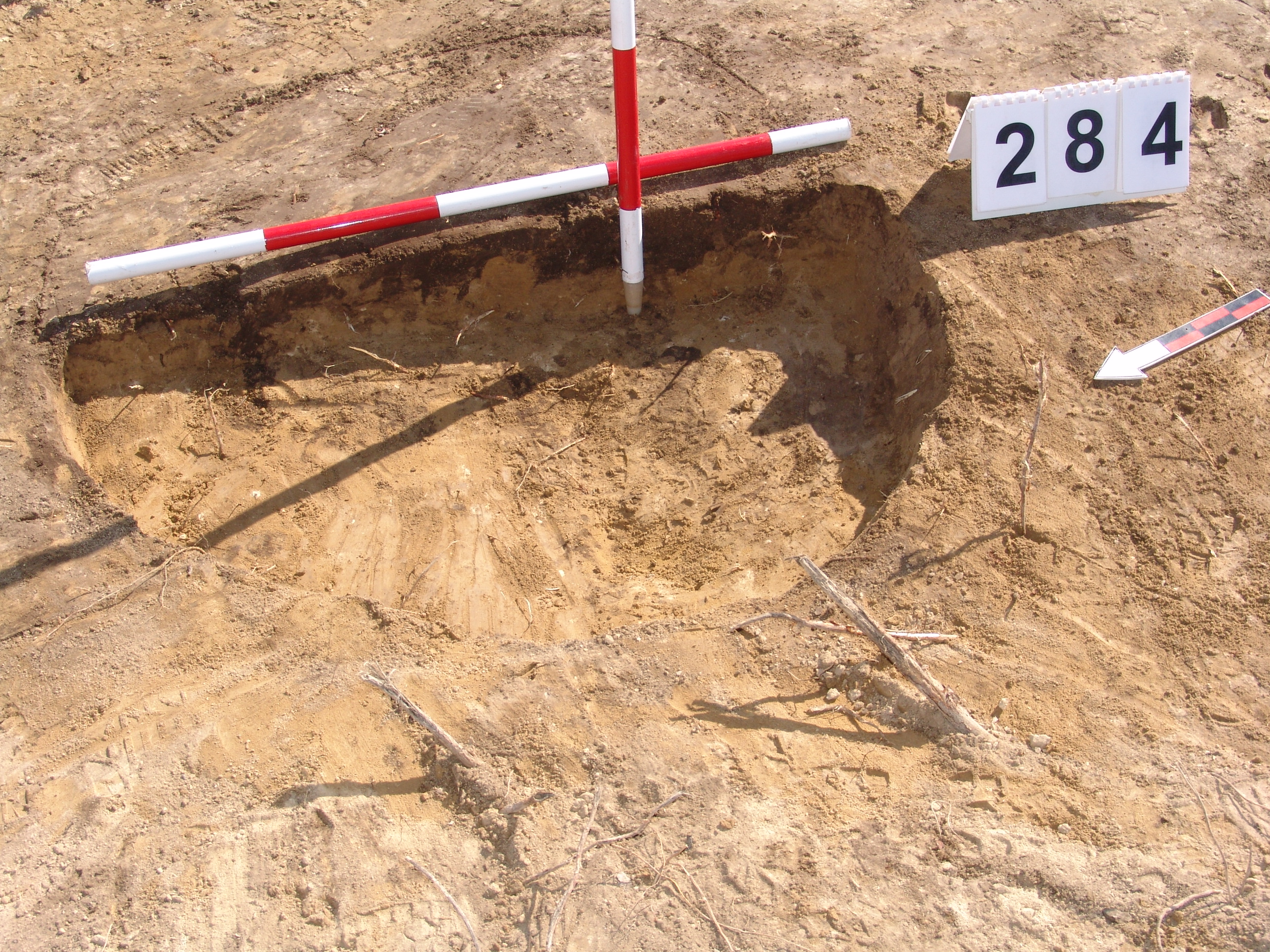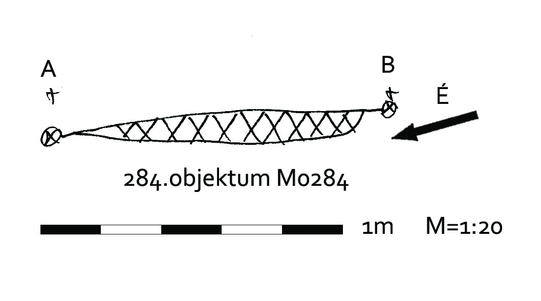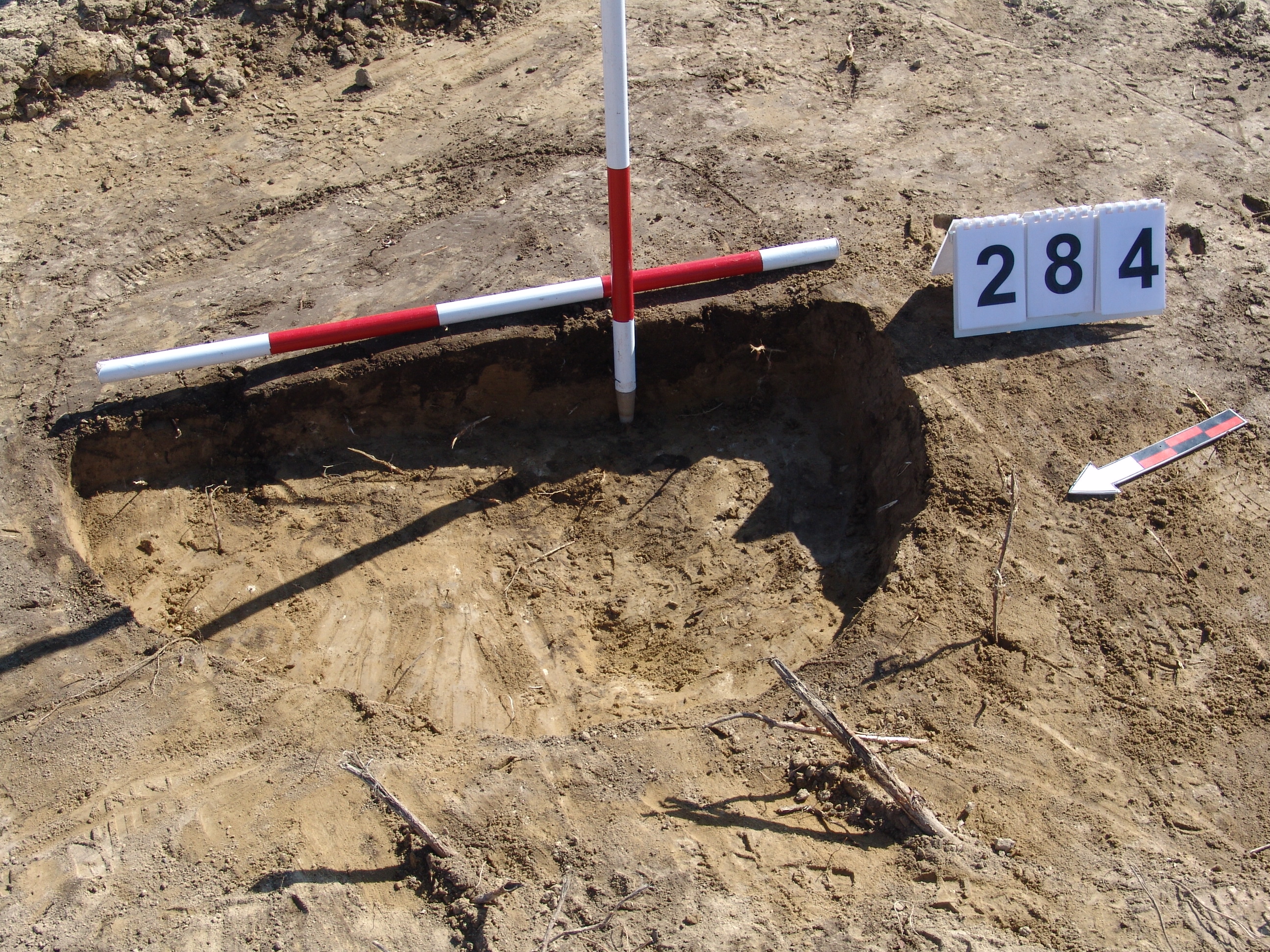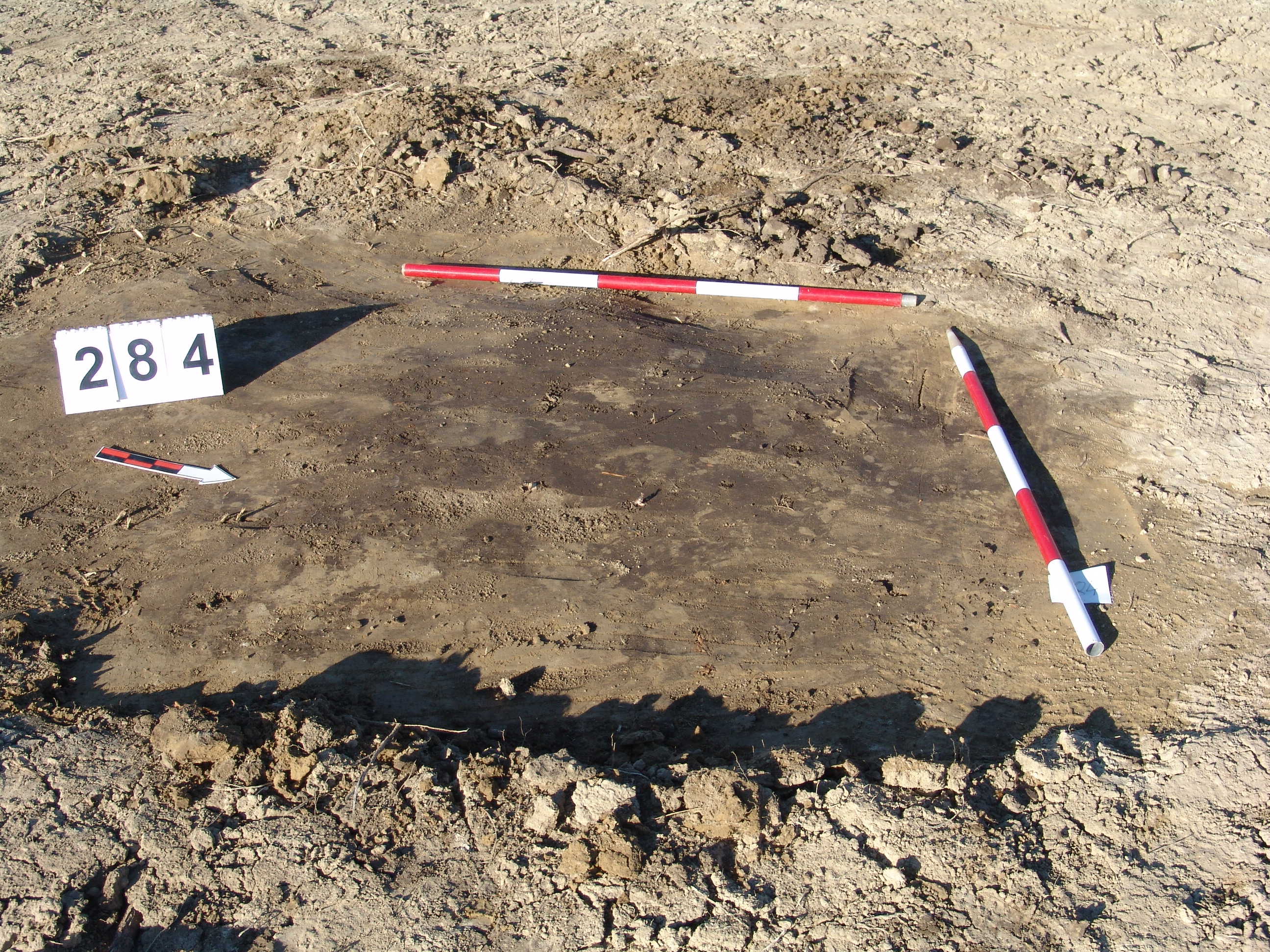 A 283. objektumtól déli irányban 4 méterre jelentkező szürkésbarna sárga szemcsés kerek folt. Betöltése: szürkésbarna, sárga szemcsékkel. Valószínű a gödör alját kaptuk el. (10 cm mély)