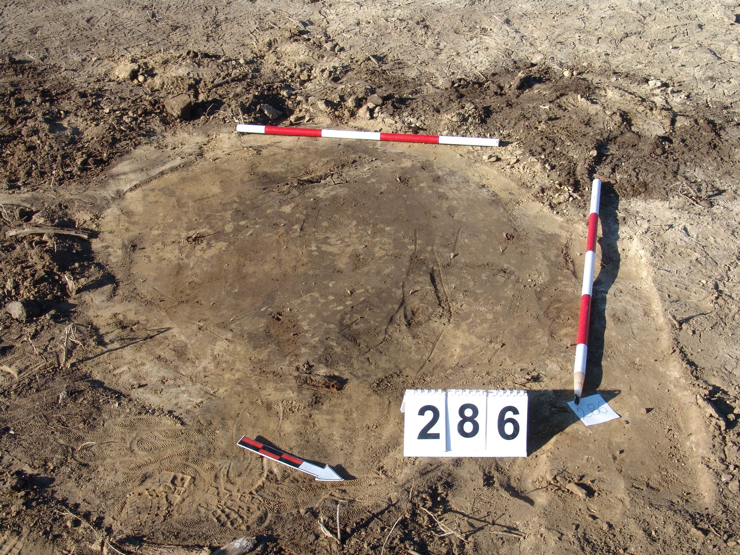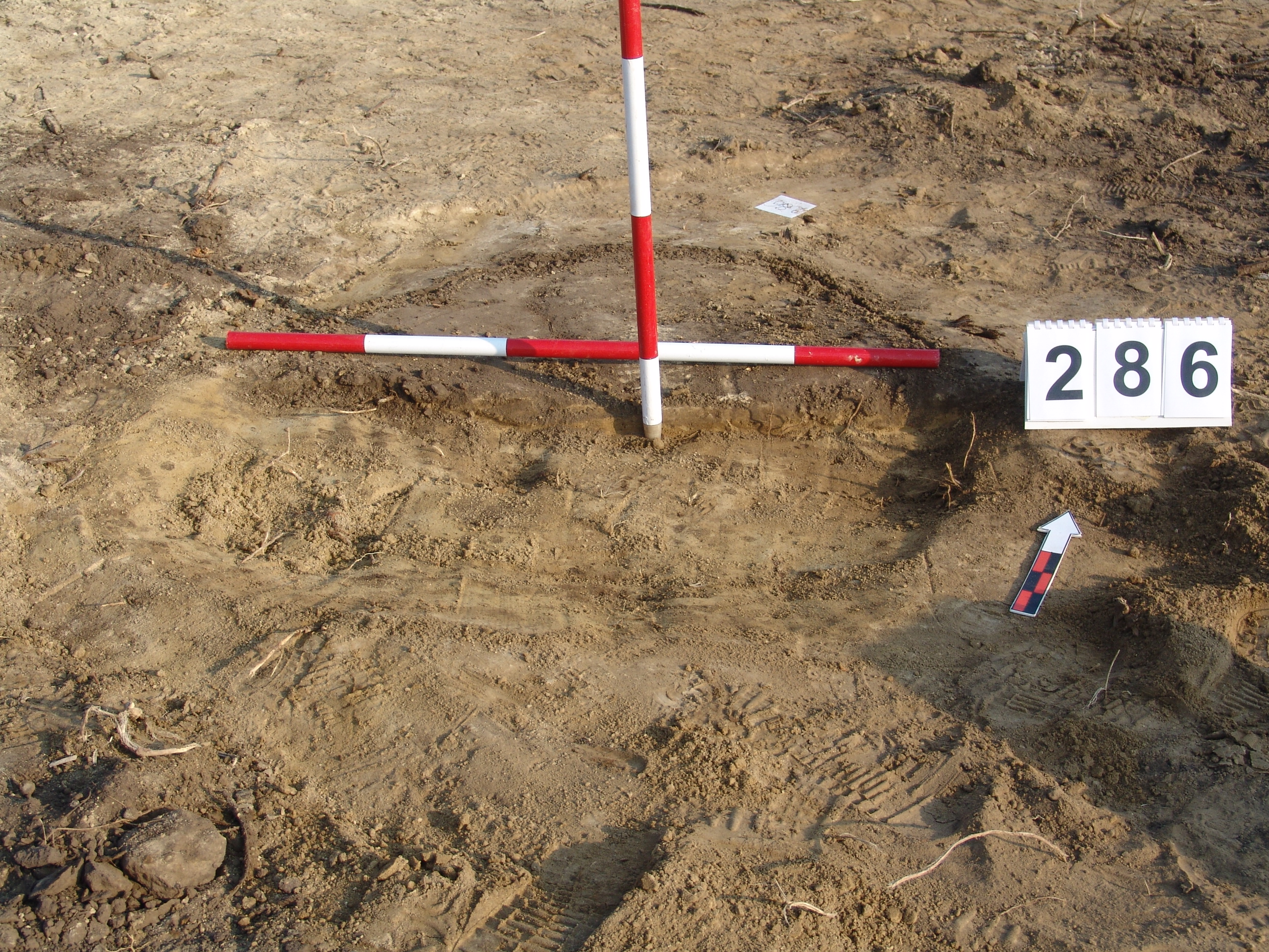 A 285. objektumtól keleti irányban 5 méterre jelentkező ovális alakú szürkésbarna folt. Mindössze 2 cm vastag réteg- elképzelhető, hogy egy gödör legalja, de valószínűbb, hogy az akácok okozta elszíneződés.
